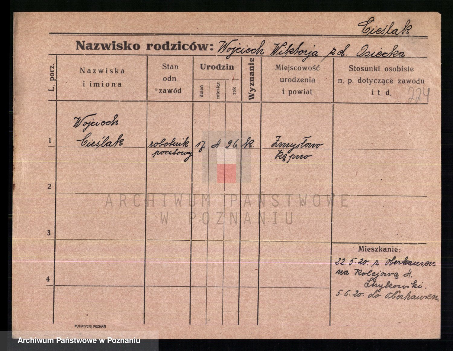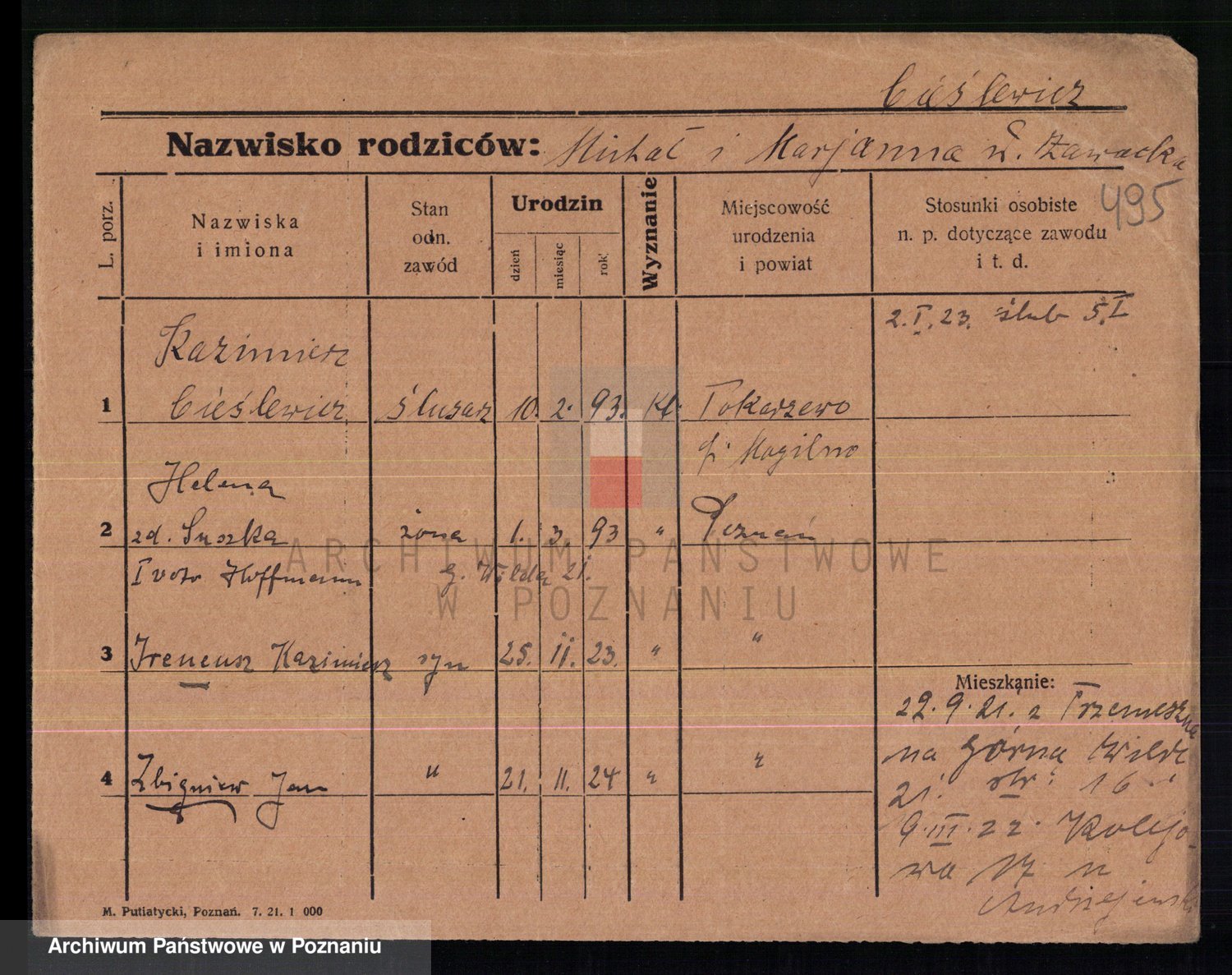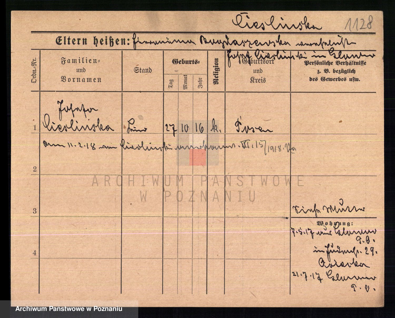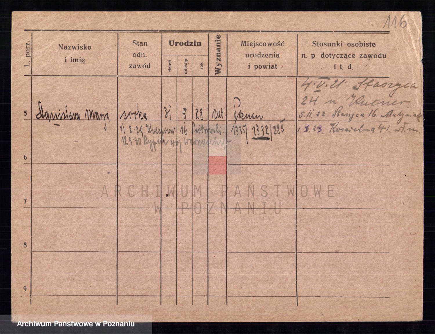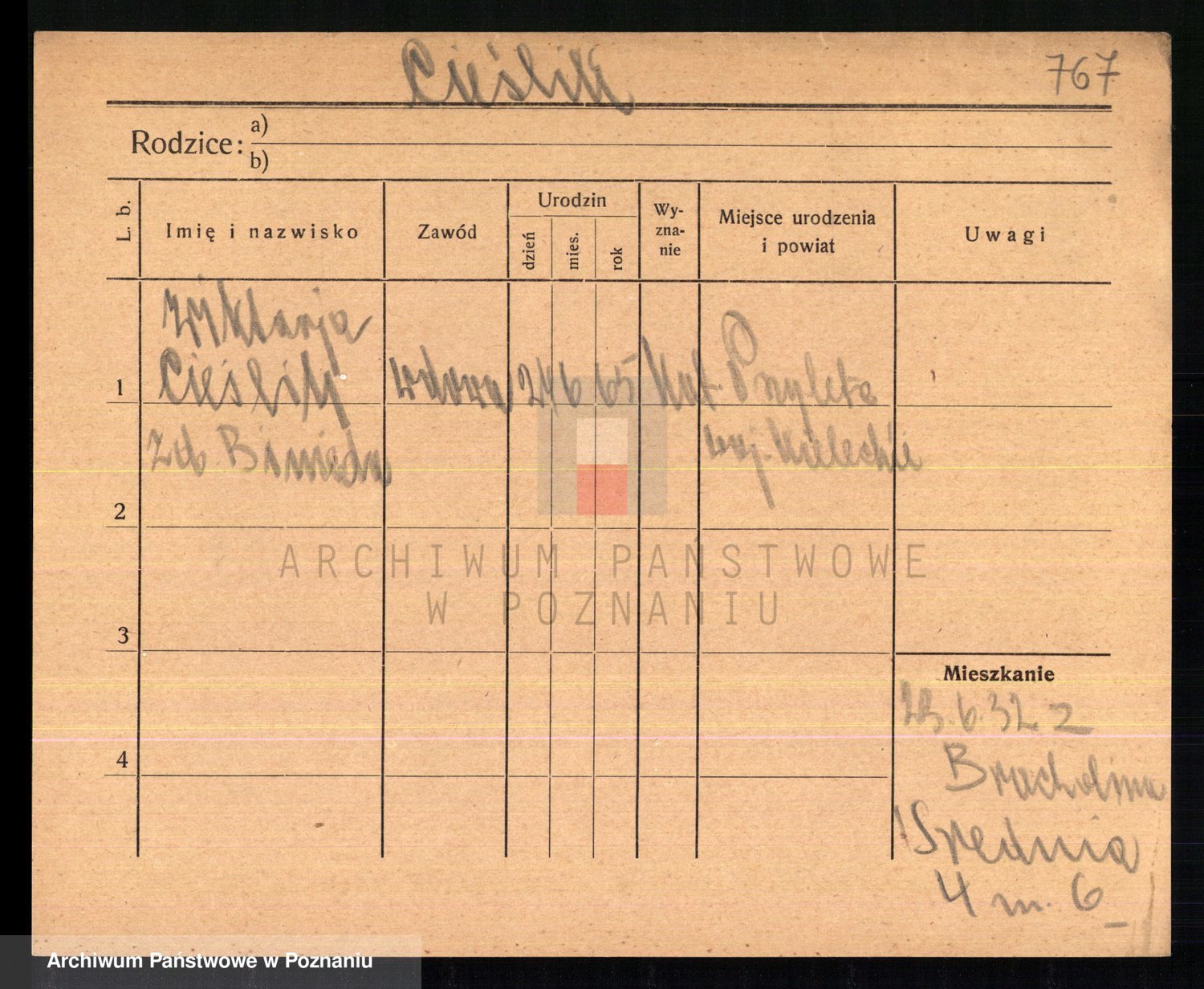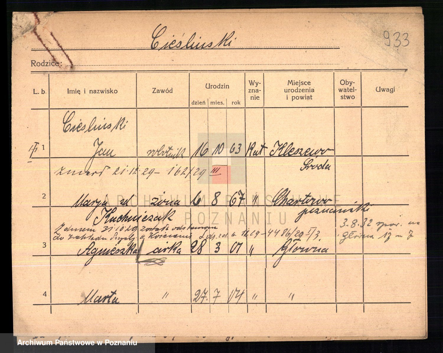 Podgląd karty osobowej dostępny jest po kliknięciu na nazwisko lub ikonkę karty. Można dokonywać powiększenia (ikony na górze) lub przechodzić między kolejnymi skanami (strzałki po bokach).
