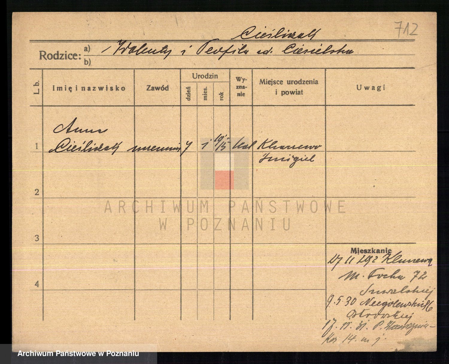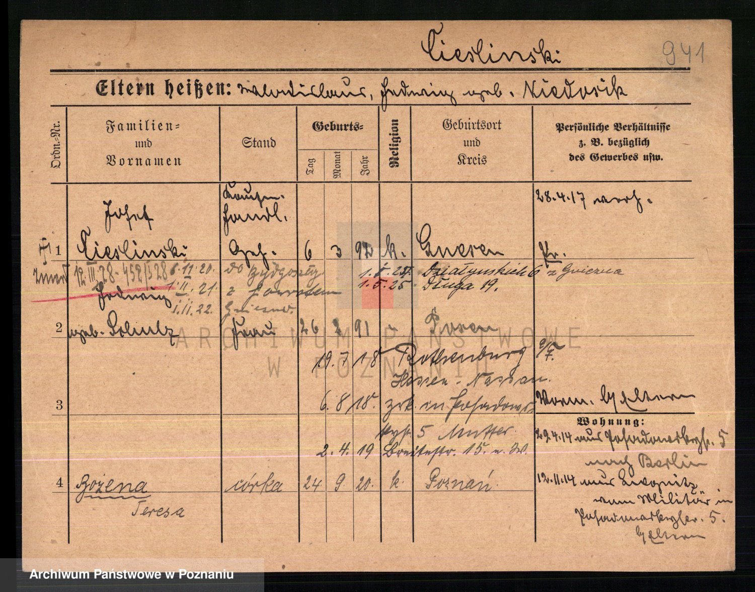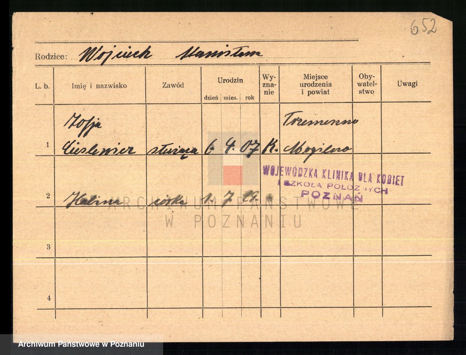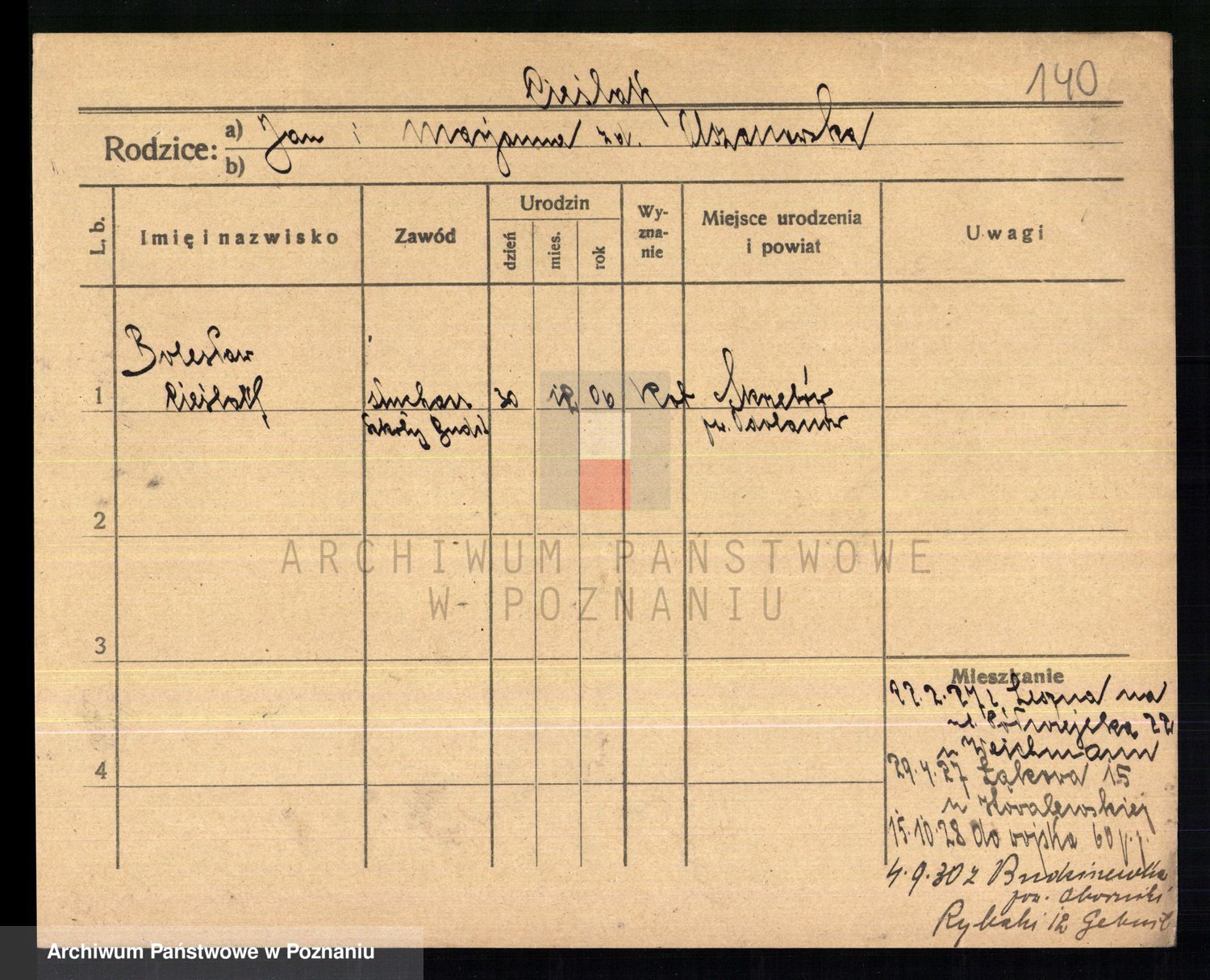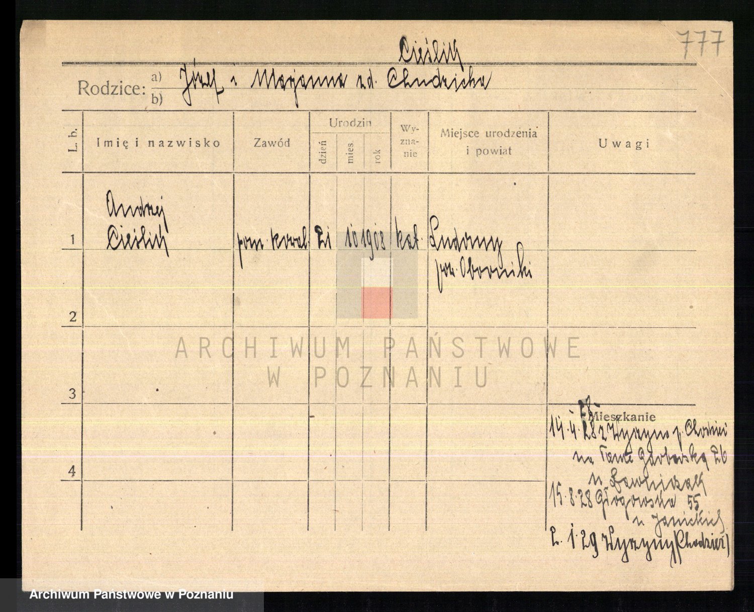 Podgląd karty osobowej dostępny jest po kliknięciu na nazwisko lub ikonkę karty. Można dokonywać powiększenia (ikony na górze) lub przechodzić między kolejnymi skanami (strzałki po bokach).