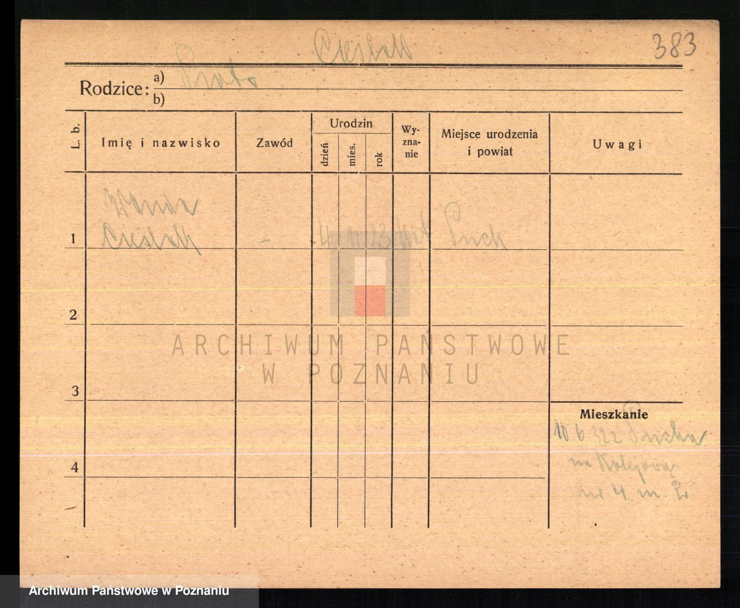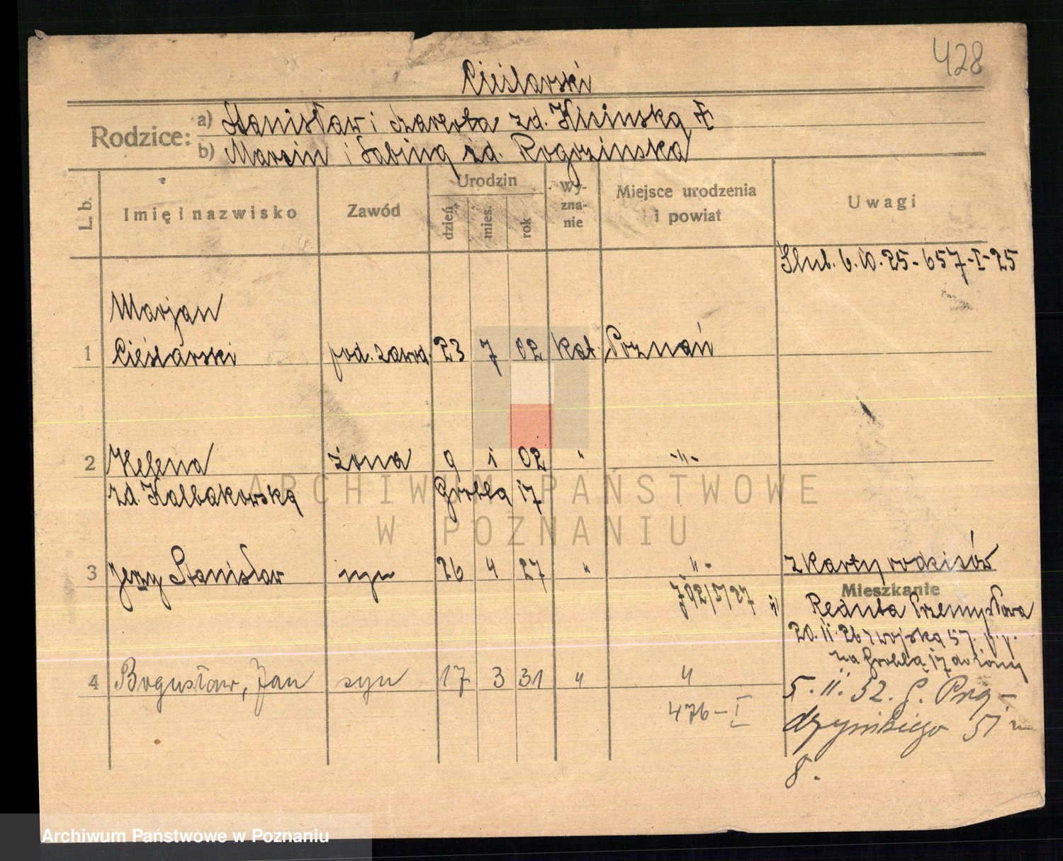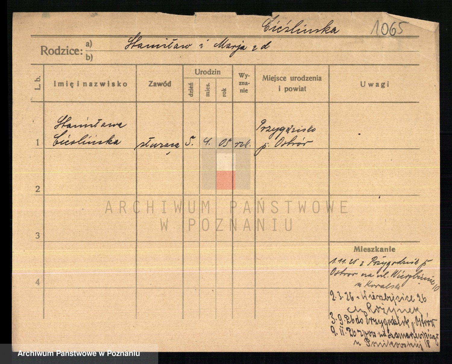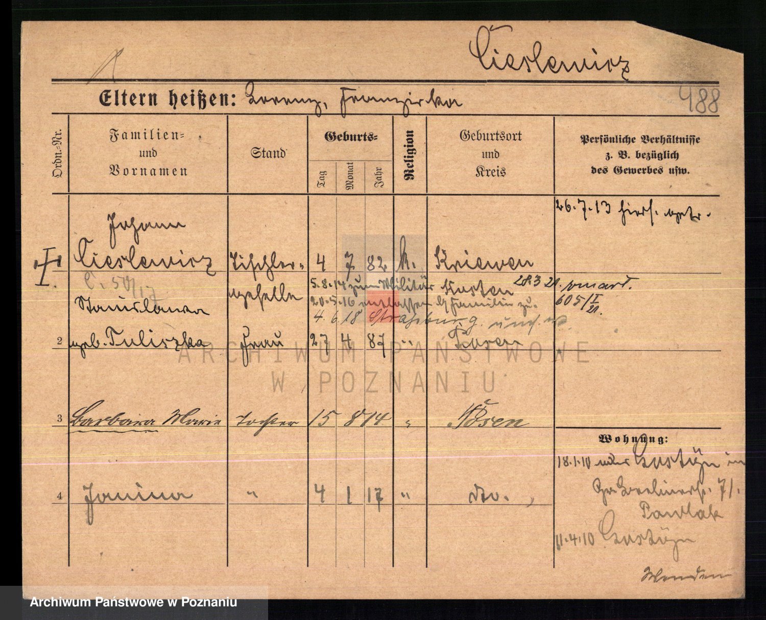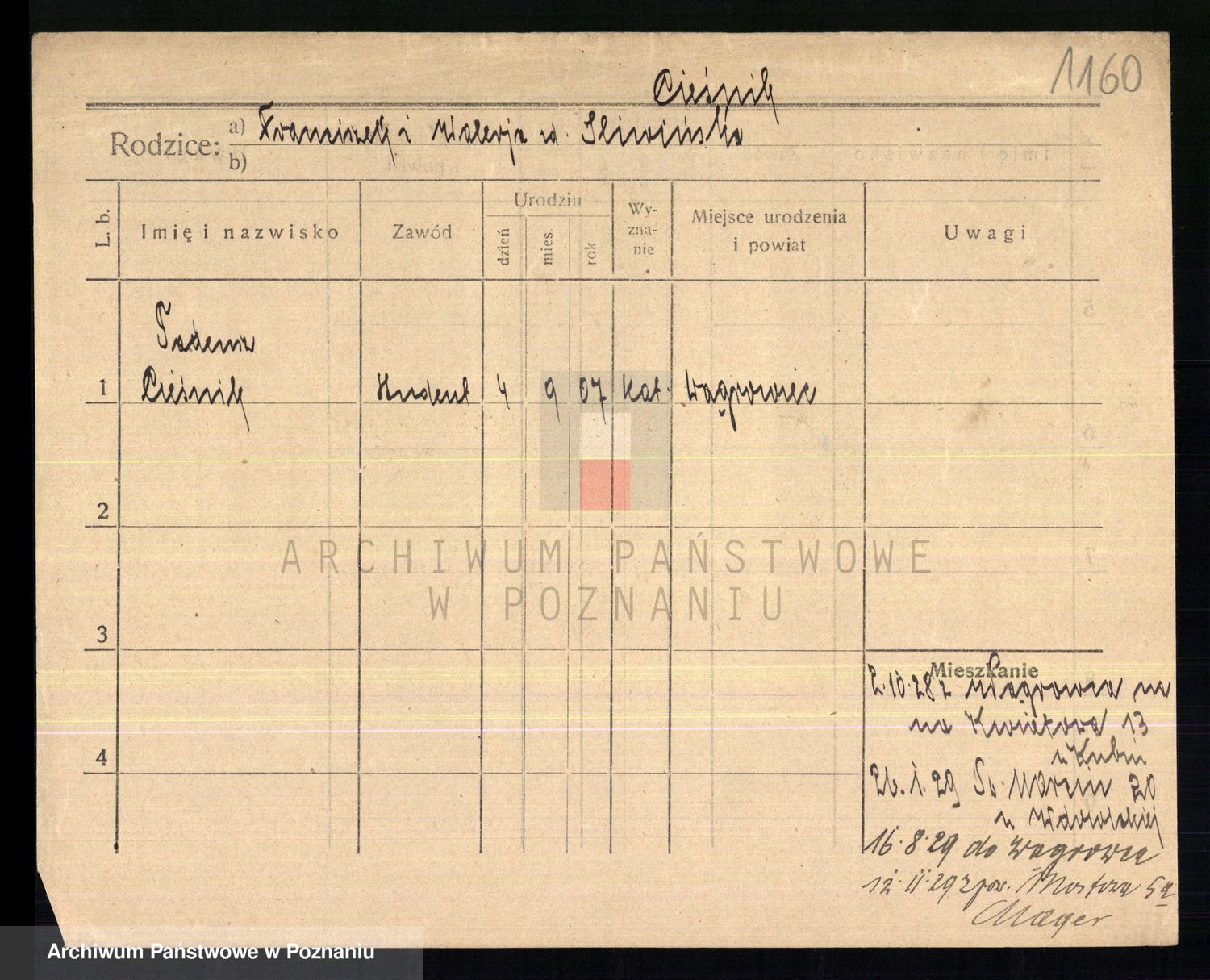 Podgląd karty osobowej dostępny jest po kliknięciu na nazwisko lub ikonkę karty. Można dokonywać powiększenia (ikony na górze) lub przechodzić między kolejnymi skanami (strzałki po bokach).