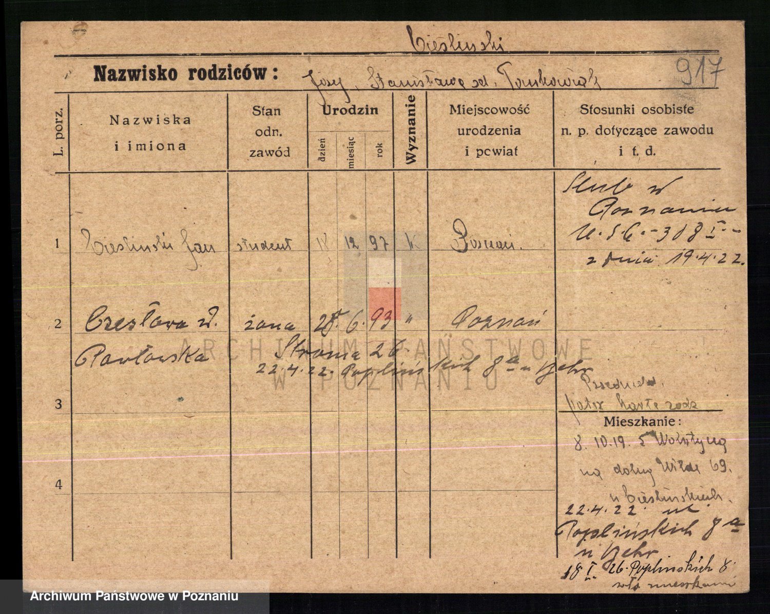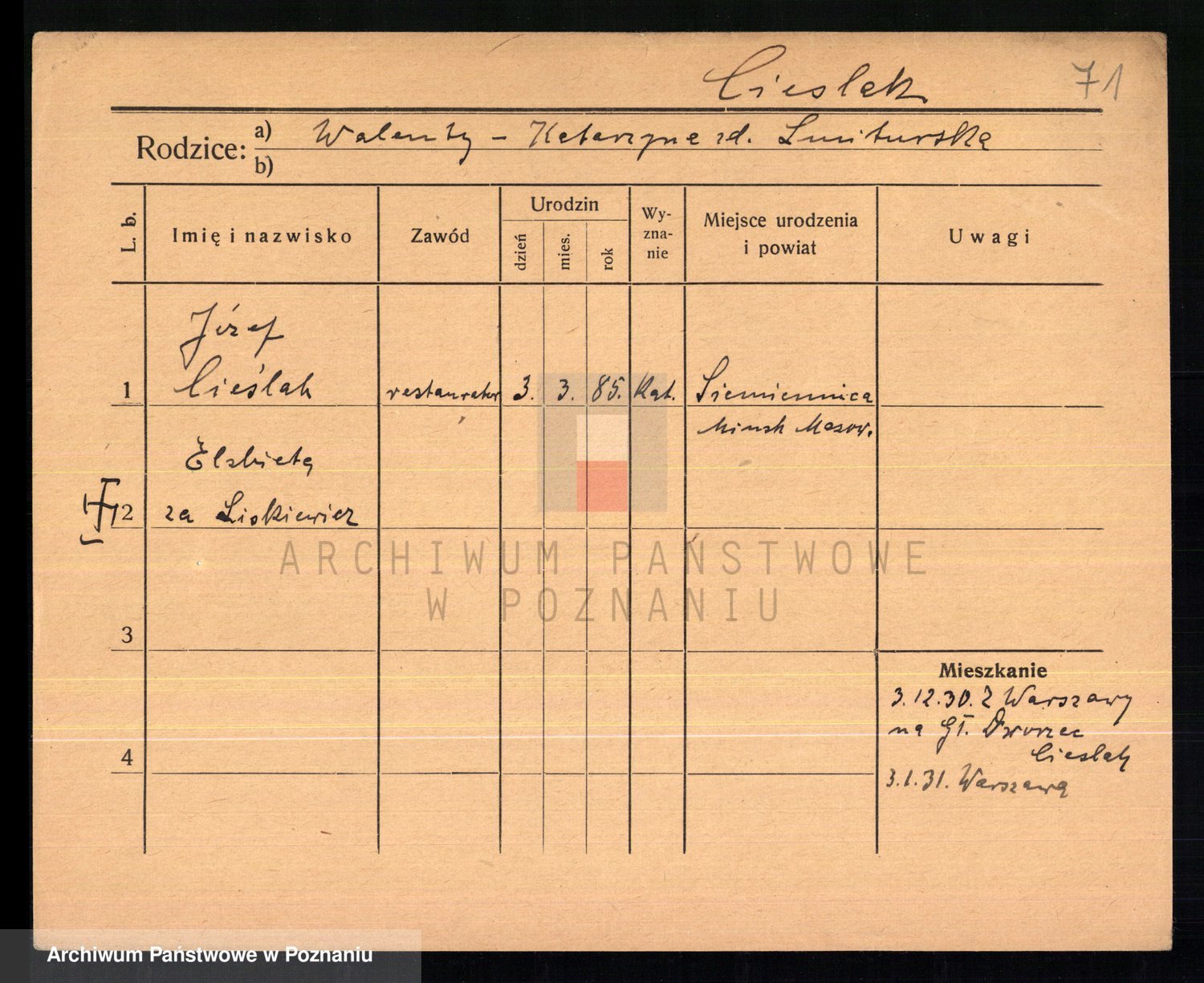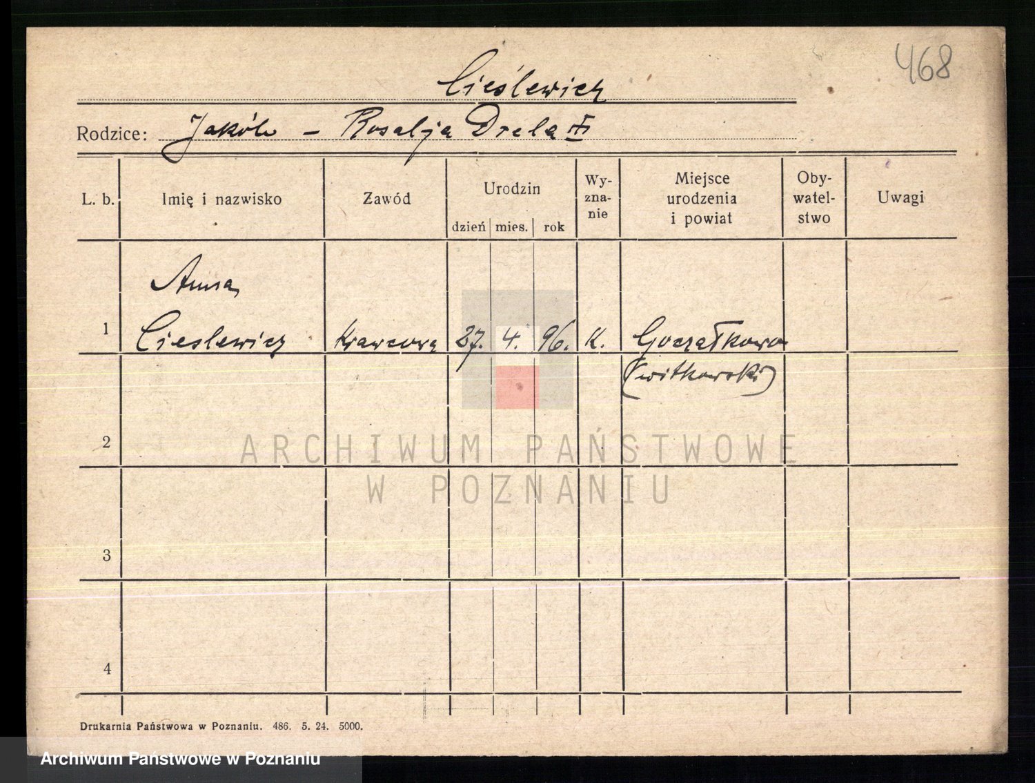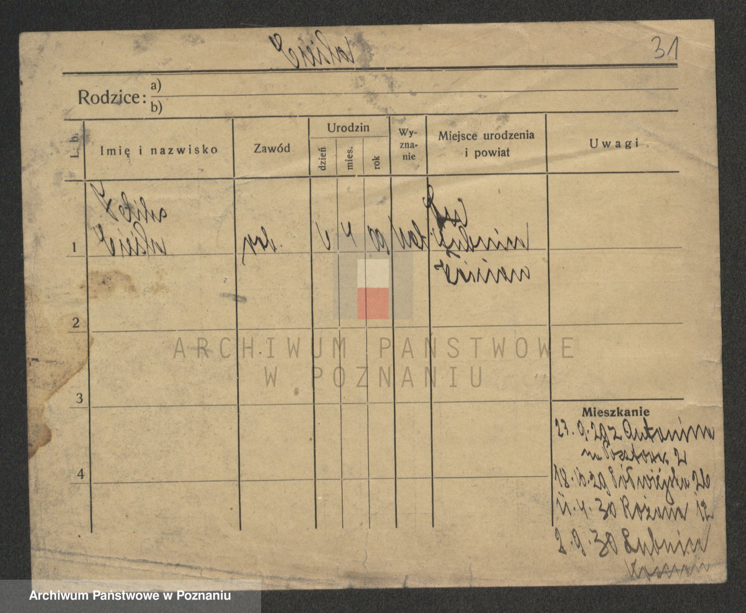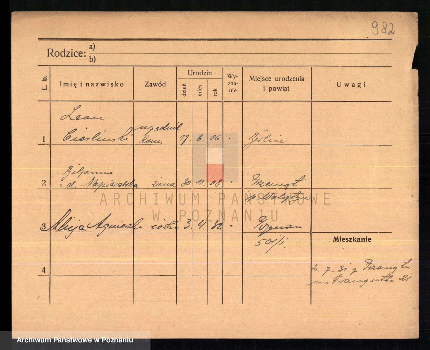 Podgląd karty osobowej dostępny jest po kliknięciu na nazwisko lub ikonkę karty. Można dokonywać powiększenia (ikony na górze) lub przechodzić między kolejnymi skanami (strzałki po bokach).