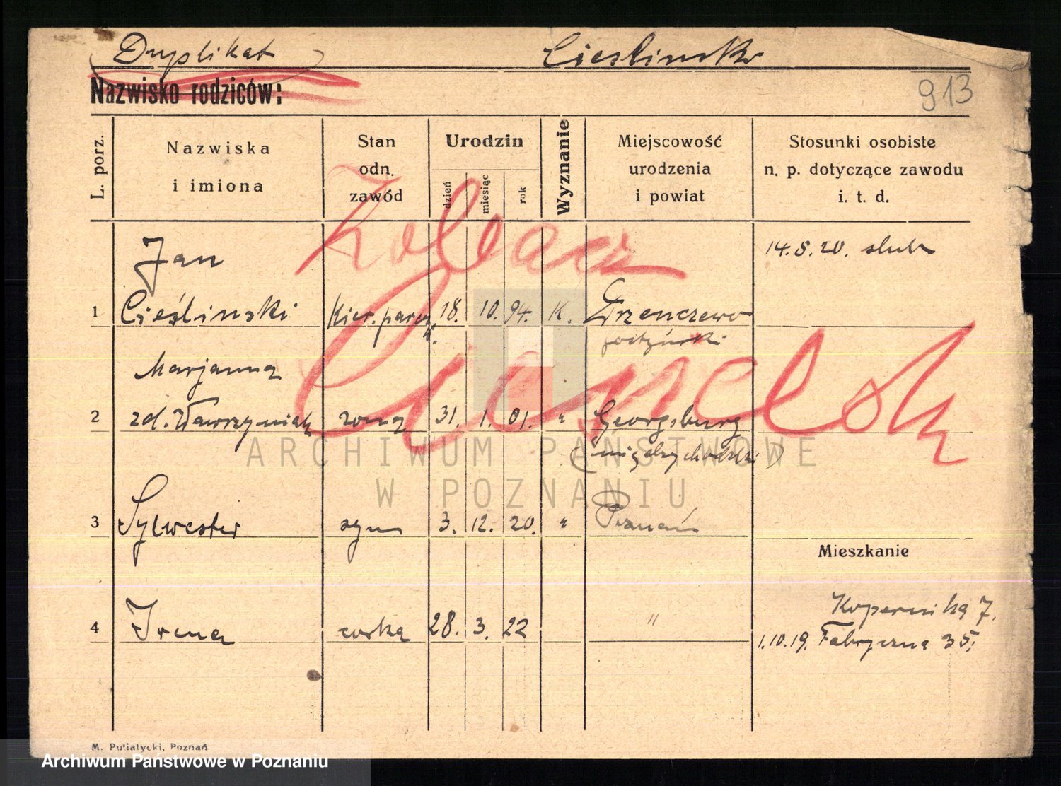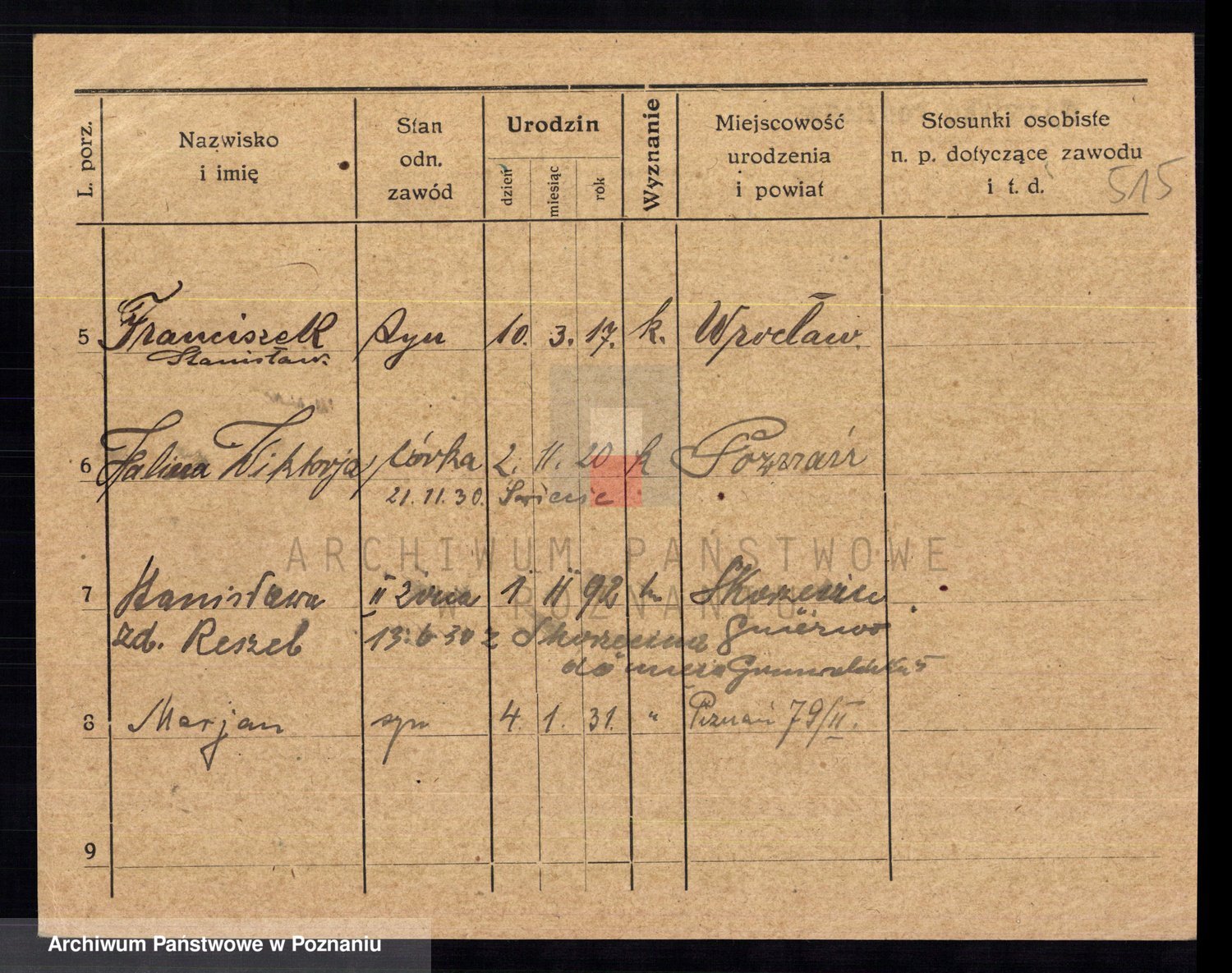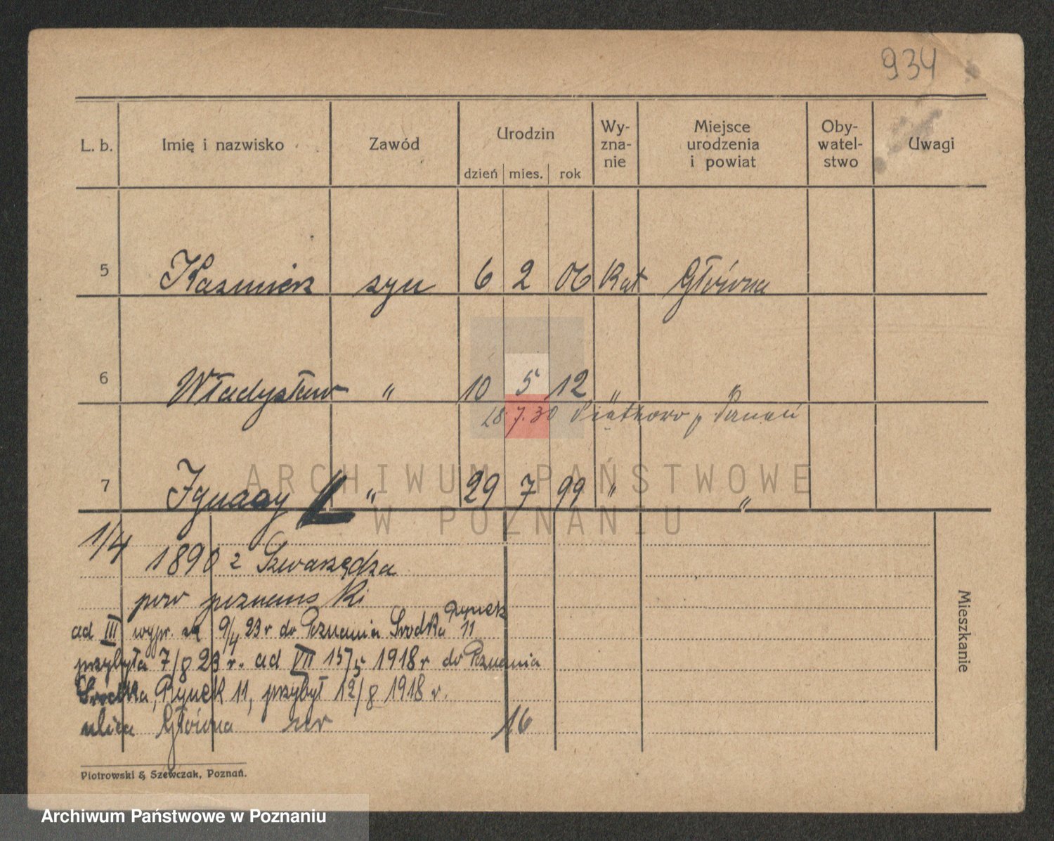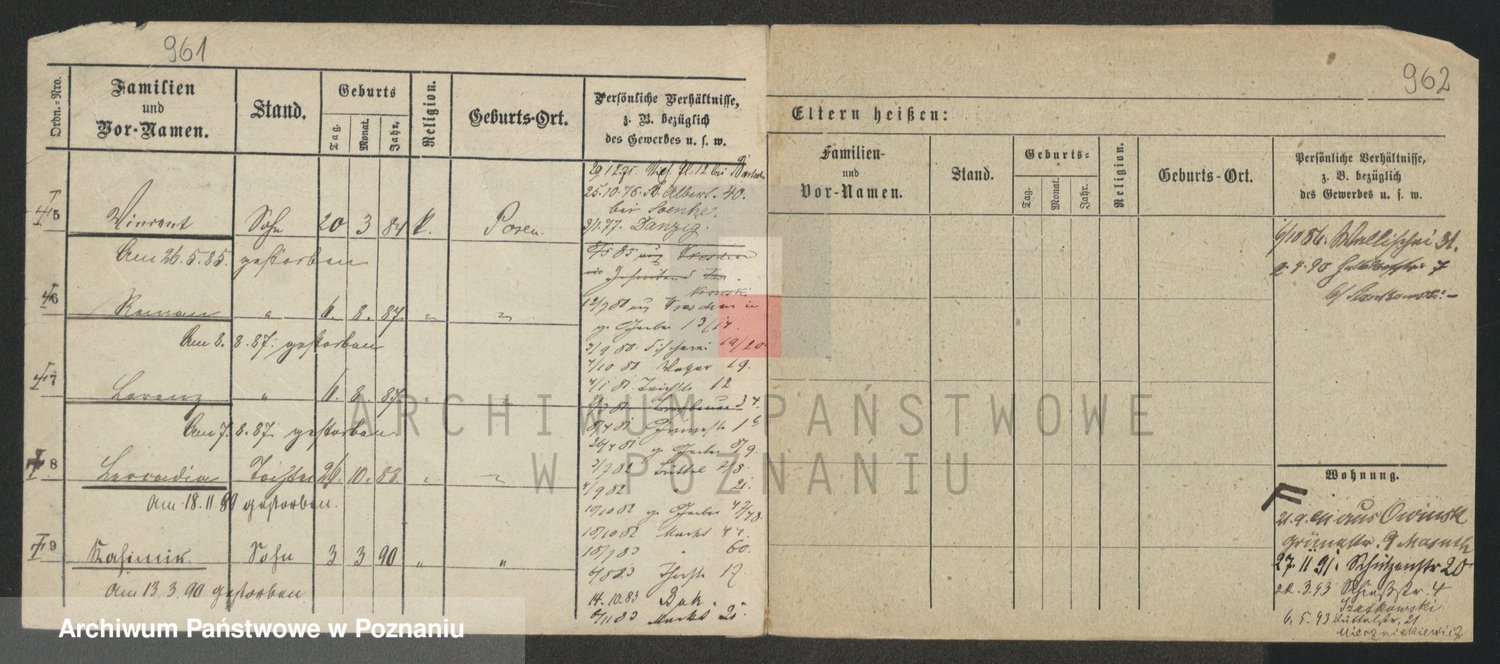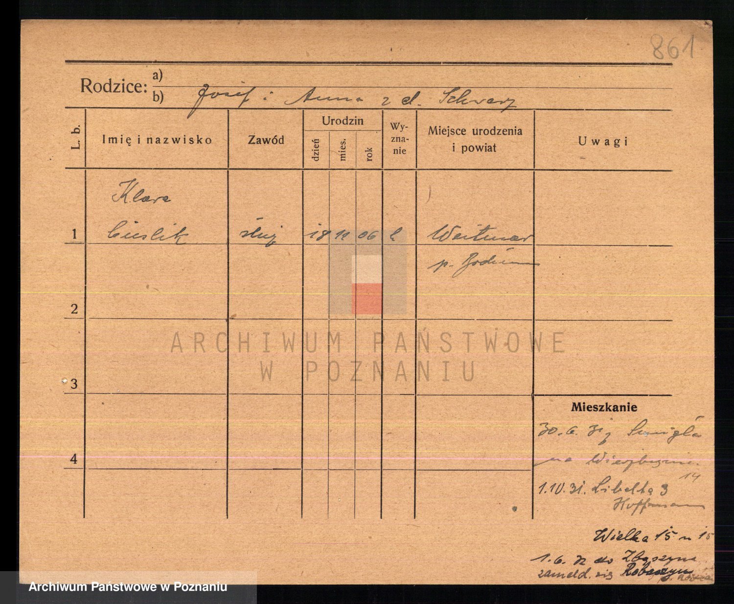 Podgląd karty osobowej dostępny jest po kliknięciu na nazwisko lub ikonkę karty. Można dokonywać powiększenia (ikony na górze) lub przechodzić między kolejnymi skanami (strzałki po bokach).
