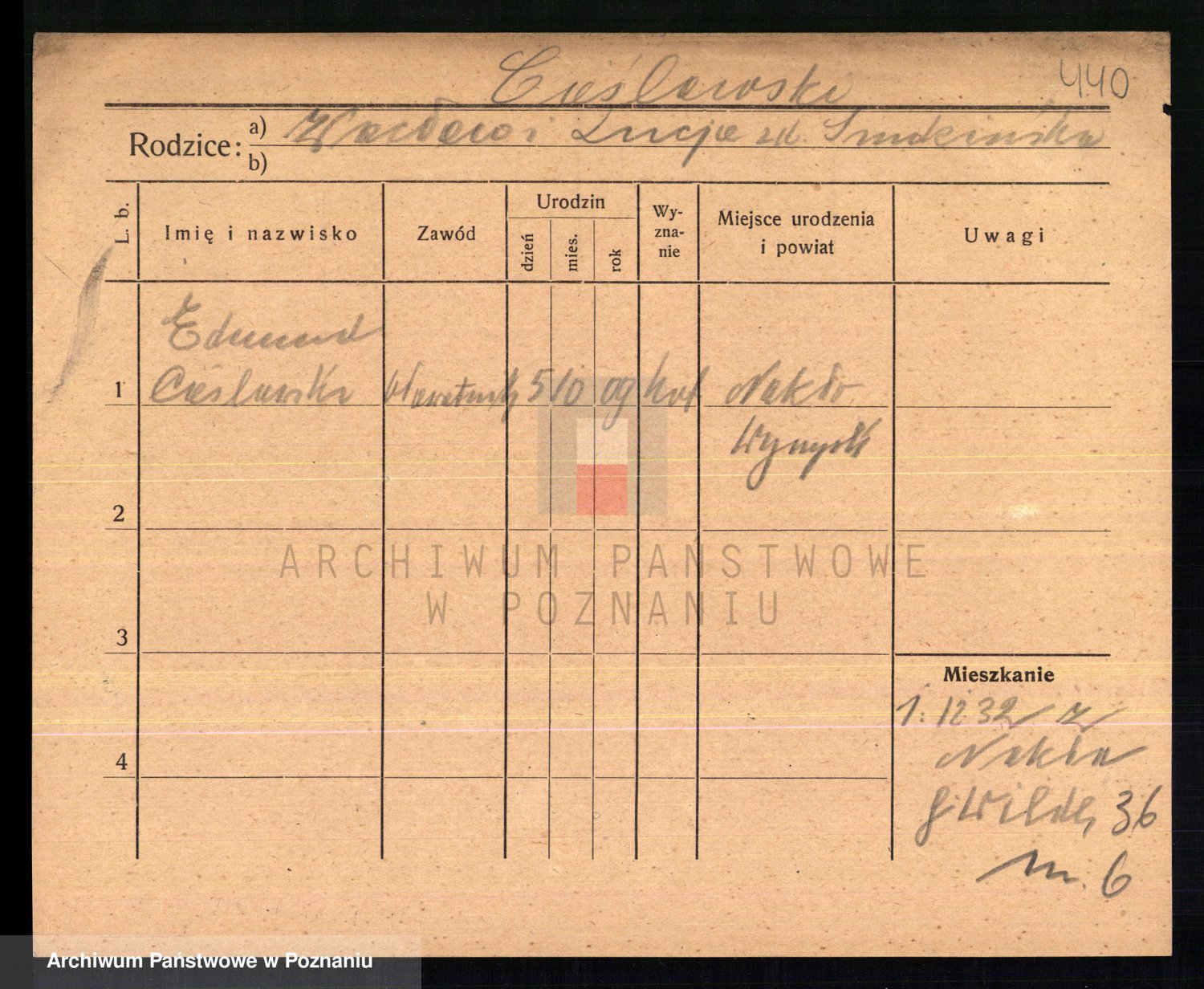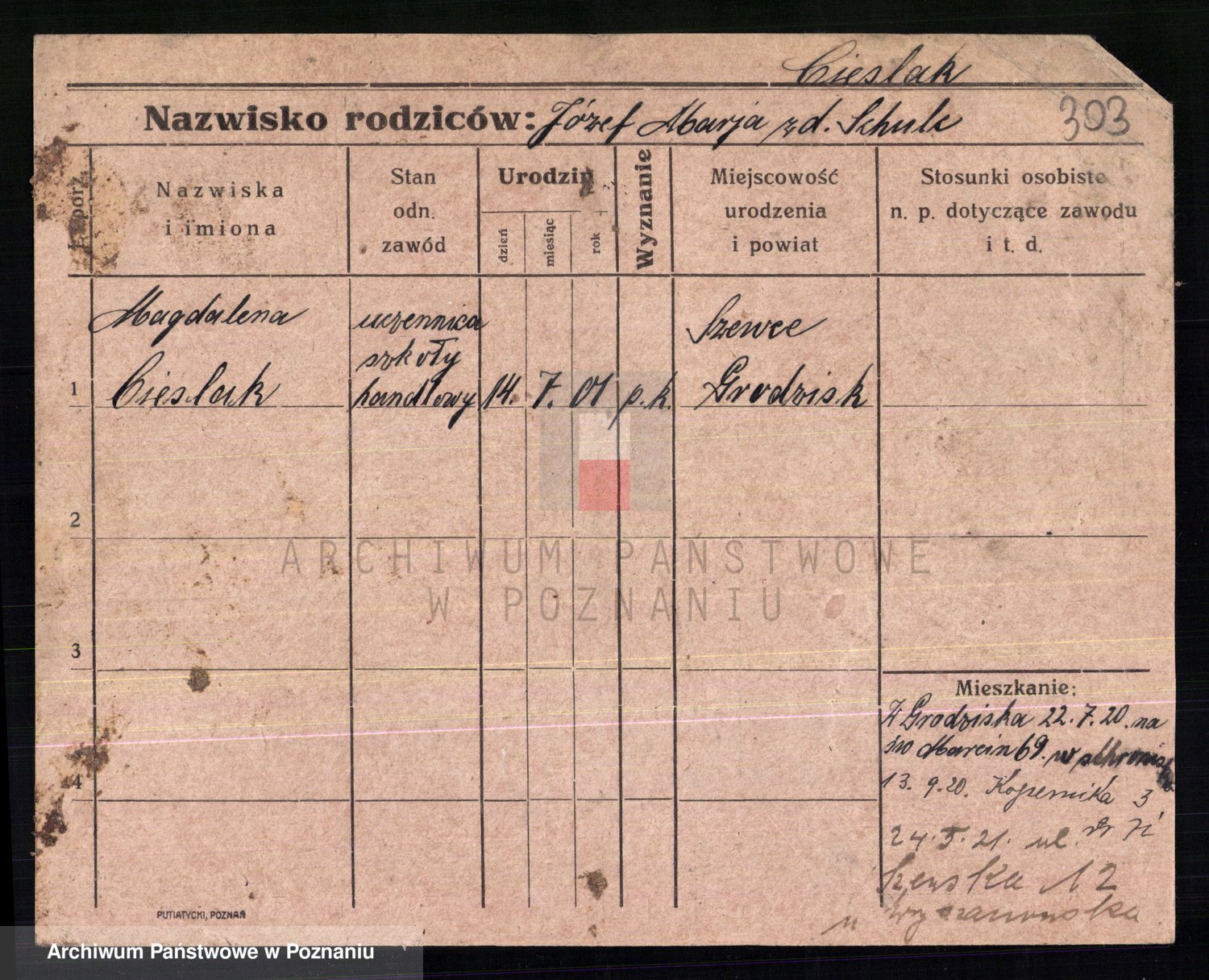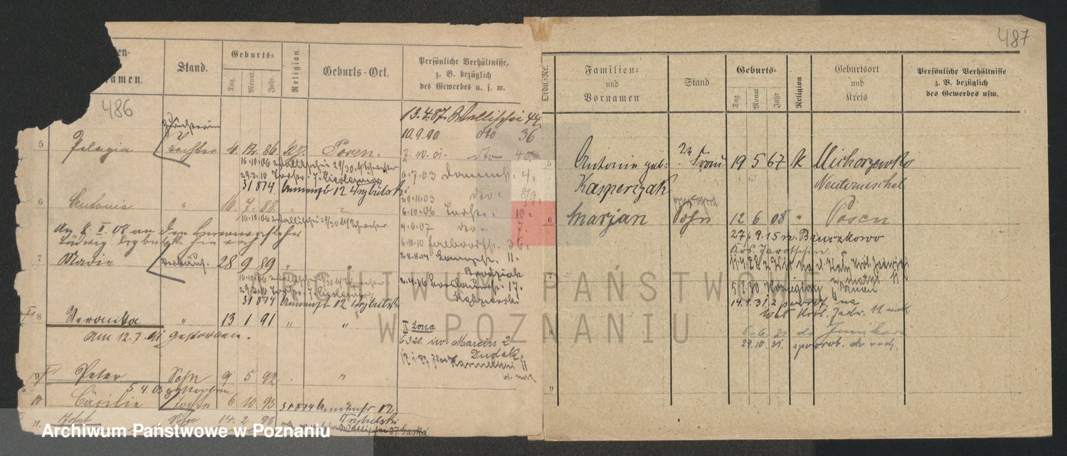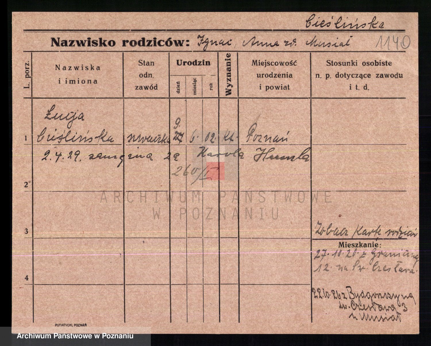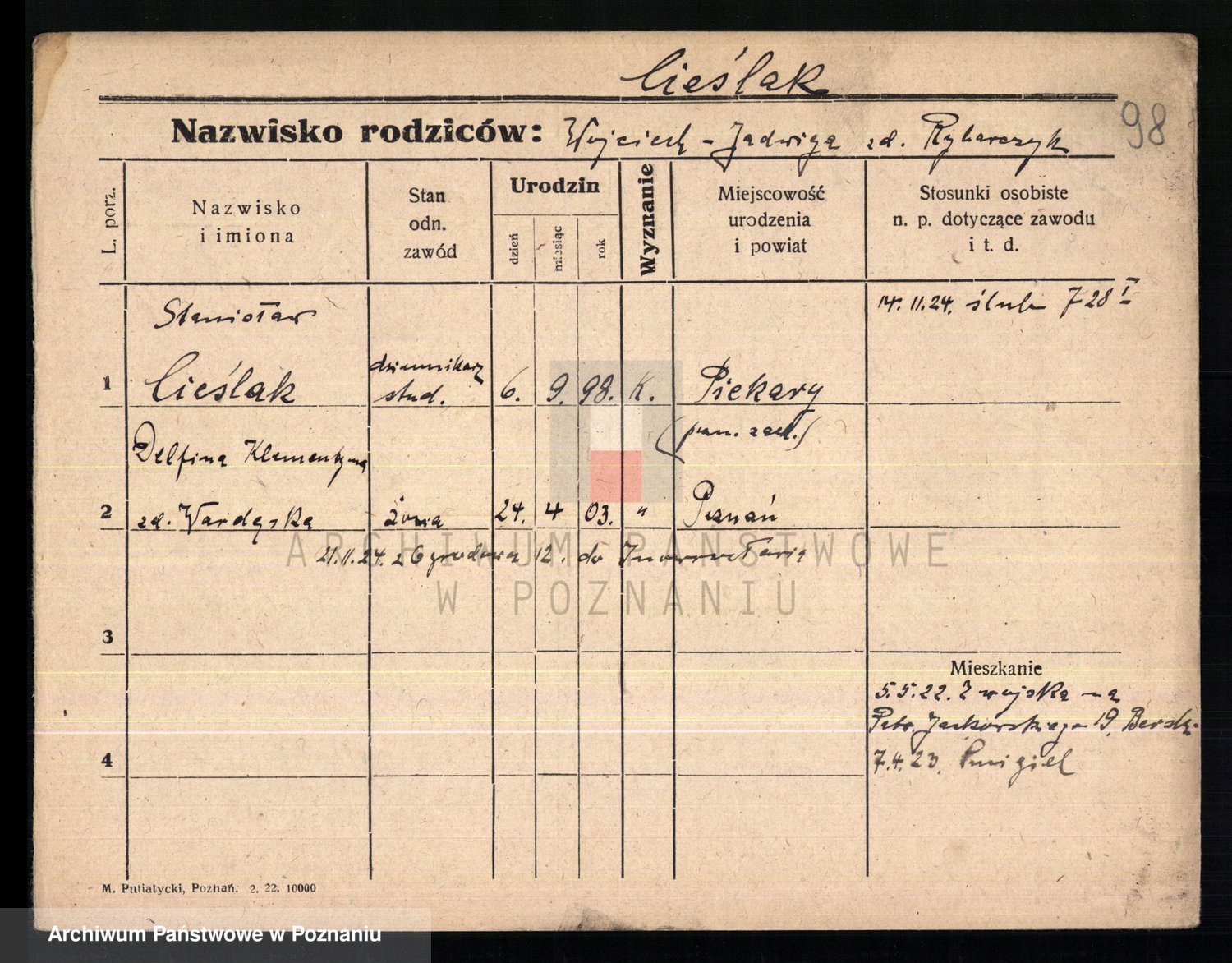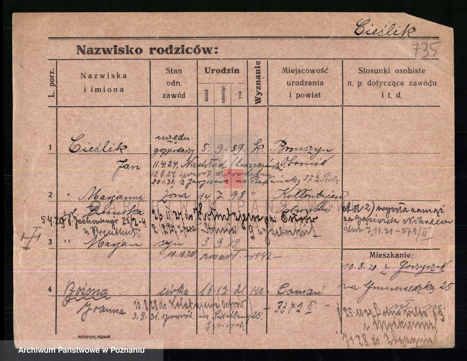 Podgląd karty osobowej dostępny jest po kliknięciu na nazwisko lub ikonkę karty. Można dokonywać powiększenia (ikony na górze) lub przechodzić między kolejnymi skanami (strzałki po bokach).