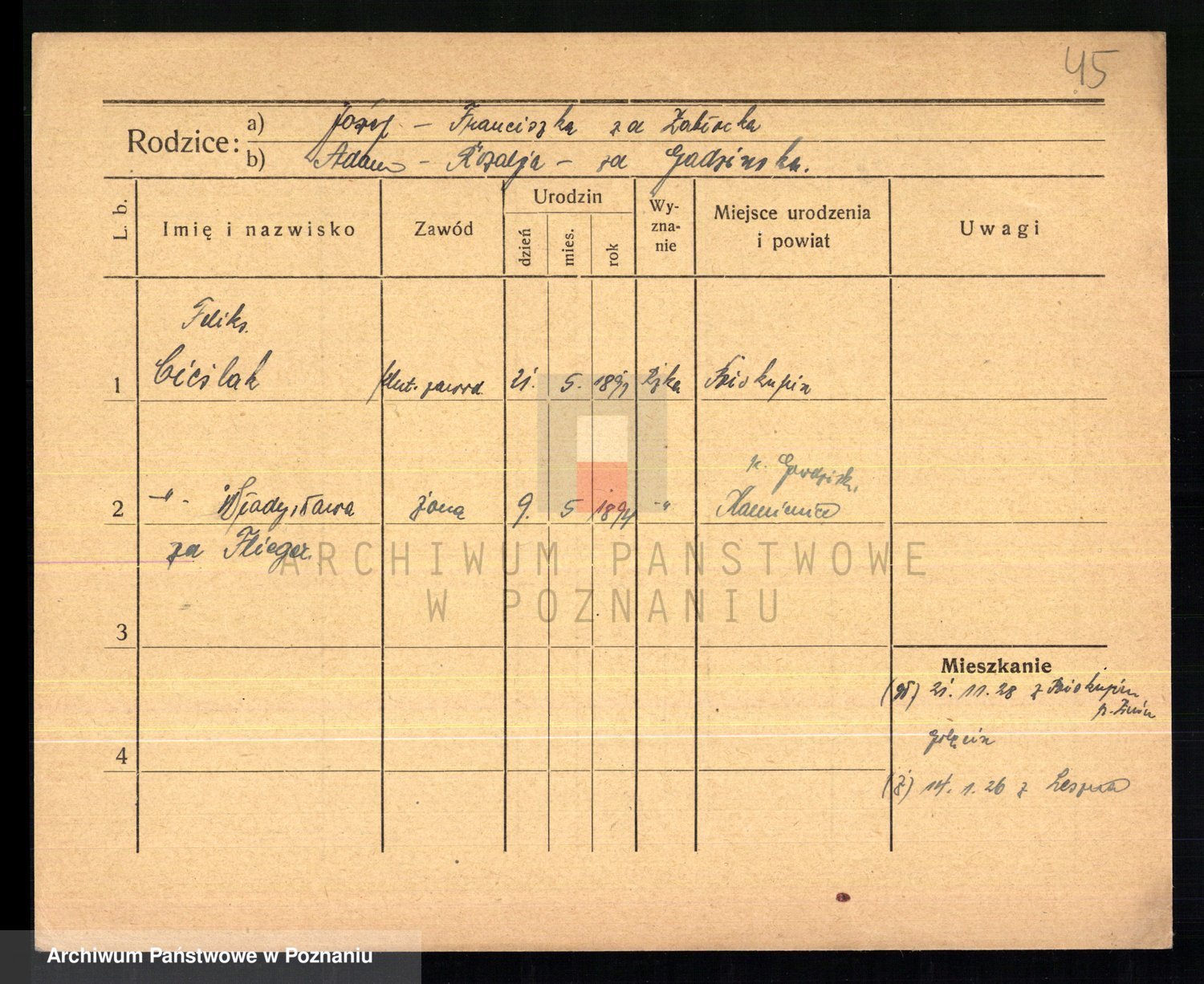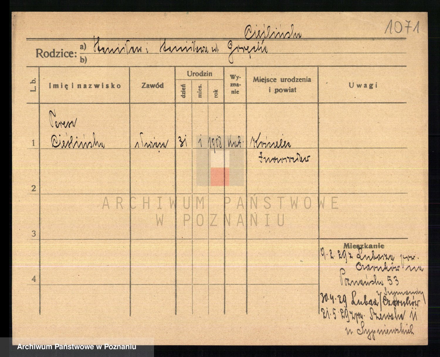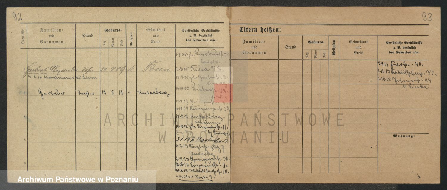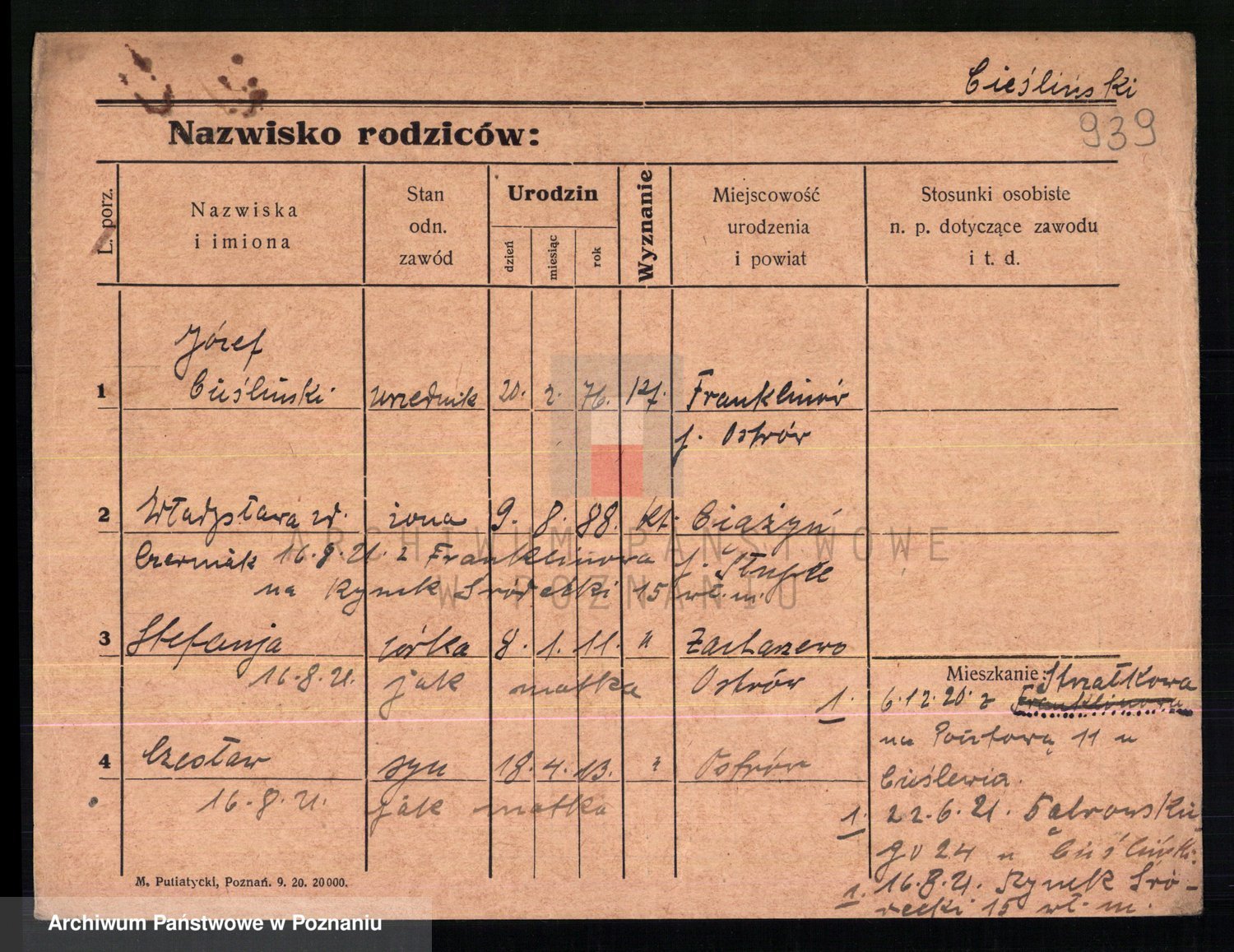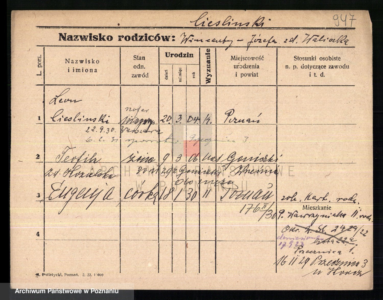 Podgląd karty osobowej dostępny jest po kliknięciu na nazwisko lub ikonkę karty. Można dokonywać powiększenia (ikony na górze) lub przechodzić między kolejnymi skanami (strzałki po bokach).