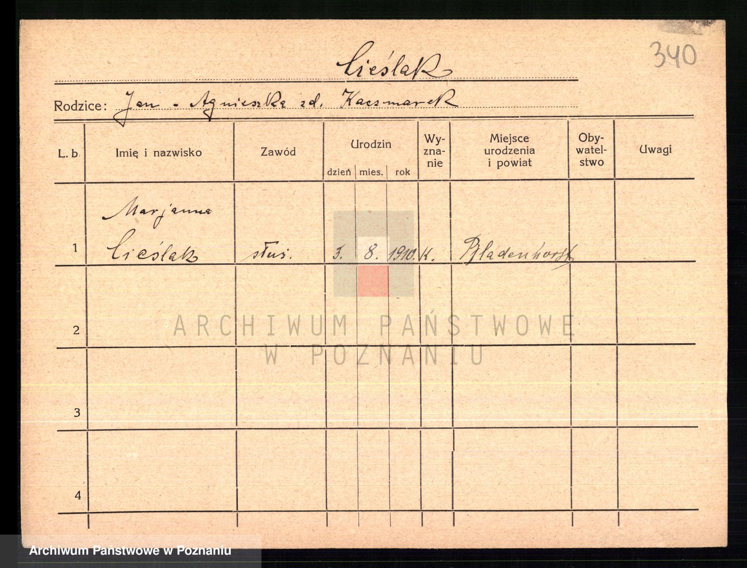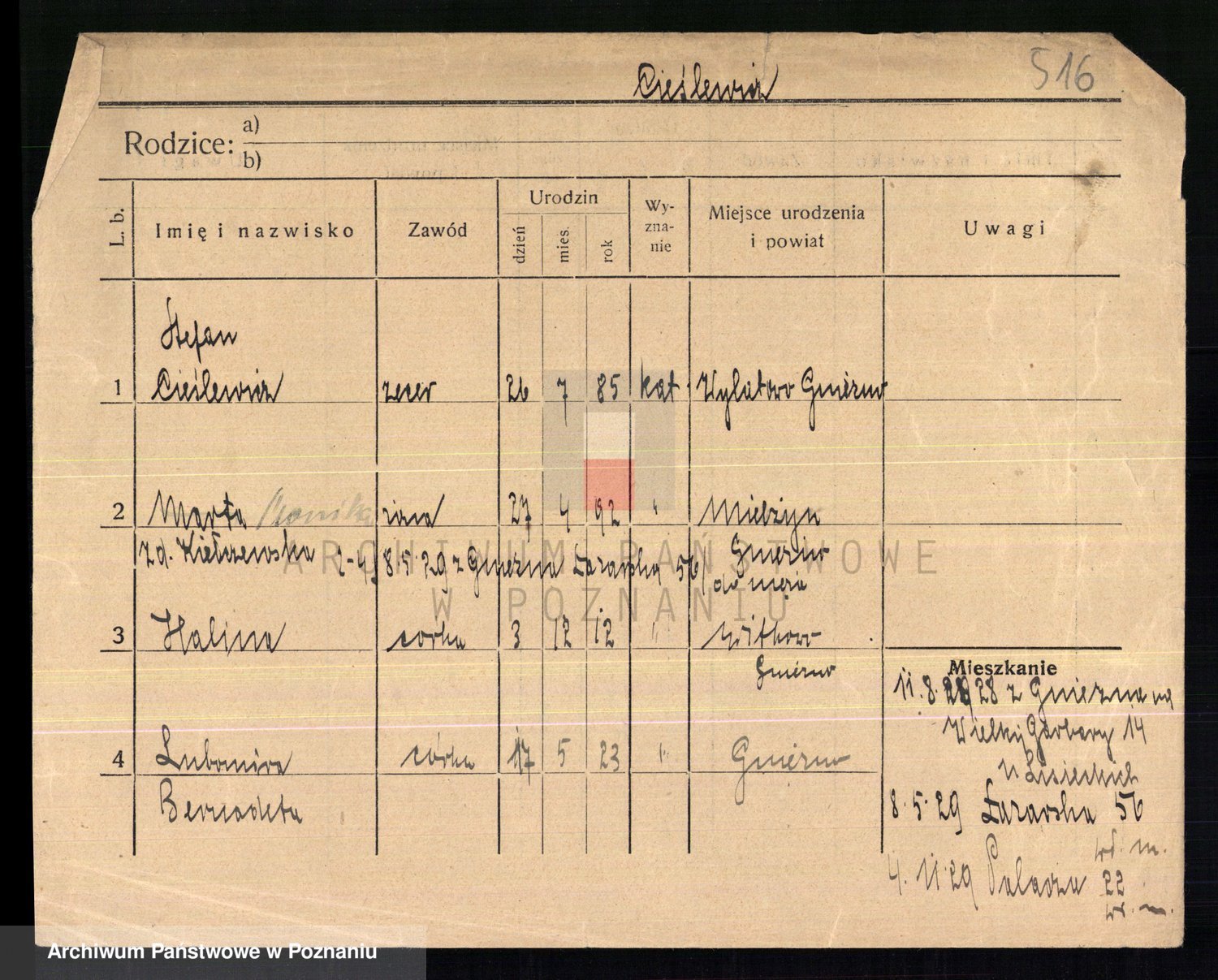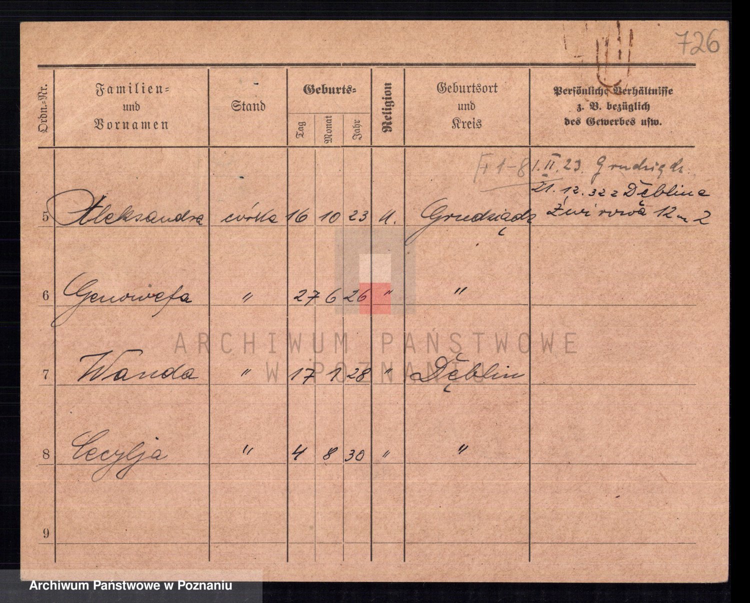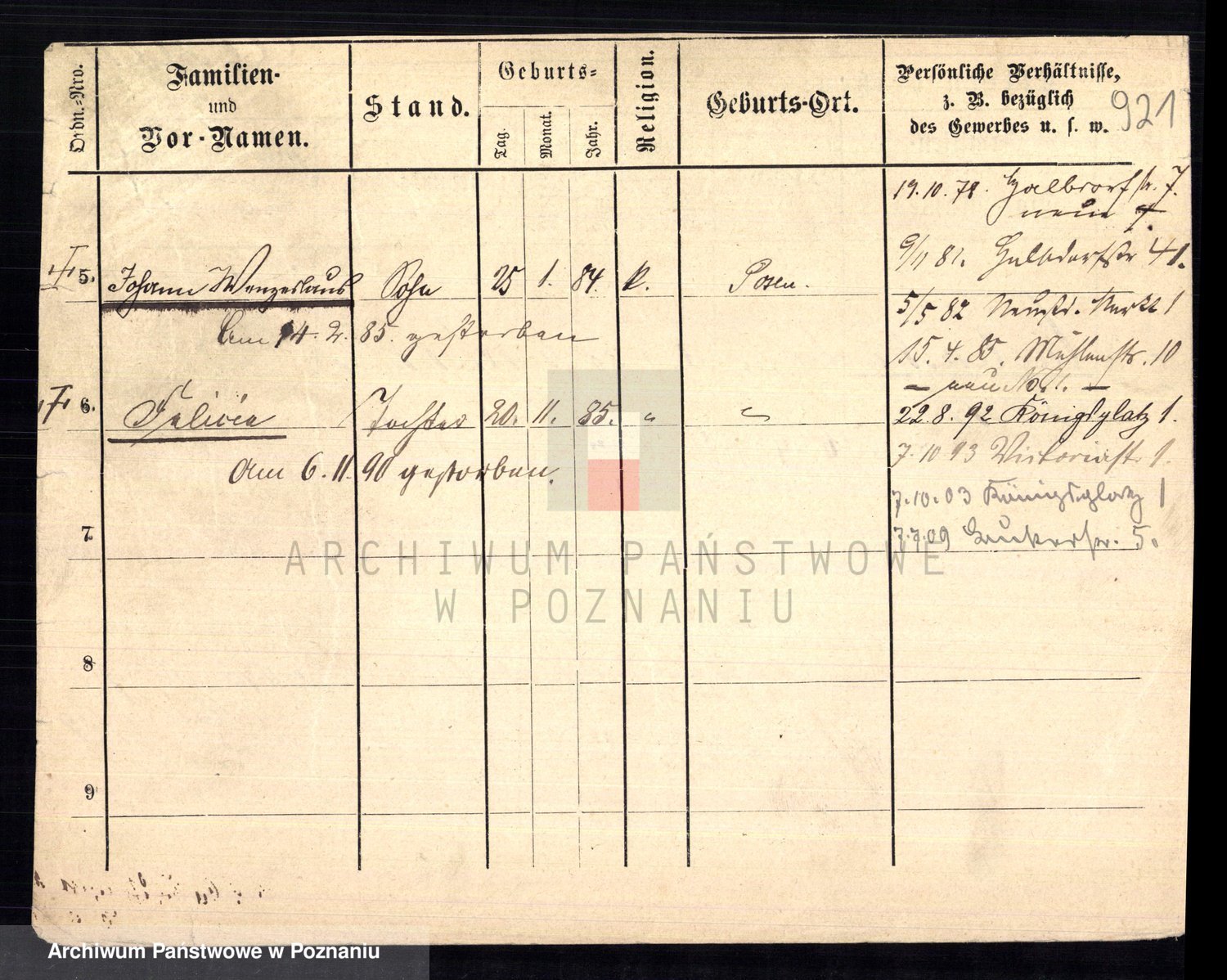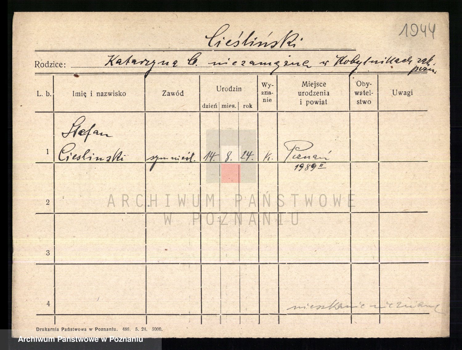 Podgląd karty osobowej dostępny jest po kliknięciu na nazwisko lub ikonkę karty. Można dokonywać powiększenia (ikony na górze) lub przechodzić między kolejnymi skanami (strzałki po bokach).