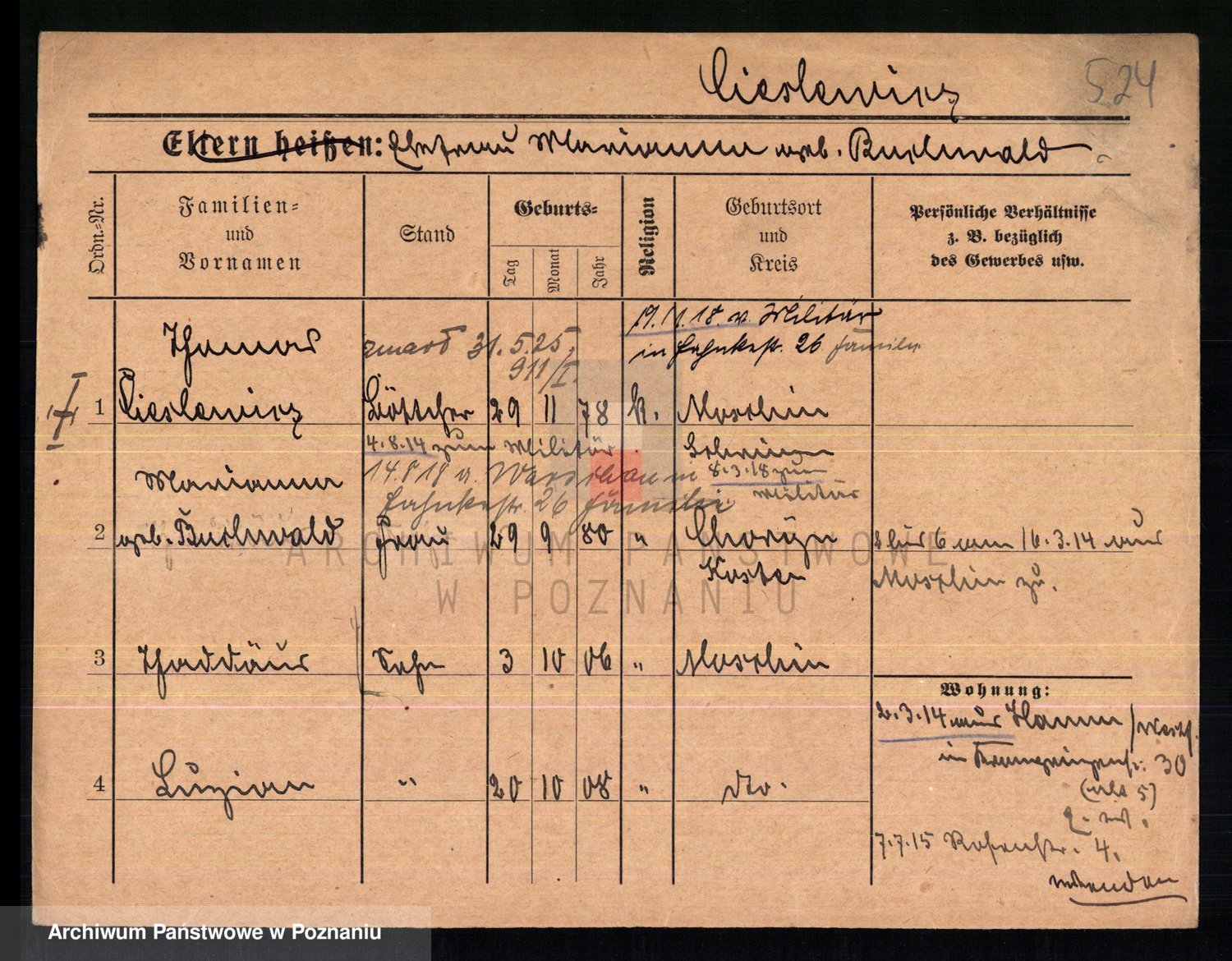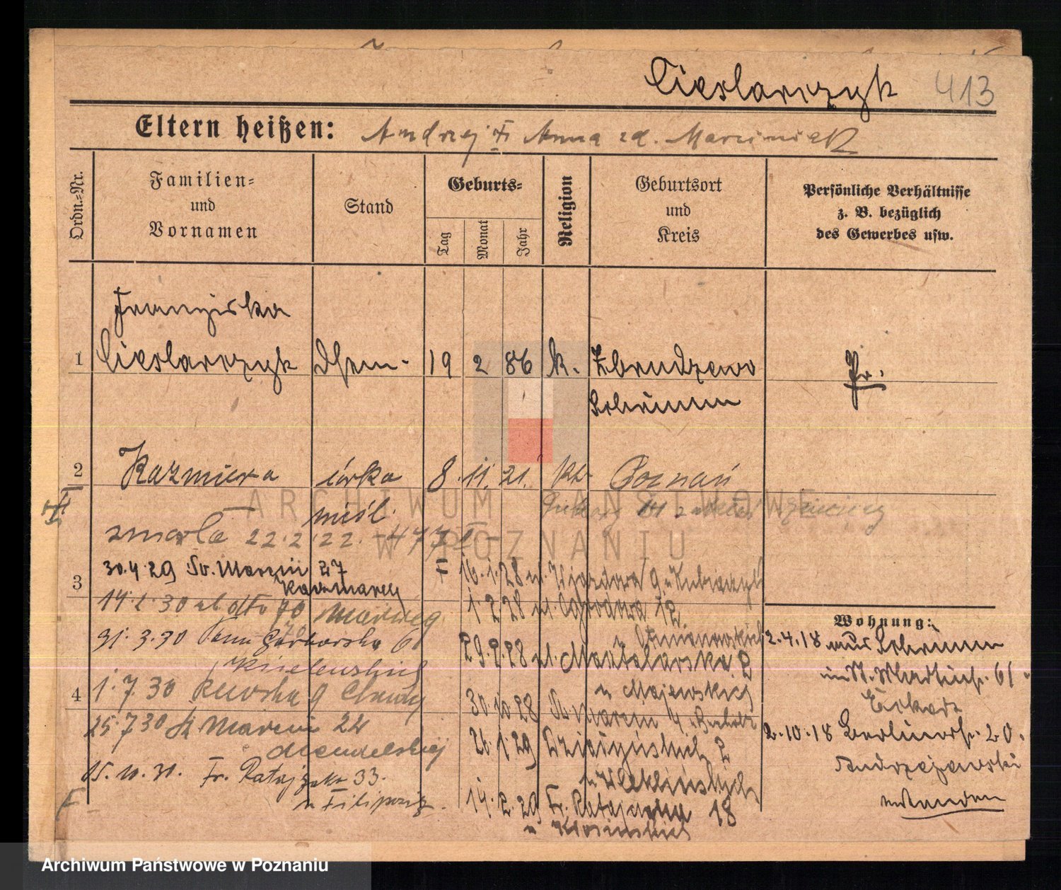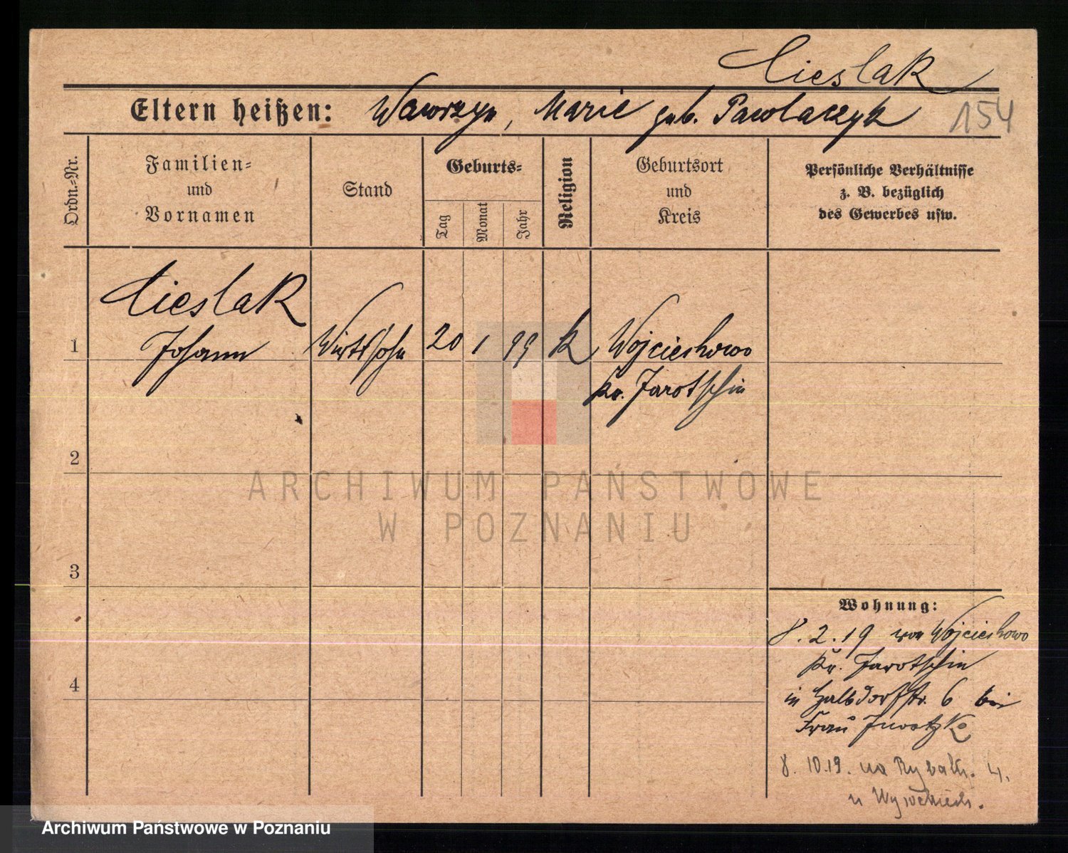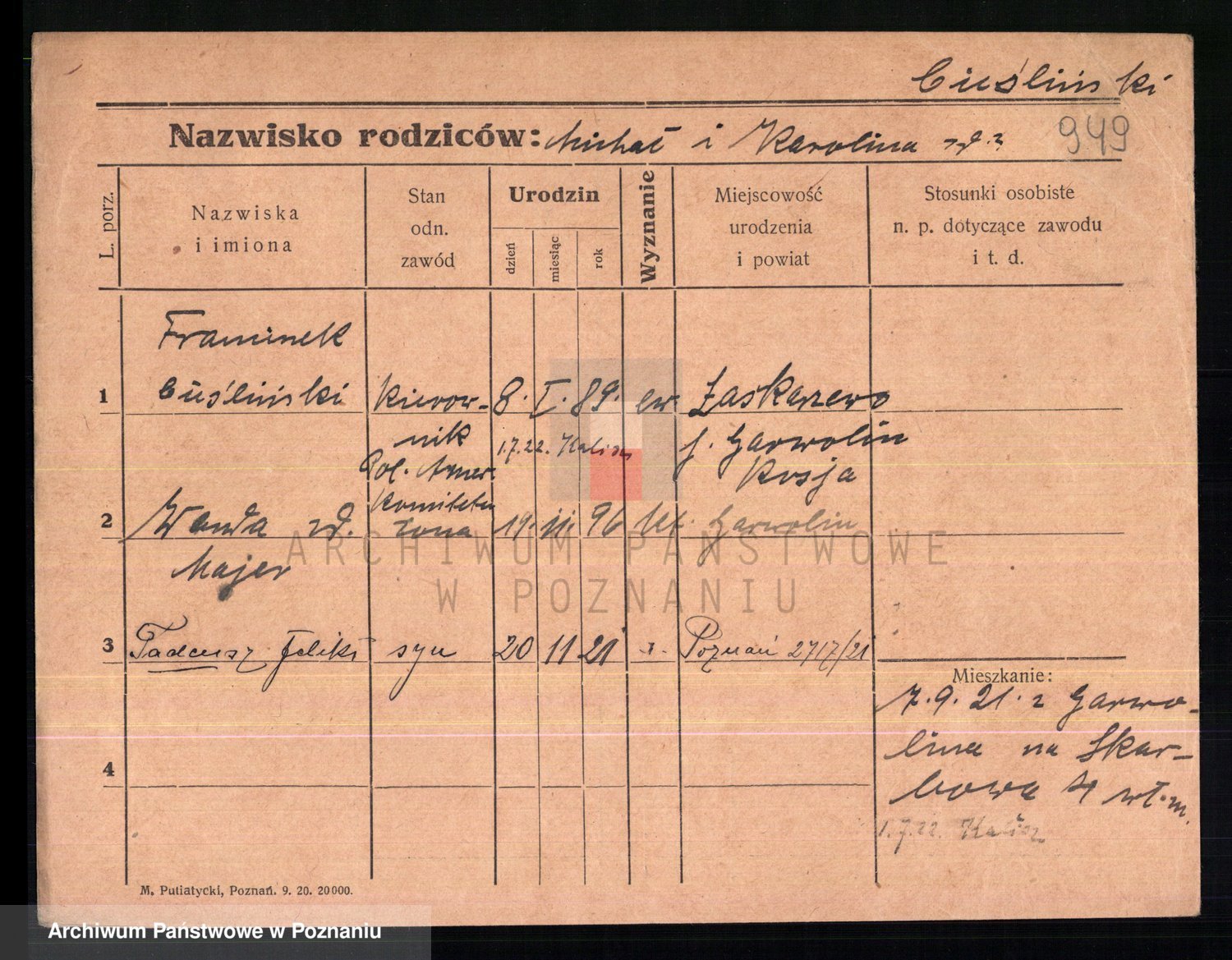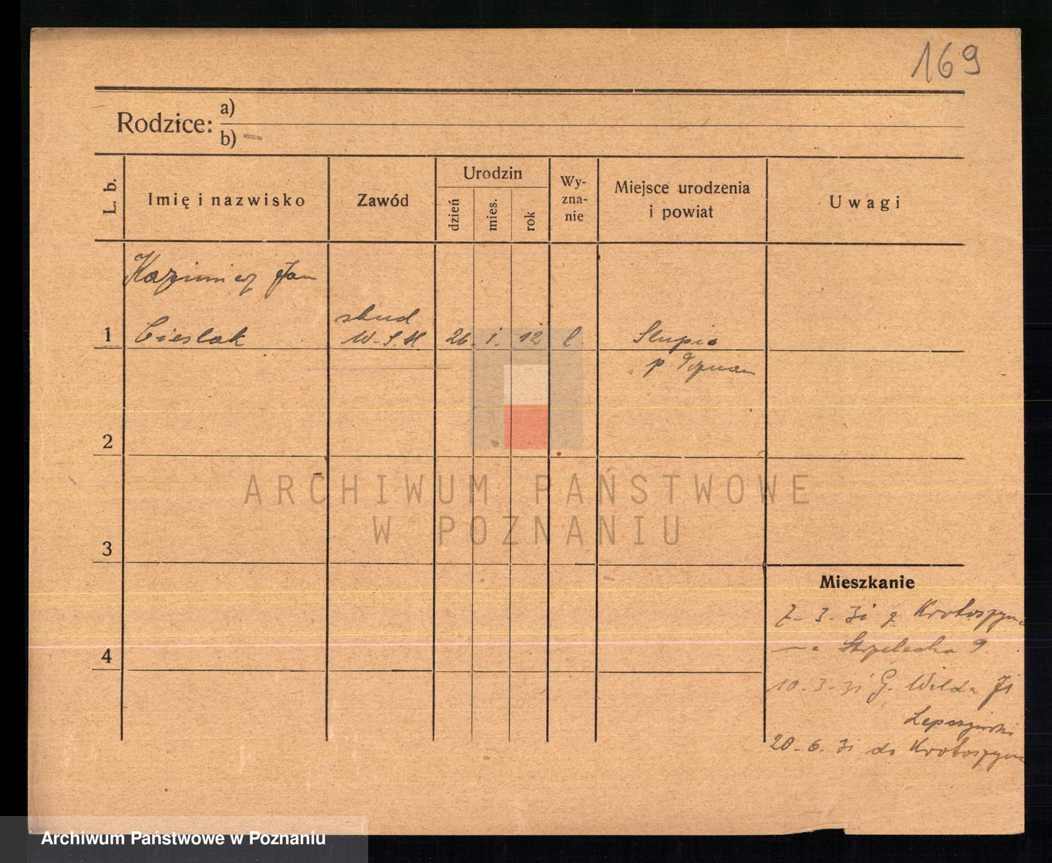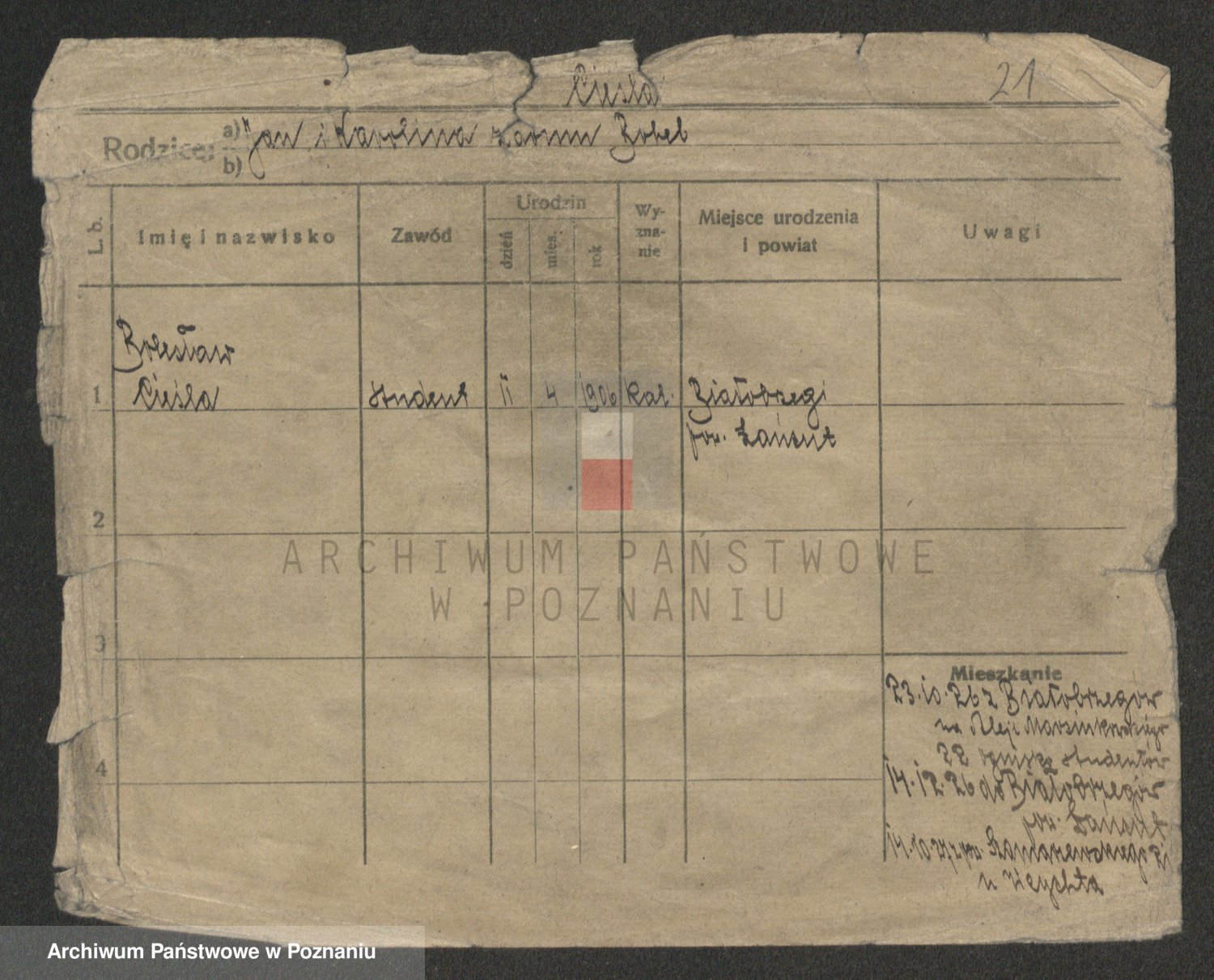 Podgląd karty osobowej dostępny jest po kliknięciu na nazwisko lub ikonkę karty. Można dokonywać powiększenia (ikony na górze) lub przechodzić między kolejnymi skanami (strzałki po bokach).