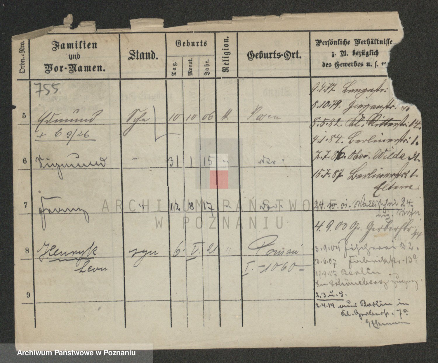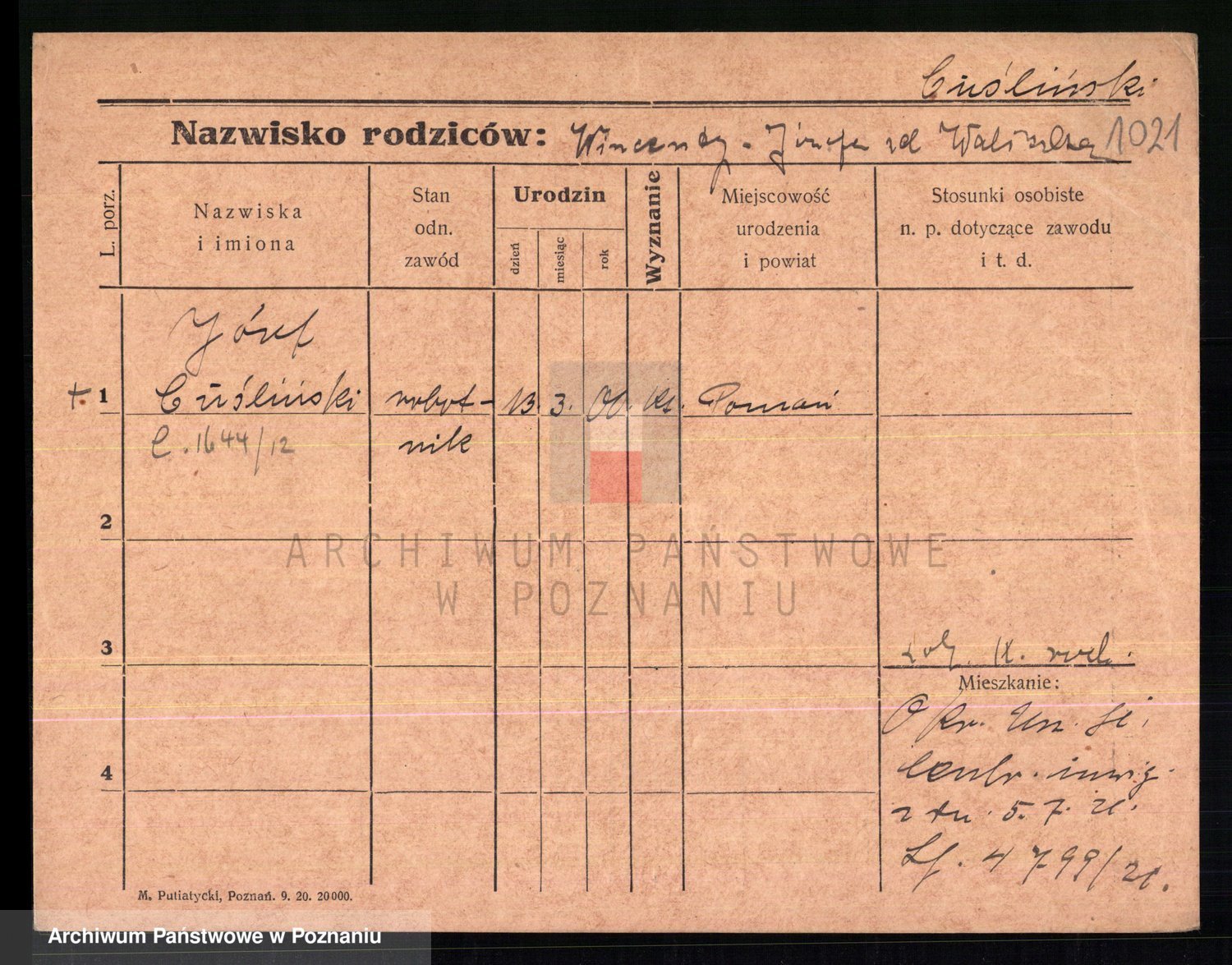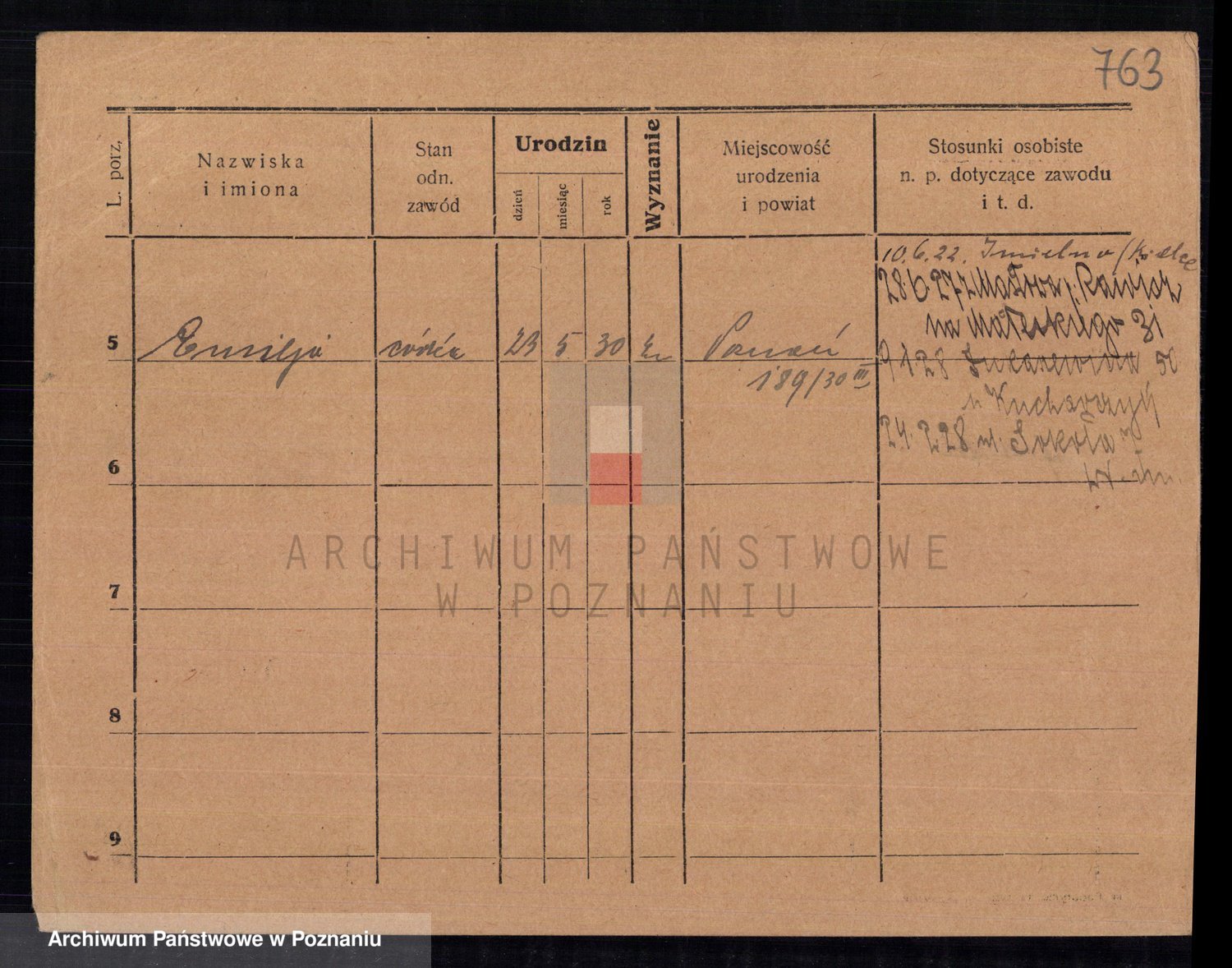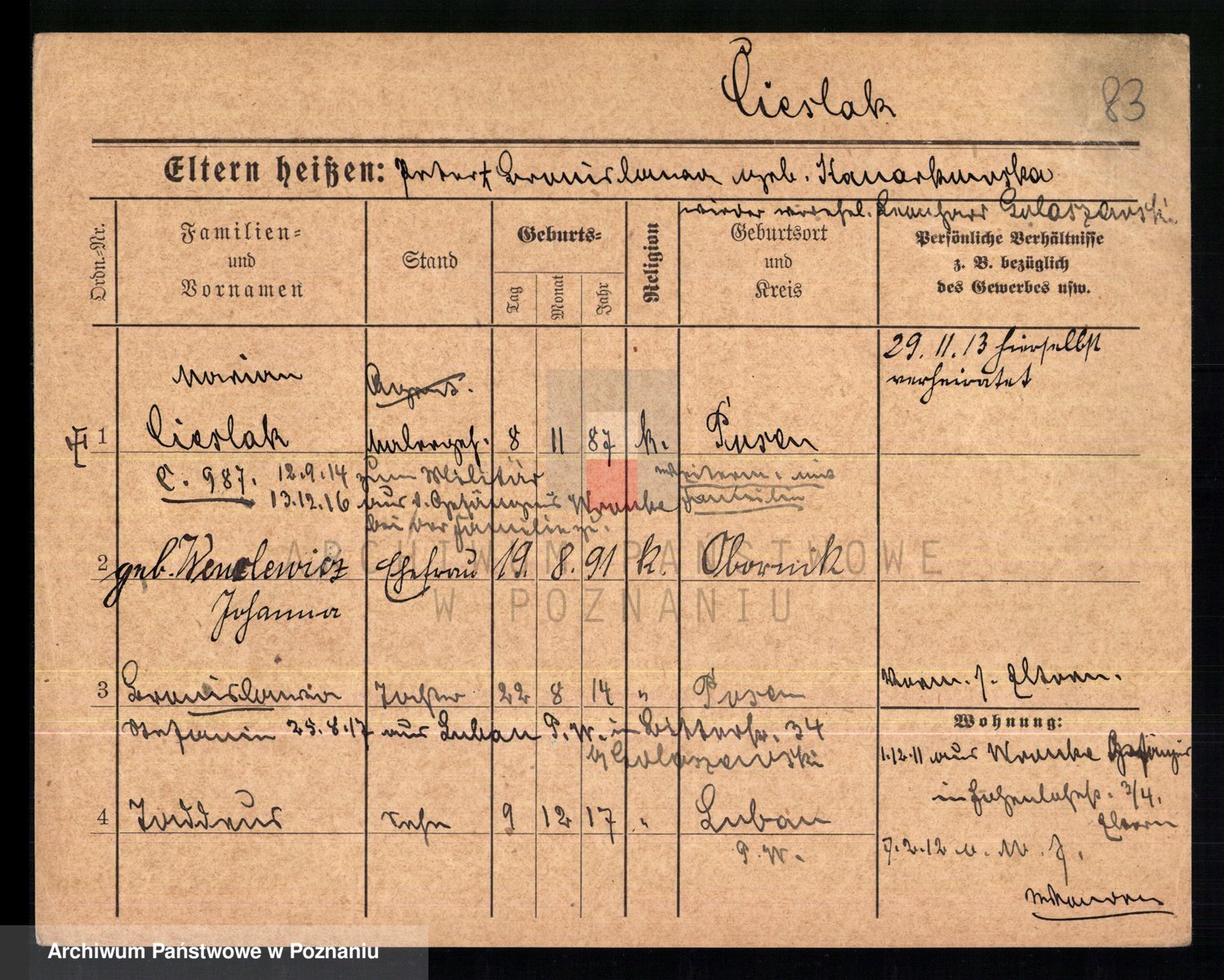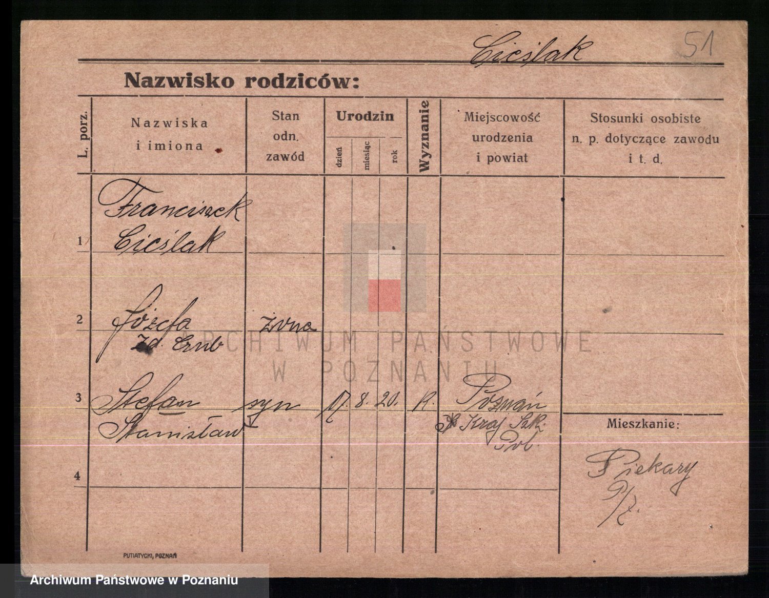 Podgląd karty osobowej dostępny jest po kliknięciu na nazwisko lub ikonkę karty. Można dokonywać powiększenia (ikony na górze) lub przechodzić między kolejnymi skanami (strzałki po bokach).