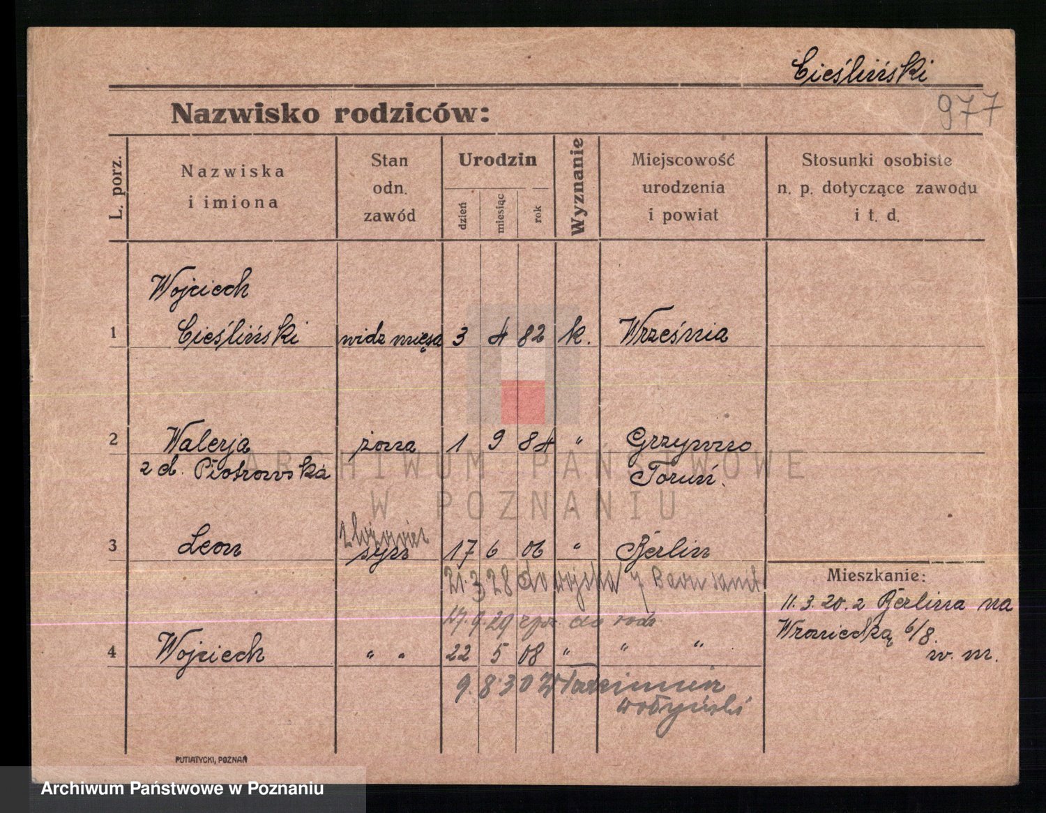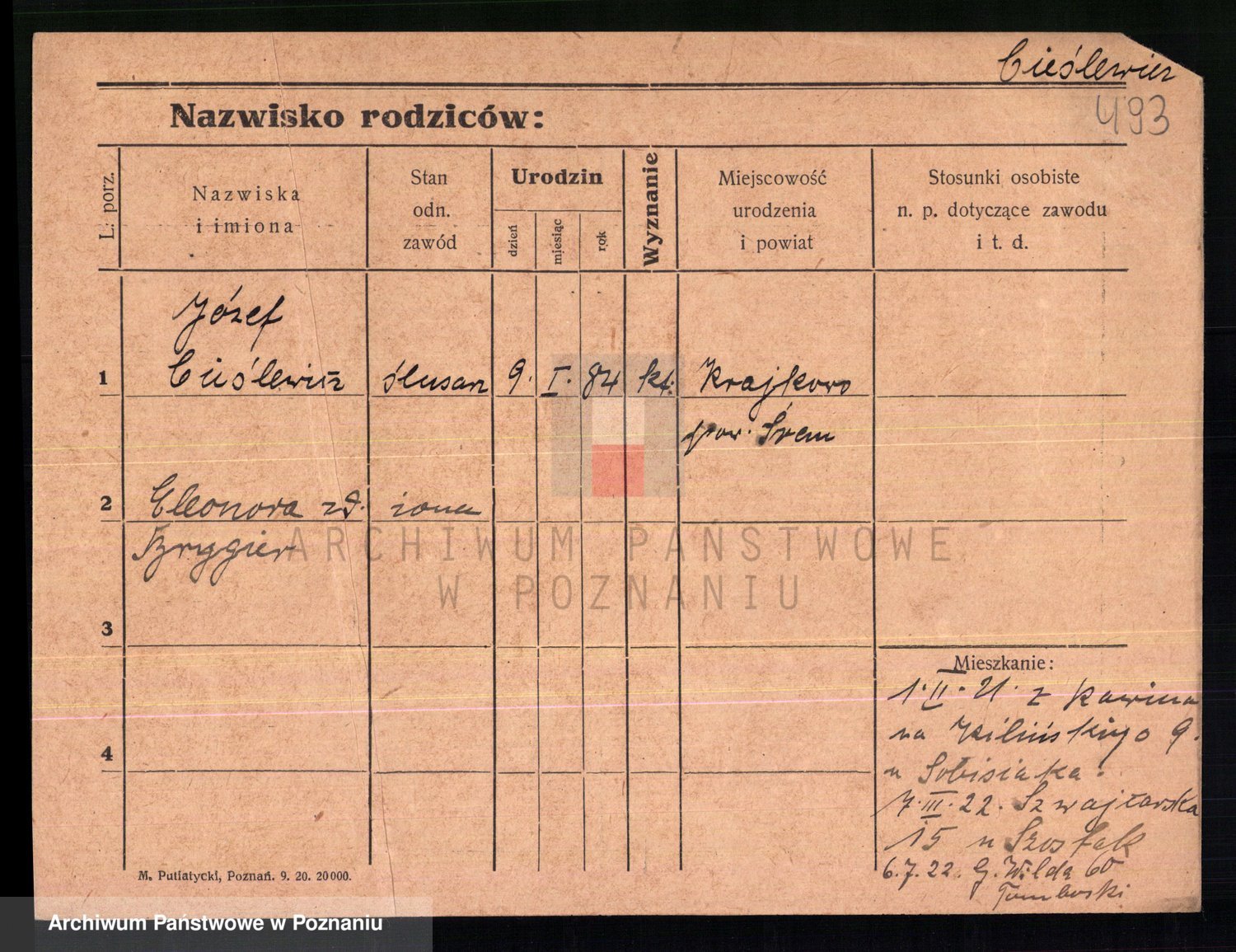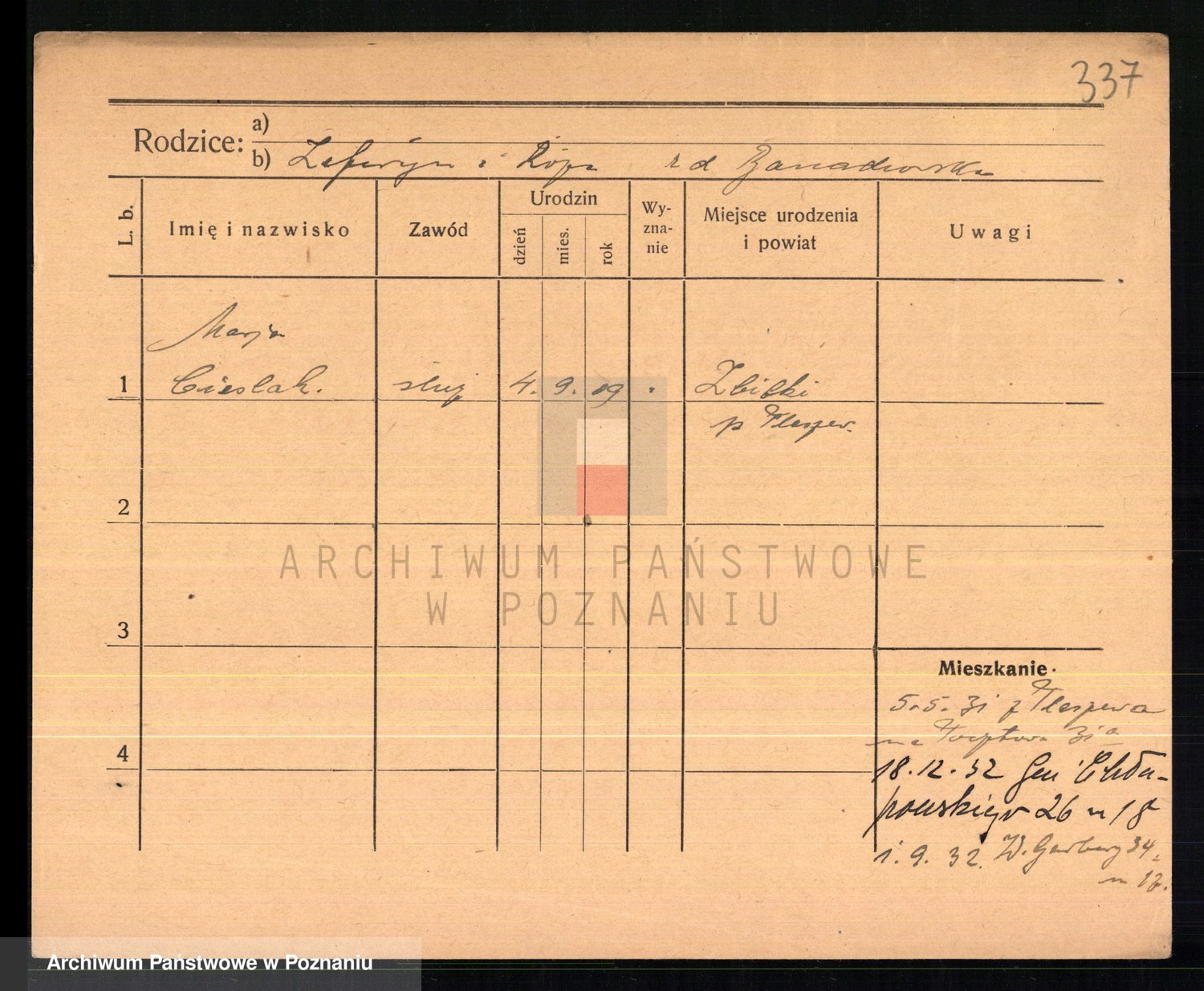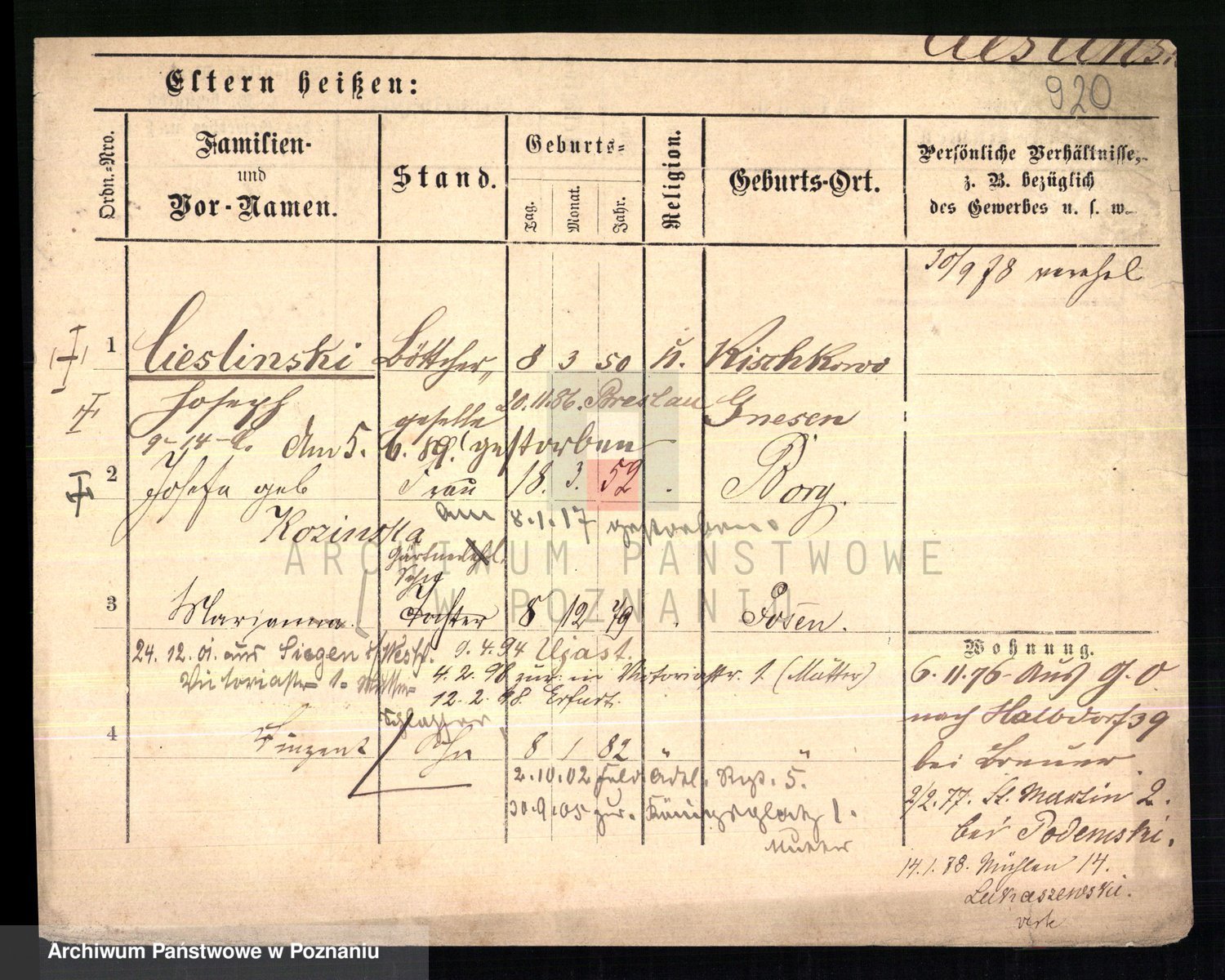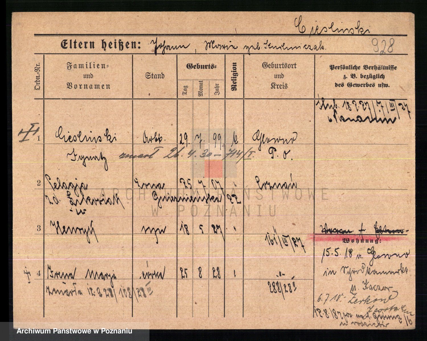 Podgląd karty osobowej dostępny jest po kliknięciu na nazwisko lub ikonkę karty. Można dokonywać powiększenia (ikony na górze) lub przechodzić między kolejnymi skanami (strzałki po bokach).