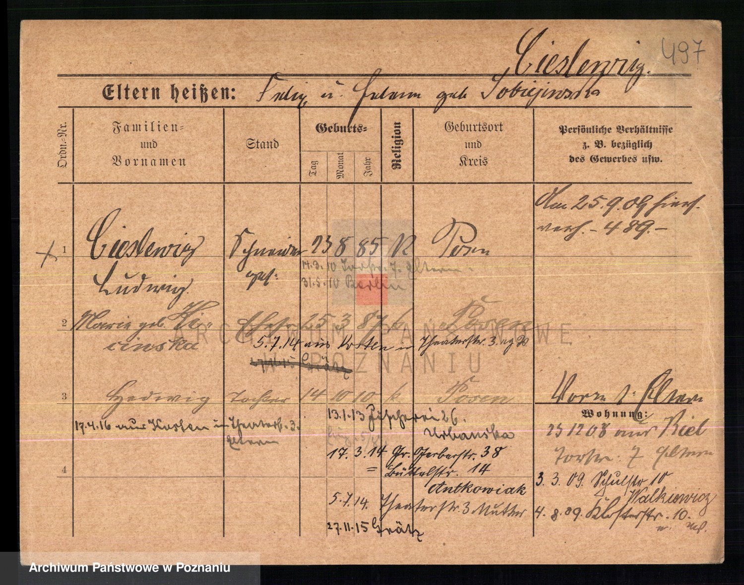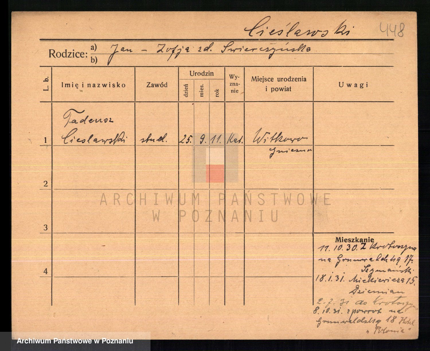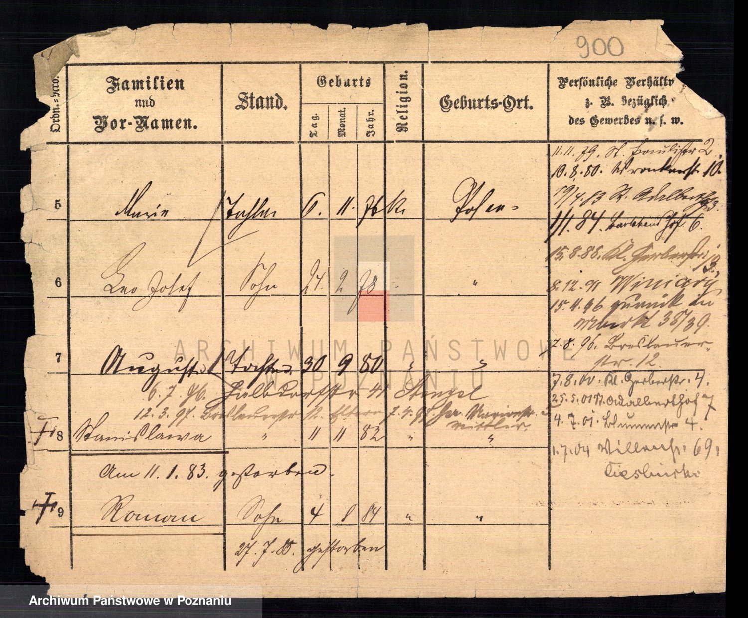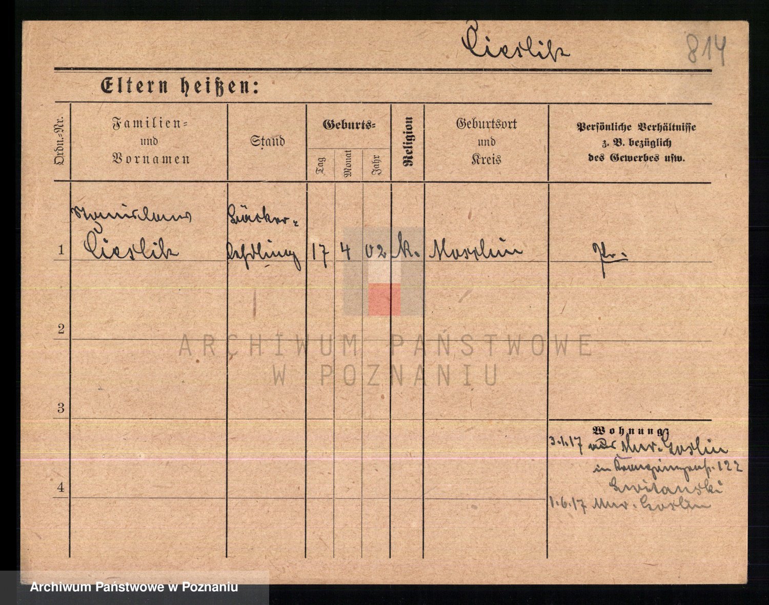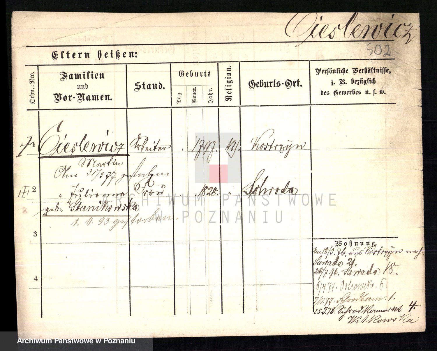 Podgląd karty osobowej dostępny jest po kliknięciu na nazwisko lub ikonkę karty. Można dokonywać powiększenia (ikony na górze) lub przechodzić między kolejnymi skanami (strzałki po bokach).