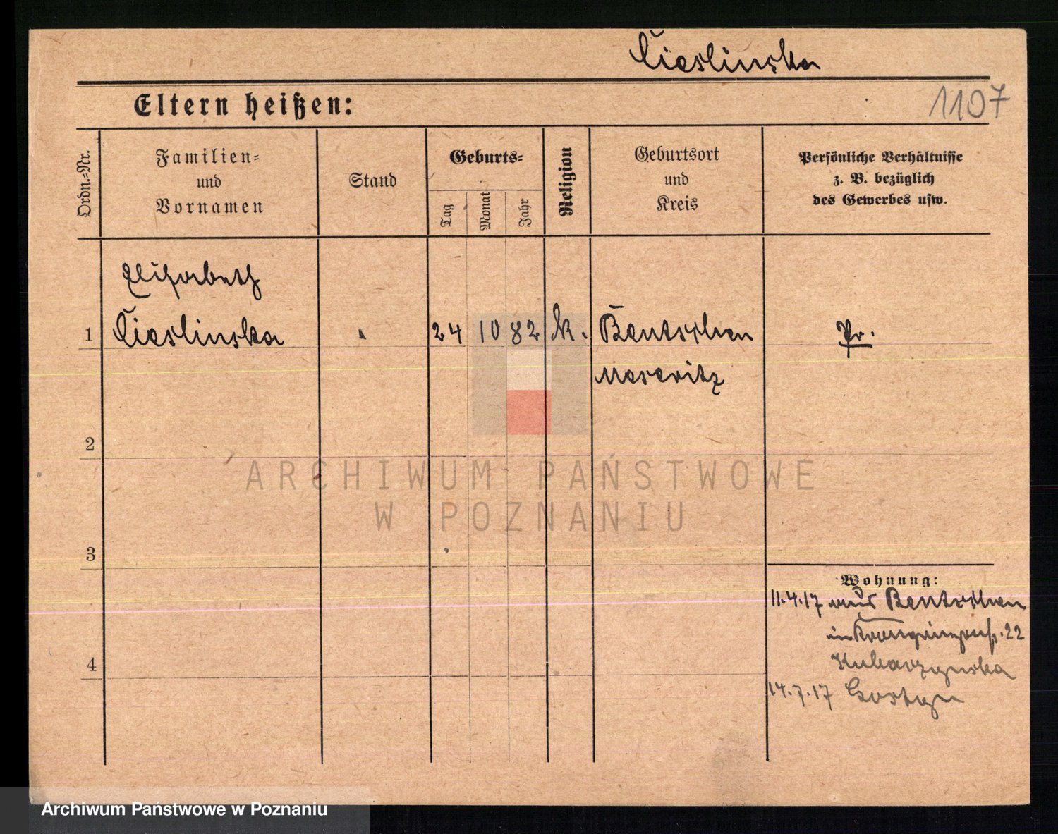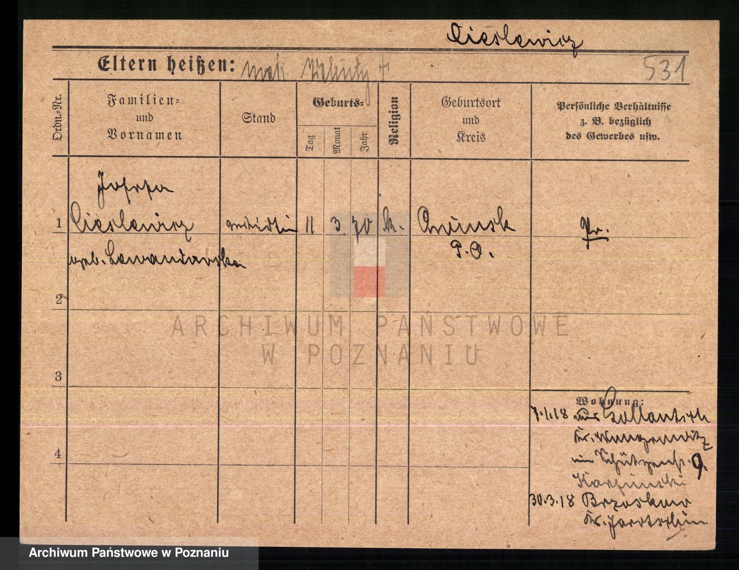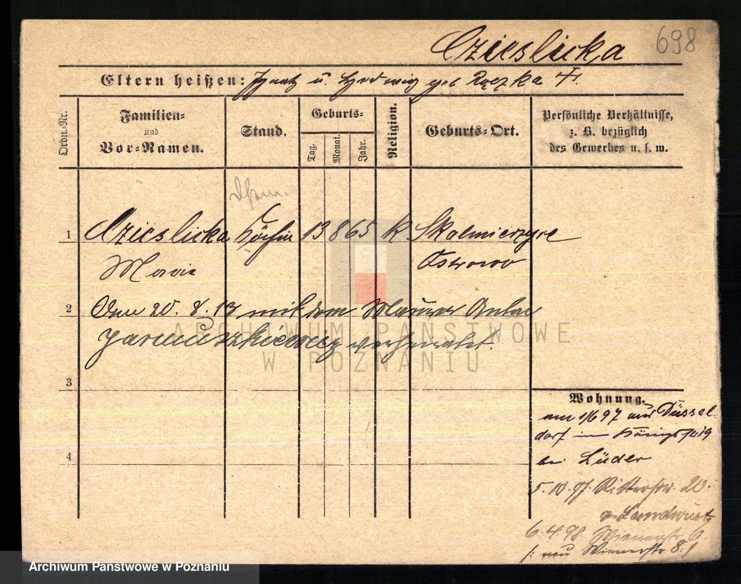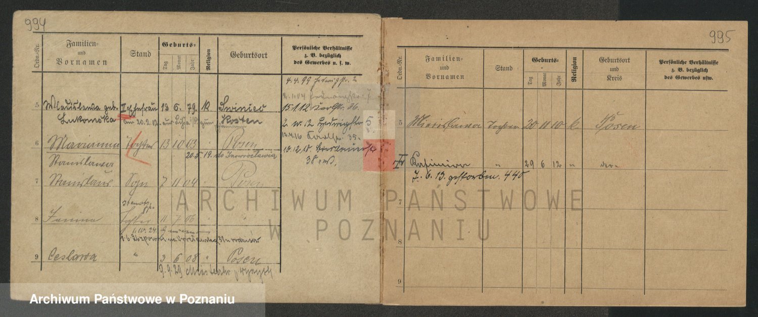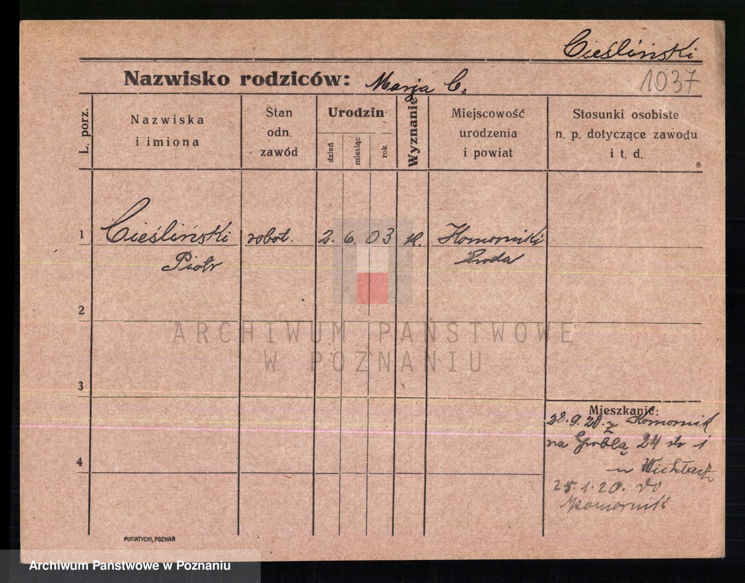 Podgląd karty osobowej dostępny jest po kliknięciu na nazwisko lub ikonkę karty. Można dokonywać powiększenia (ikony na górze) lub przechodzić między kolejnymi skanami (strzałki po bokach).