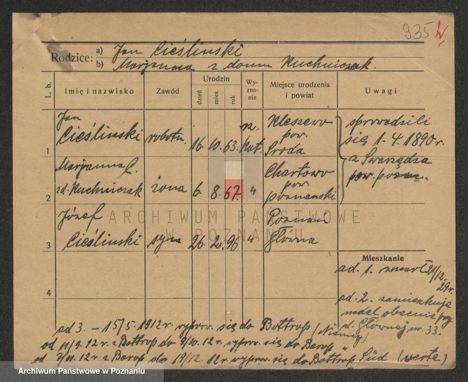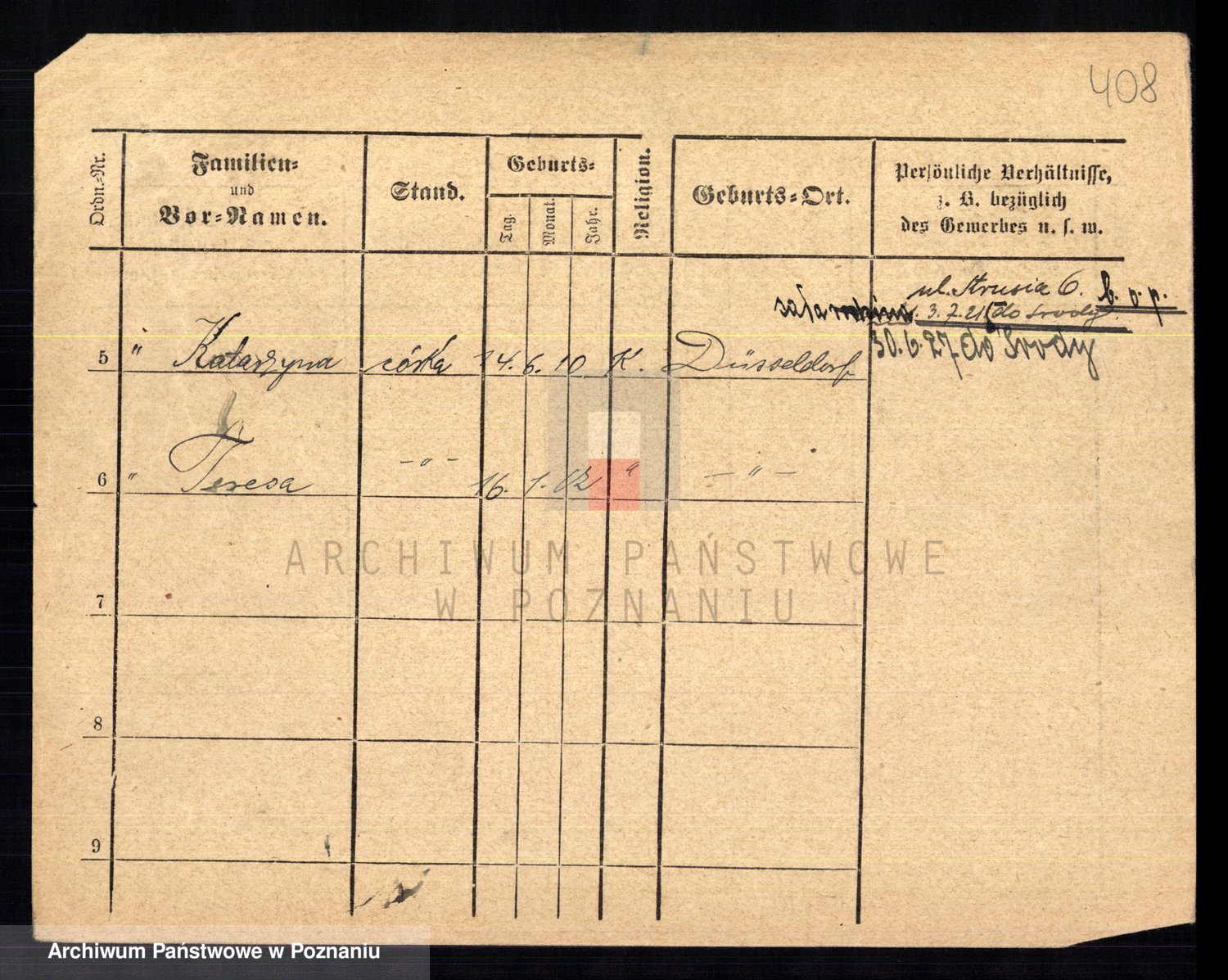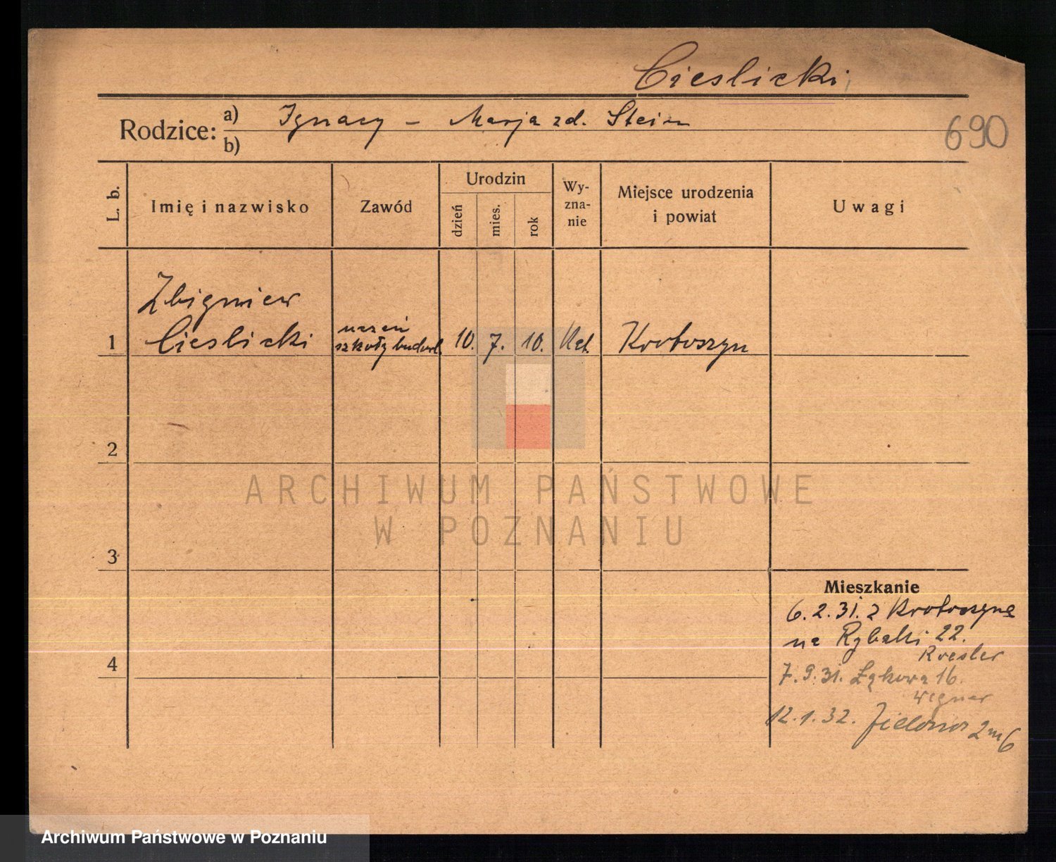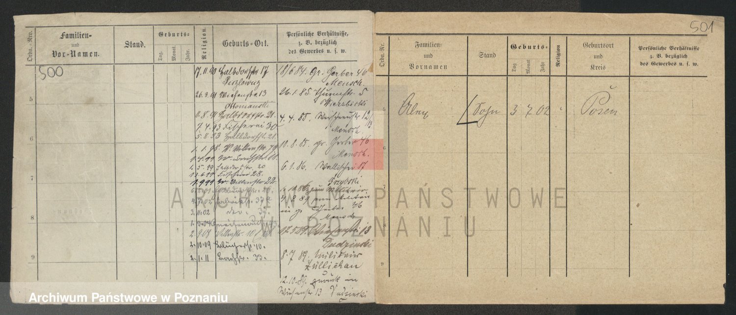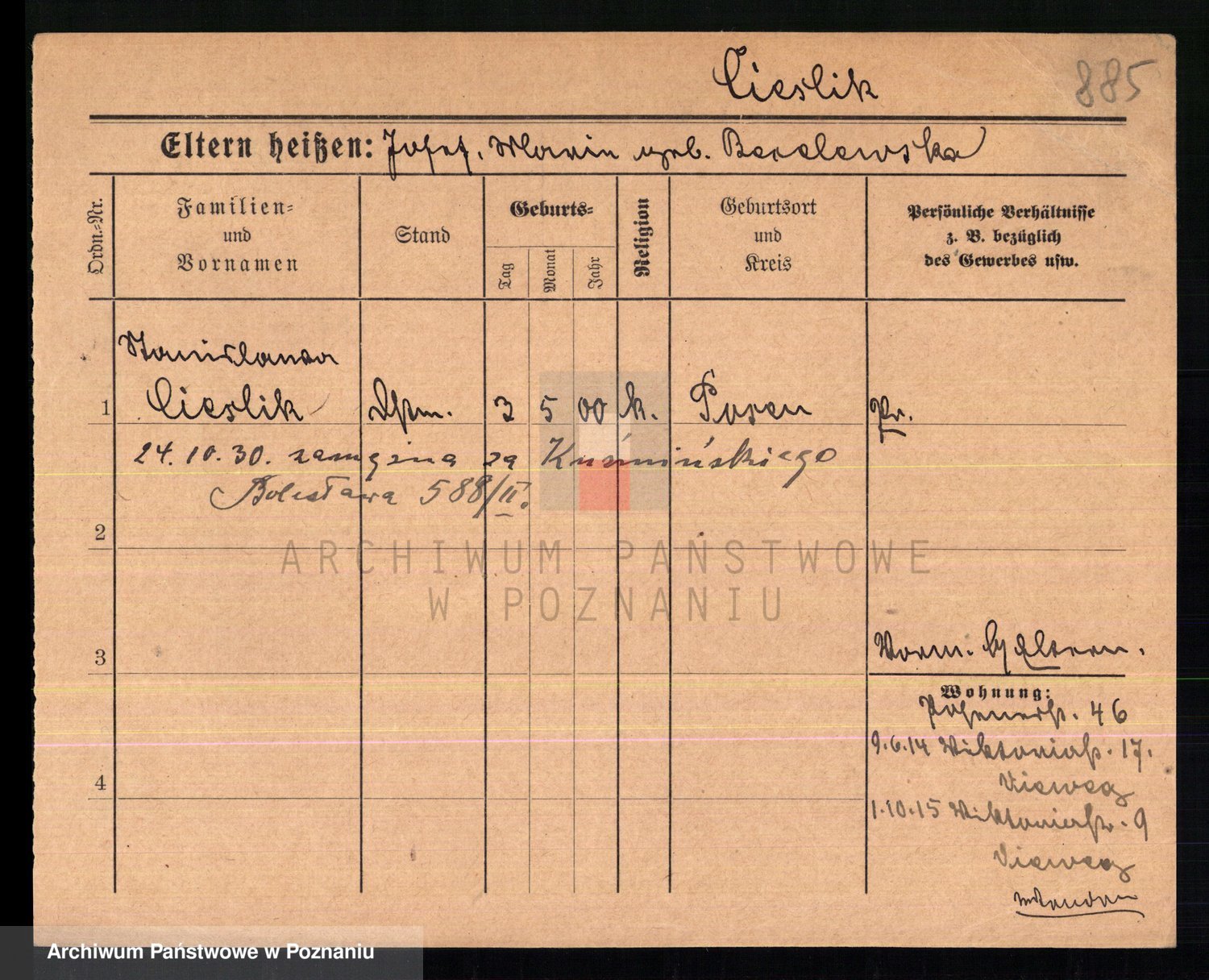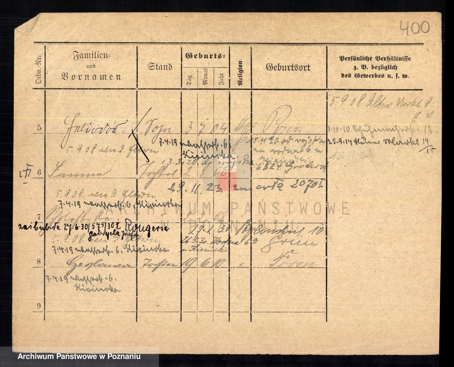 Podgląd karty osobowej dostępny jest po kliknięciu na nazwisko lub ikonkę karty. Można dokonywać powiększenia (ikony na górze) lub przechodzić między kolejnymi skanami (strzałki po bokach).