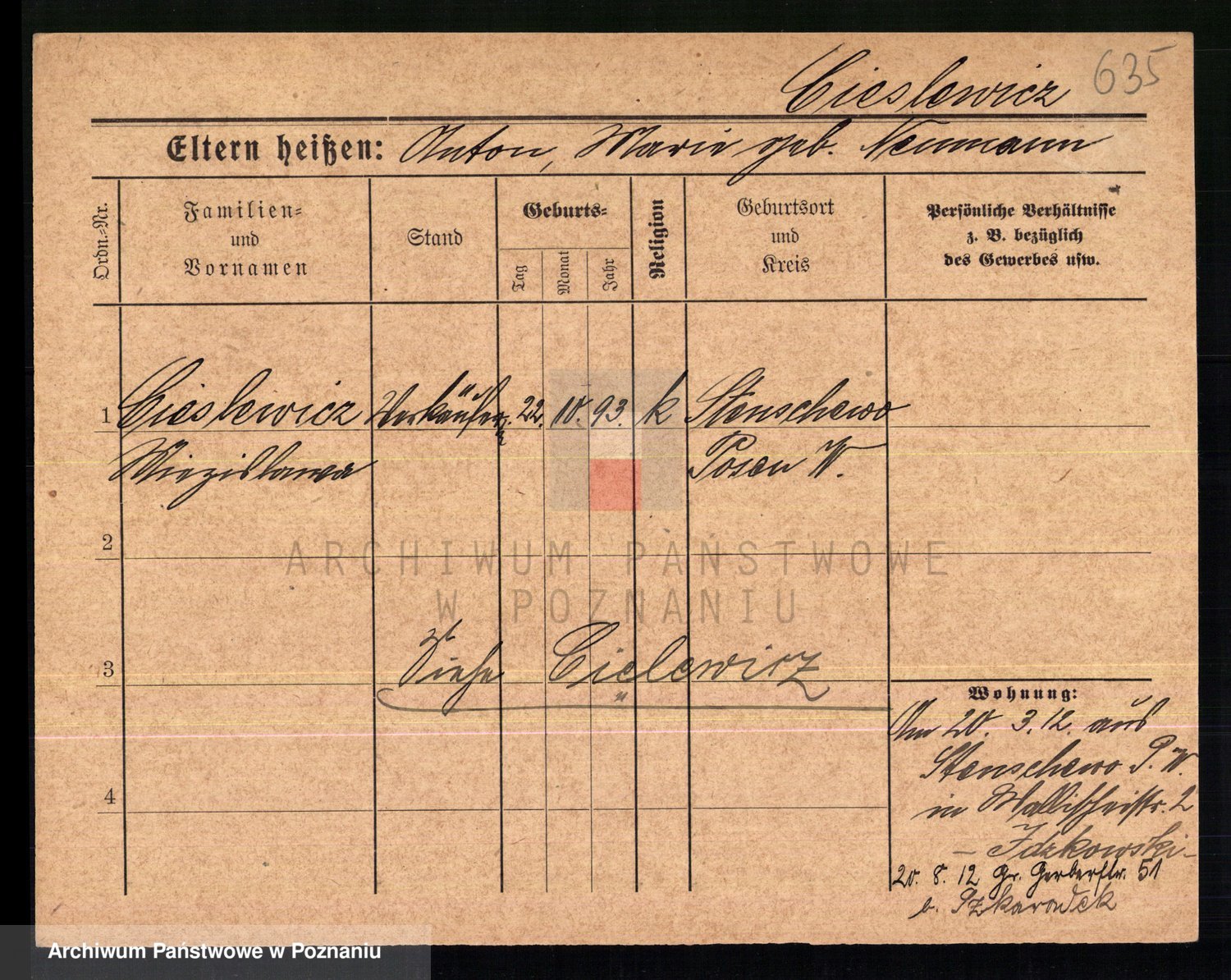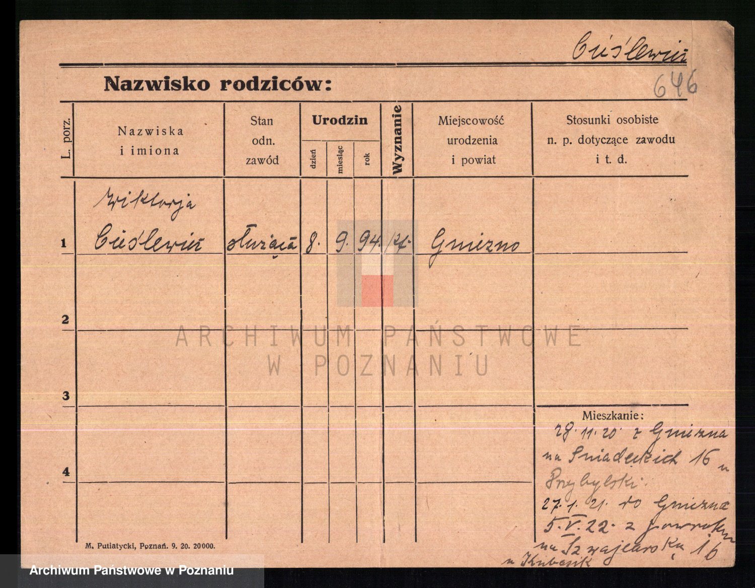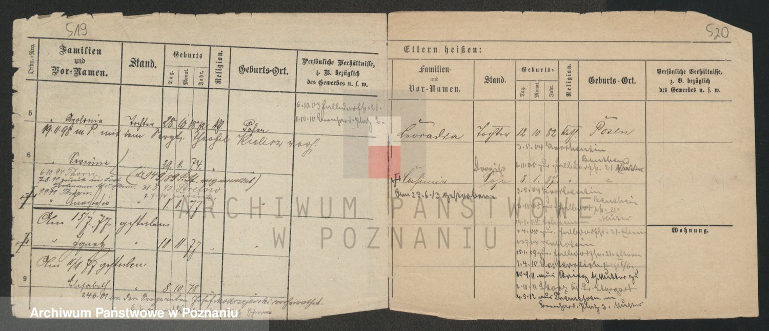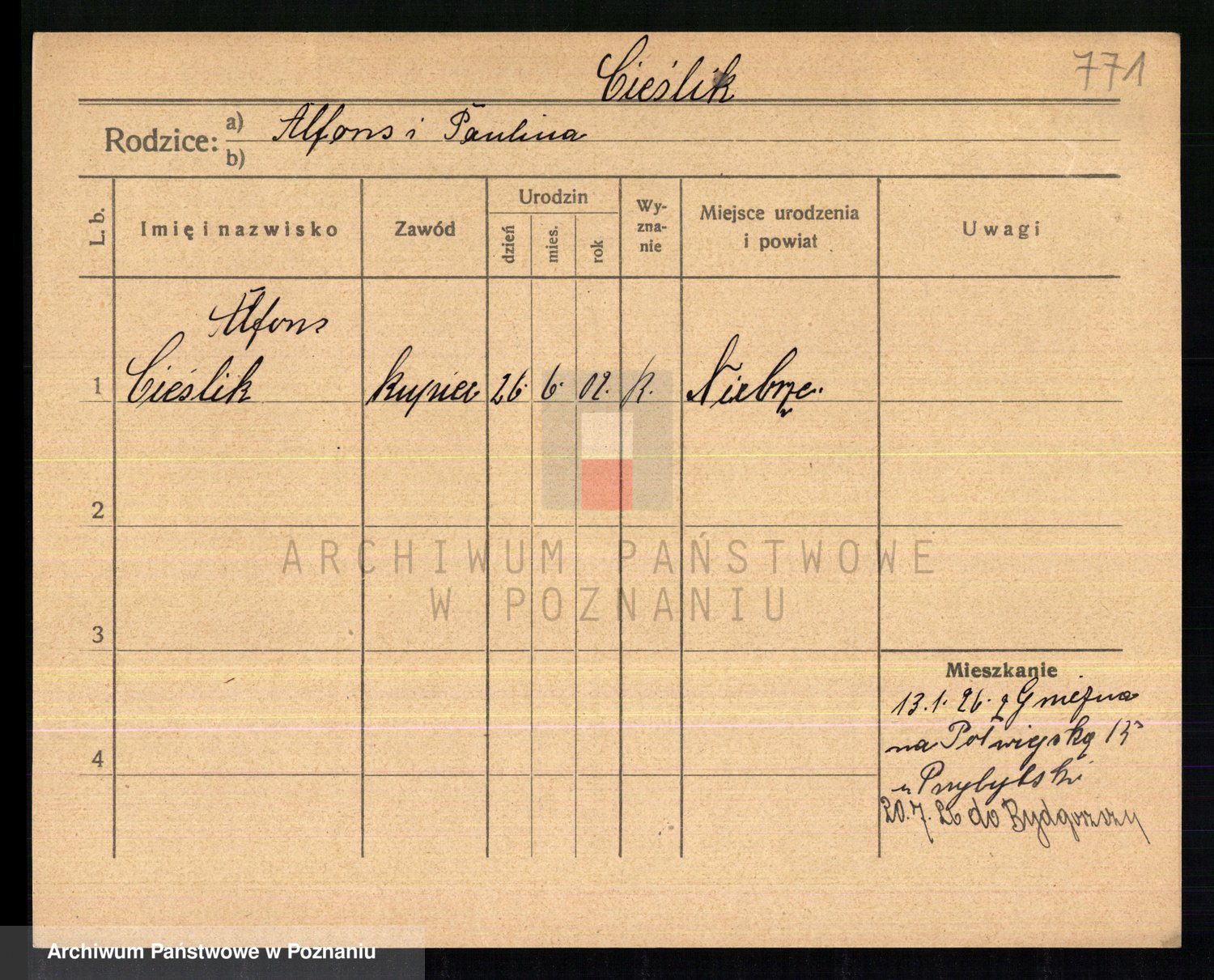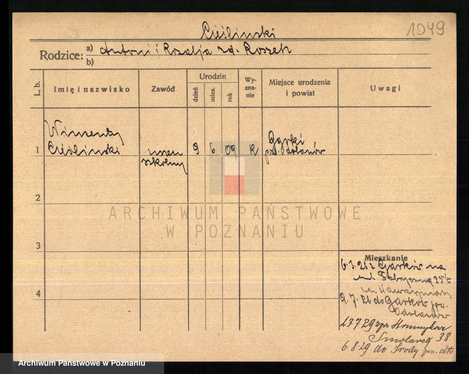 Podgląd karty osobowej dostępny jest po kliknięciu na nazwisko lub ikonkę karty. Można dokonywać powiększenia (ikony na górze) lub przechodzić między kolejnymi skanami (strzałki po bokach).