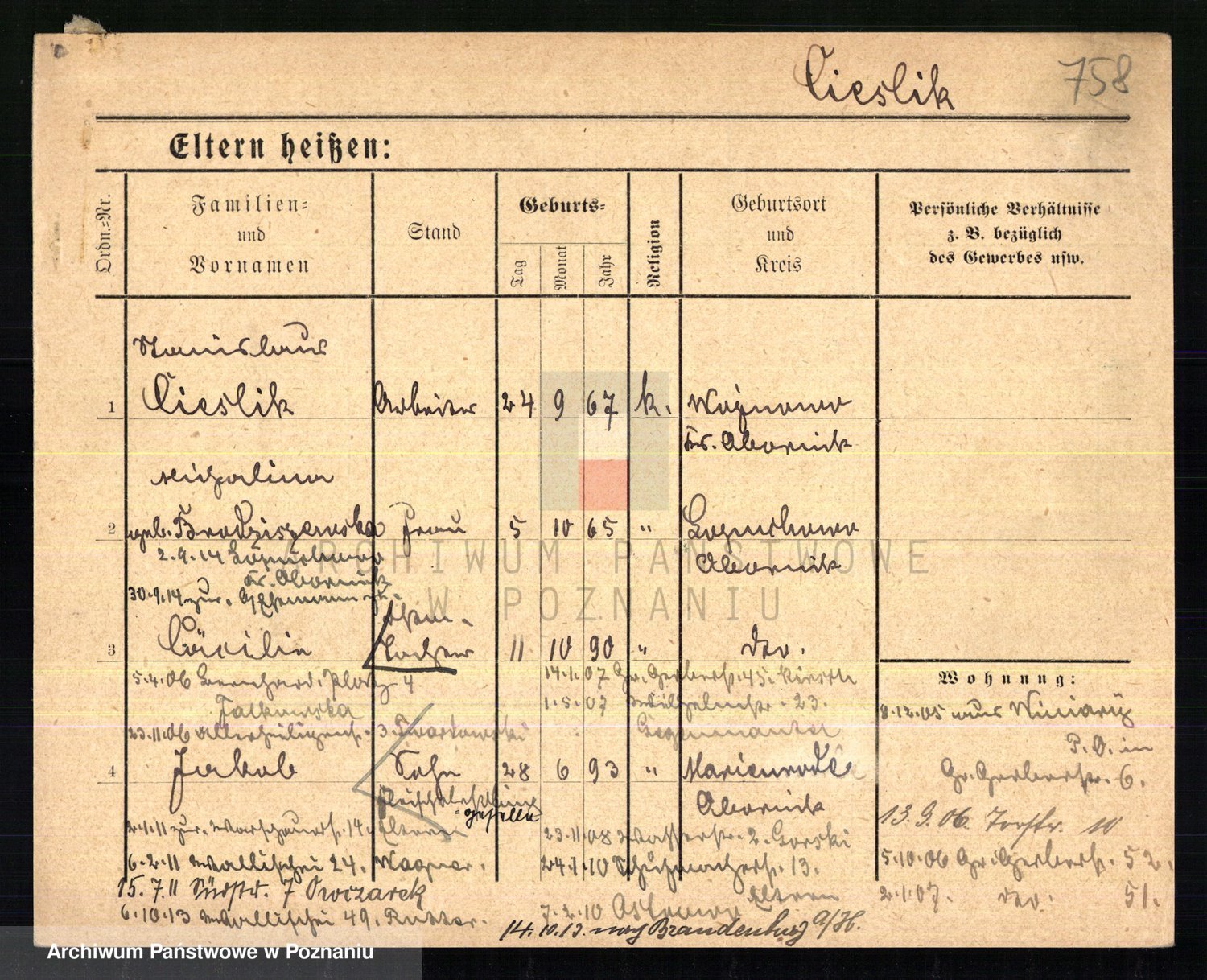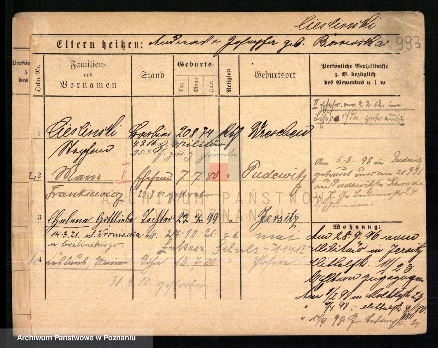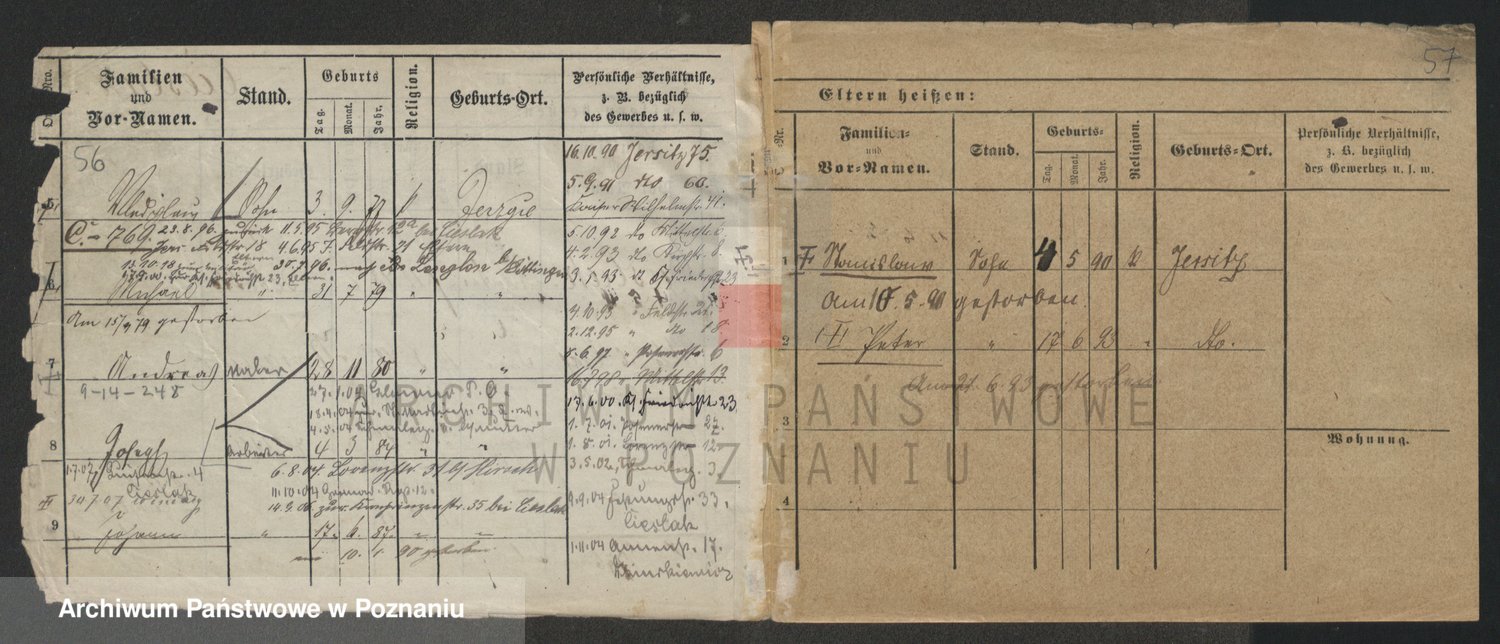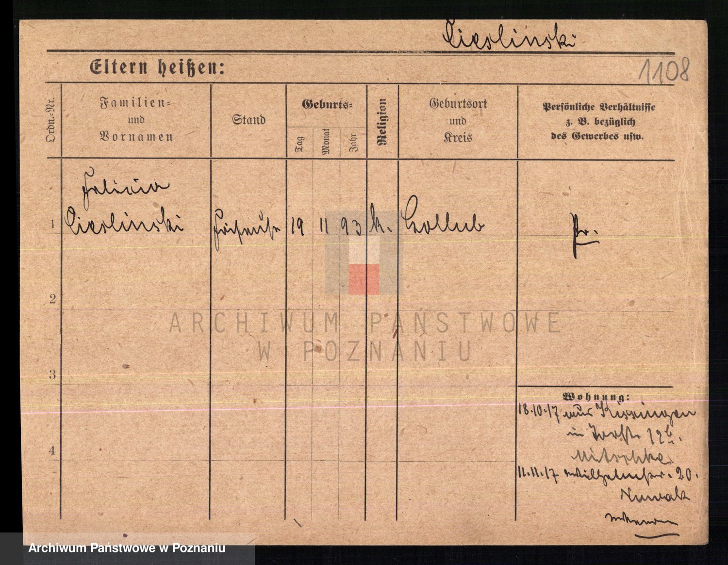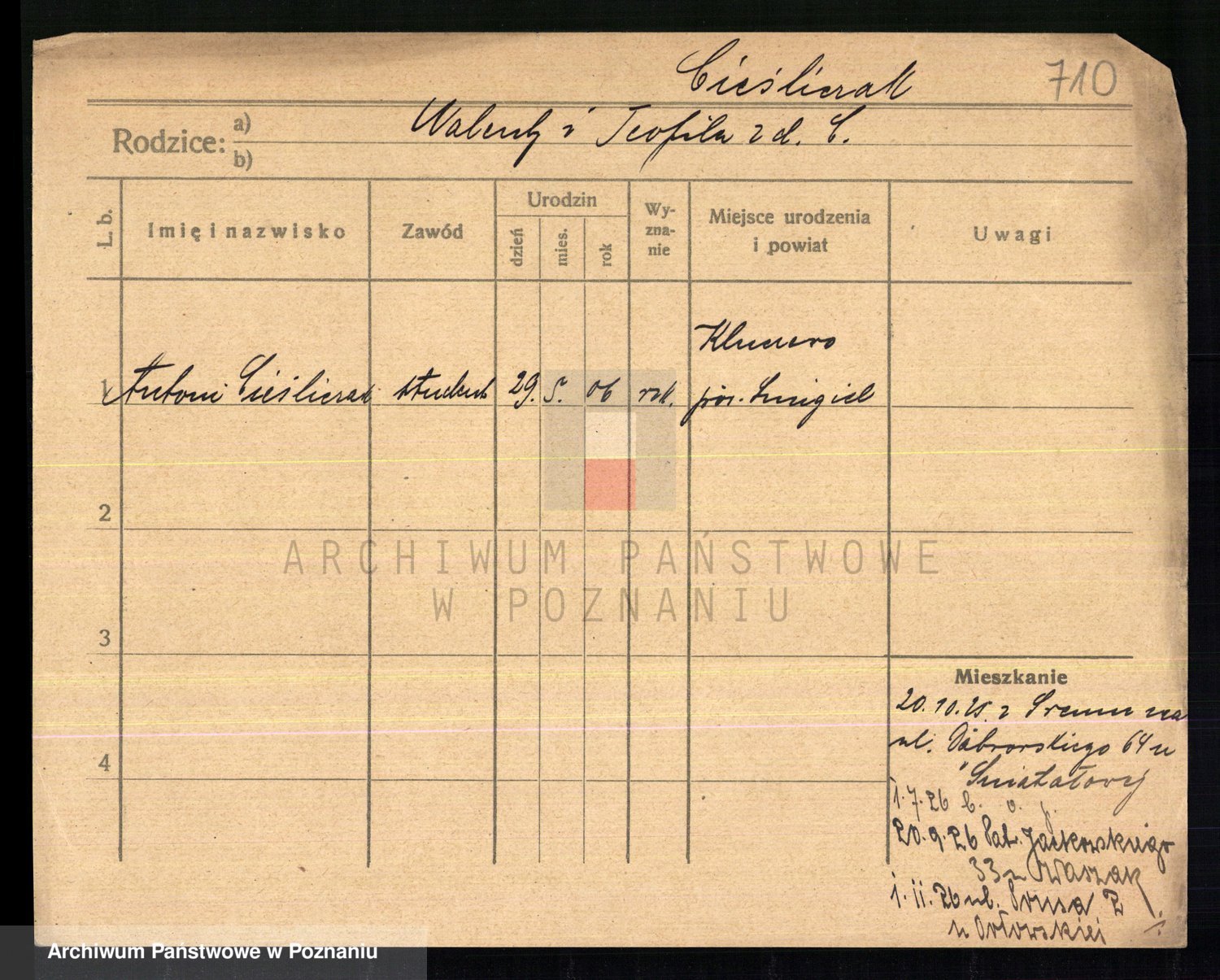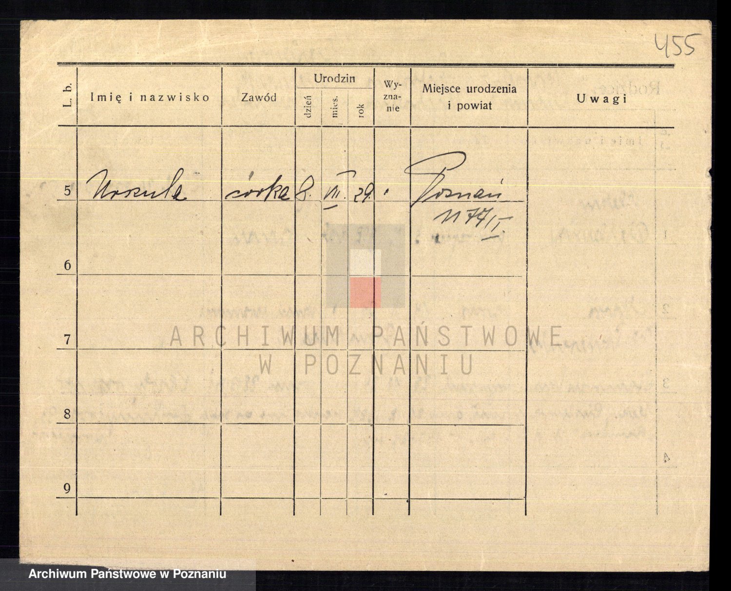 Podgląd karty osobowej dostępny jest po kliknięciu na nazwisko lub ikonkę karty. Można dokonywać powiększenia (ikony na górze) lub przechodzić między kolejnymi skanami (strzałki po bokach).