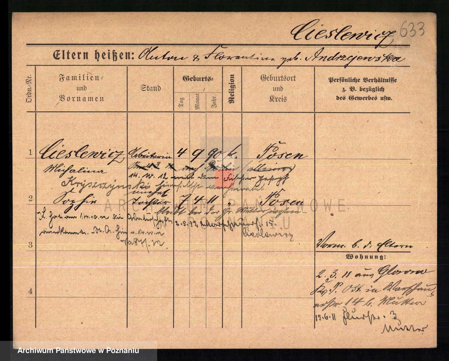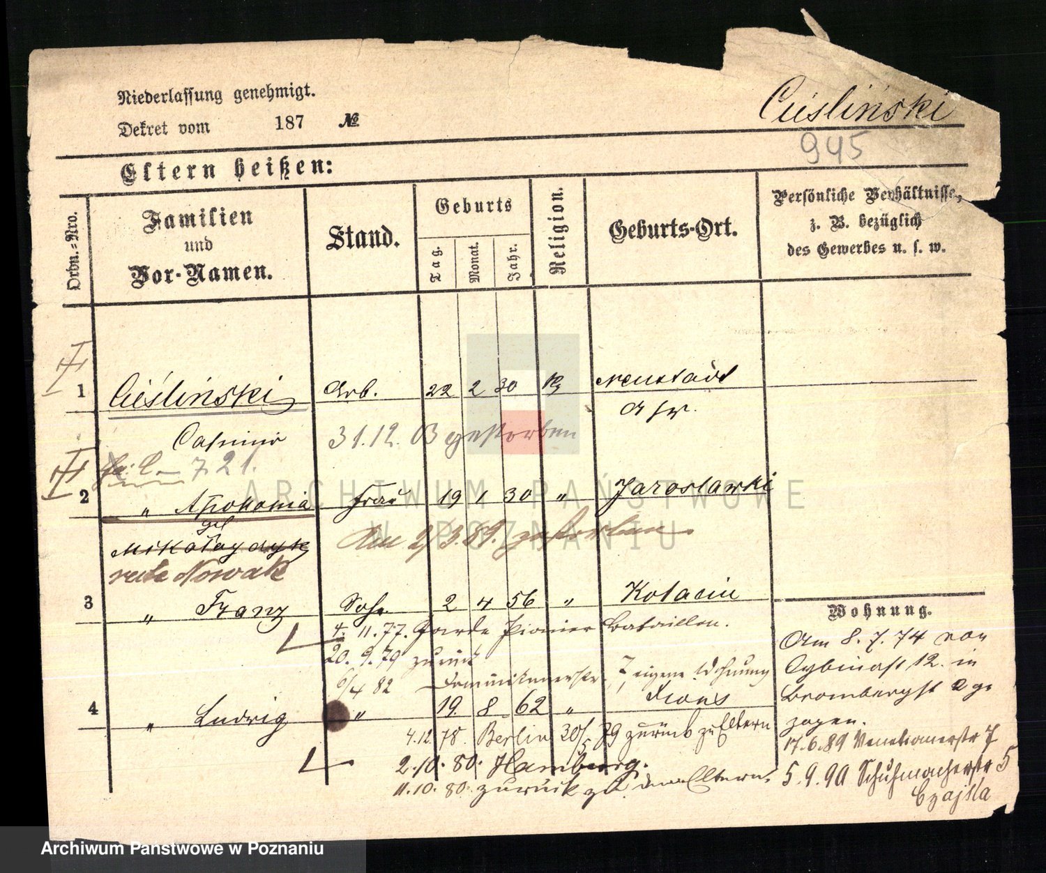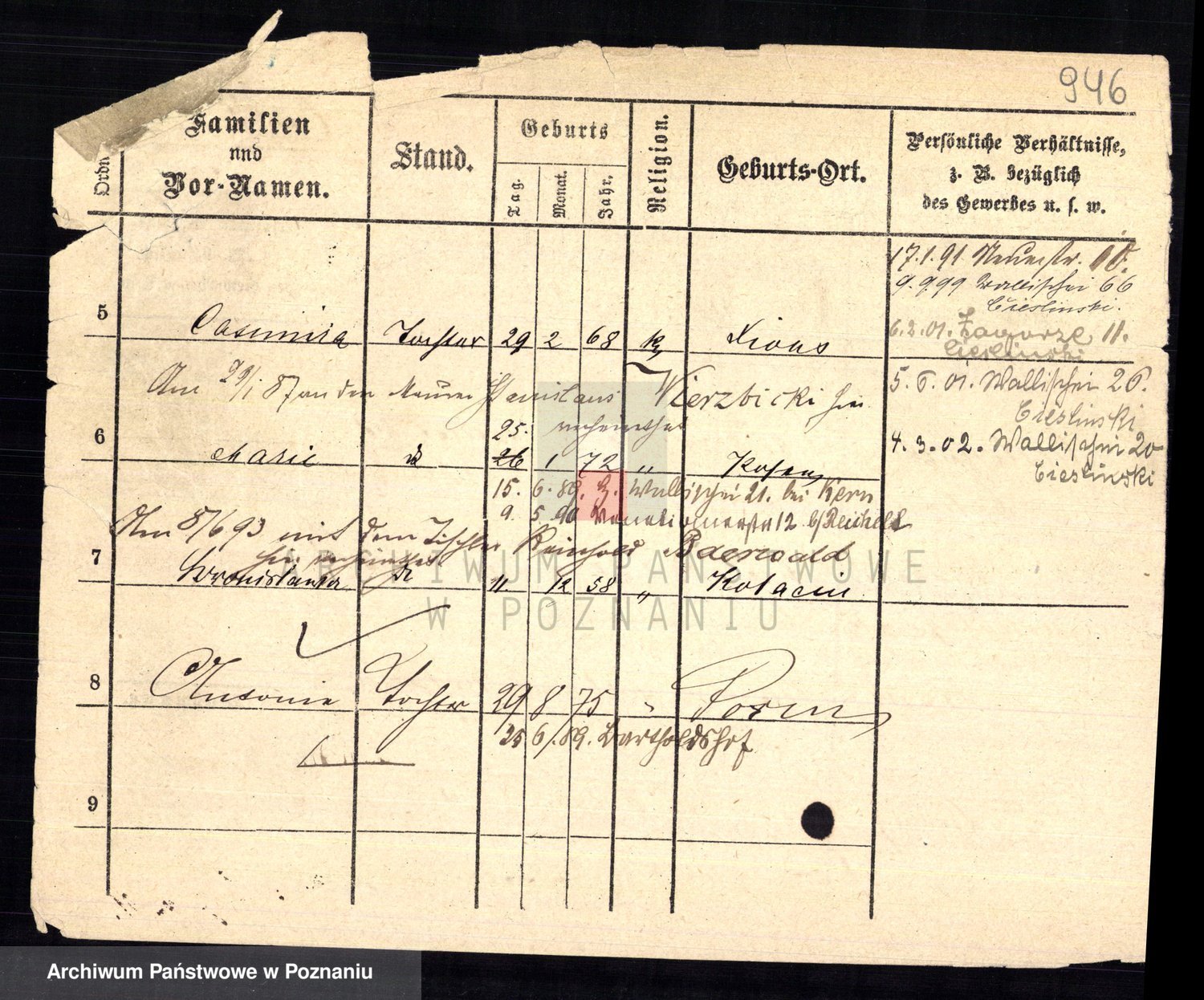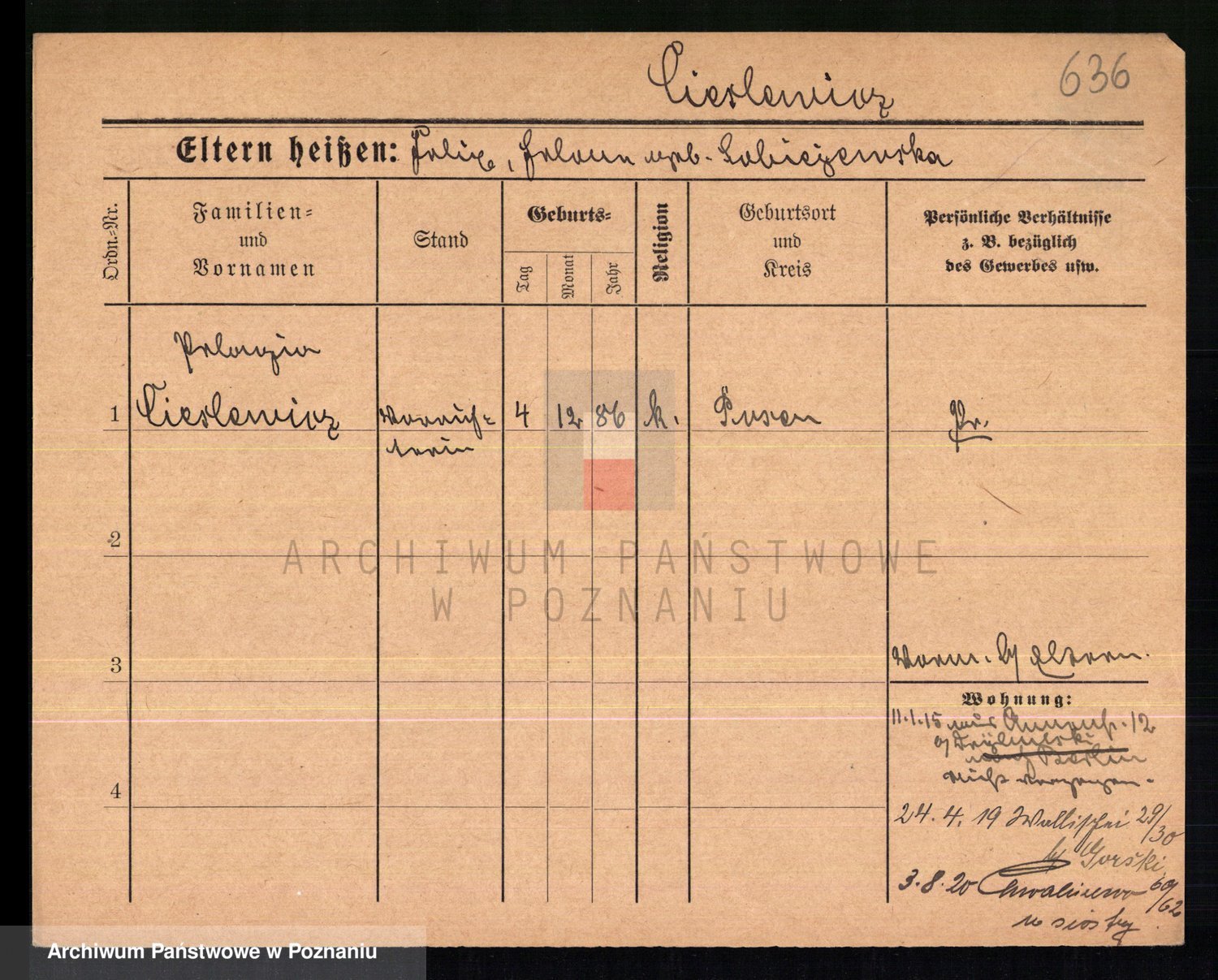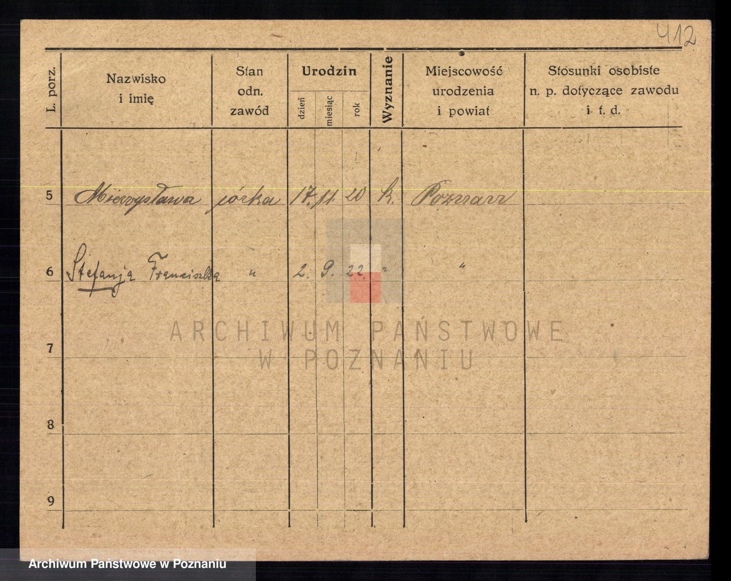 Podgląd karty osobowej dostępny jest po kliknięciu na nazwisko lub ikonkę karty. Można dokonywać powiększenia (ikony na górze) lub przechodzić między kolejnymi skanami (strzałki po bokach).