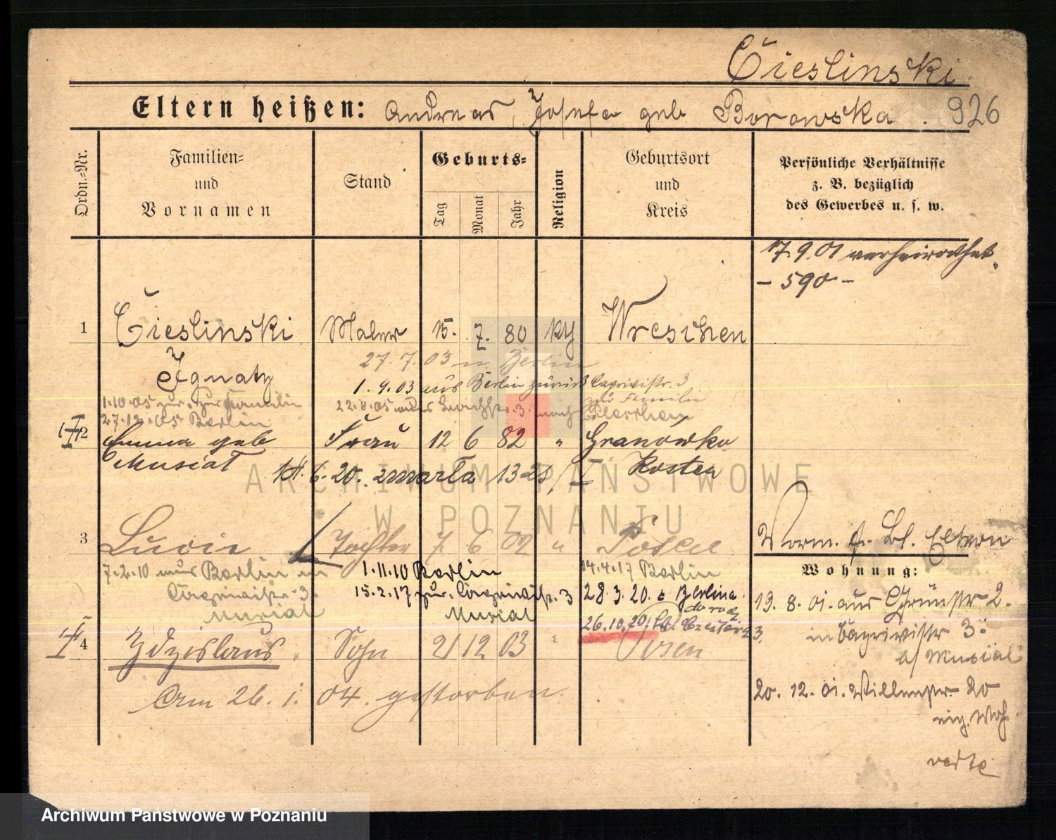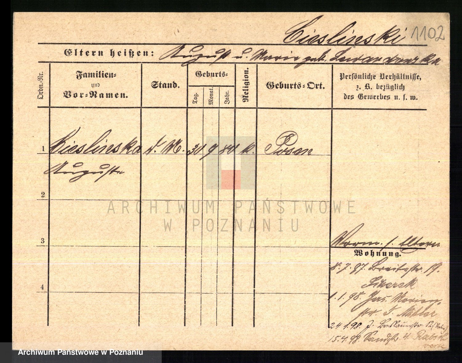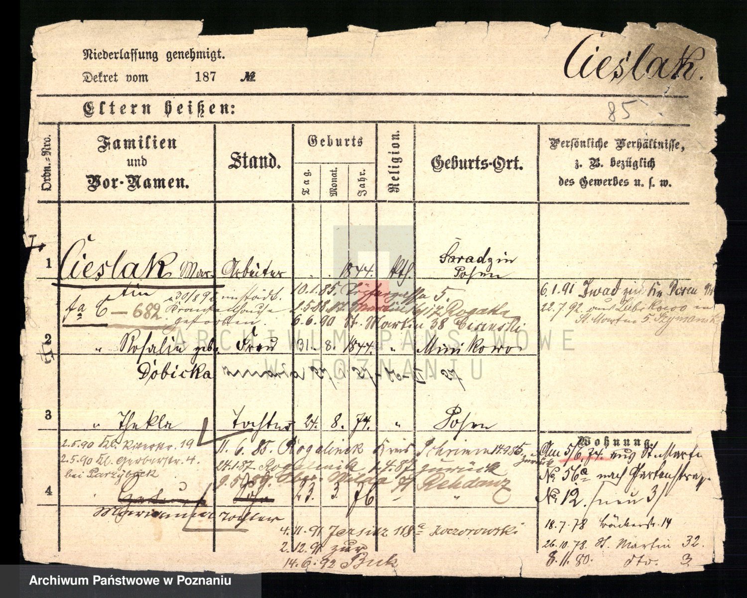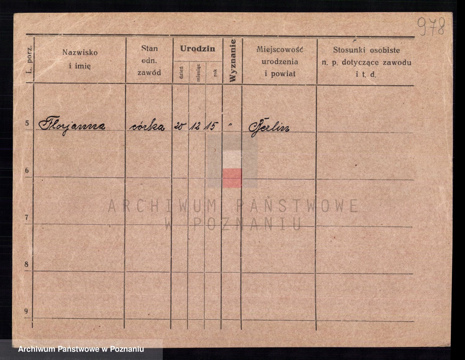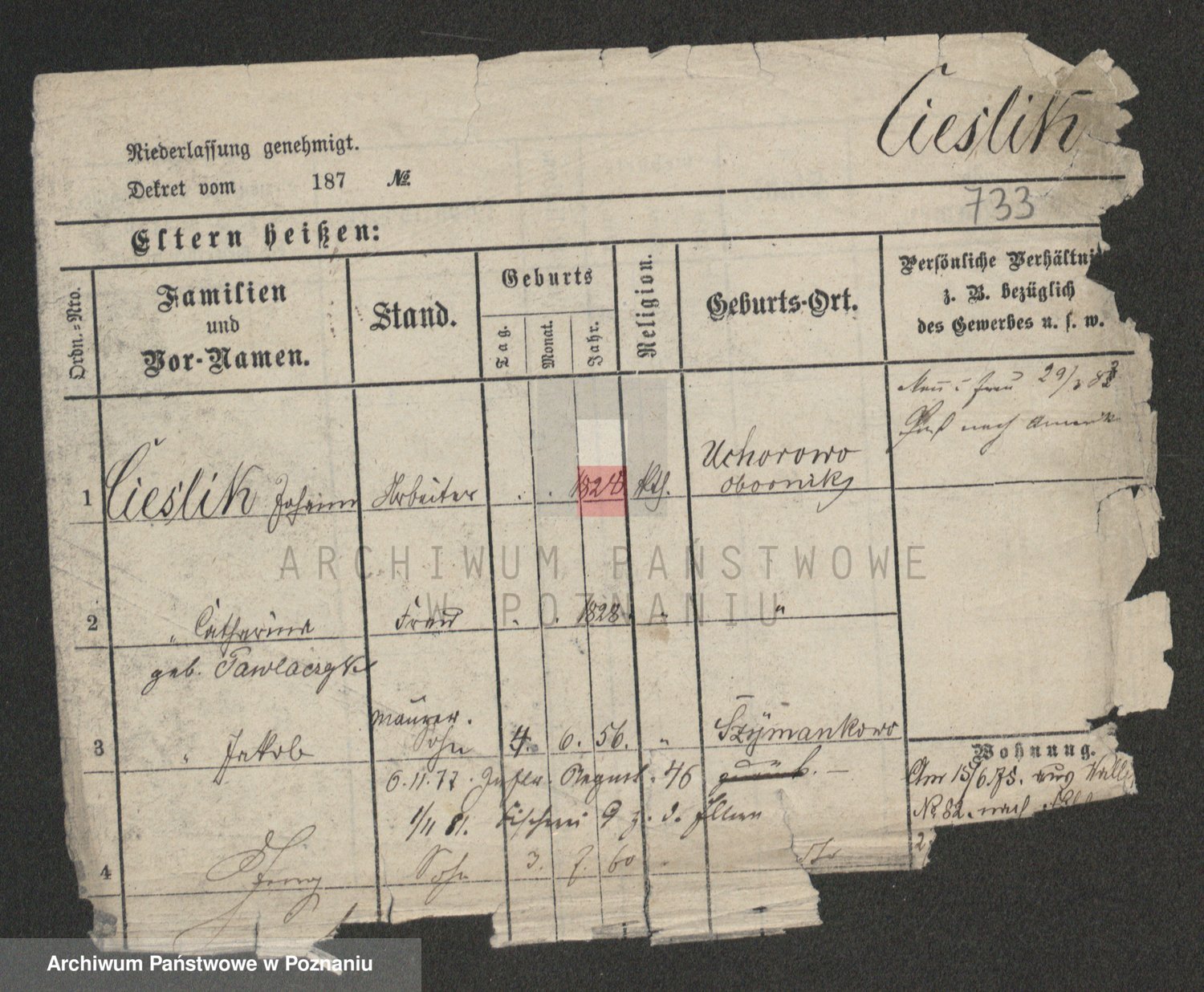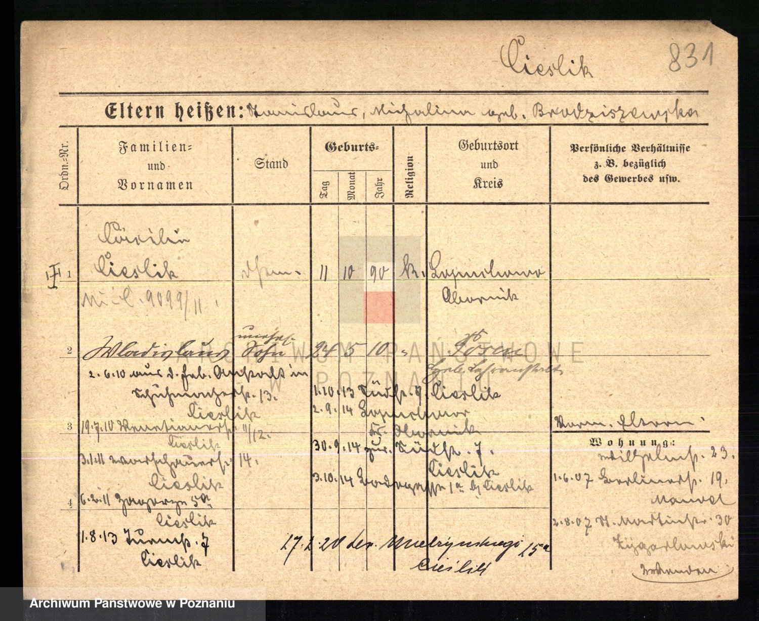 Podgląd karty osobowej dostępny jest po kliknięciu na nazwisko lub ikonkę karty. Można dokonywać powiększenia (ikony na górze) lub przechodzić między kolejnymi skanami (strzałki po bokach).