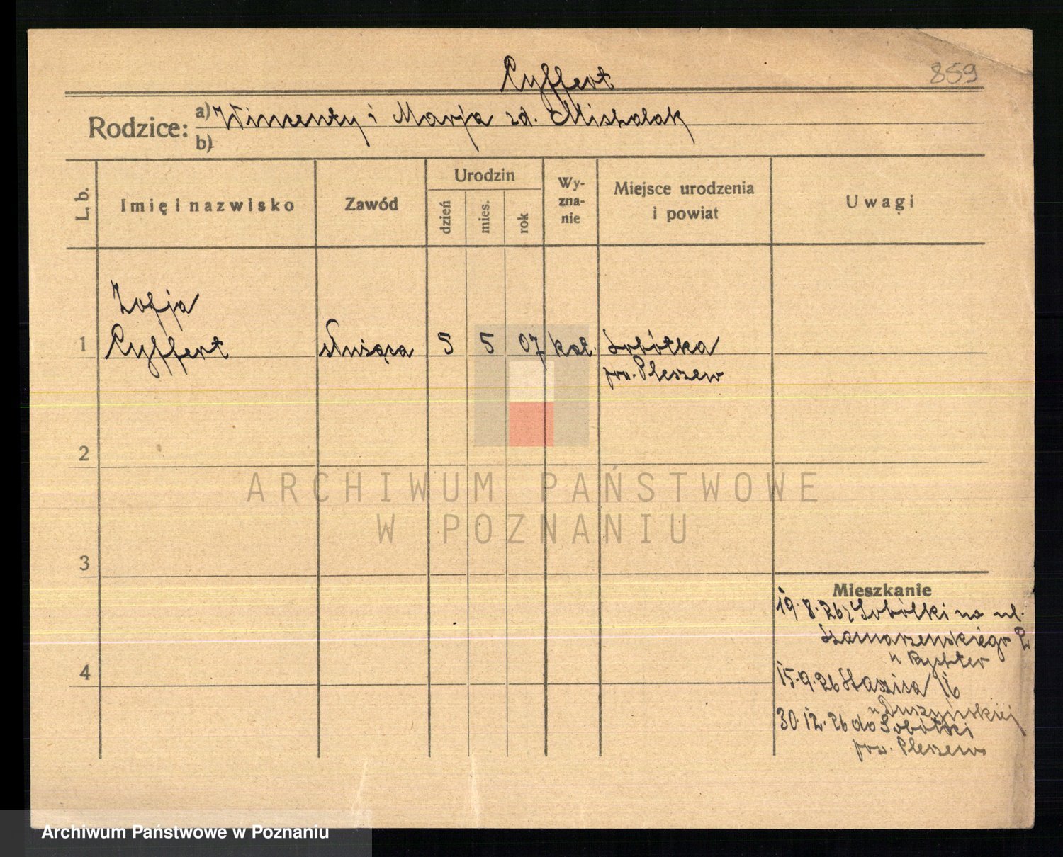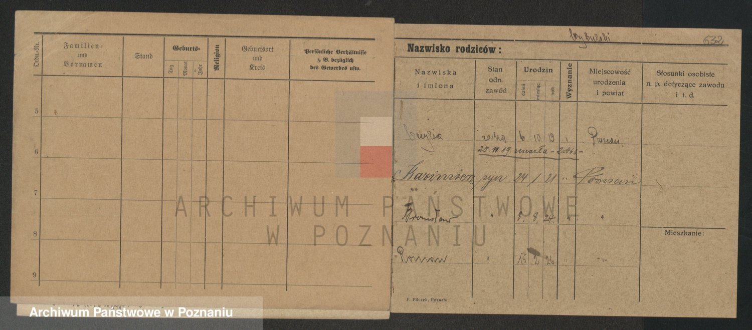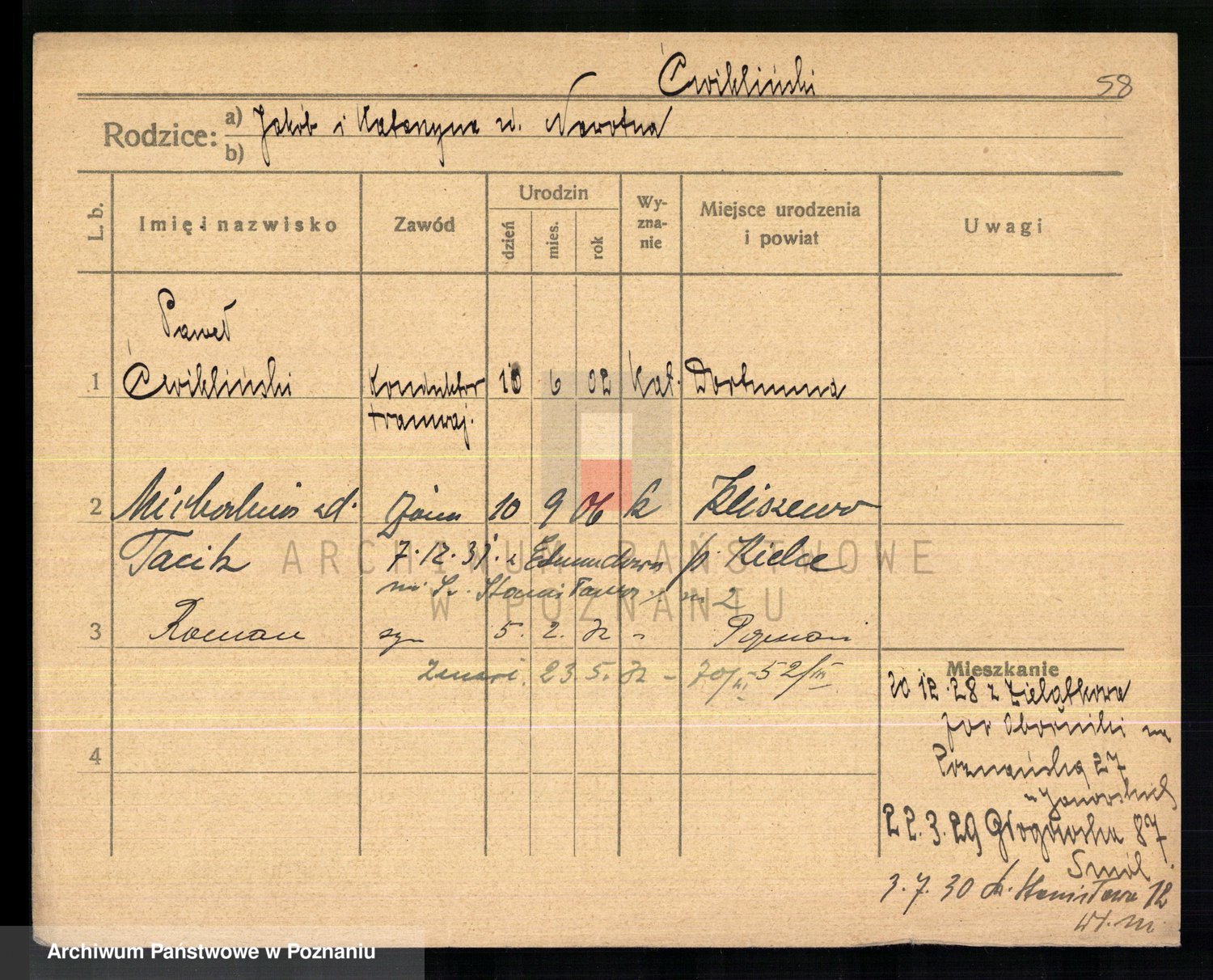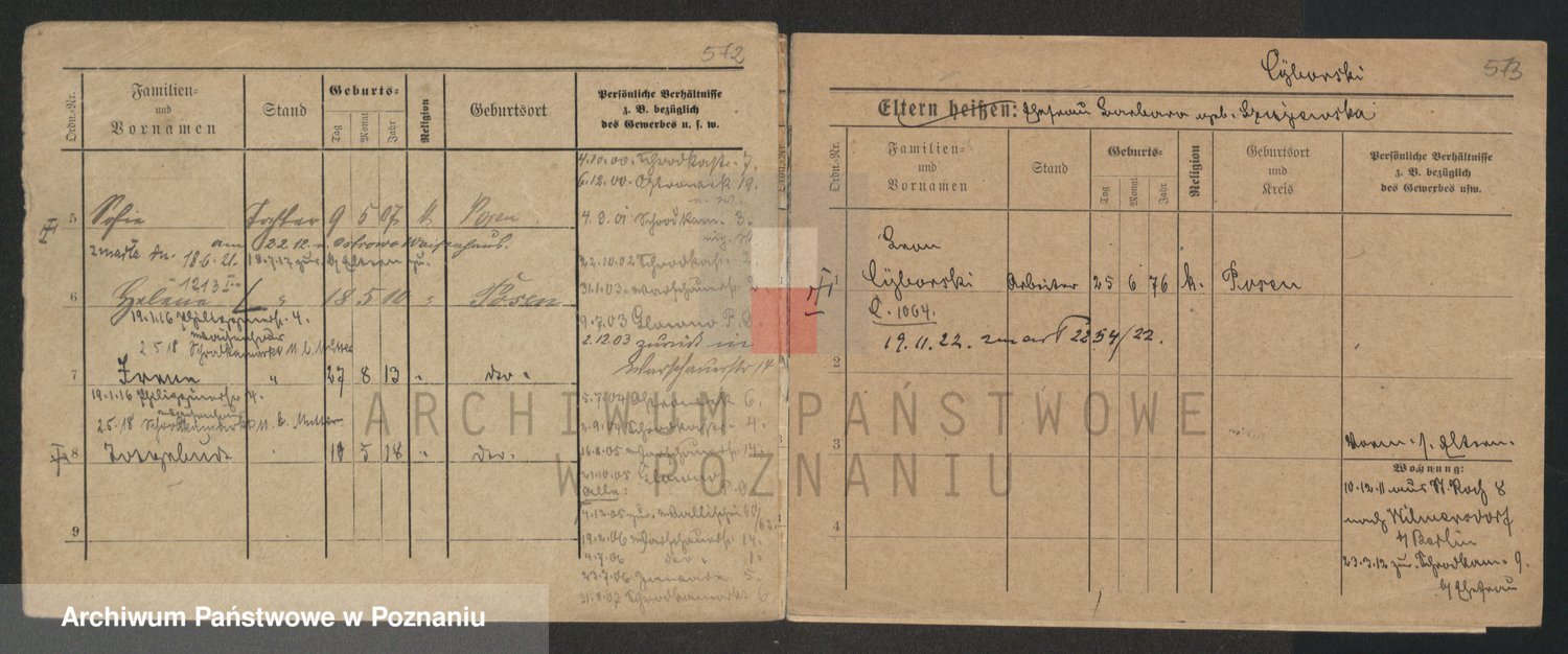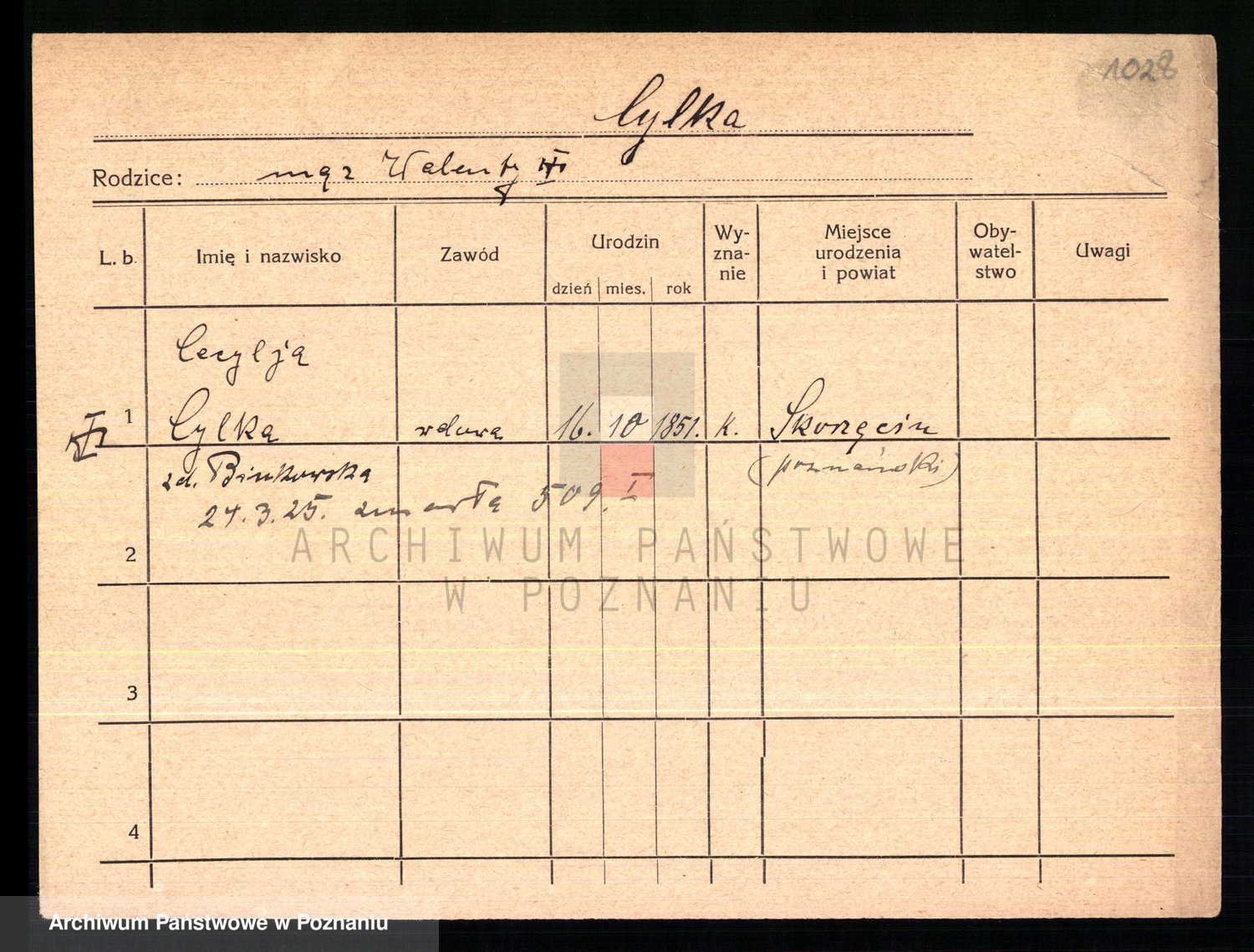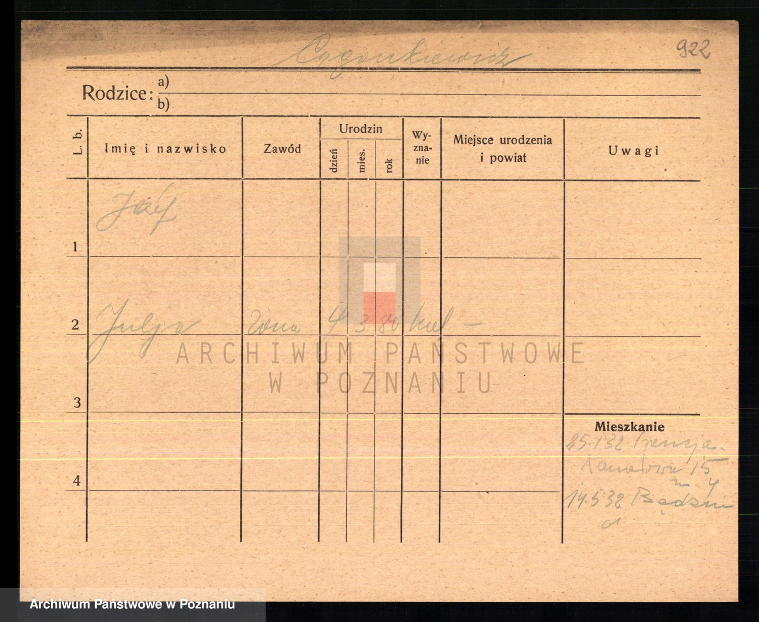 Podgląd karty osobowej dostępny jest po kliknięciu na nazwisko lub ikonkę karty. Można dokonywać powiększenia (ikony na górze) lub przechodzić między kolejnymi skanami (strzałki po bokach).