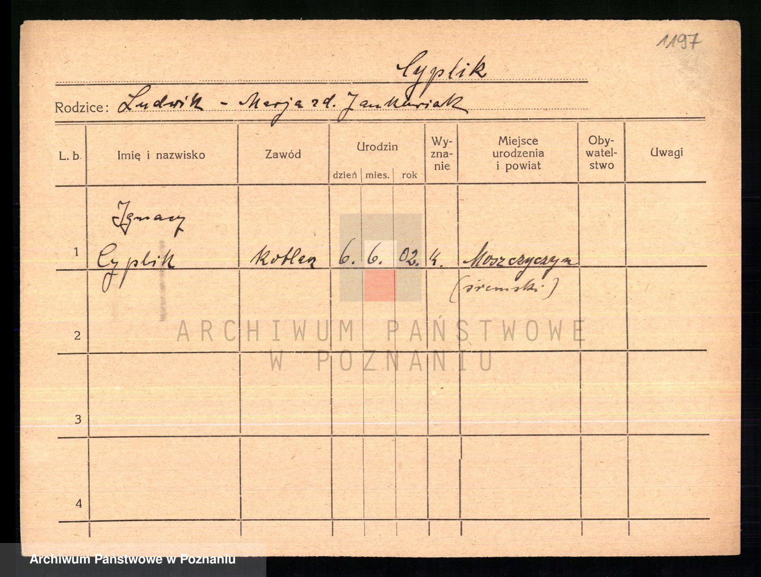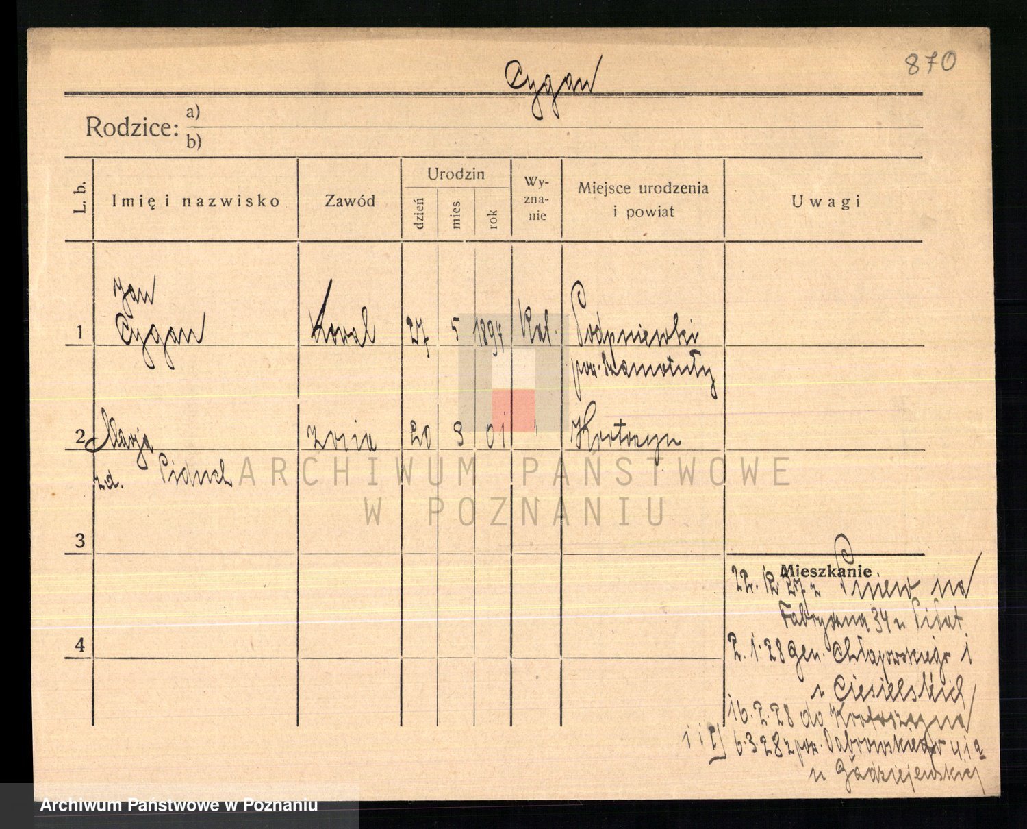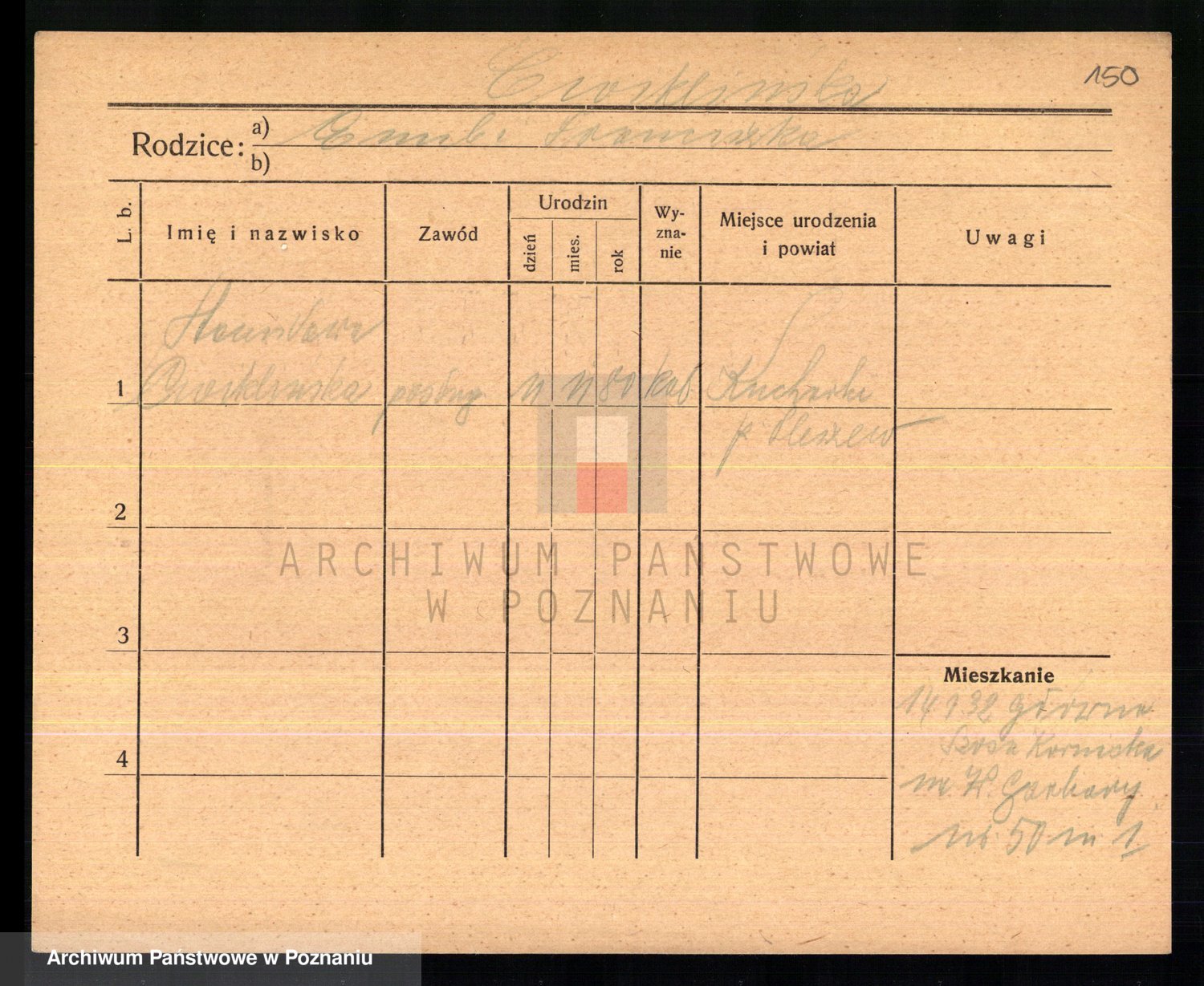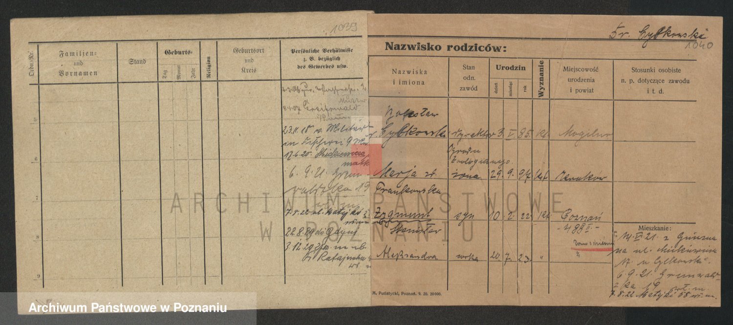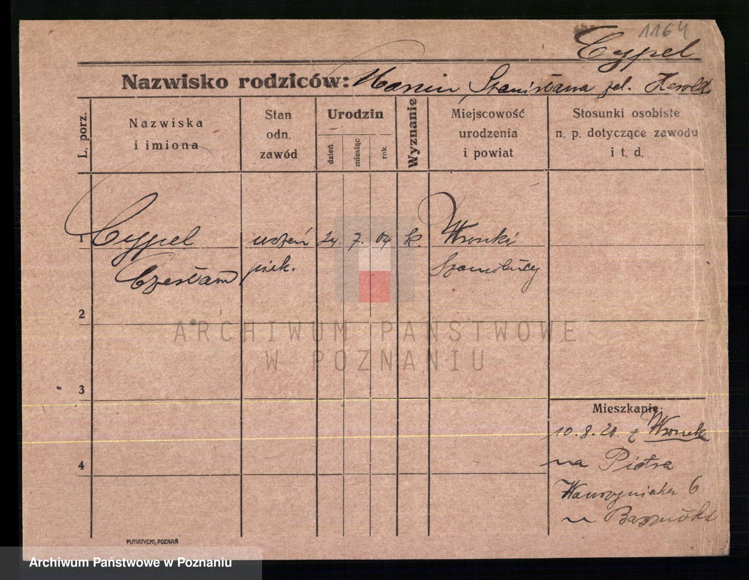 Podgląd karty osobowej dostępny jest po kliknięciu na nazwisko lub ikonkę karty. Można dokonywać powiększenia (ikony na górze) lub przechodzić między kolejnymi skanami (strzałki po bokach).