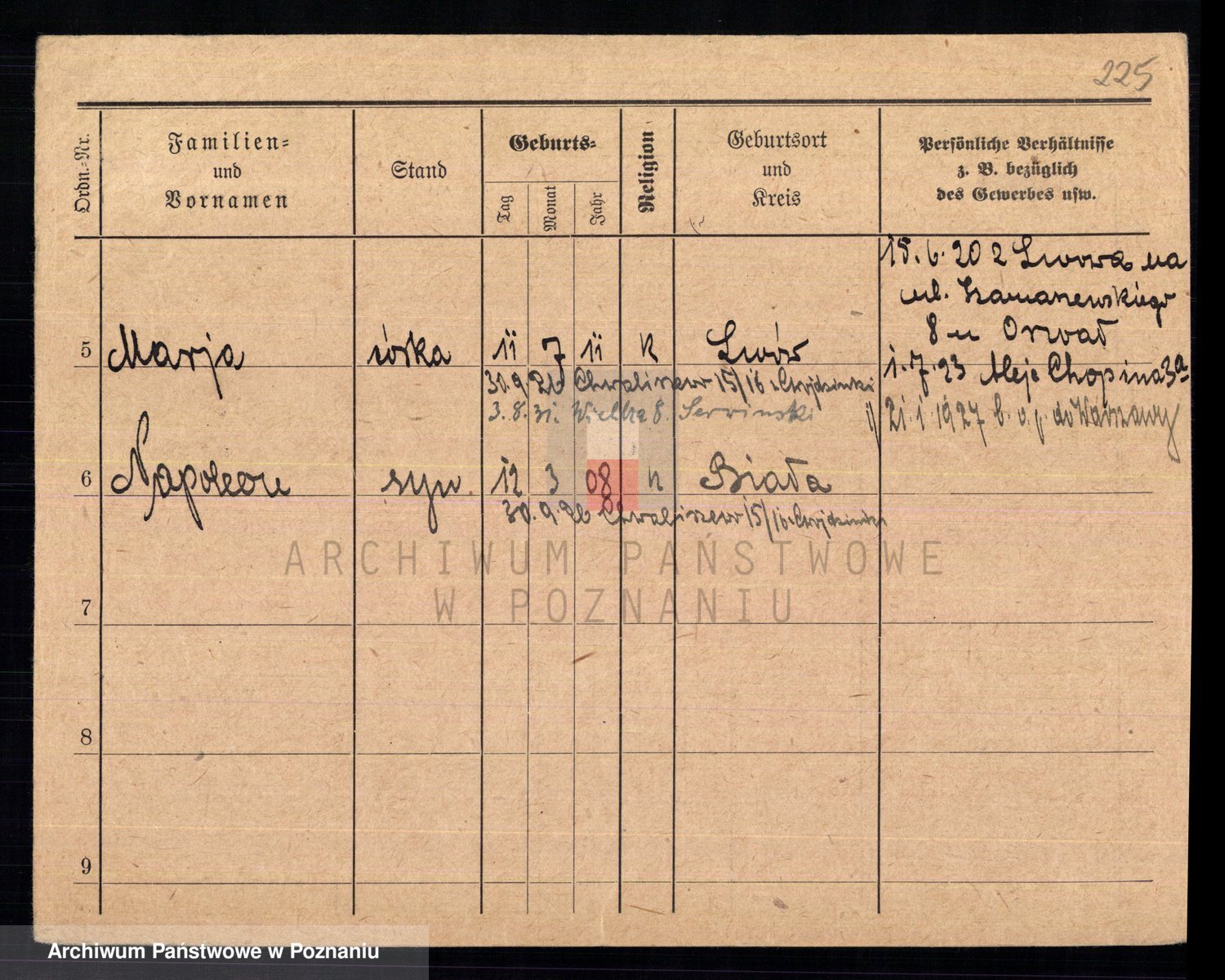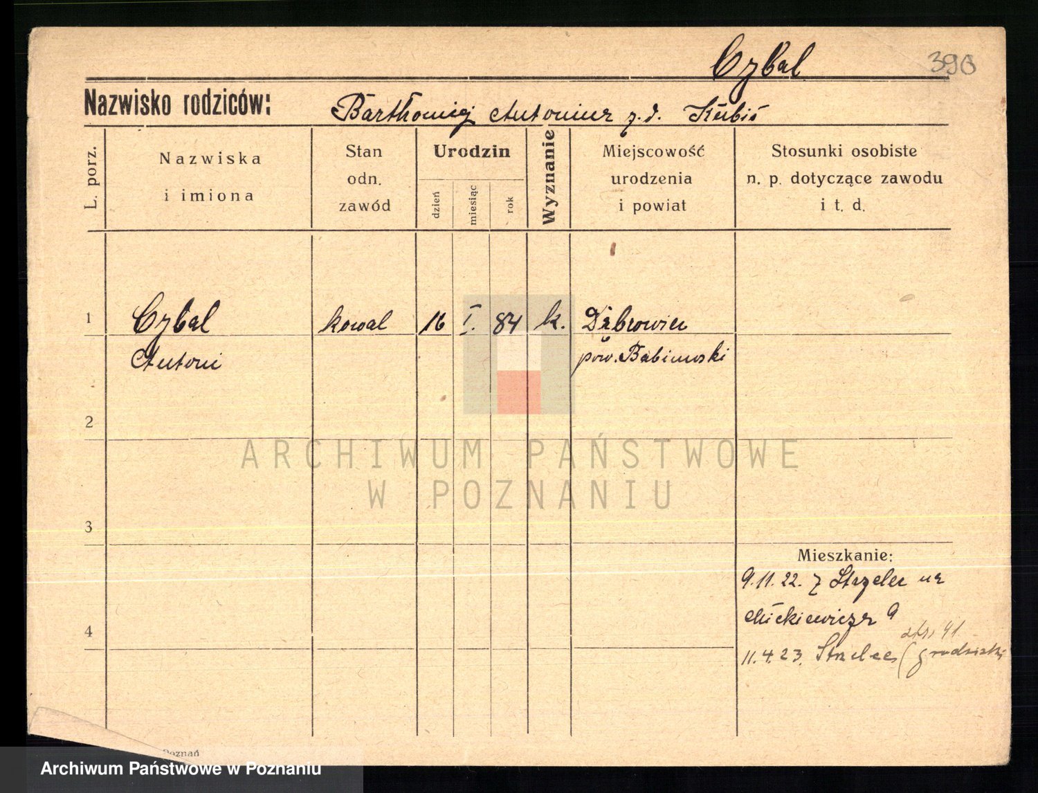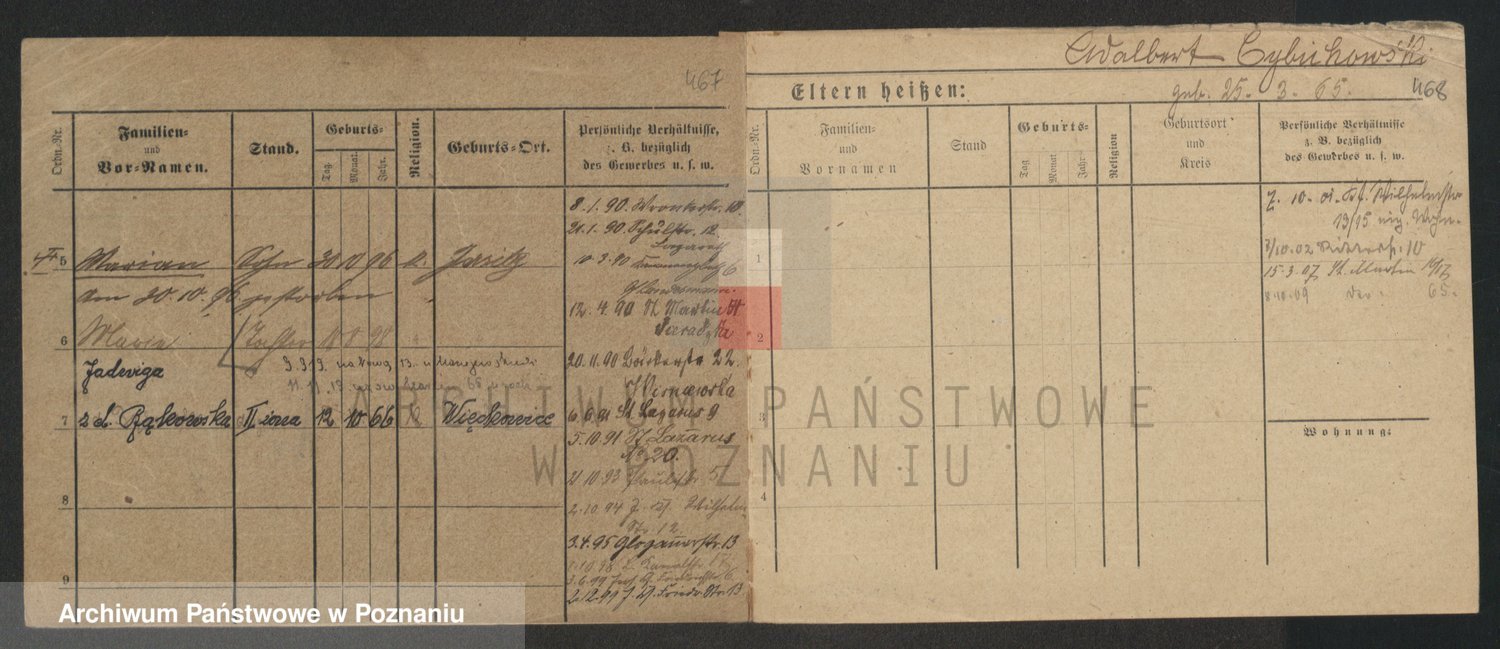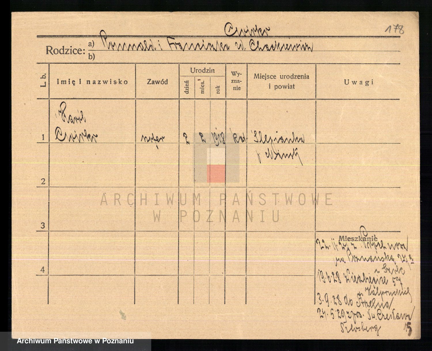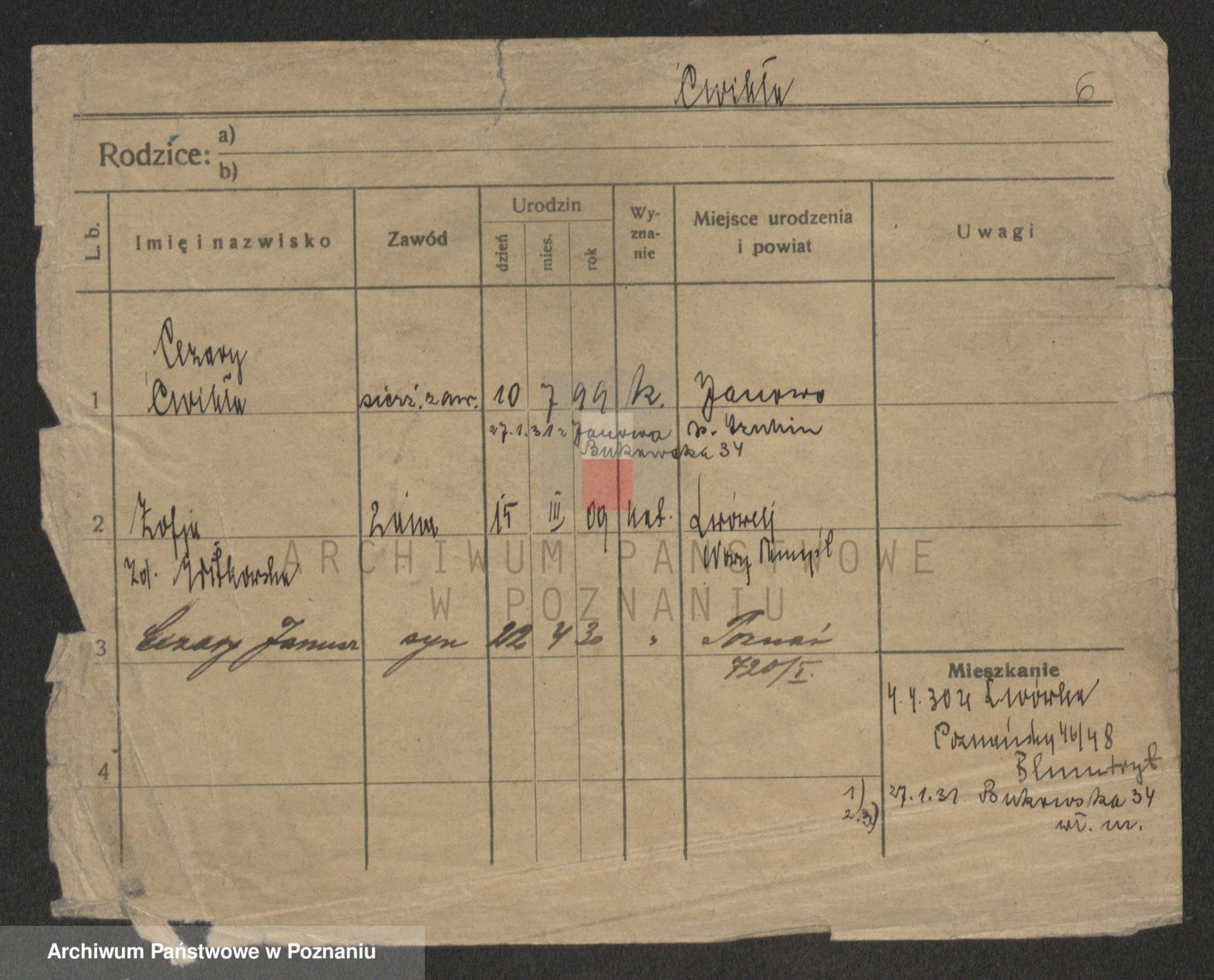 Podgląd karty osobowej dostępny jest po kliknięciu na nazwisko lub ikonkę karty. Można dokonywać powiększenia (ikony na górze) lub przechodzić między kolejnymi skanami (strzałki po bokach).