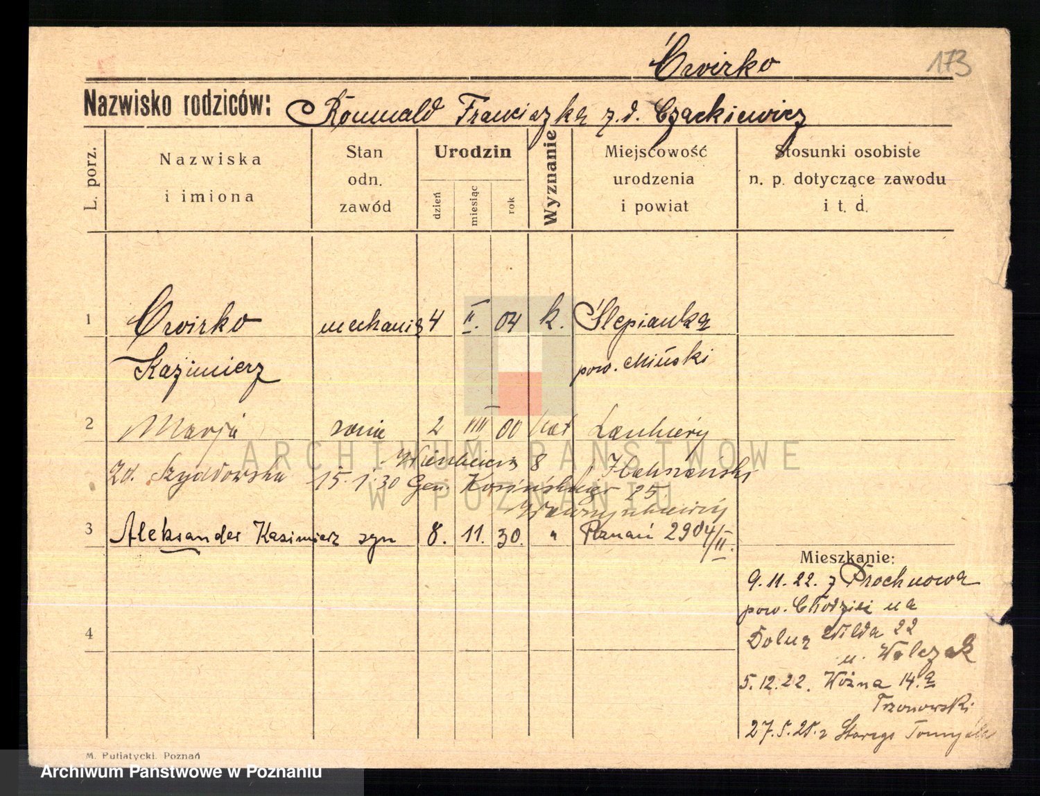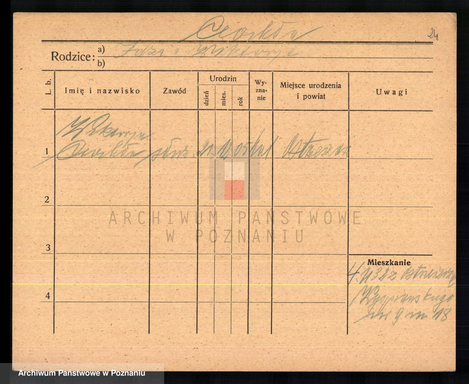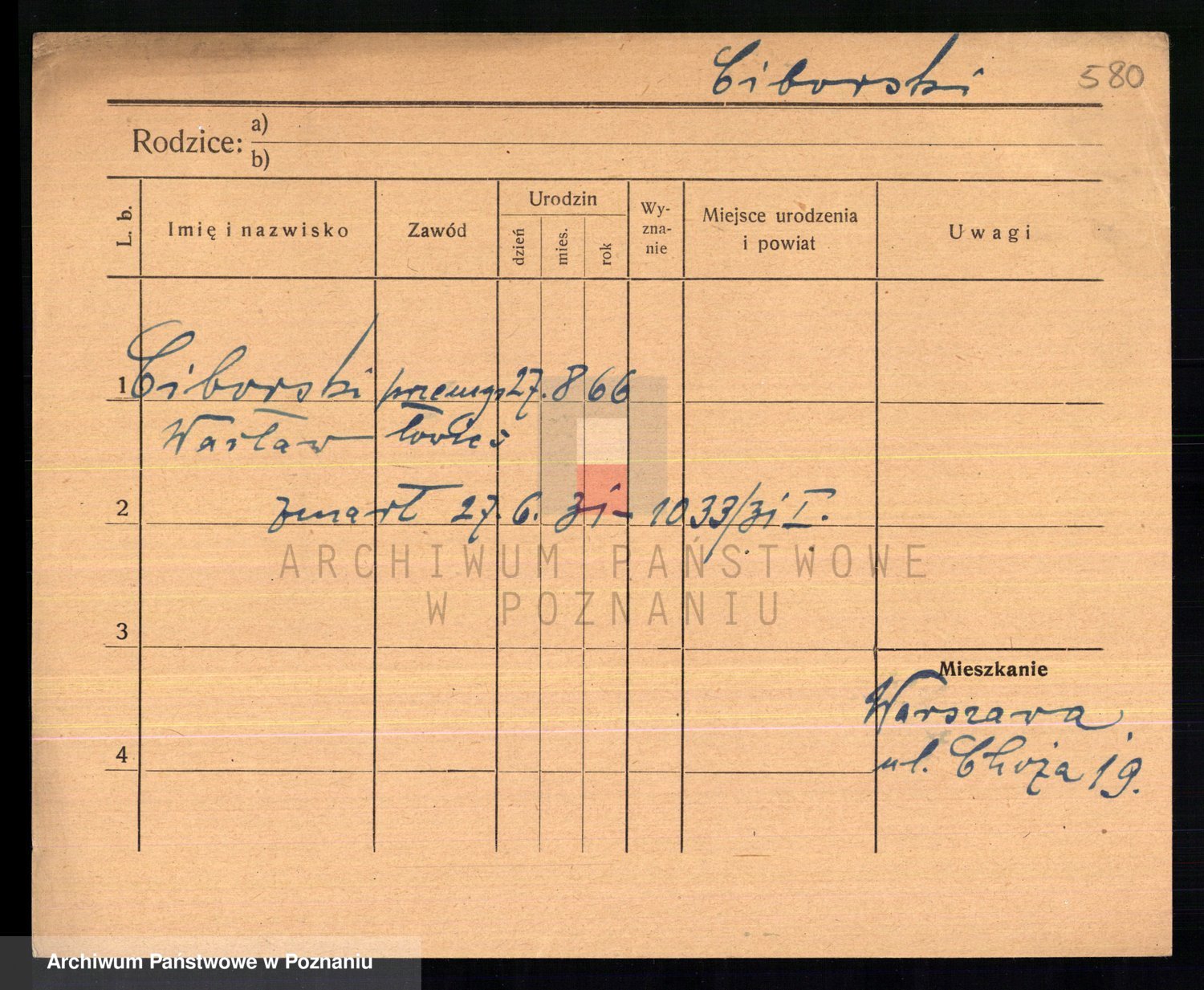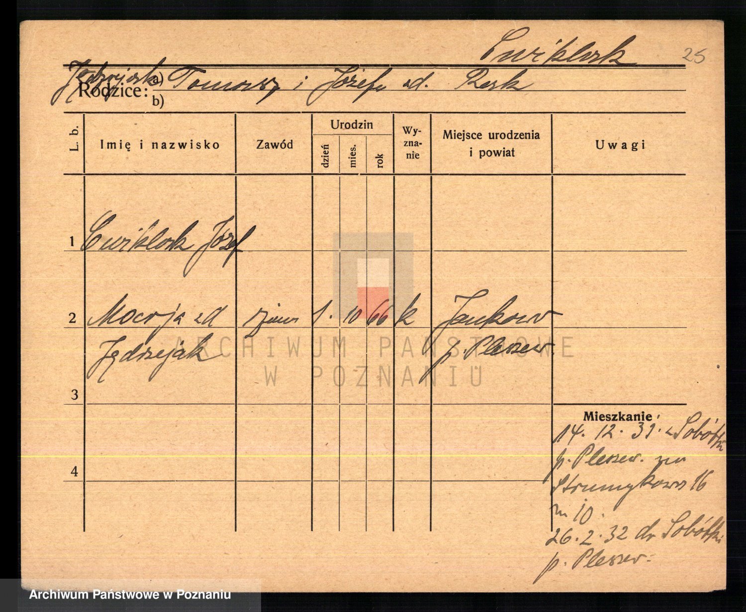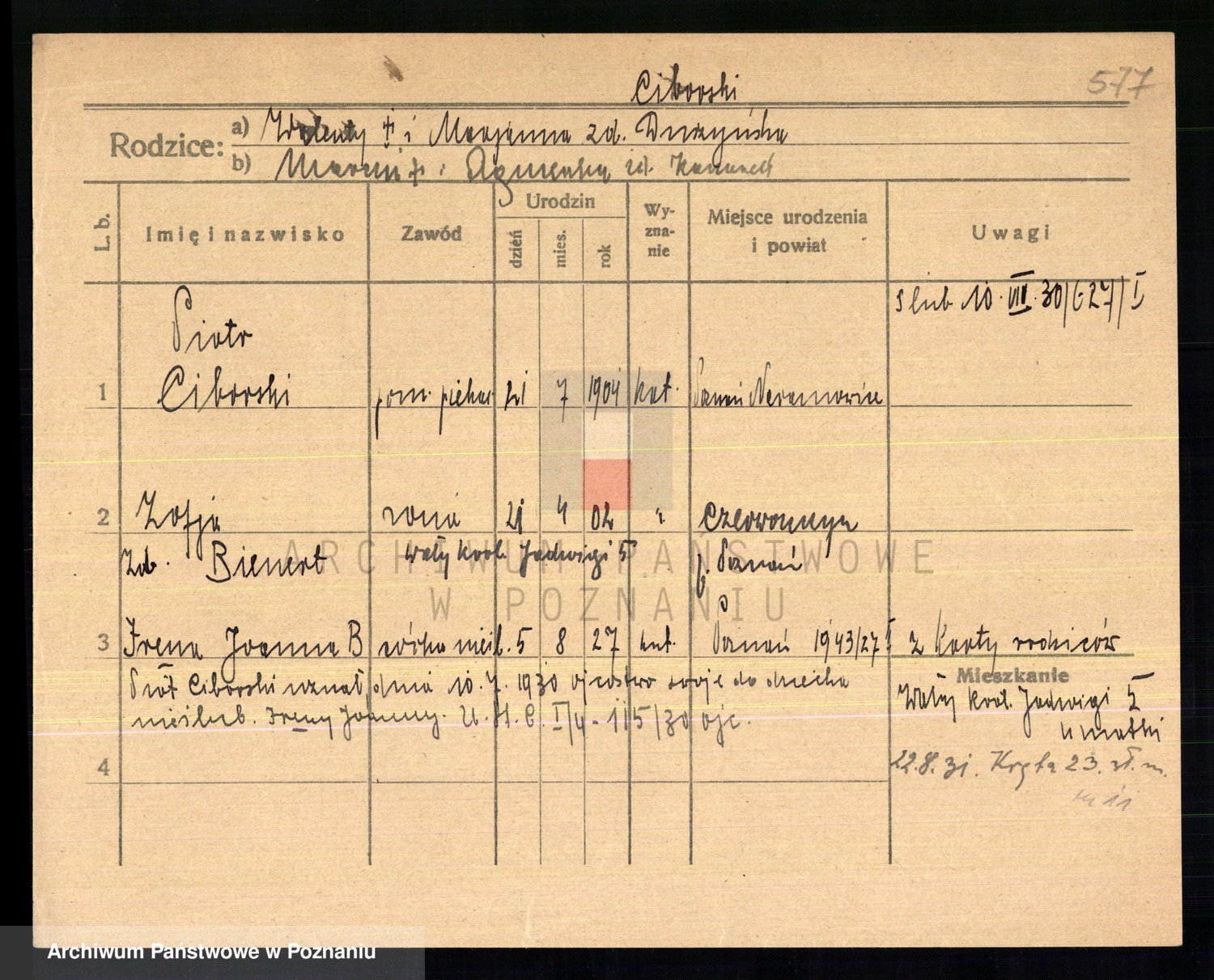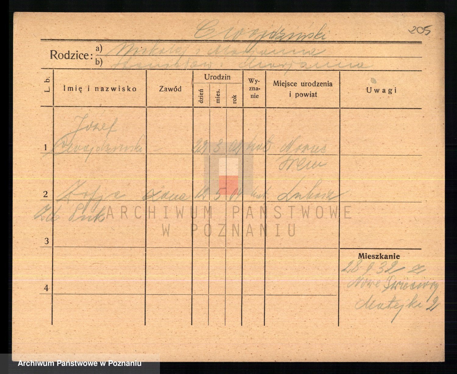Podgląd karty osobowej dostępny jest po kliknięciu na nazwisko lub ikonkę karty. Można dokonywać powiększenia (ikony na górze) lub przechodzić między kolejnymi skanami (strzałki po bokach).