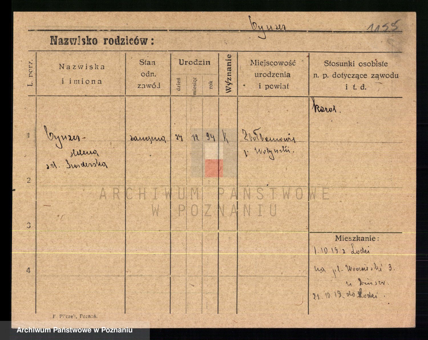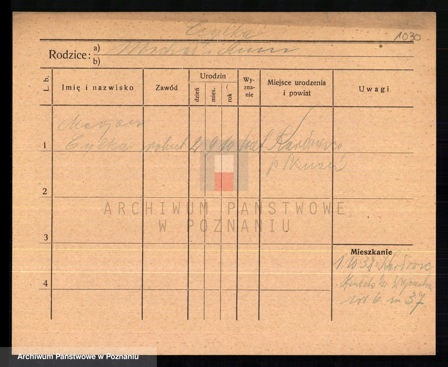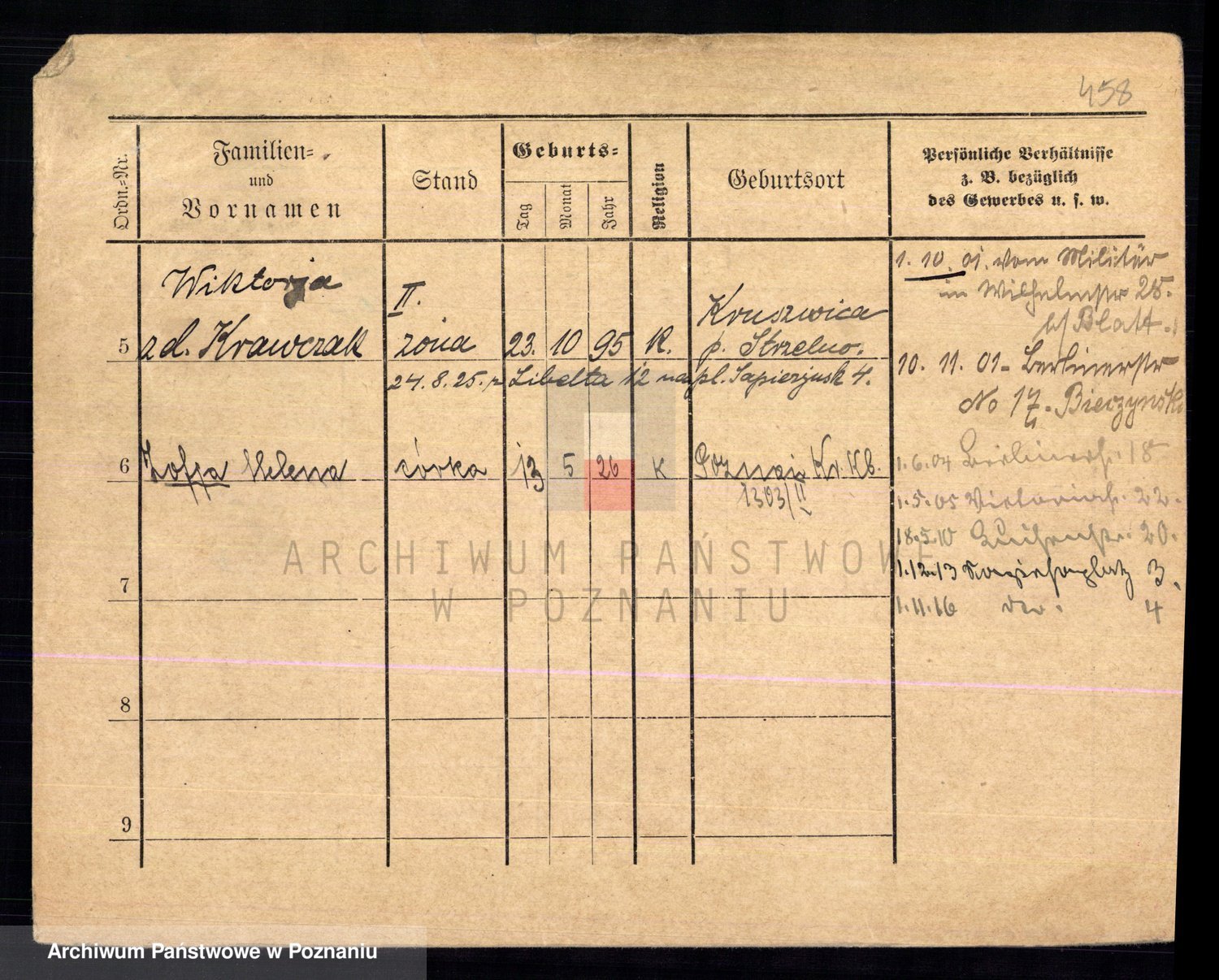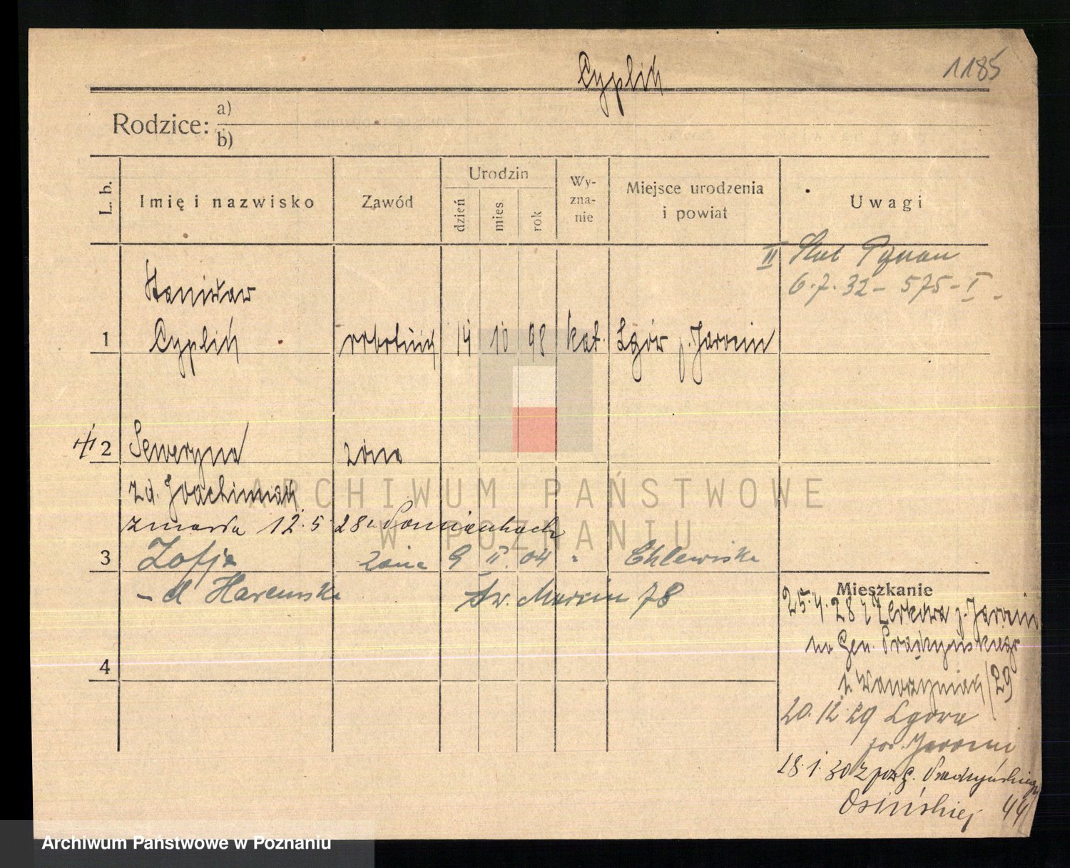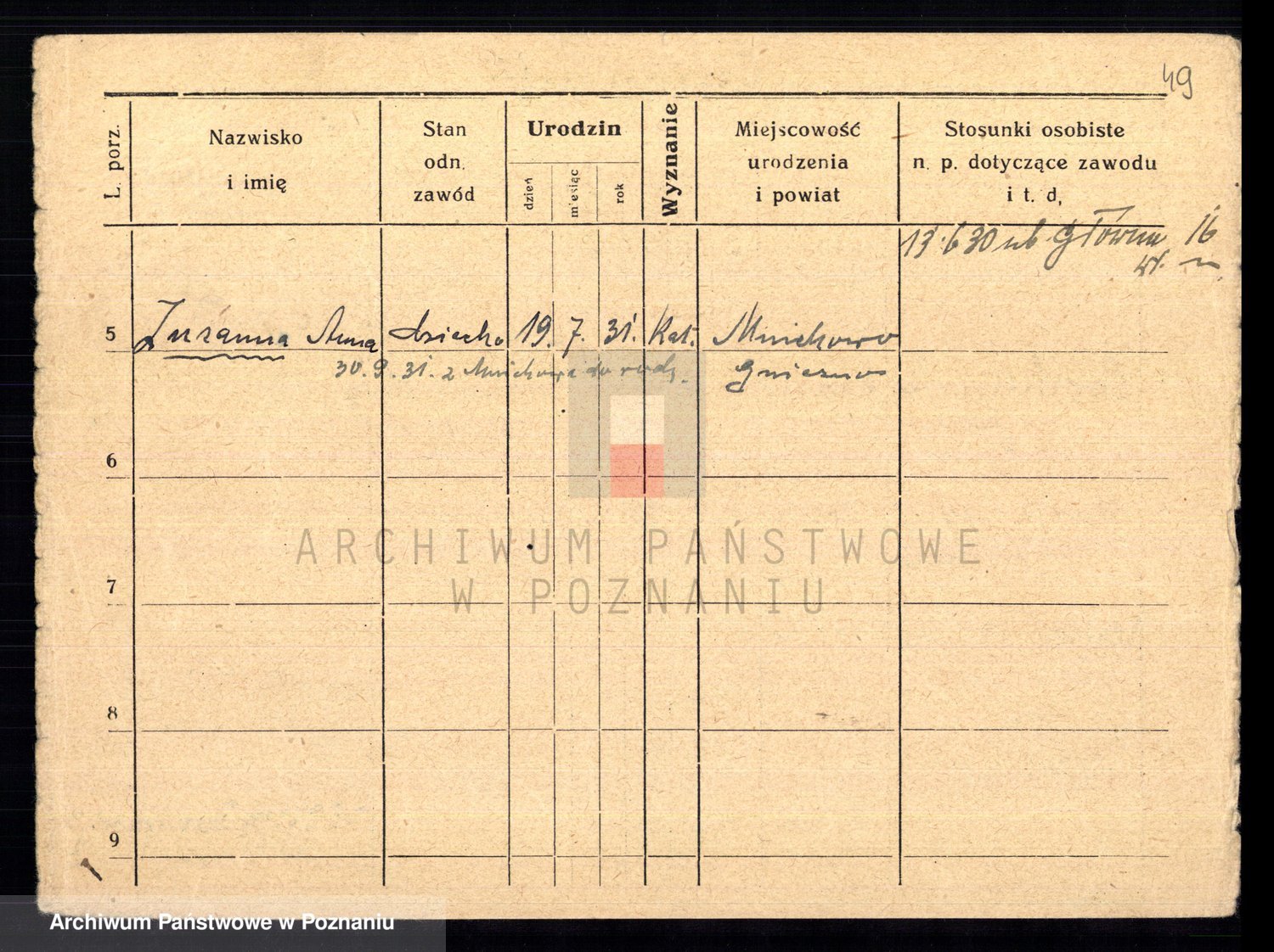 Podgląd karty osobowej dostępny jest po kliknięciu na nazwisko lub ikonkę karty. Można dokonywać powiększenia (ikony na górze) lub przechodzić między kolejnymi skanami (strzałki po bokach).