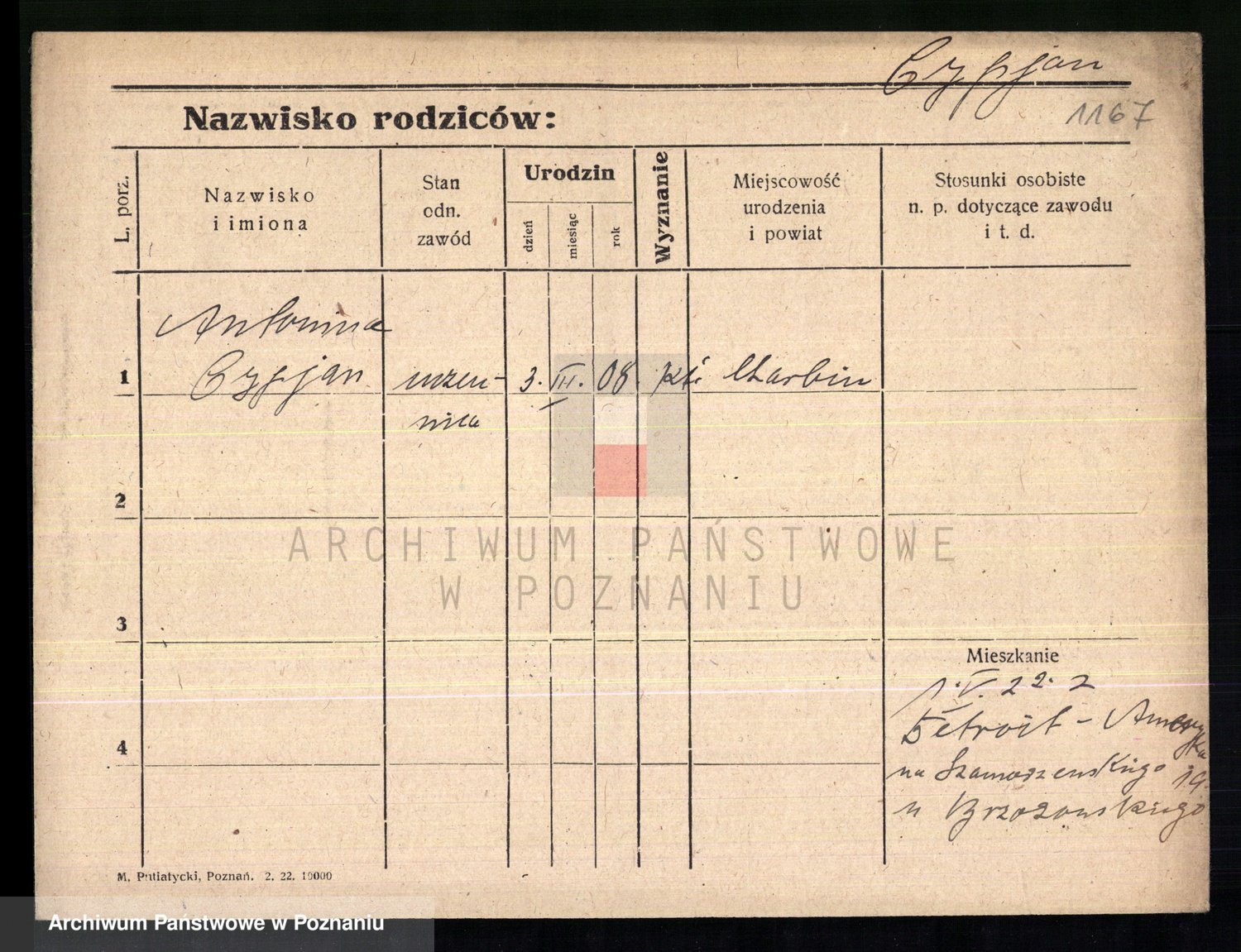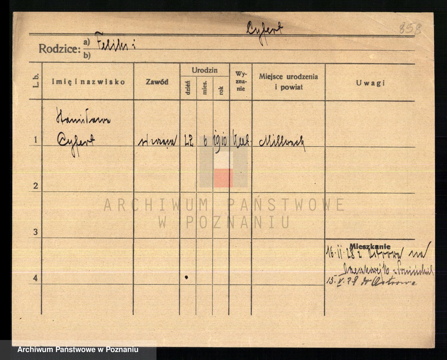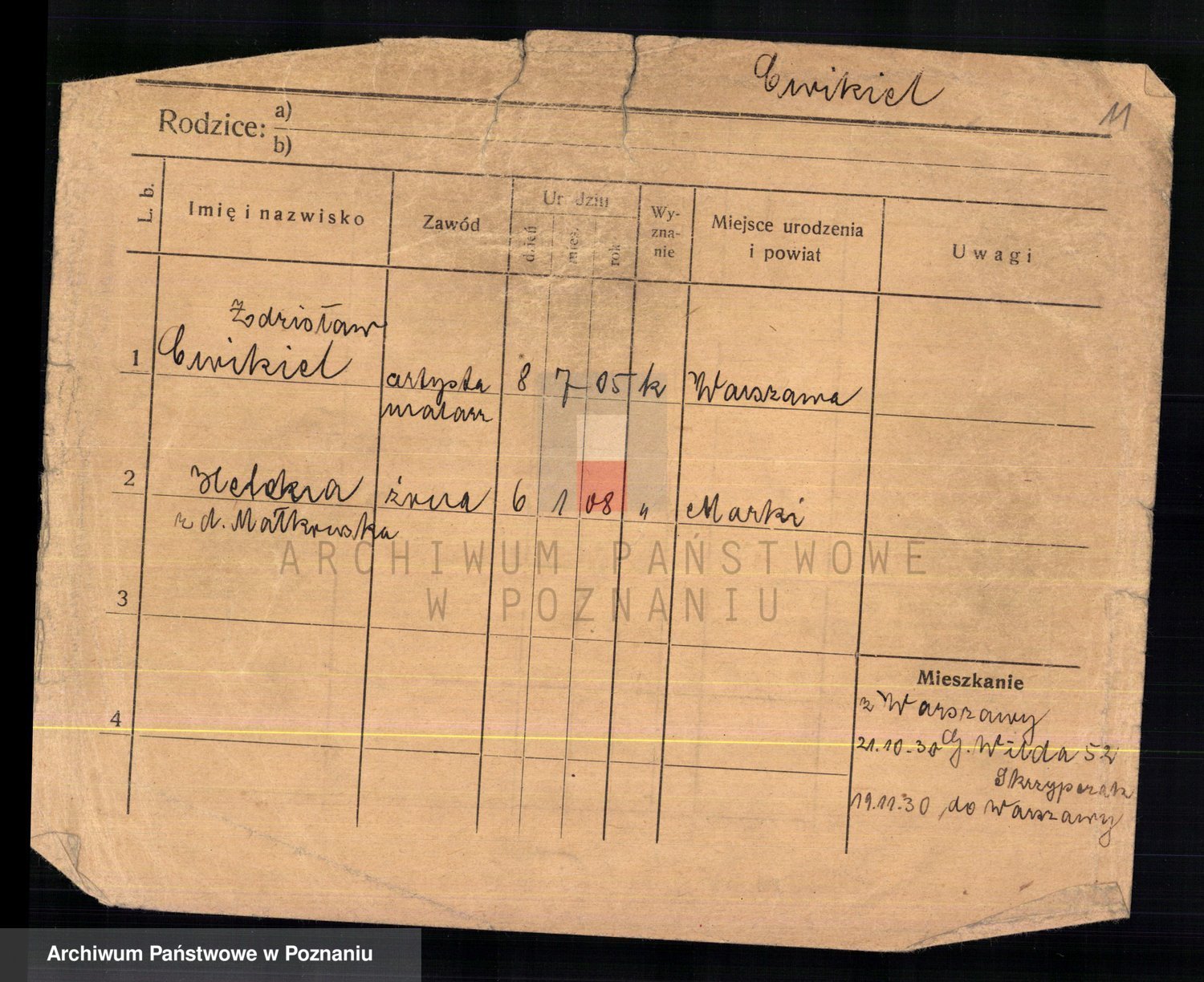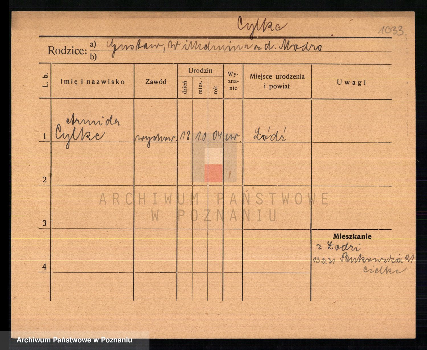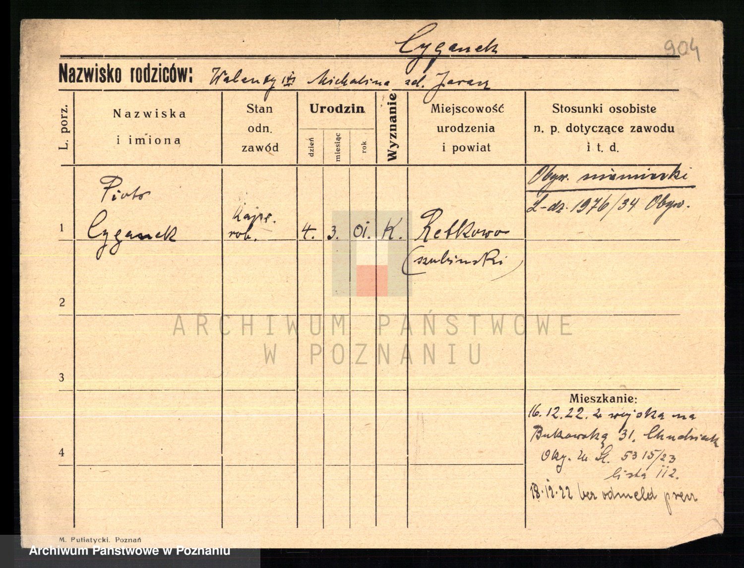 Podgląd karty osobowej dostępny jest po kliknięciu na nazwisko lub ikonkę karty. Można dokonywać powiększenia (ikony na górze) lub przechodzić między kolejnymi skanami (strzałki po bokach).
