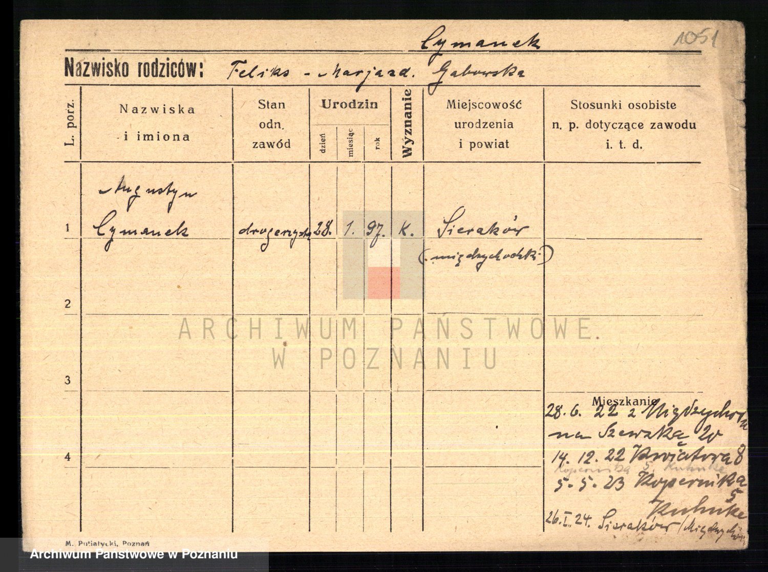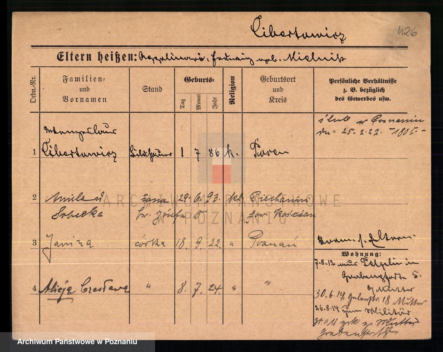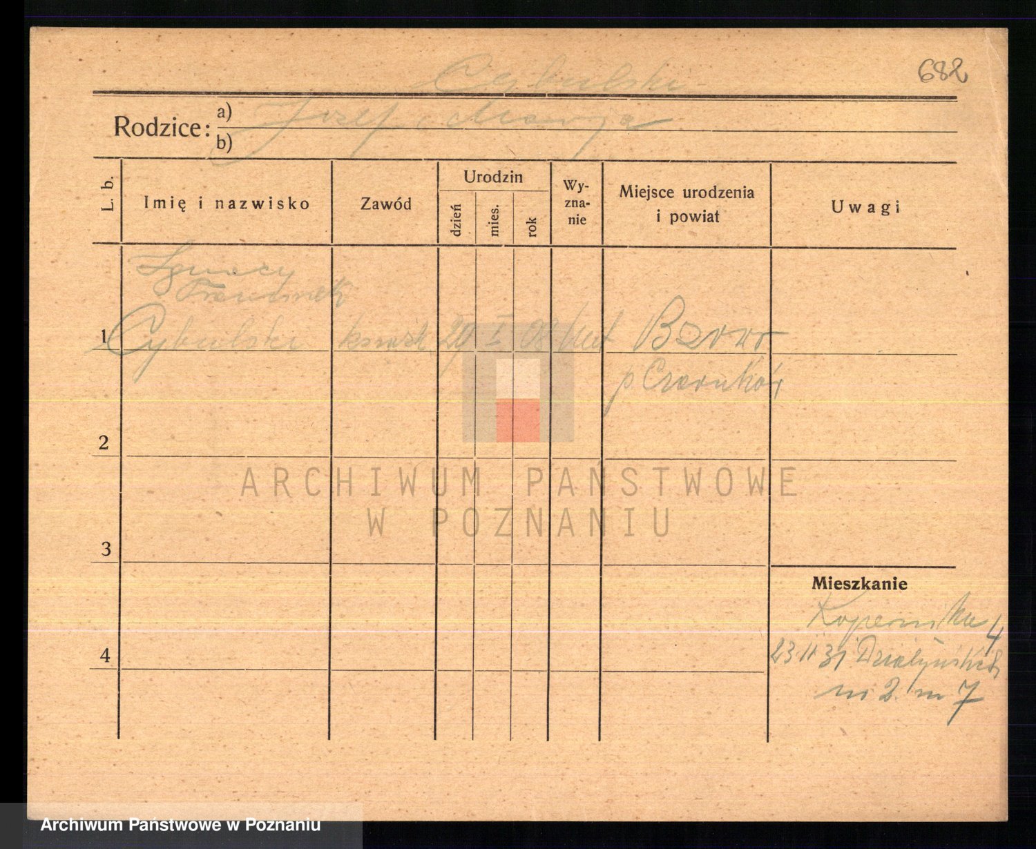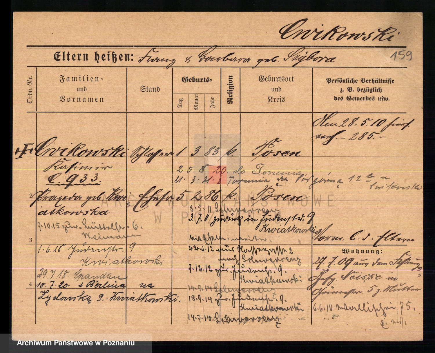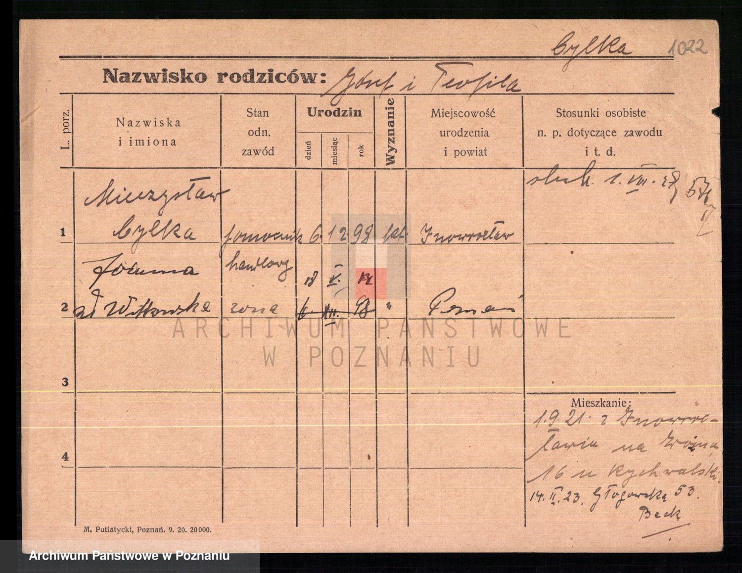 Podgląd karty osobowej dostępny jest po kliknięciu na nazwisko lub ikonkę karty. Można dokonywać powiększenia (ikony na górze) lub przechodzić między kolejnymi skanami (strzałki po bokach).