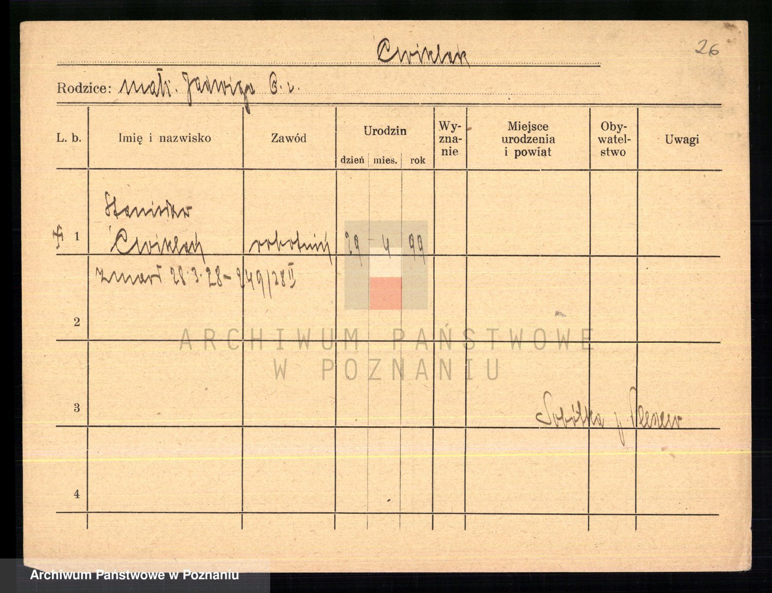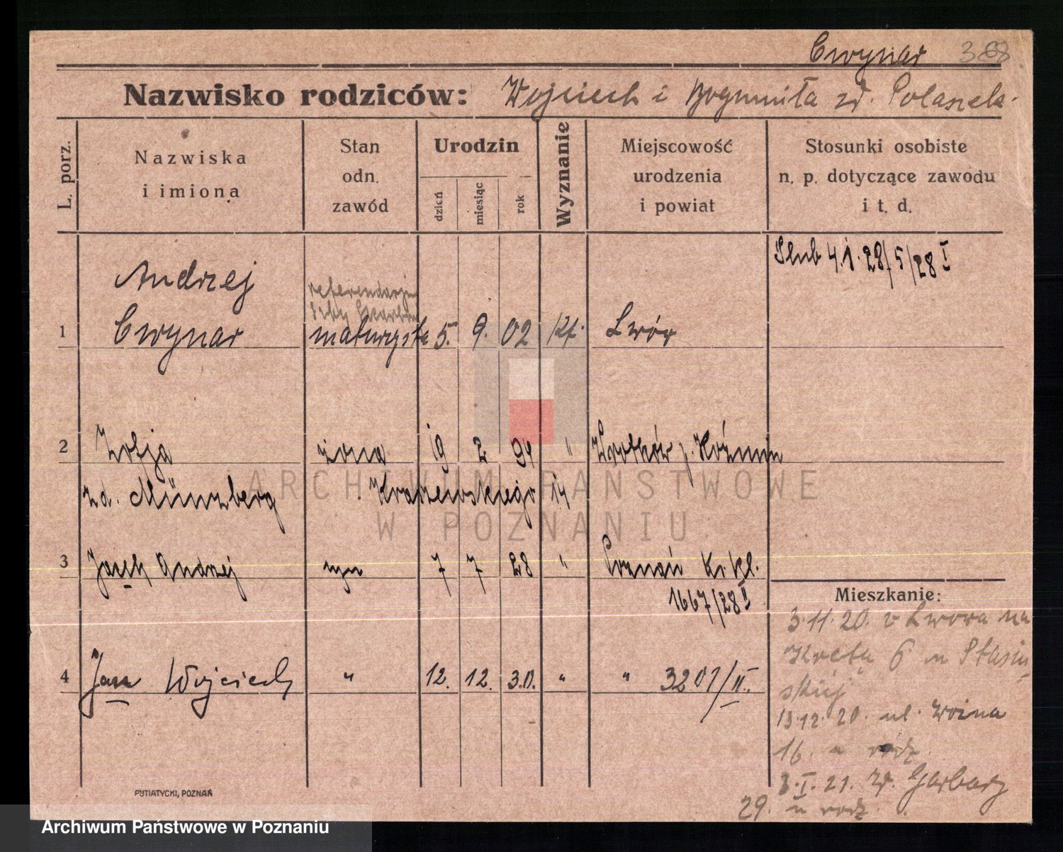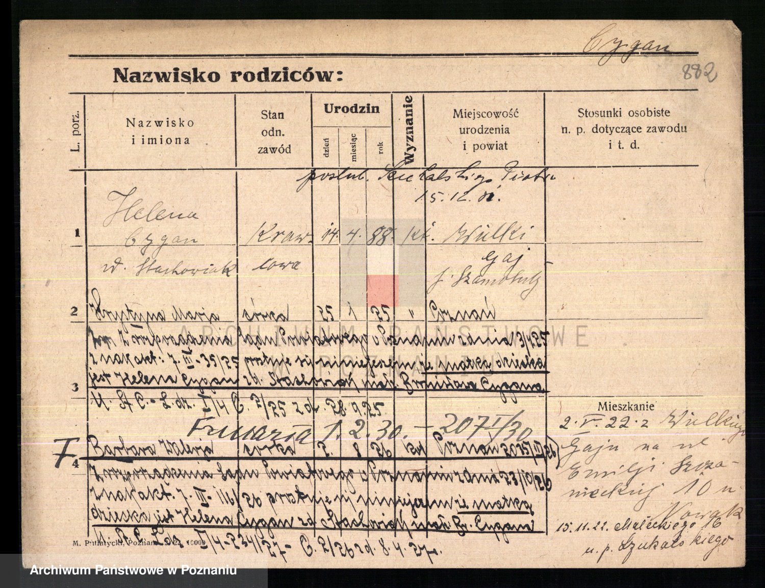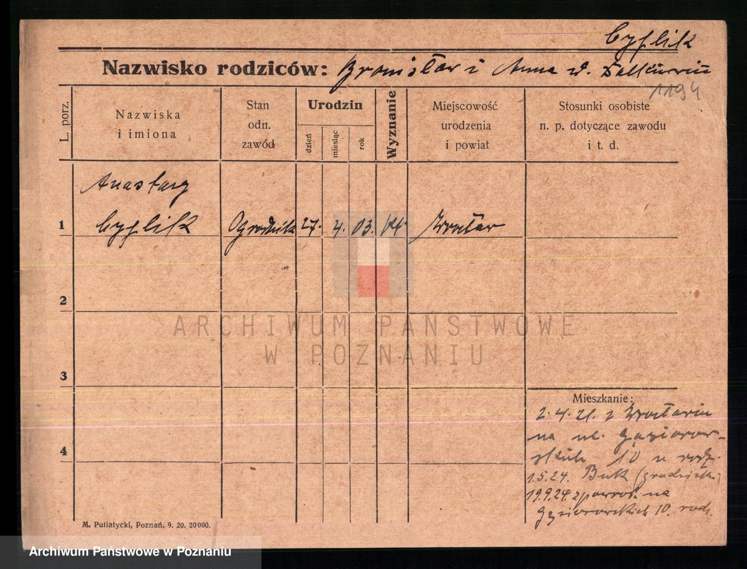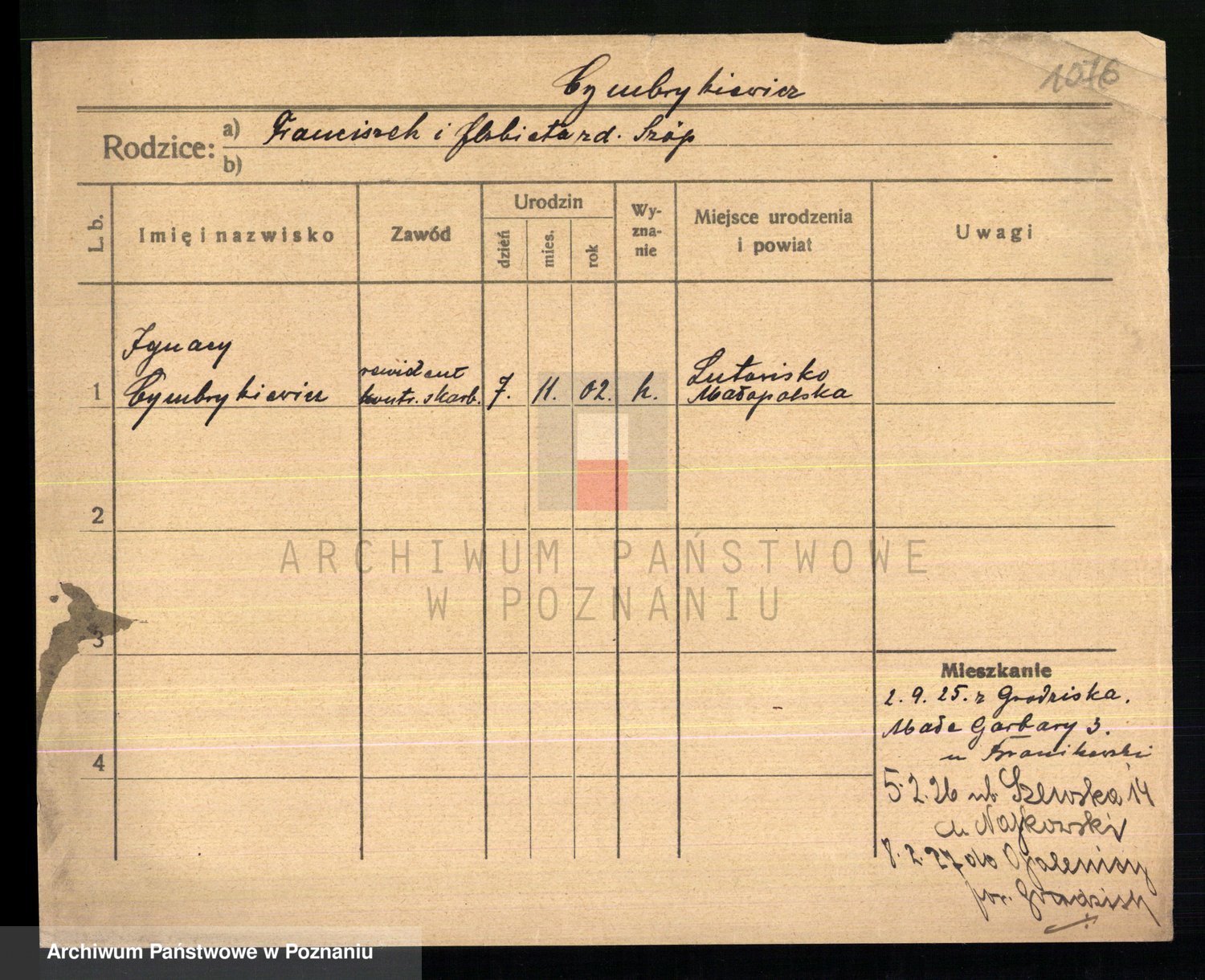 Podgląd karty osobowej dostępny jest po kliknięciu na nazwisko lub ikonkę karty. Można dokonywać powiększenia (ikony na górze) lub przechodzić między kolejnymi skanami (strzałki po bokach).