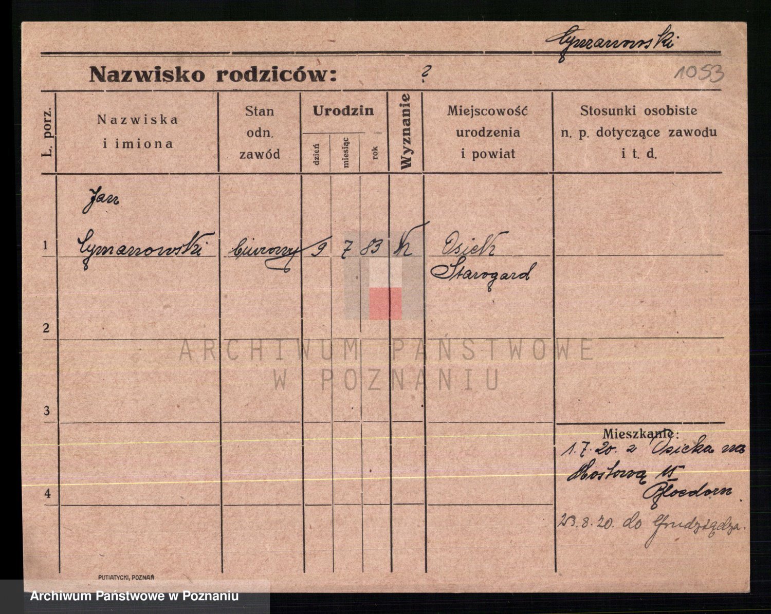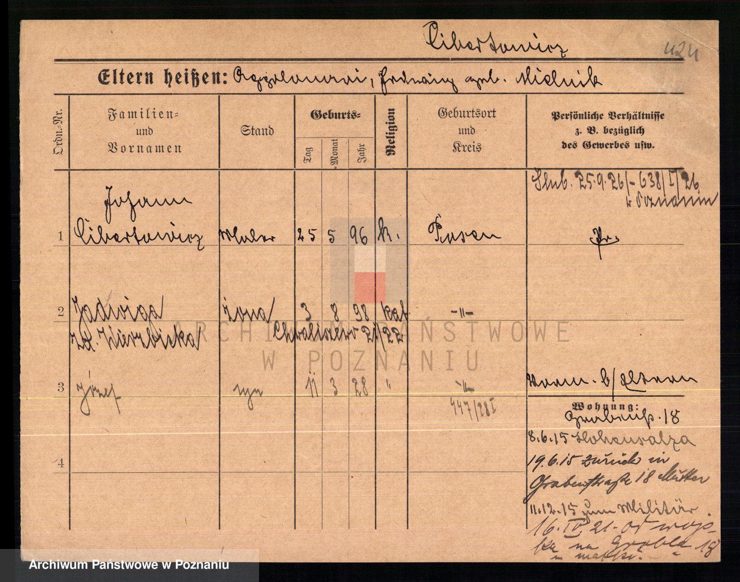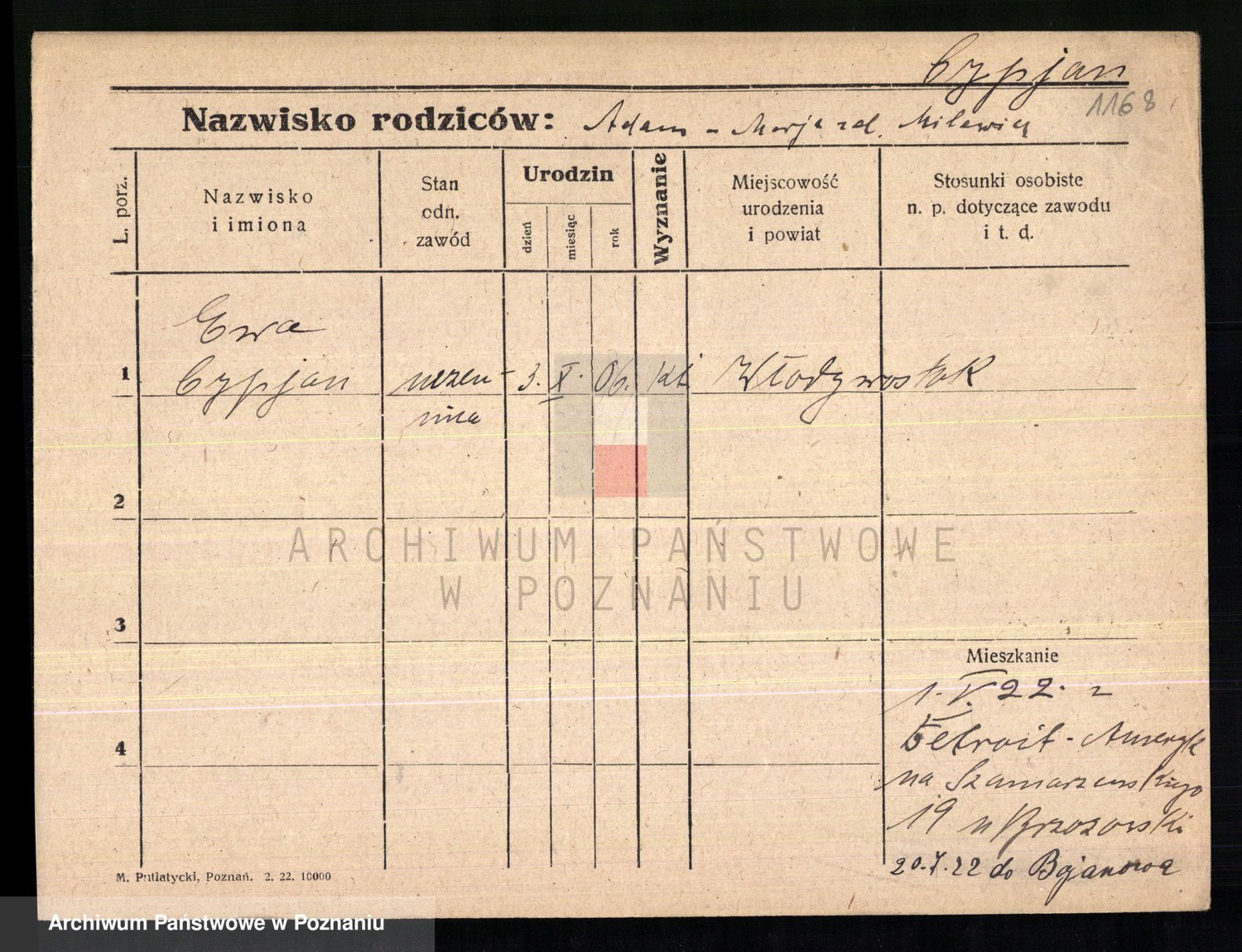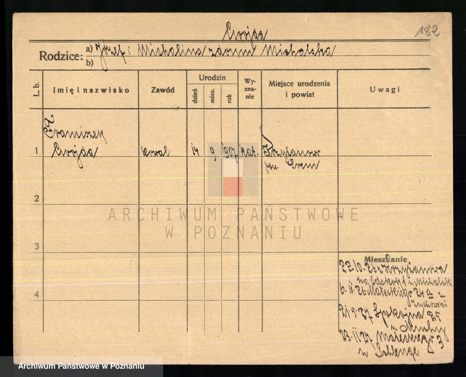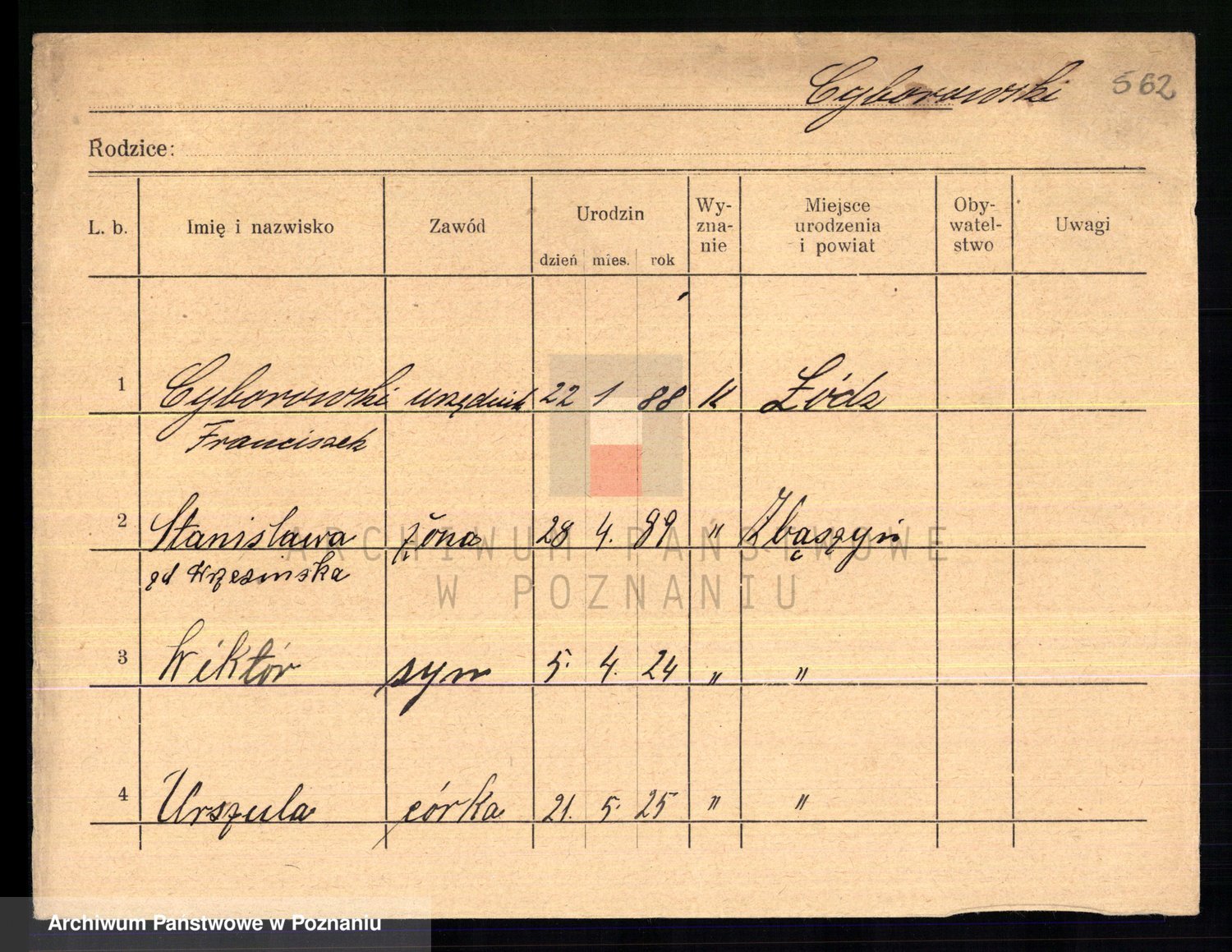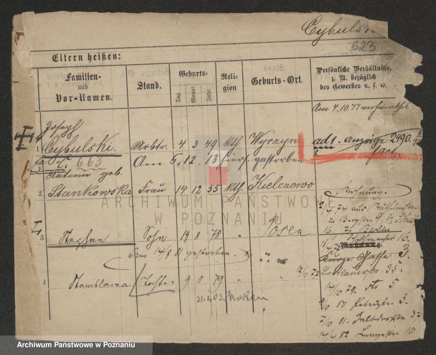 Podgląd karty osobowej dostępny jest po kliknięciu na nazwisko lub ikonkę karty. Można dokonywać powiększenia (ikony na górze) lub przechodzić między kolejnymi skanami (strzałki po bokach).
