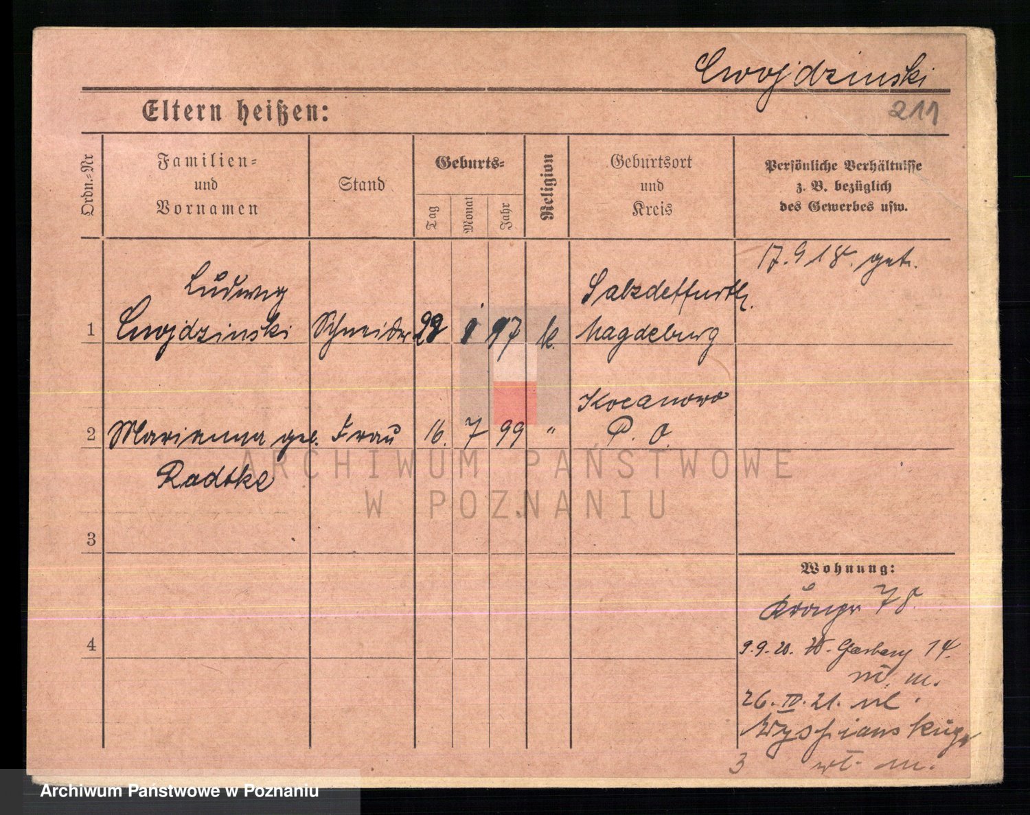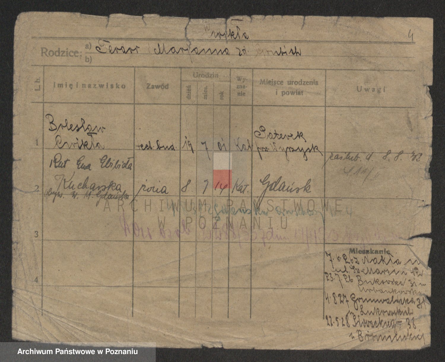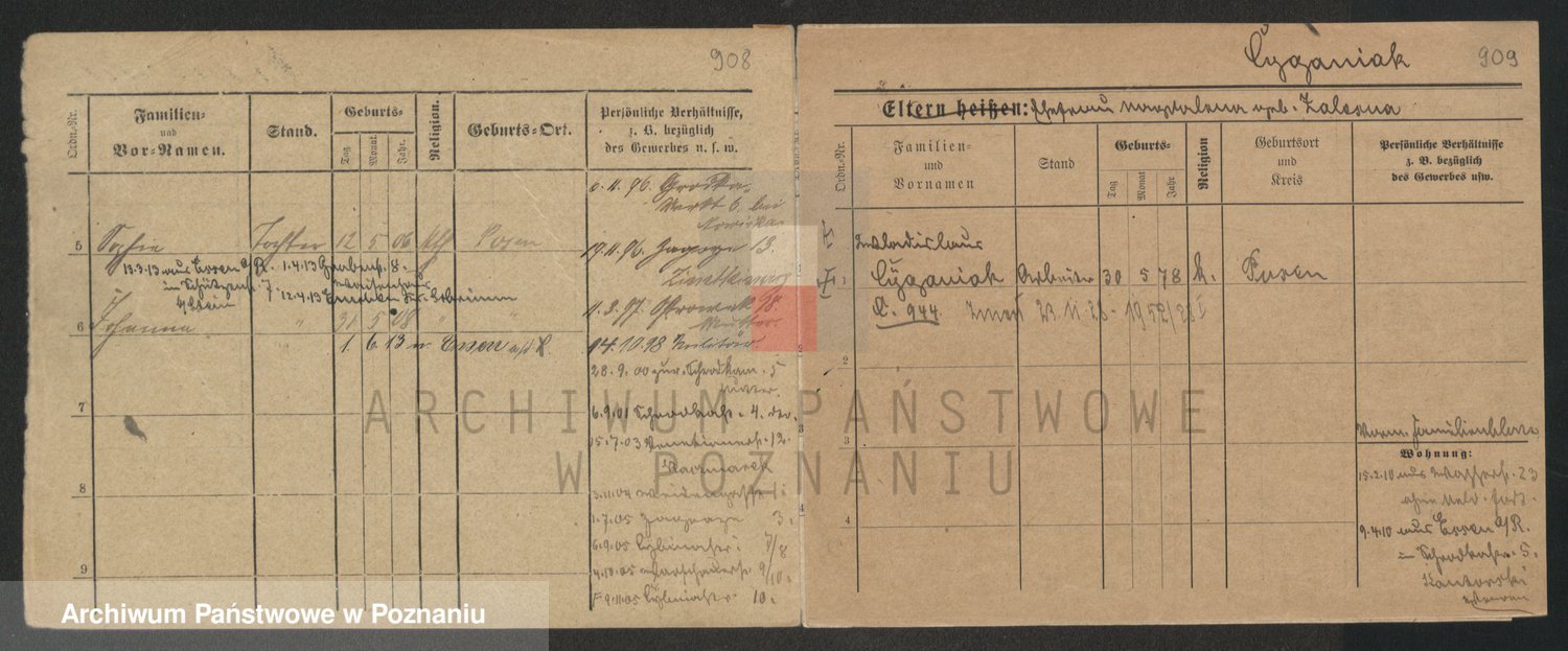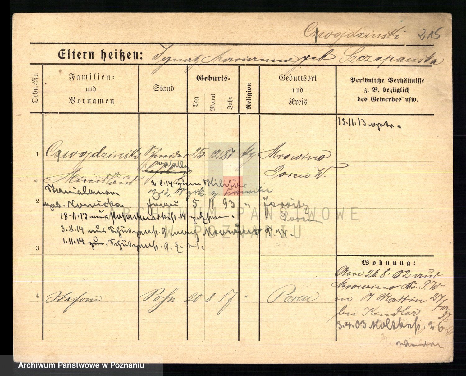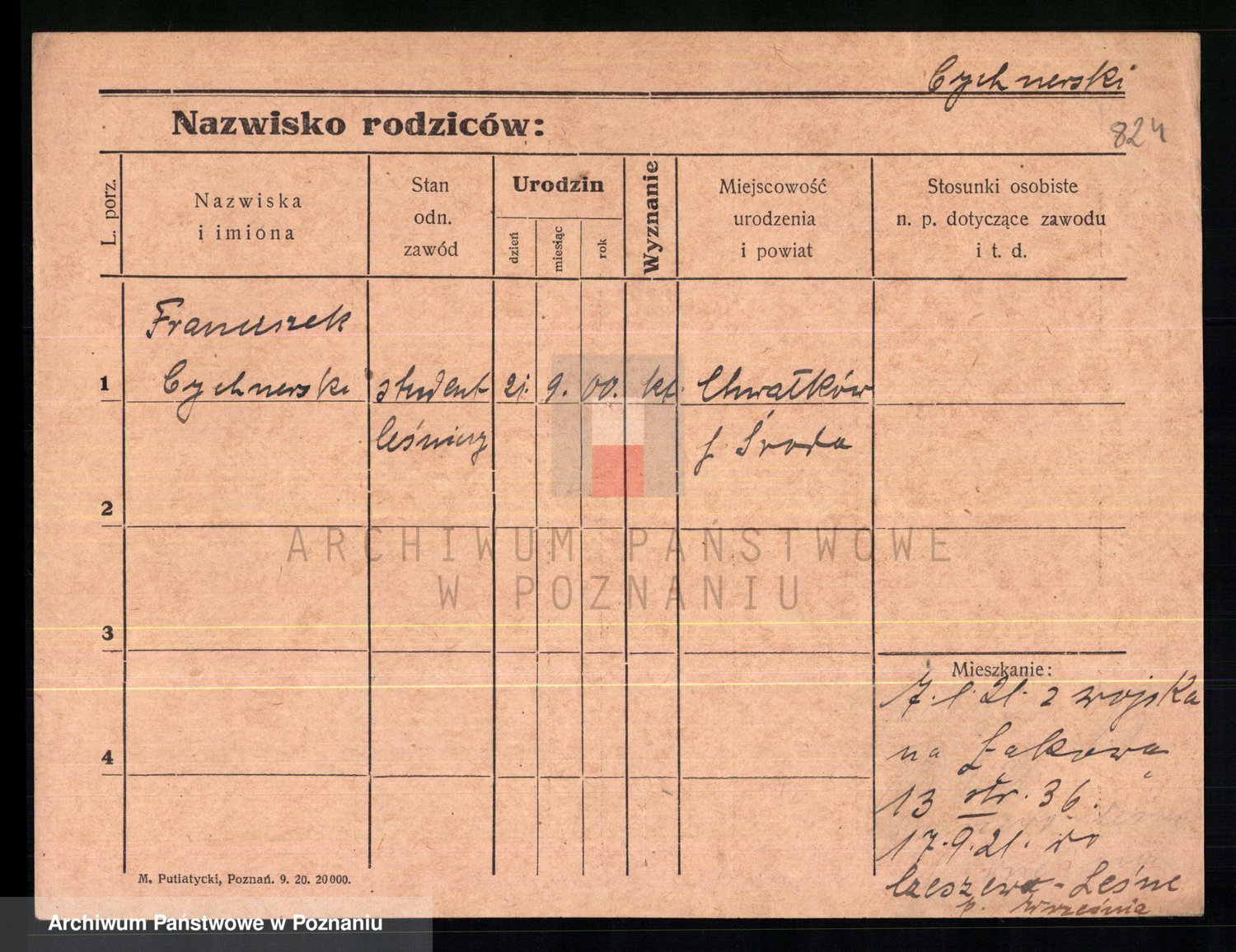 Podgląd karty osobowej dostępny jest po kliknięciu na nazwisko lub ikonkę karty. Można dokonywać powiększenia (ikony na górze) lub przechodzić między kolejnymi skanami (strzałki po bokach).