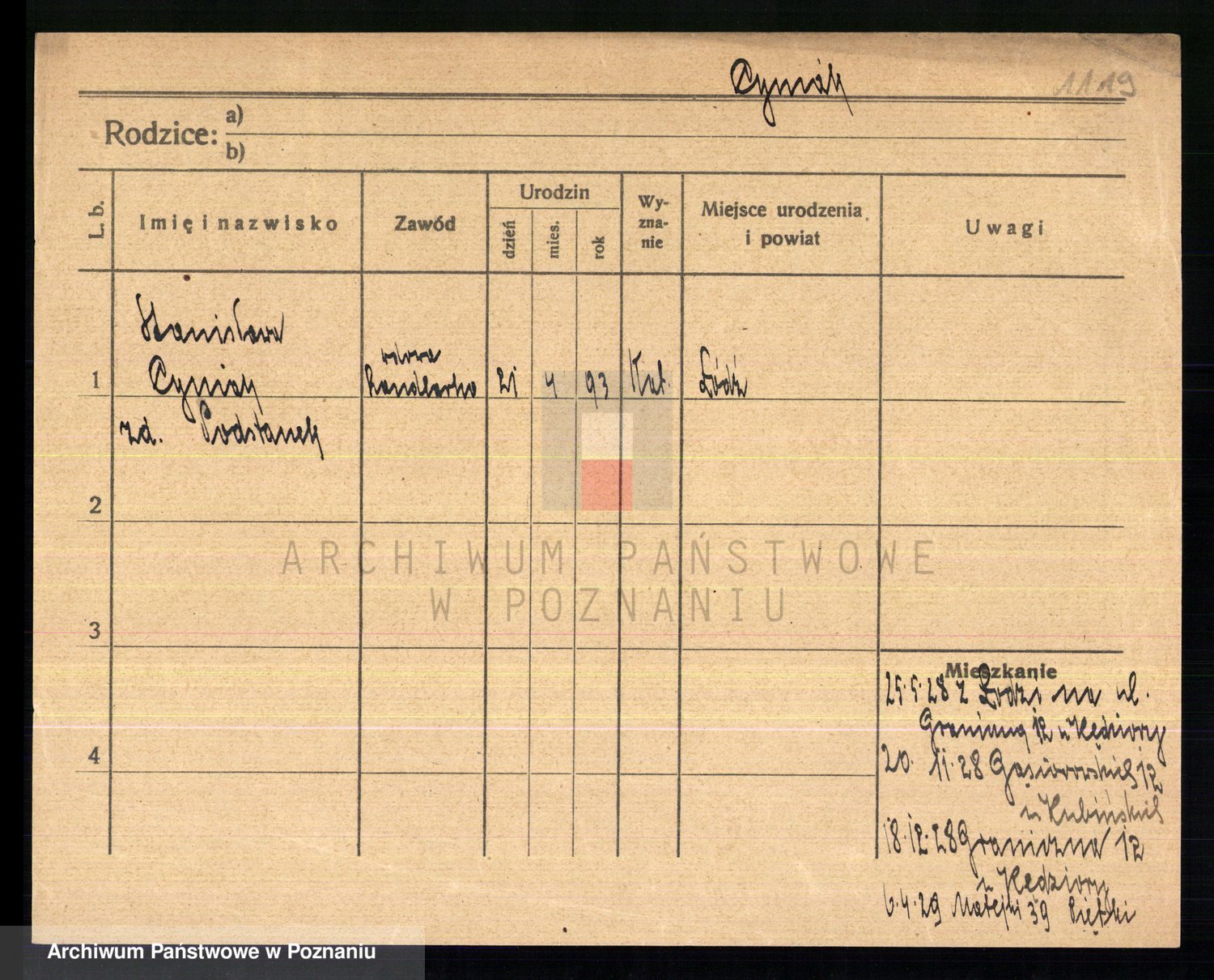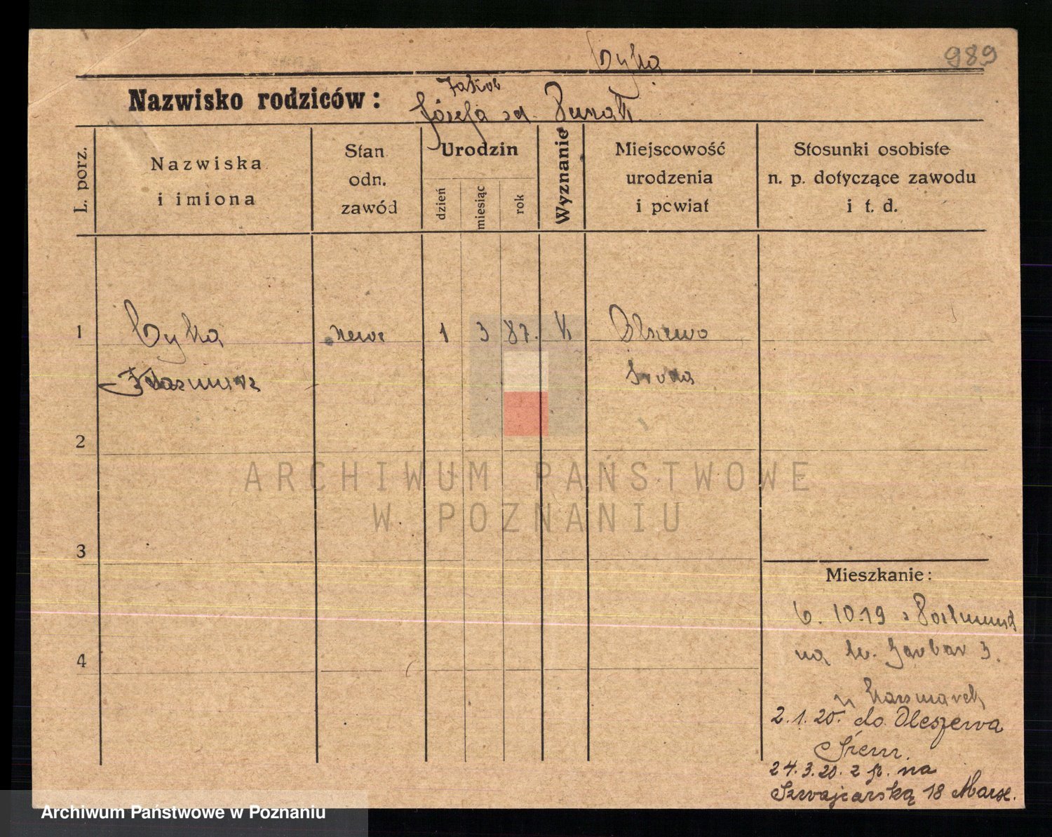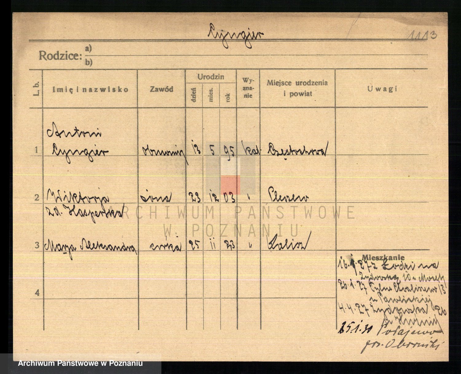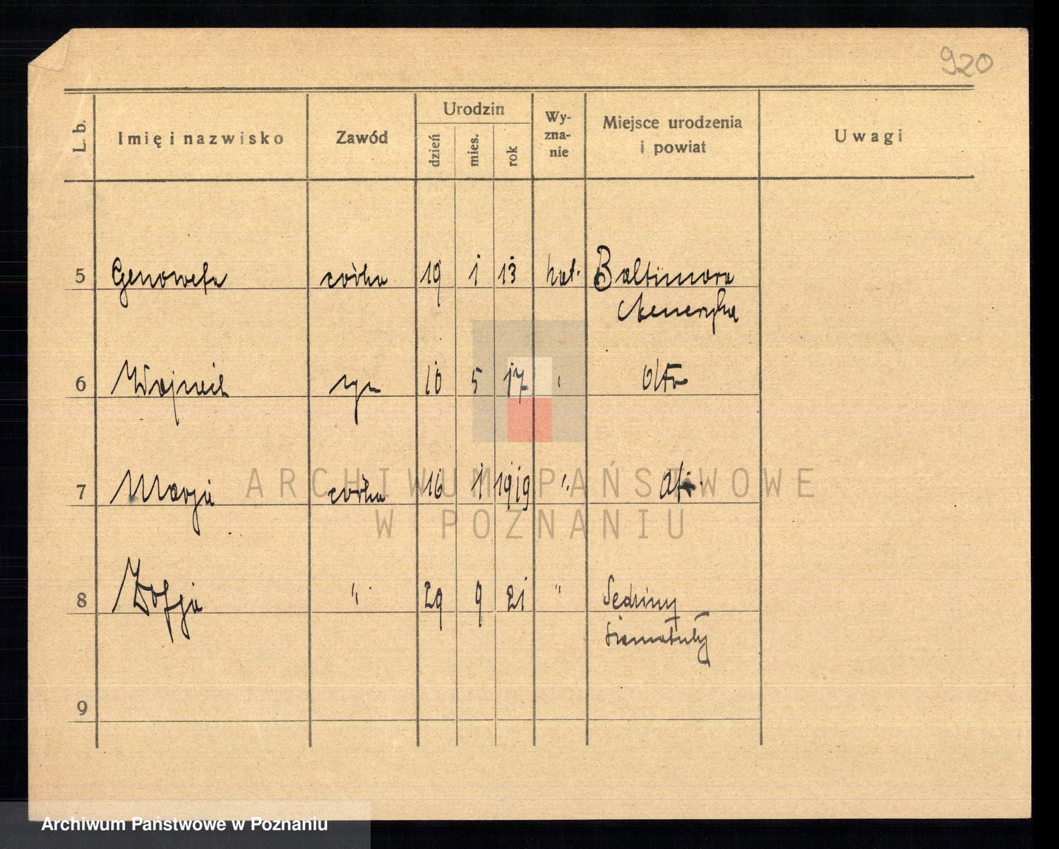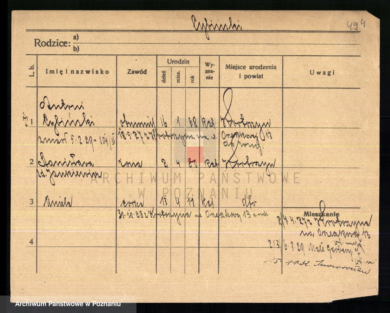 Podgląd karty osobowej dostępny jest po kliknięciu na nazwisko lub ikonkę karty. Można dokonywać powiększenia (ikony na górze) lub przechodzić między kolejnymi skanami (strzałki po bokach).