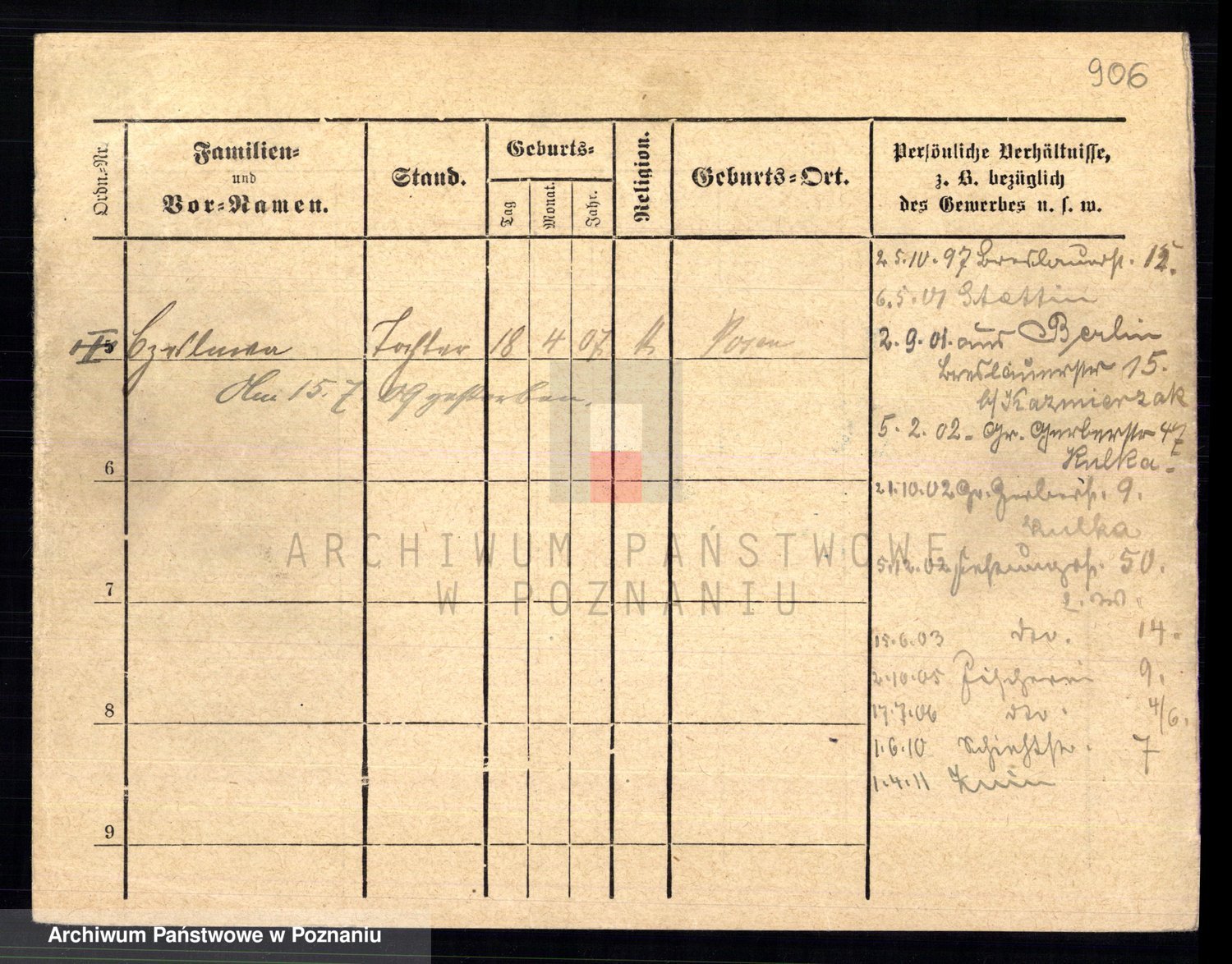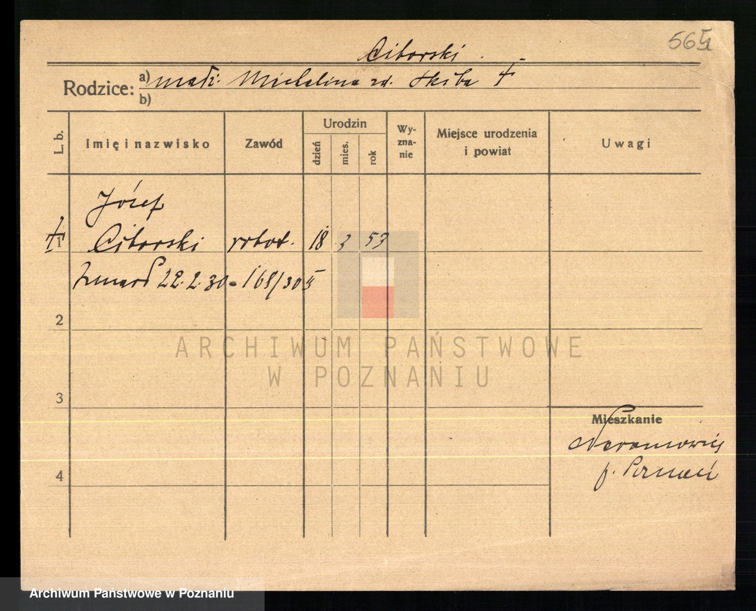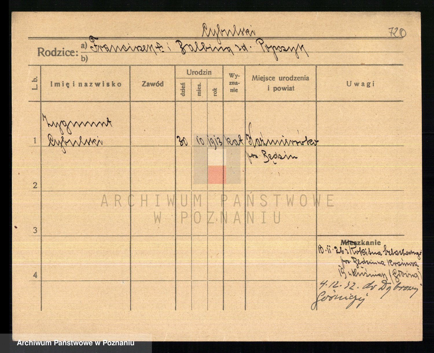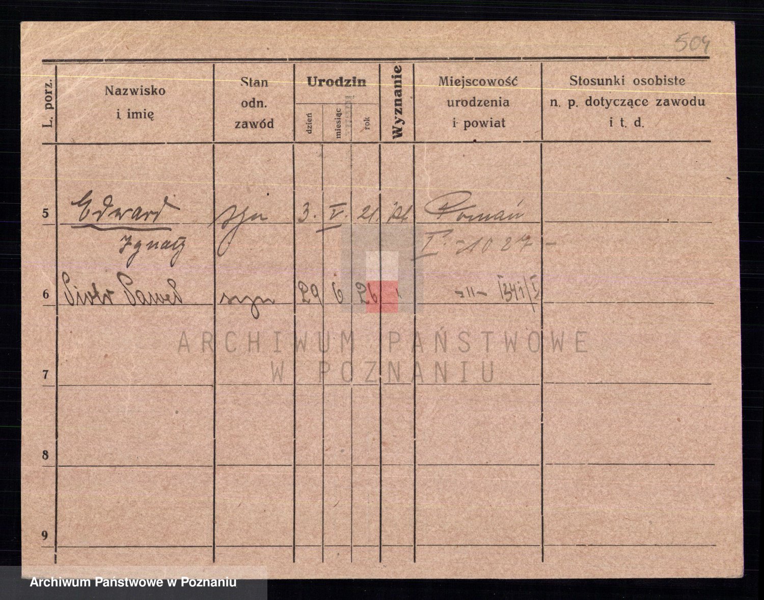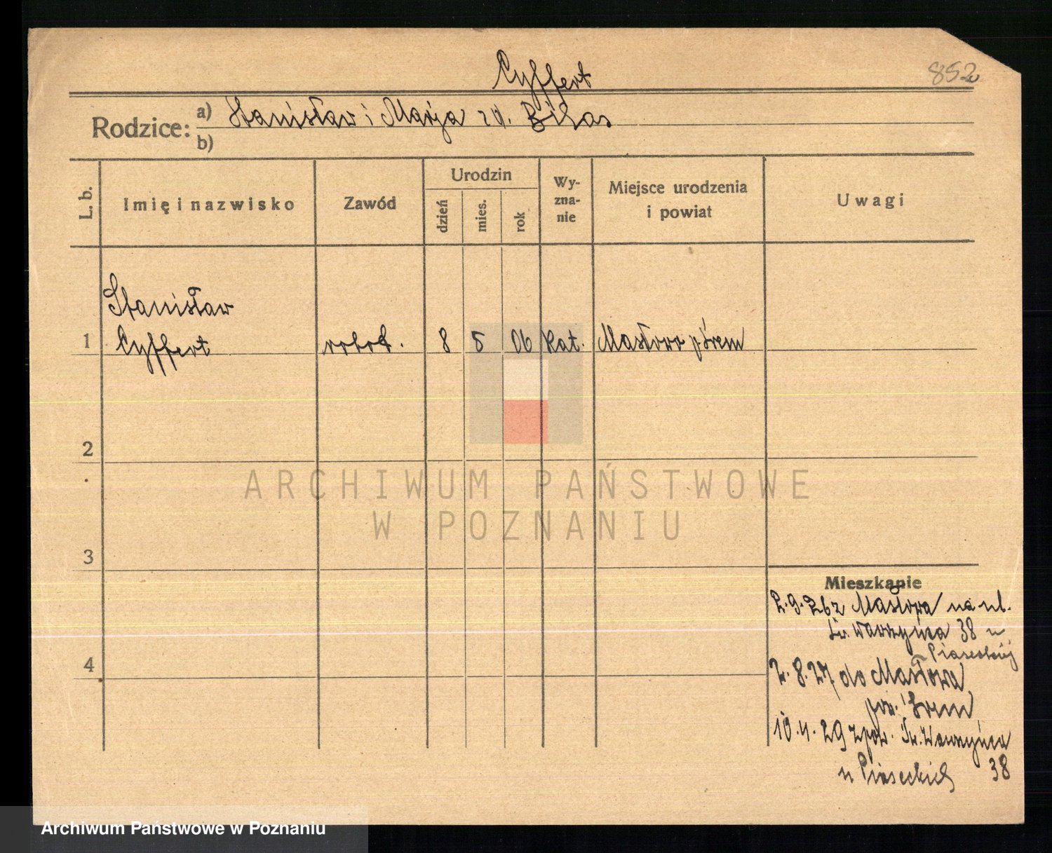 Podgląd karty osobowej dostępny jest po kliknięciu na nazwisko lub ikonkę karty. Można dokonywać powiększenia (ikony na górze) lub przechodzić między kolejnymi skanami (strzałki po bokach).