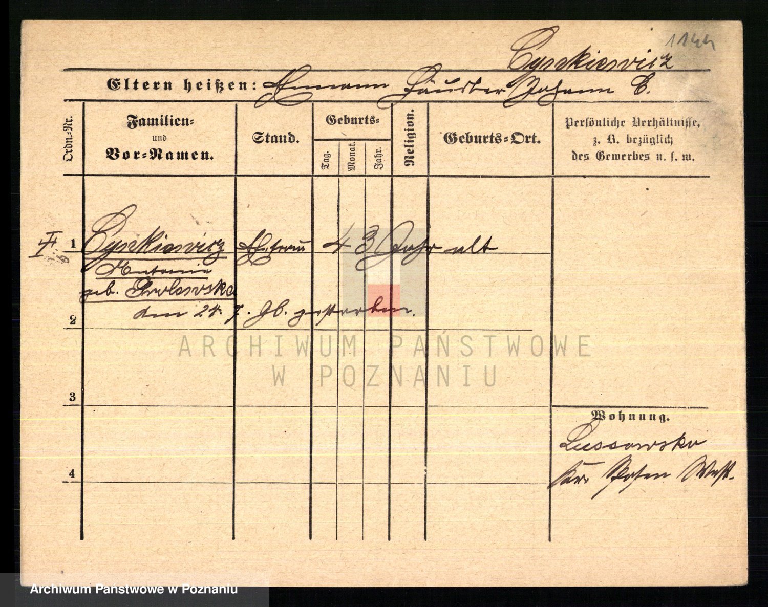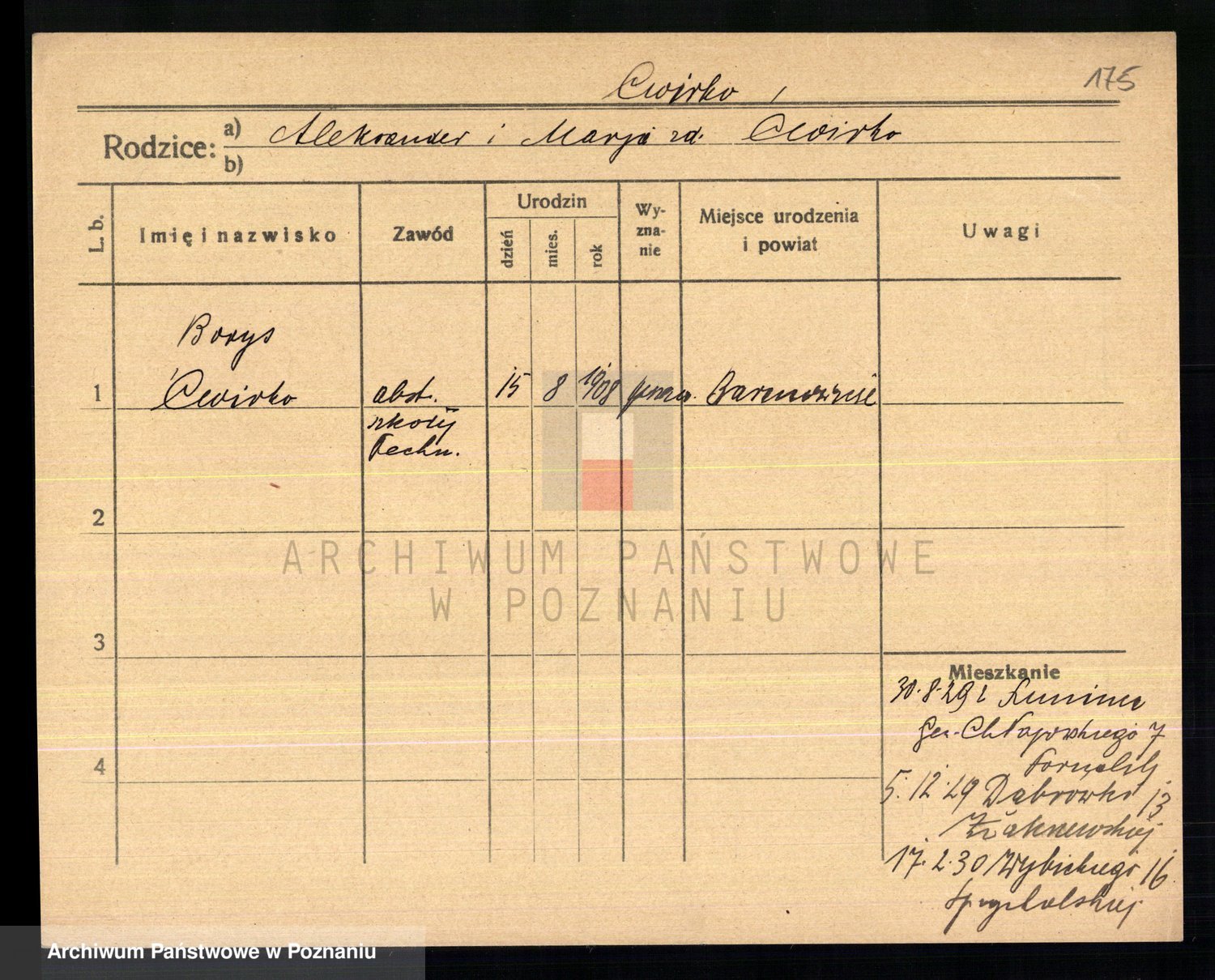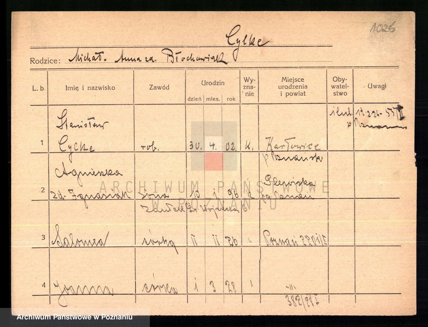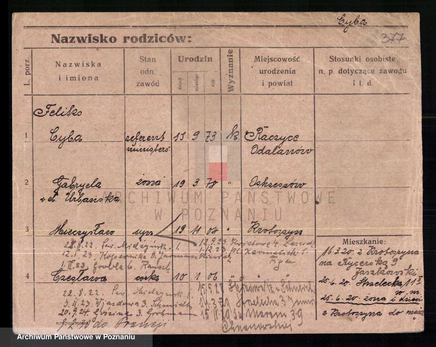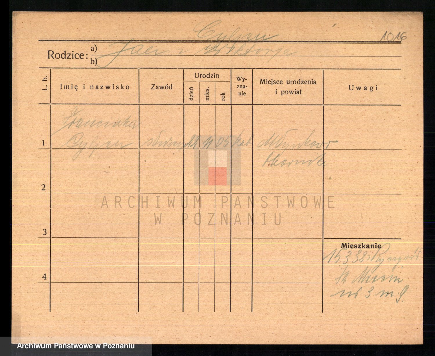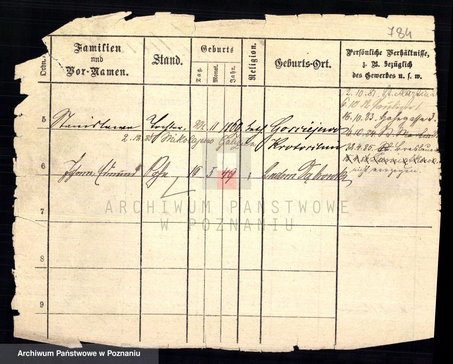 Podgląd karty osobowej dostępny jest po kliknięciu na nazwisko lub ikonkę karty. Można dokonywać powiększenia (ikony na górze) lub przechodzić między kolejnymi skanami (strzałki po bokach).