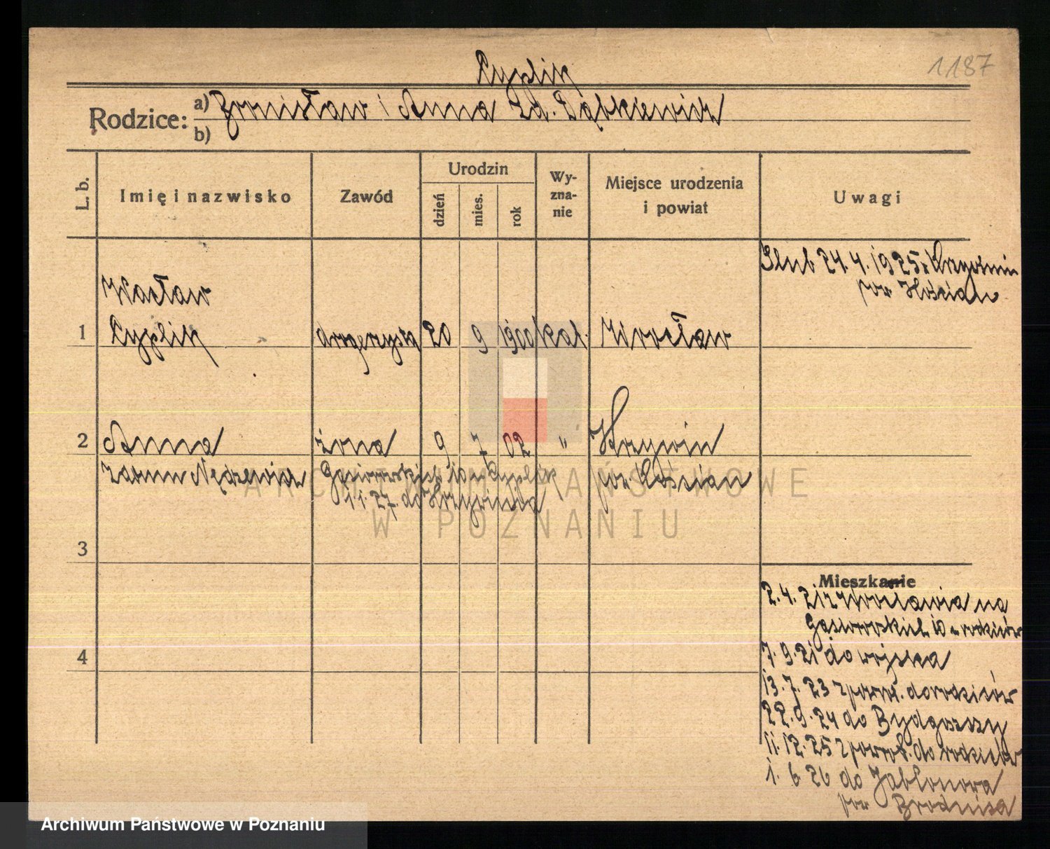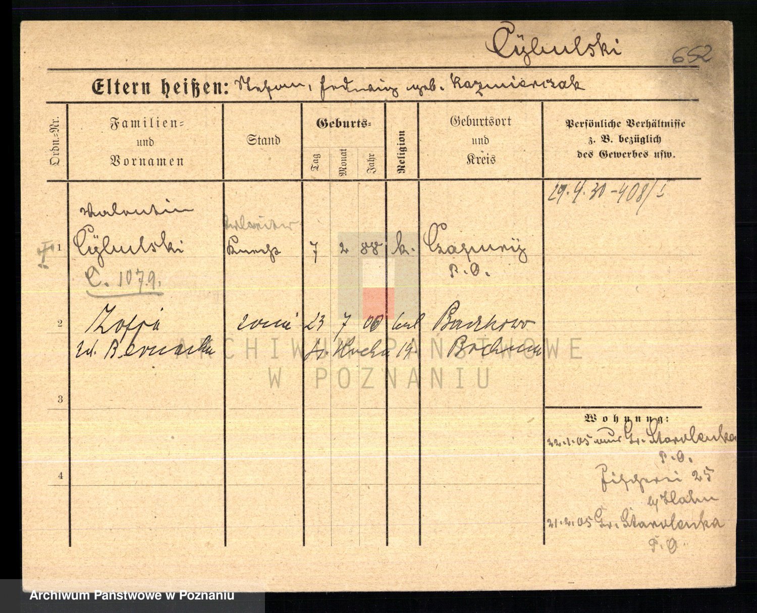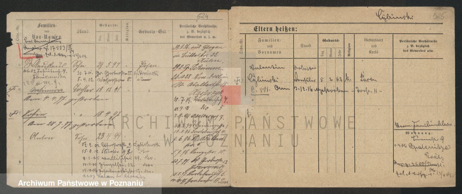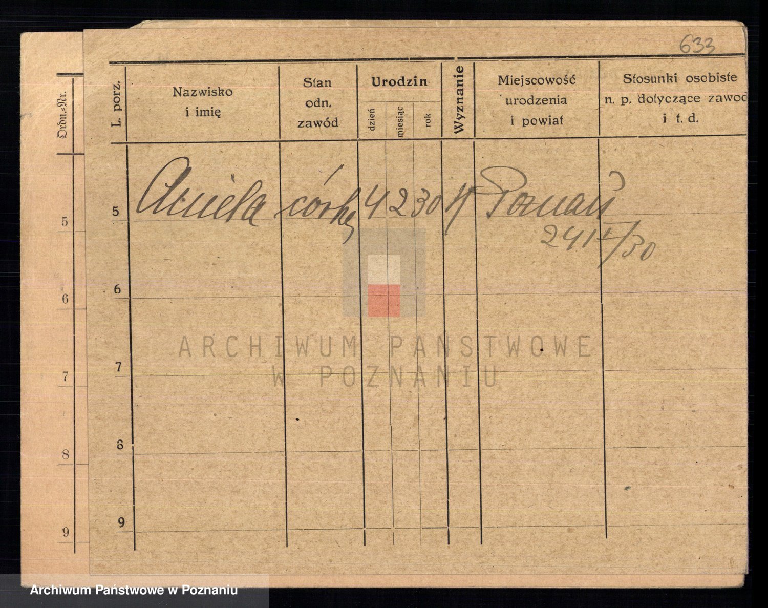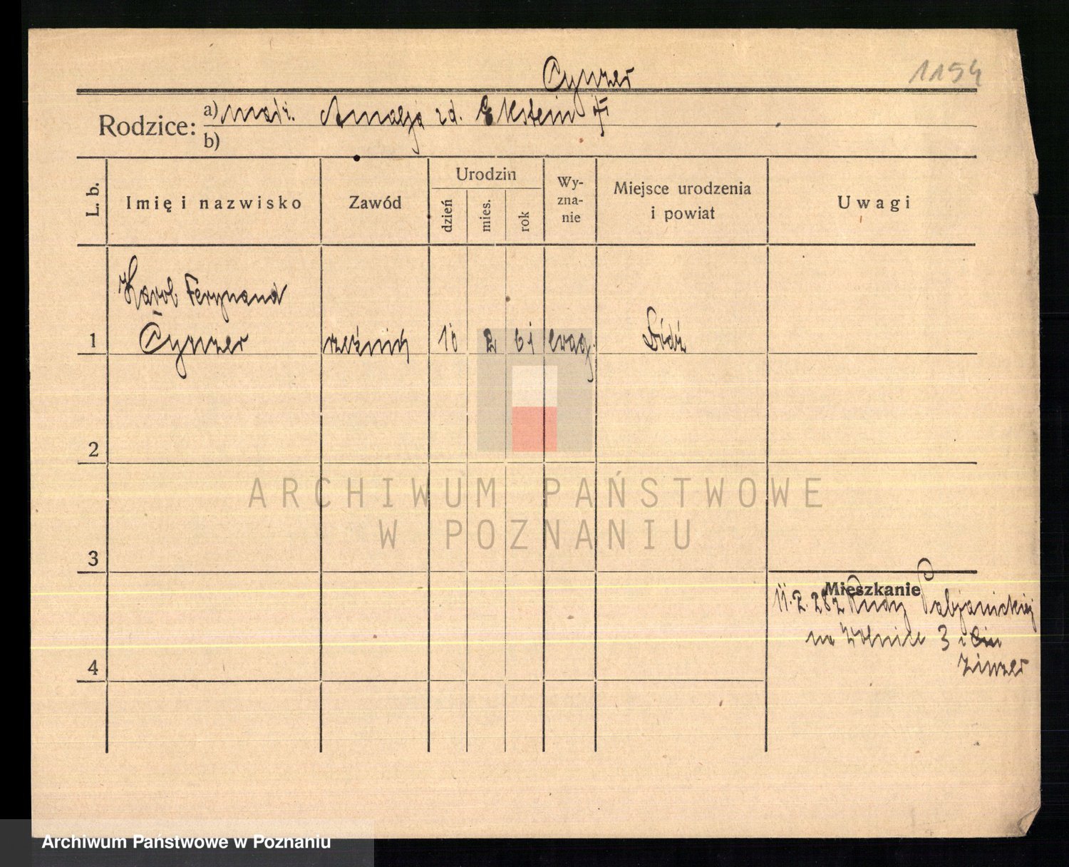 Podgląd karty osobowej dostępny jest po kliknięciu na nazwisko lub ikonkę karty. Można dokonywać powiększenia (ikony na górze) lub przechodzić między kolejnymi skanami (strzałki po bokach).