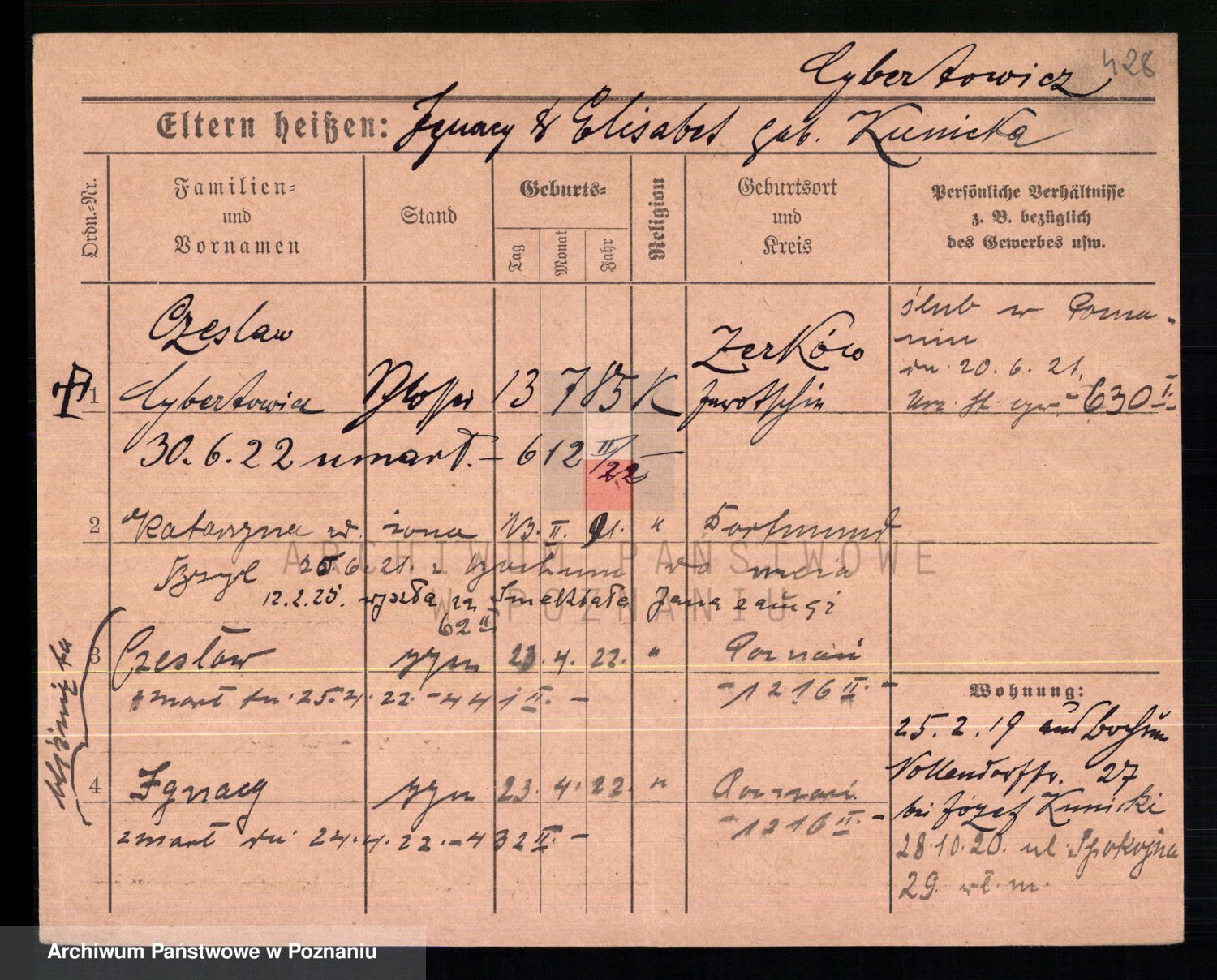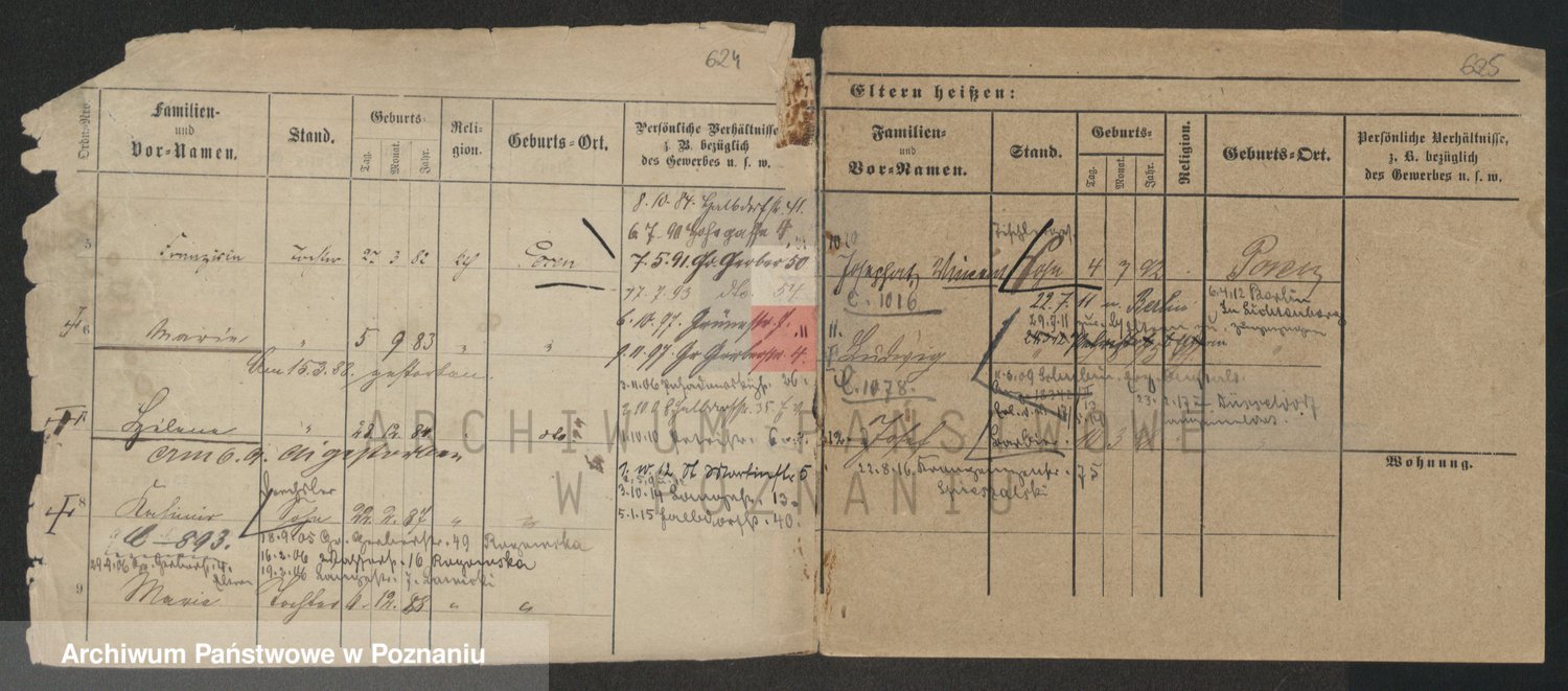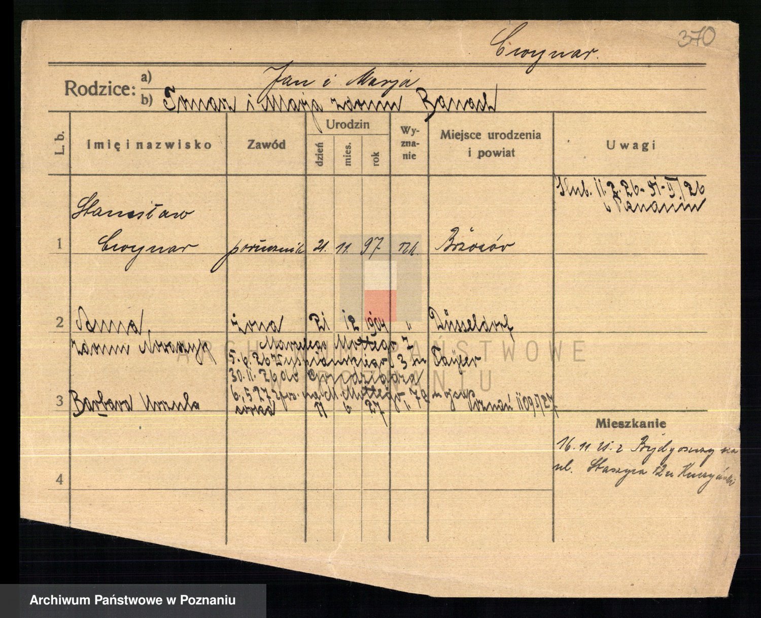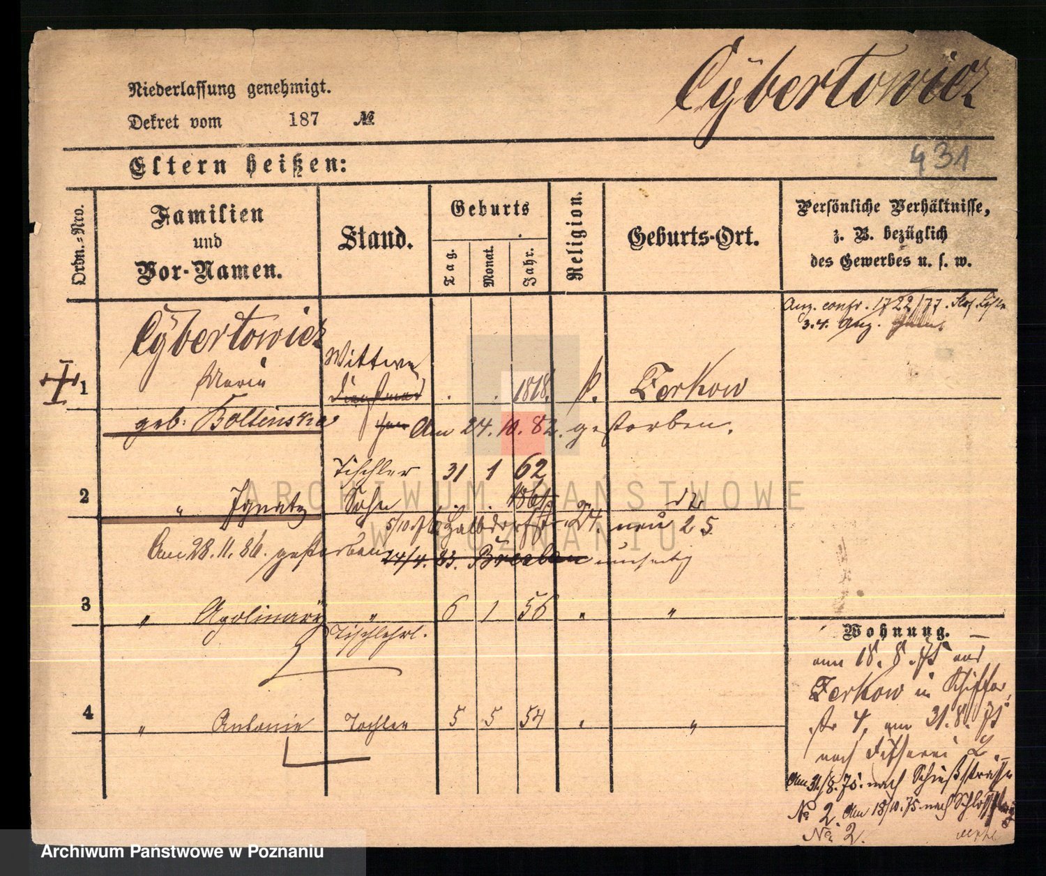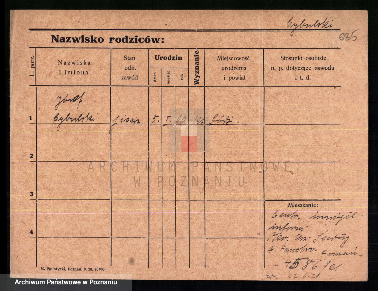 Podgląd karty osobowej dostępny jest po kliknięciu na nazwisko lub ikonkę karty. Można dokonywać powiększenia (ikony na górze) lub przechodzić między kolejnymi skanami (strzałki po bokach).