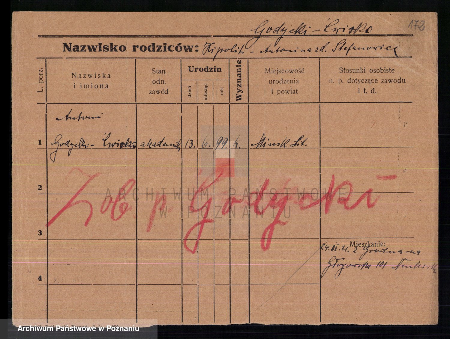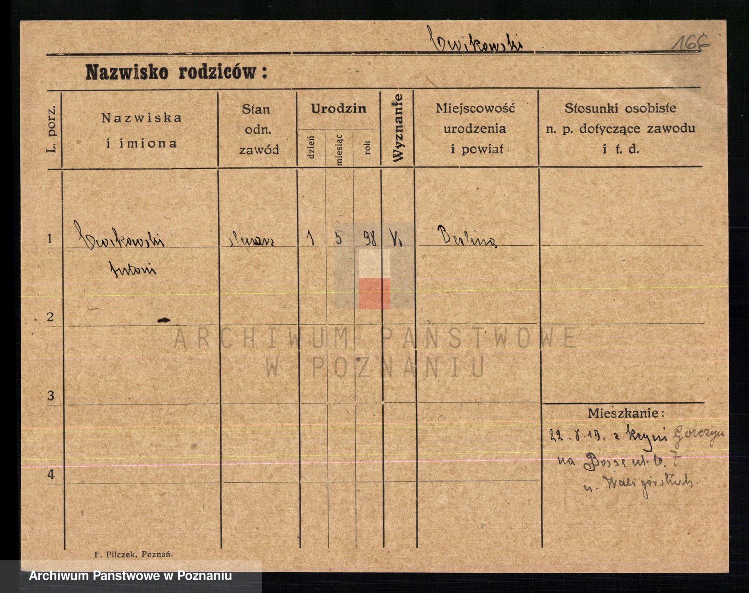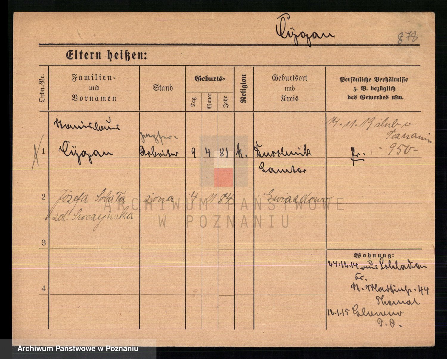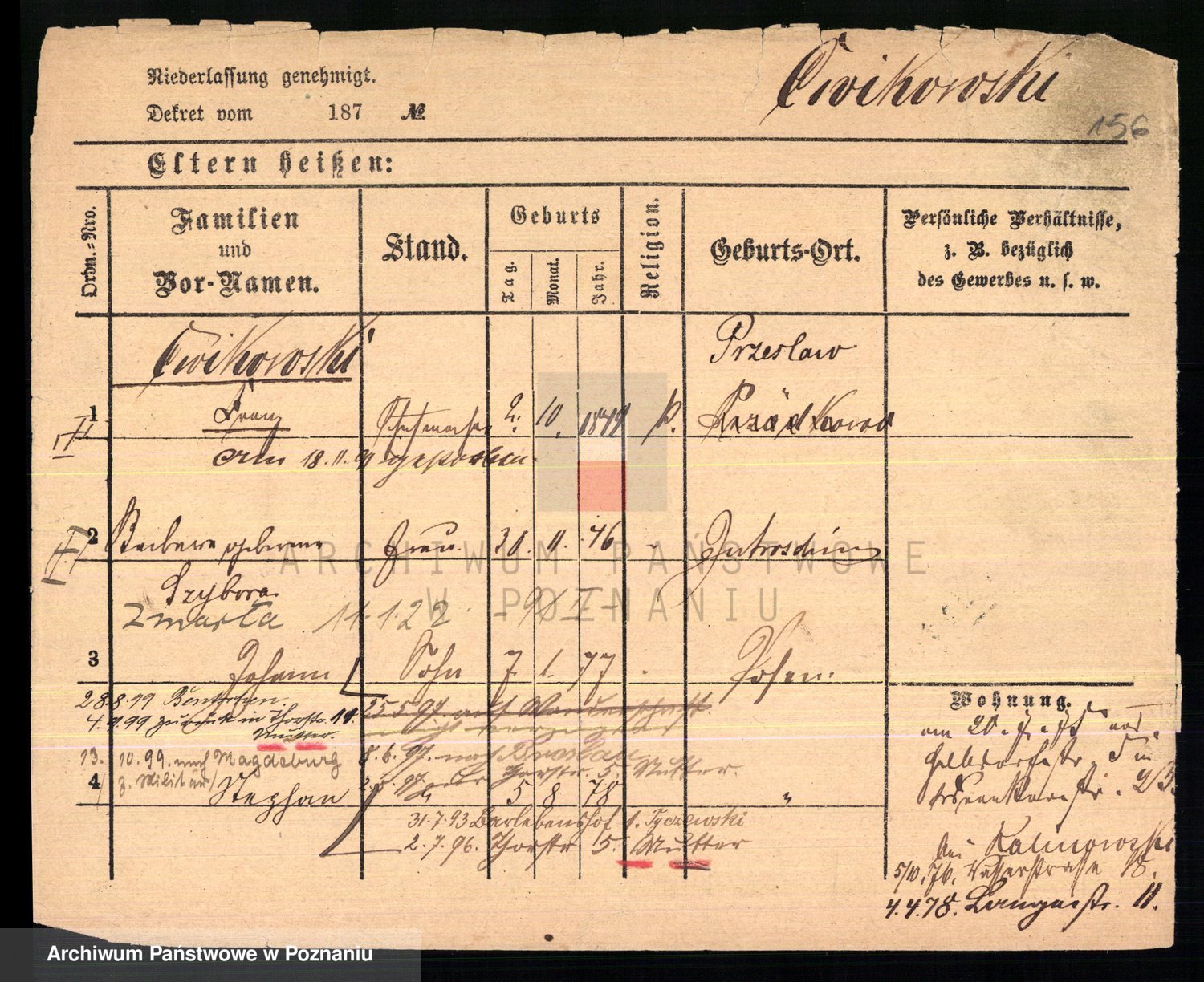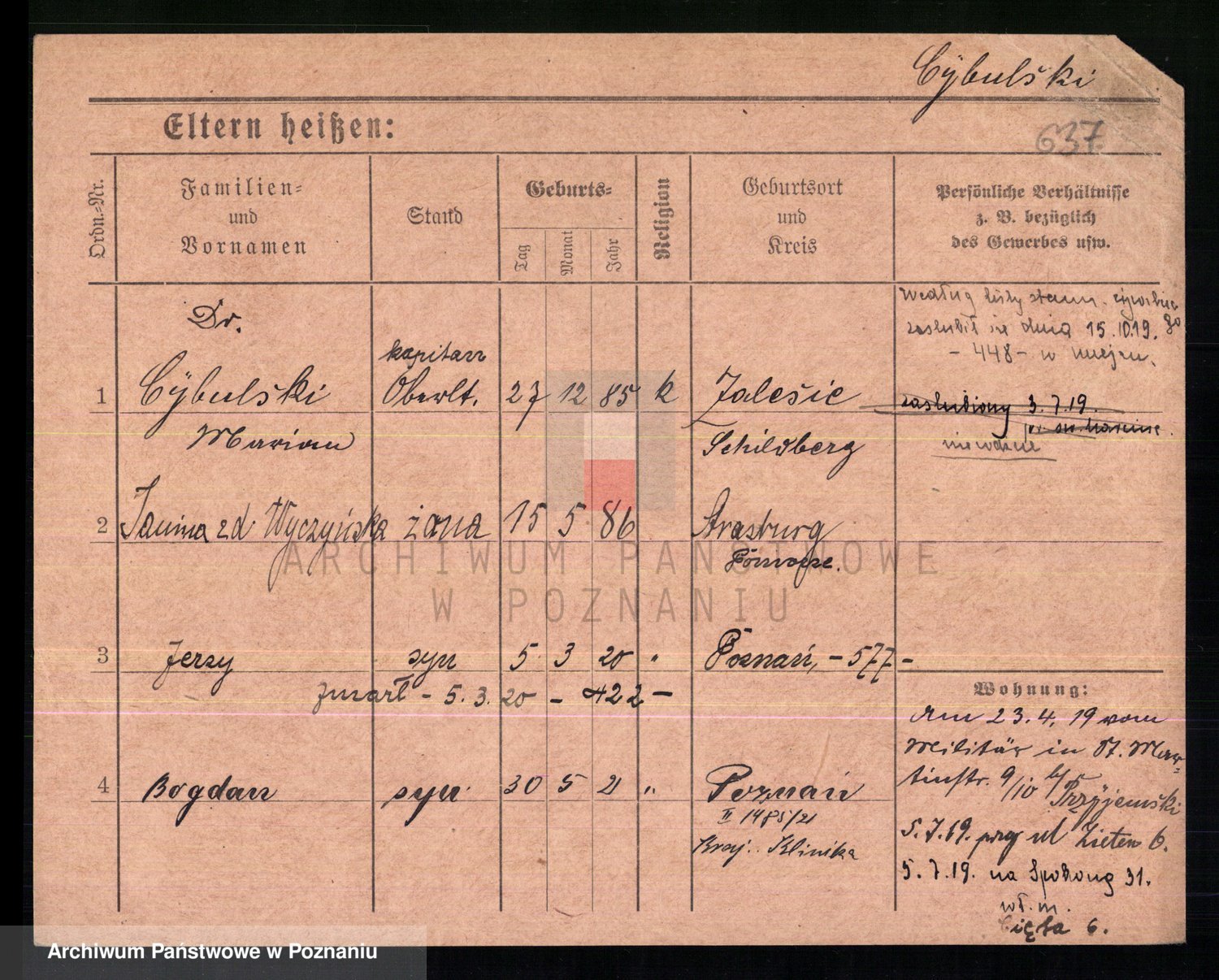 Podgląd karty osobowej dostępny jest po kliknięciu na nazwisko lub ikonkę karty. Można dokonywać powiększenia (ikony na górze) lub przechodzić między kolejnymi skanami (strzałki po bokach).