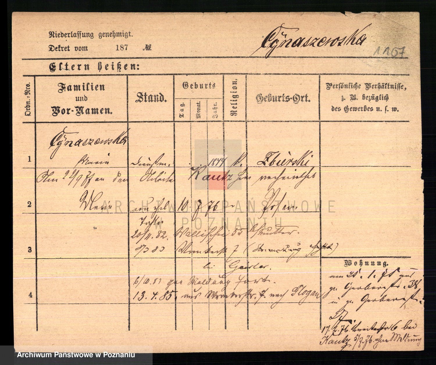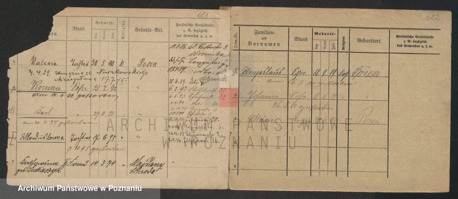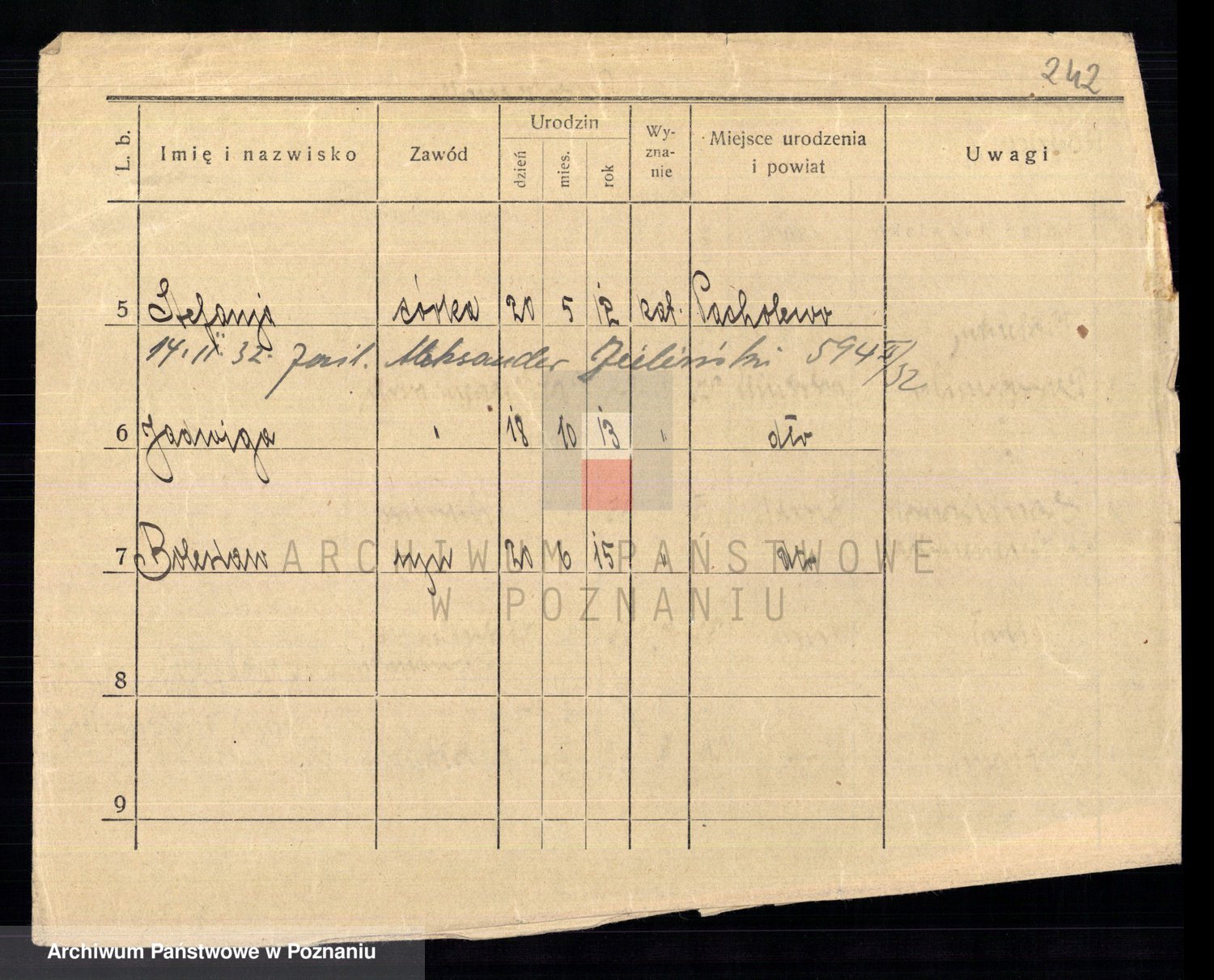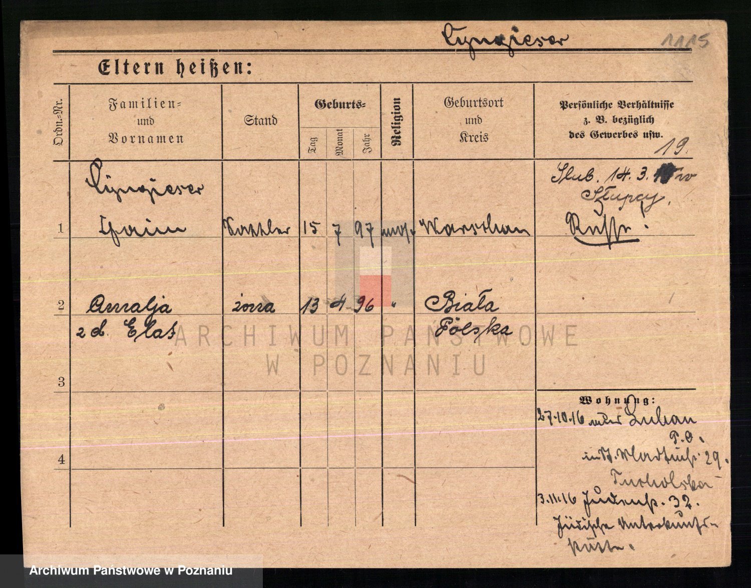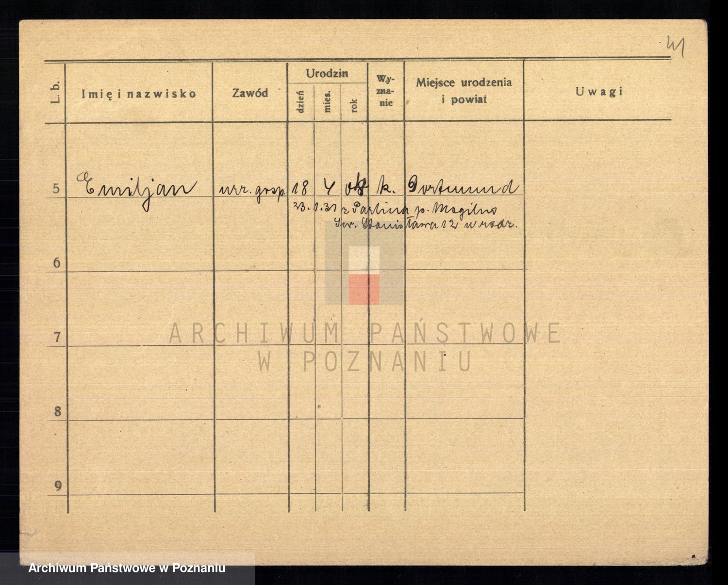Podgląd karty osobowej dostępny jest po kliknięciu na nazwisko lub ikonkę karty. Można dokonywać powiększenia (ikony na górze) lub przechodzić między kolejnymi skanami (strzałki po bokach).