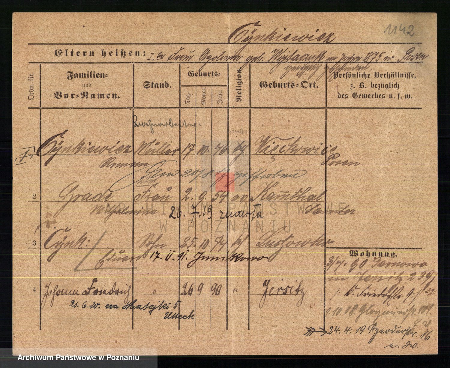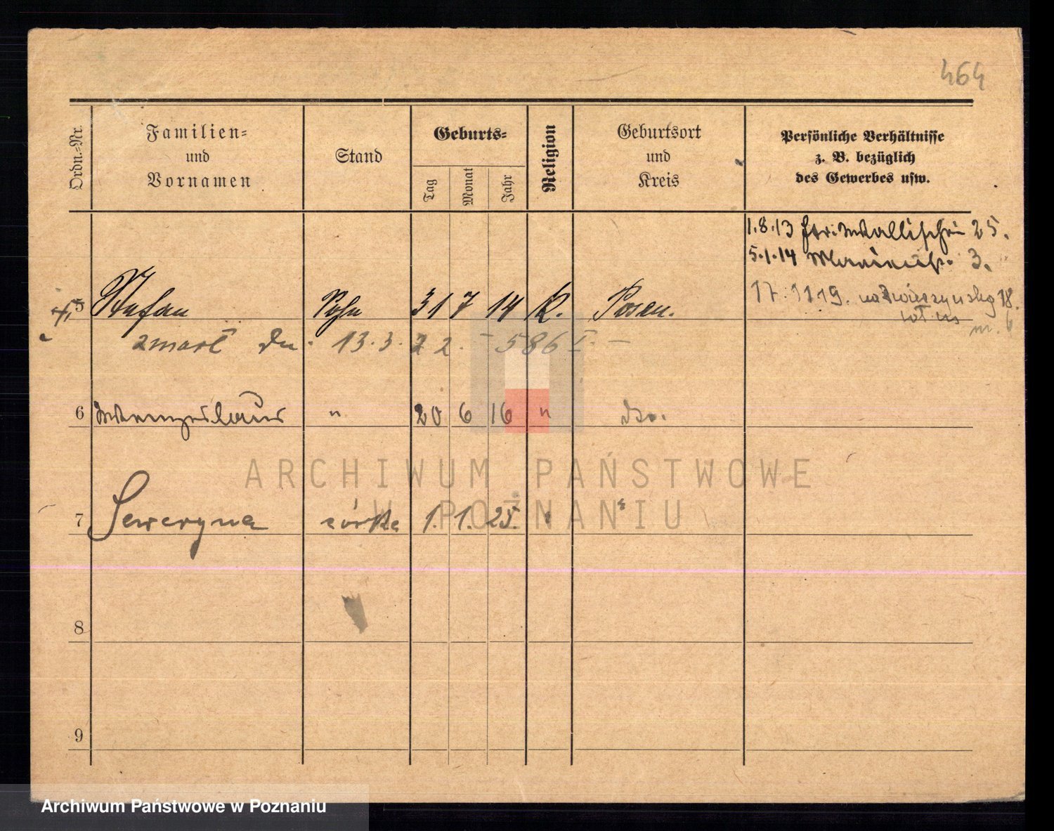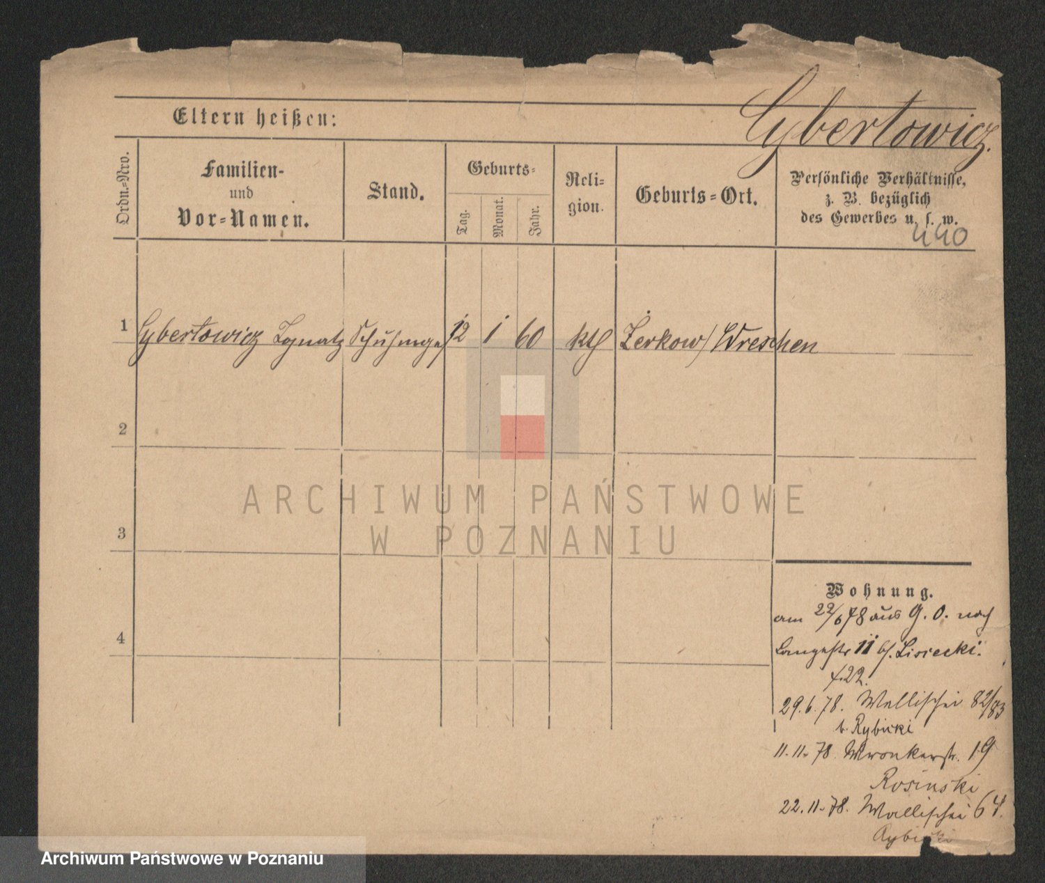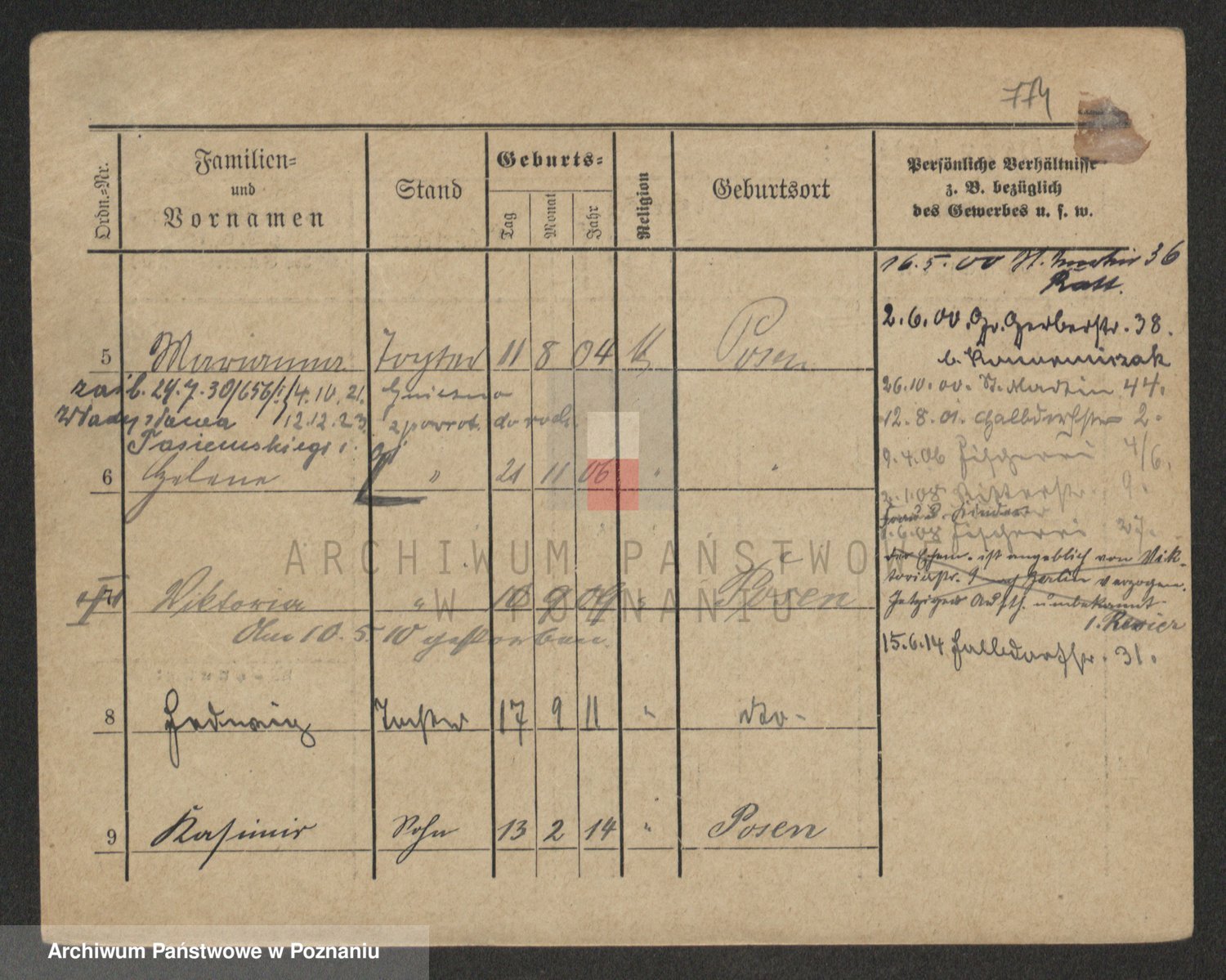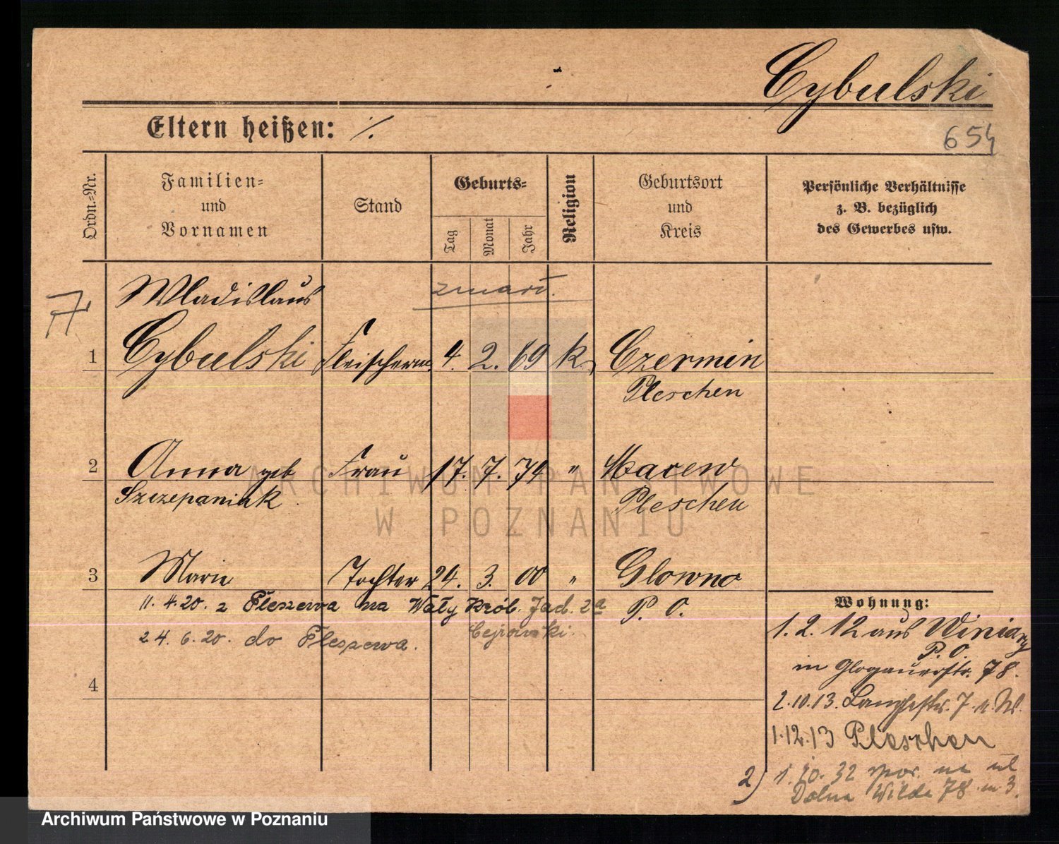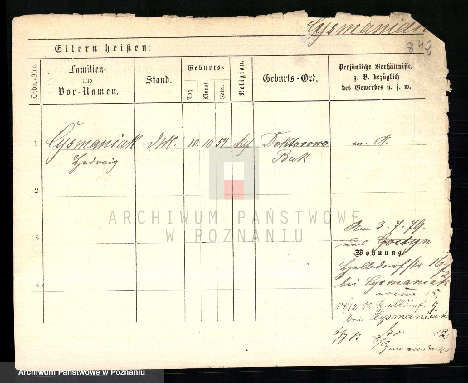 Podgląd karty osobowej dostępny jest po kliknięciu na nazwisko lub ikonkę karty. Można dokonywać powiększenia (ikony na górze) lub przechodzić między kolejnymi skanami (strzałki po bokach).