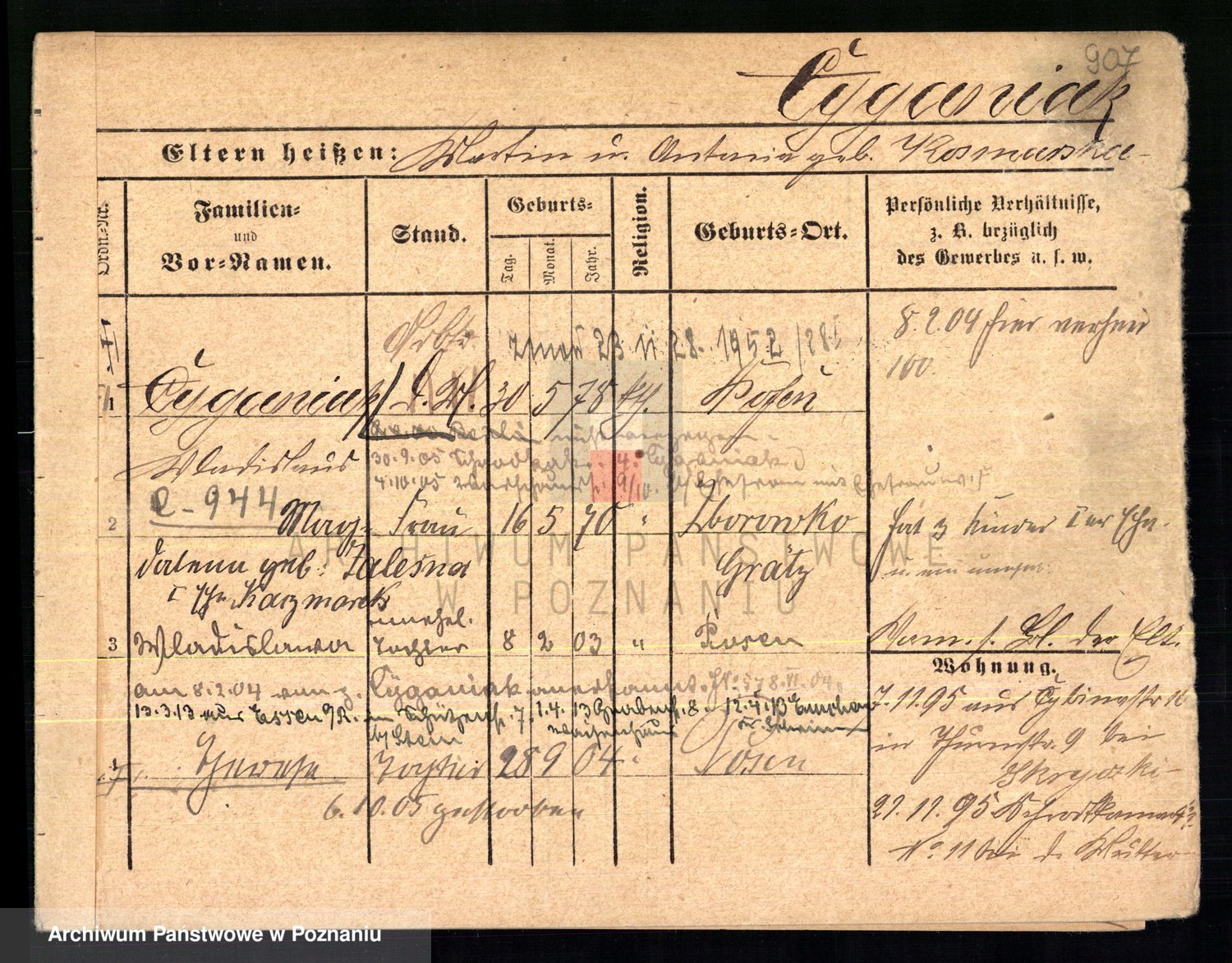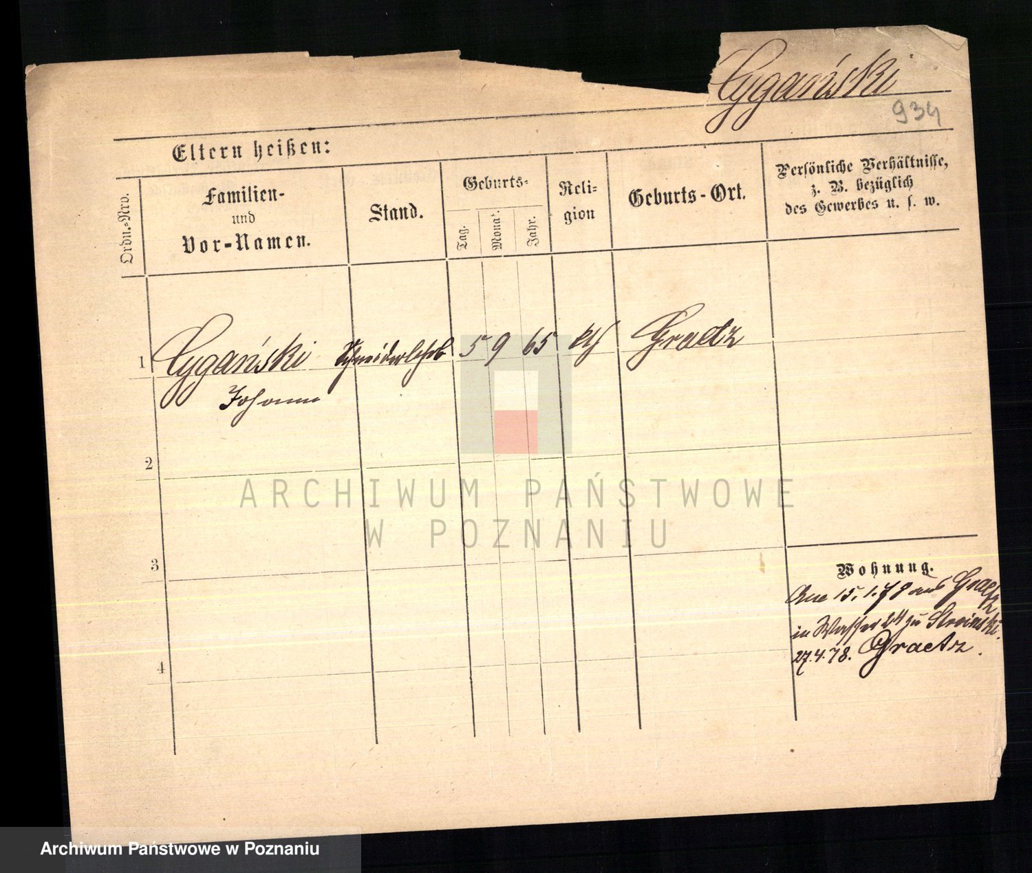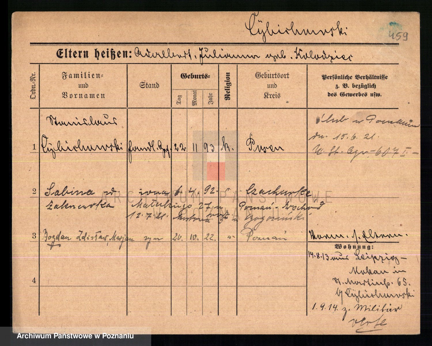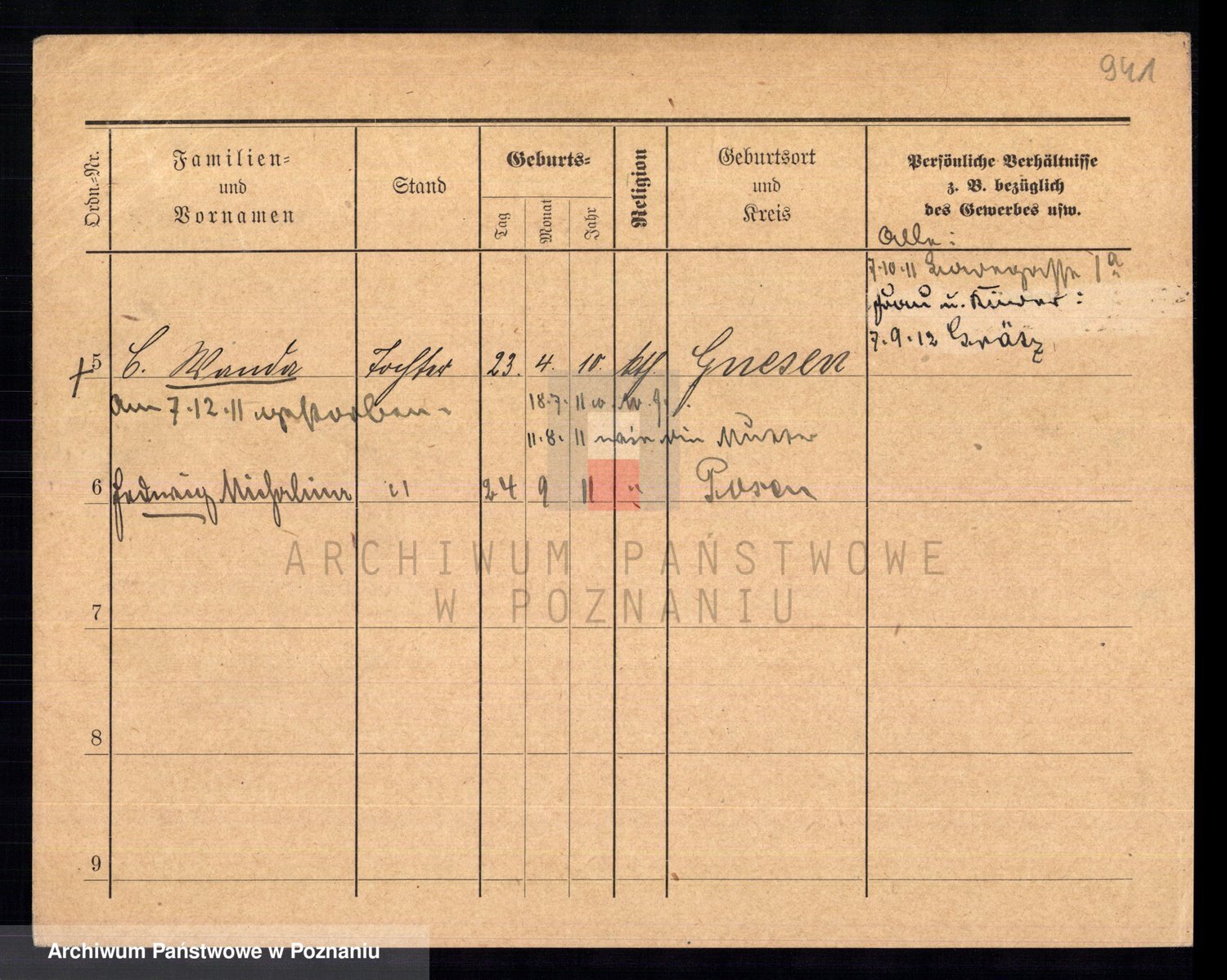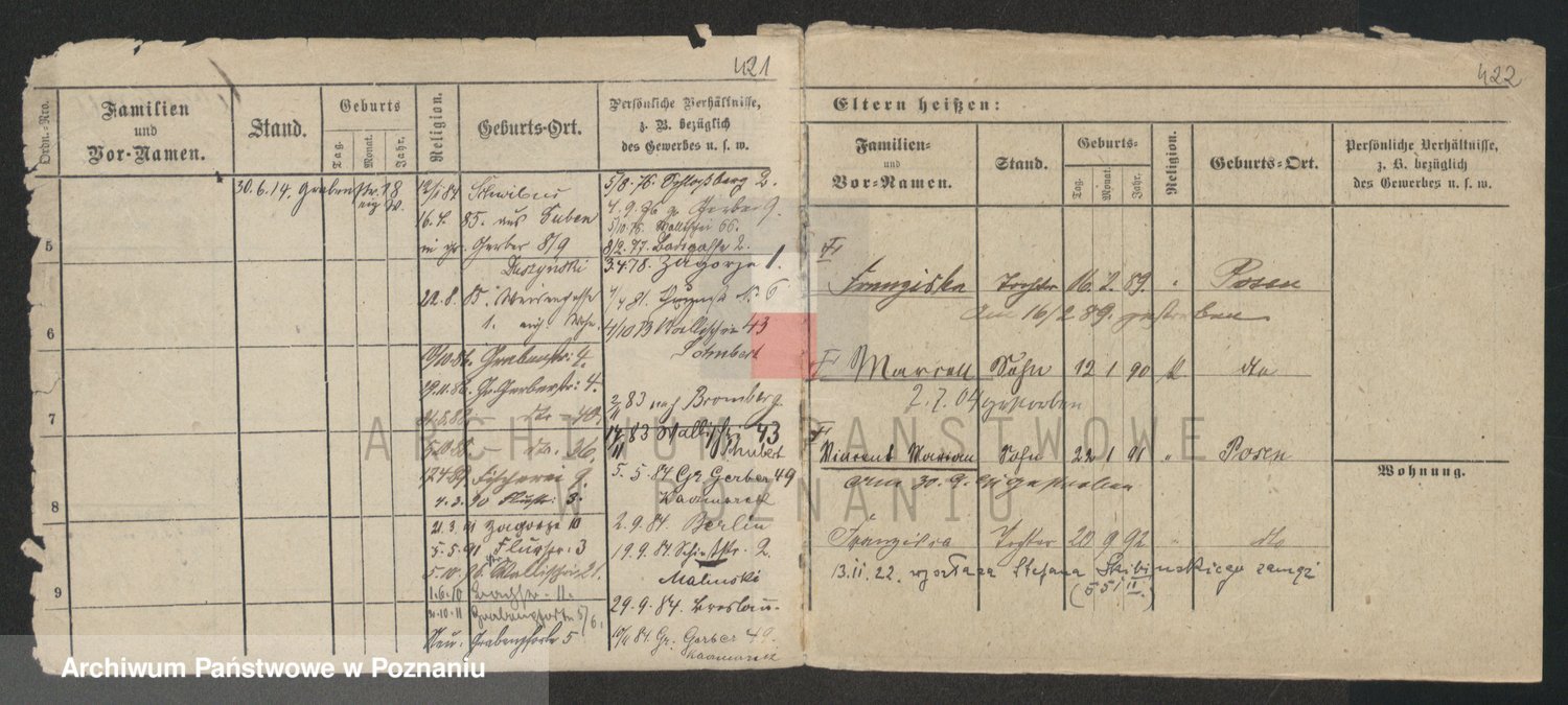 Podgląd karty osobowej dostępny jest po kliknięciu na nazwisko lub ikonkę karty. Można dokonywać powiększenia (ikony na górze) lub przechodzić między kolejnymi skanami (strzałki po bokach).