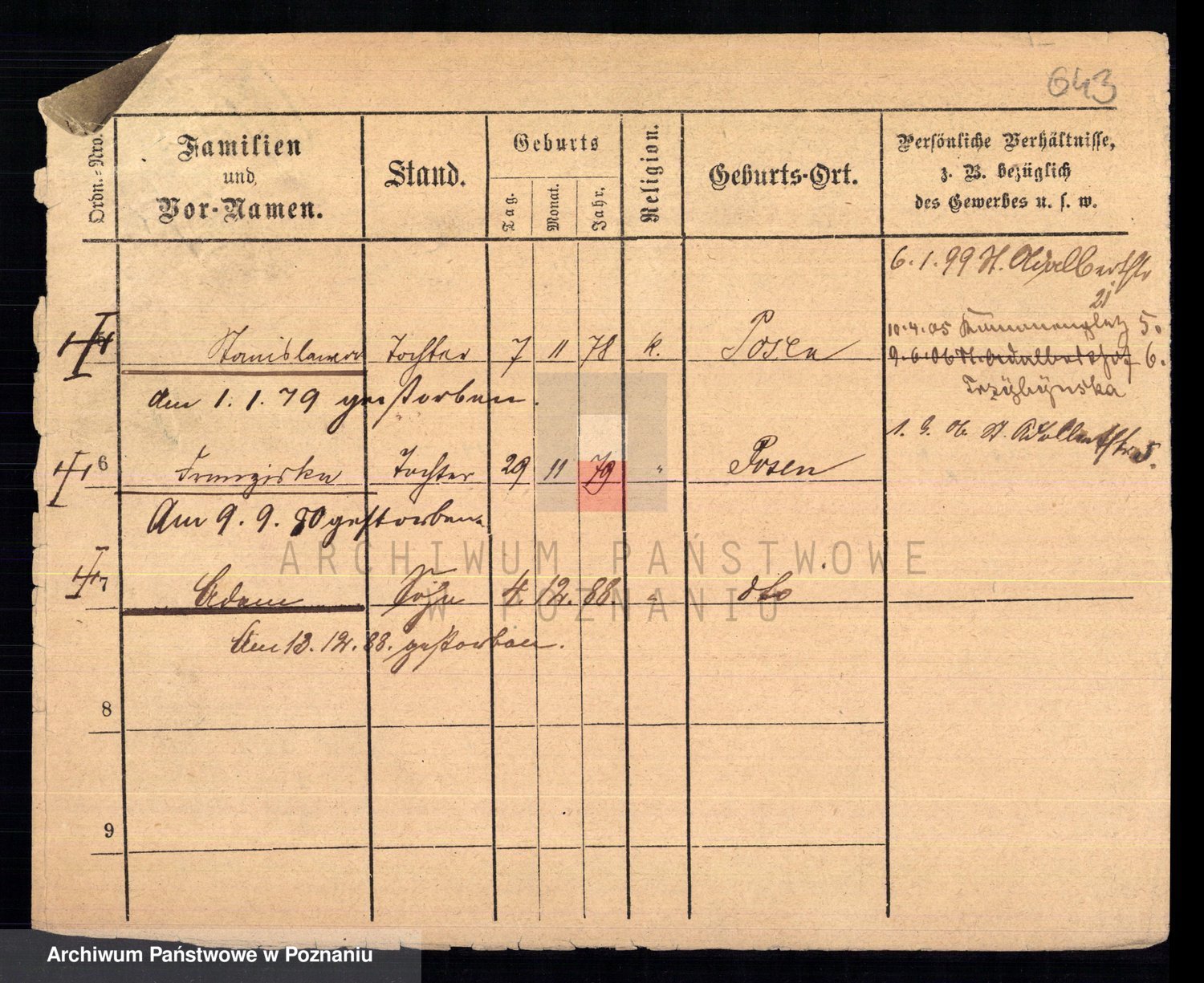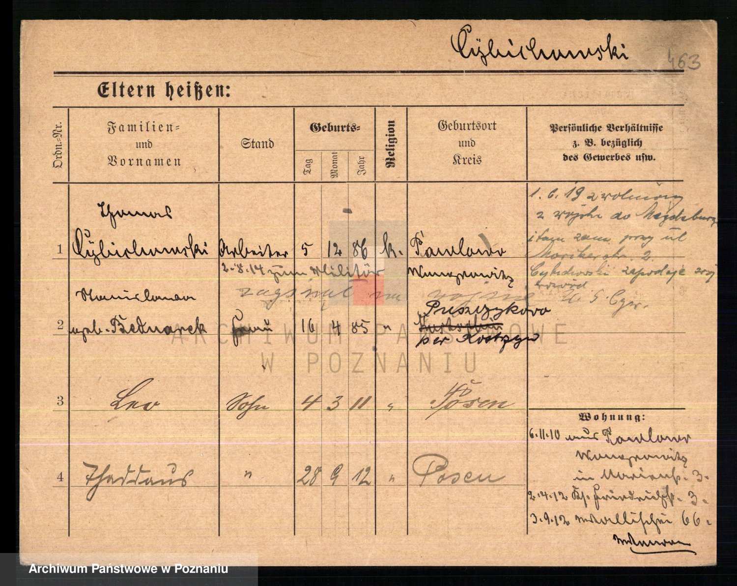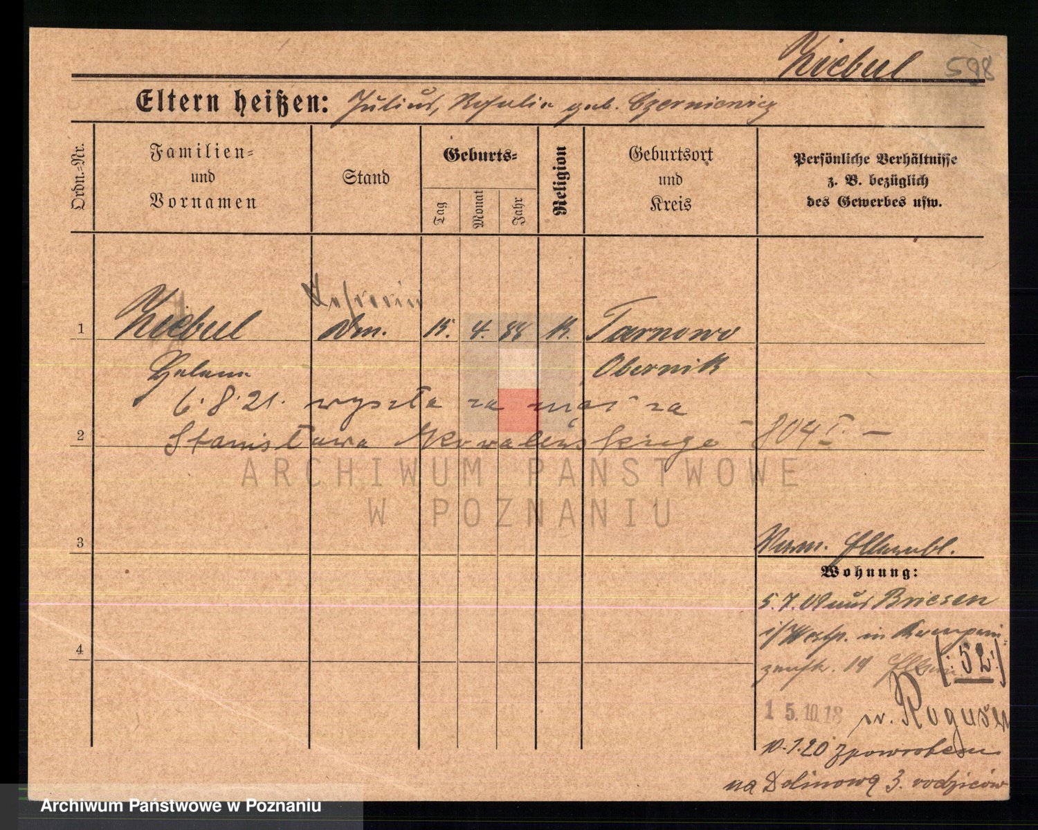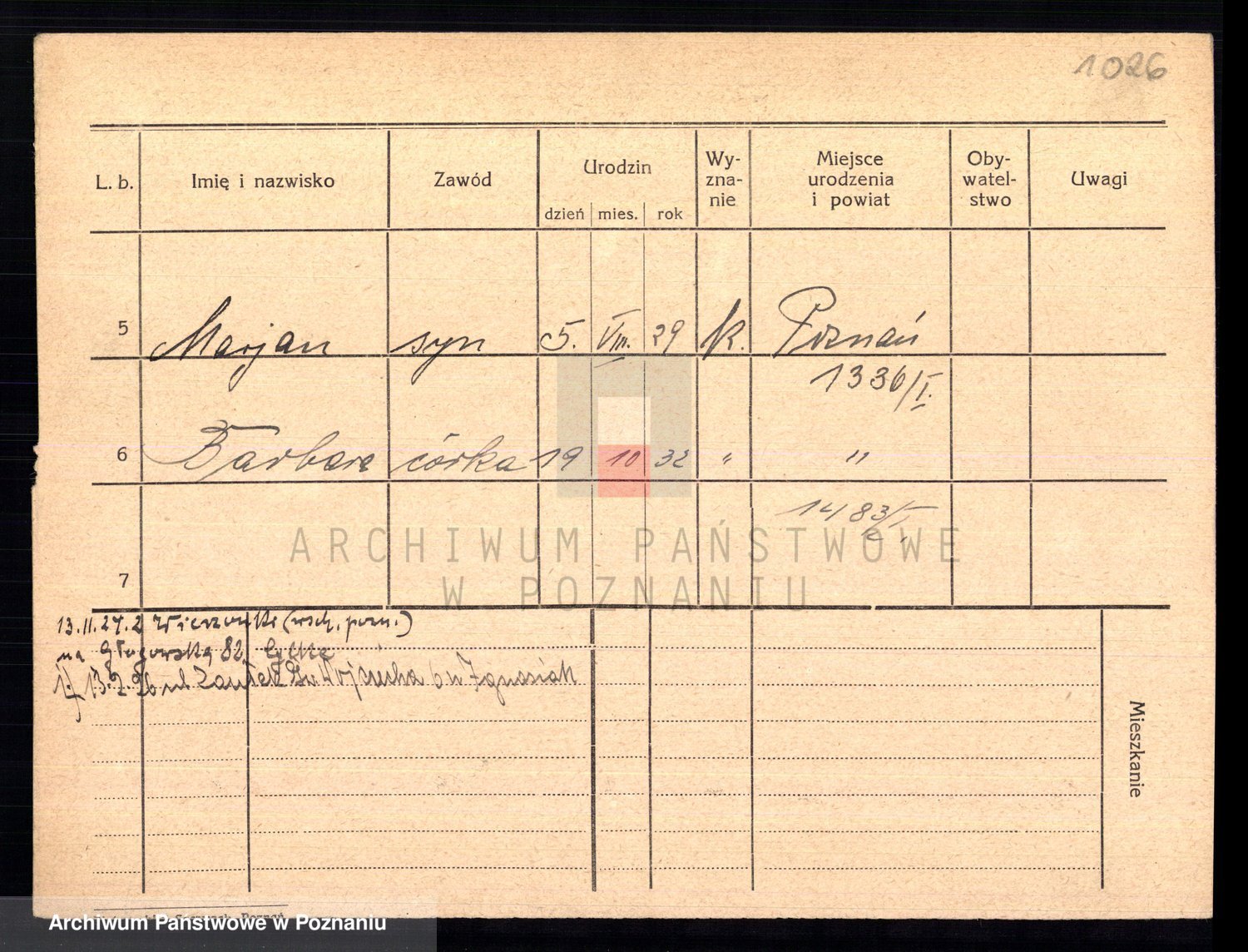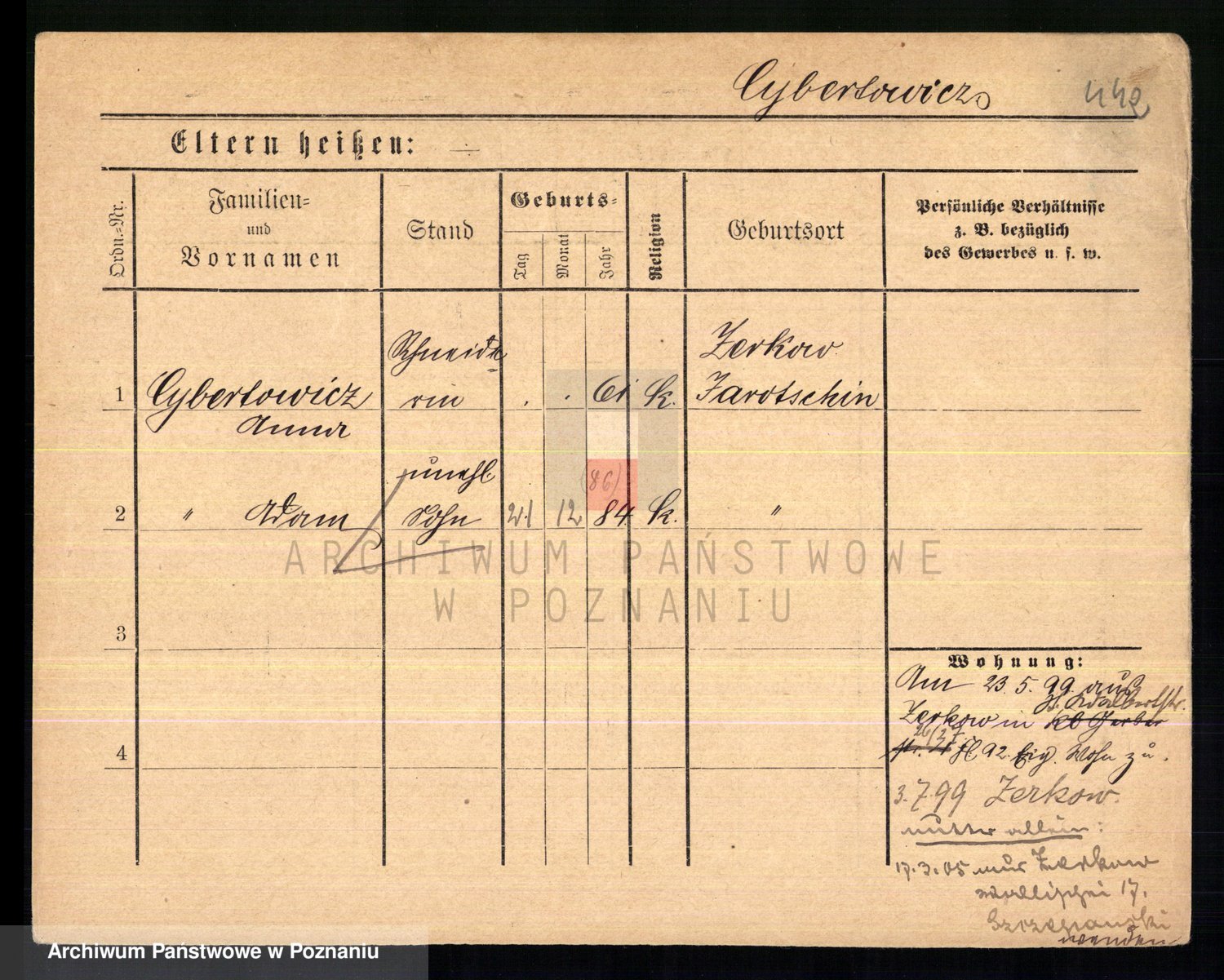 Podgląd karty osobowej dostępny jest po kliknięciu na nazwisko lub ikonkę karty. Można dokonywać powiększenia (ikony na górze) lub przechodzić między kolejnymi skanami (strzałki po bokach).