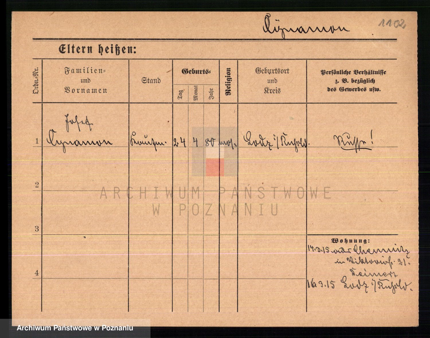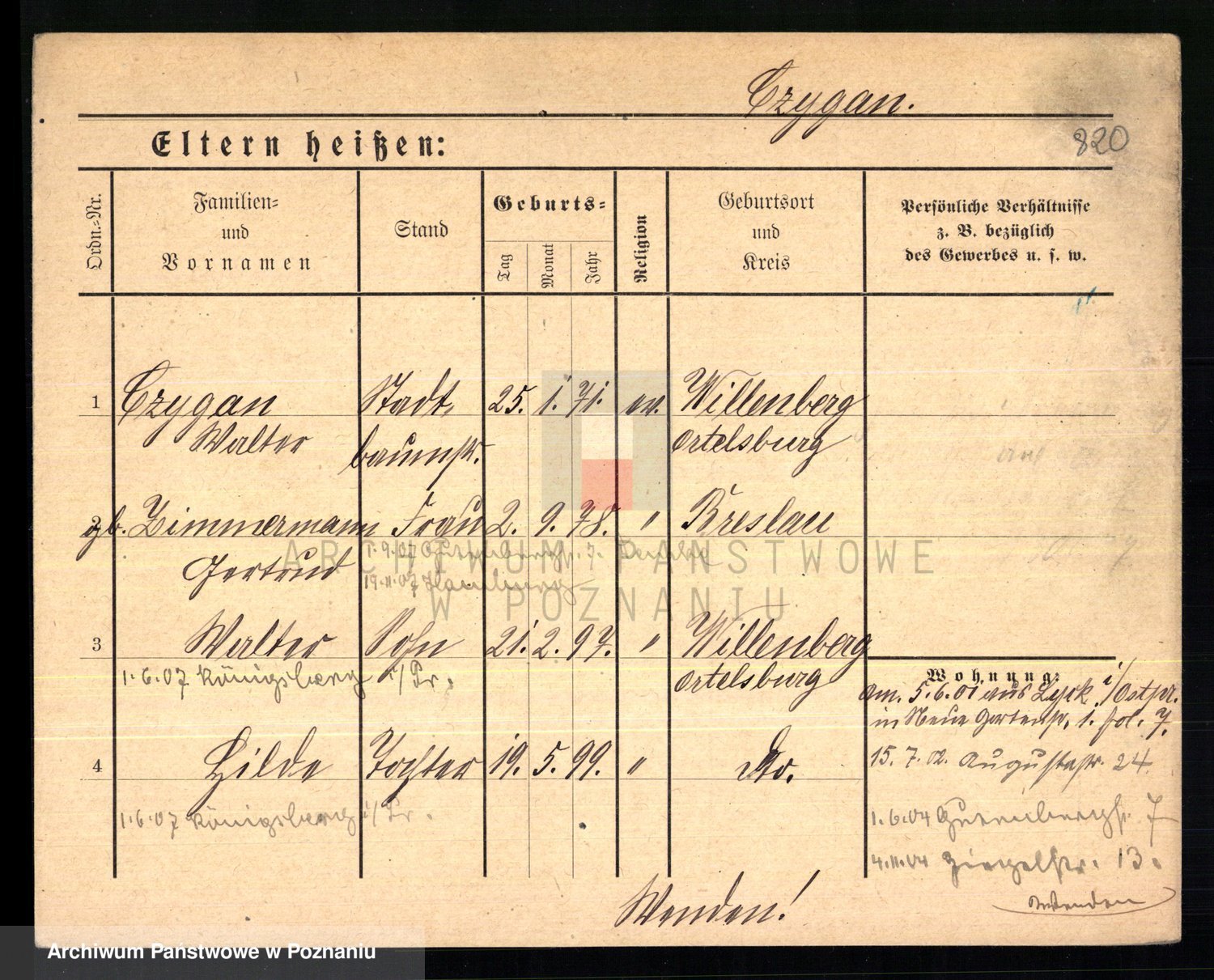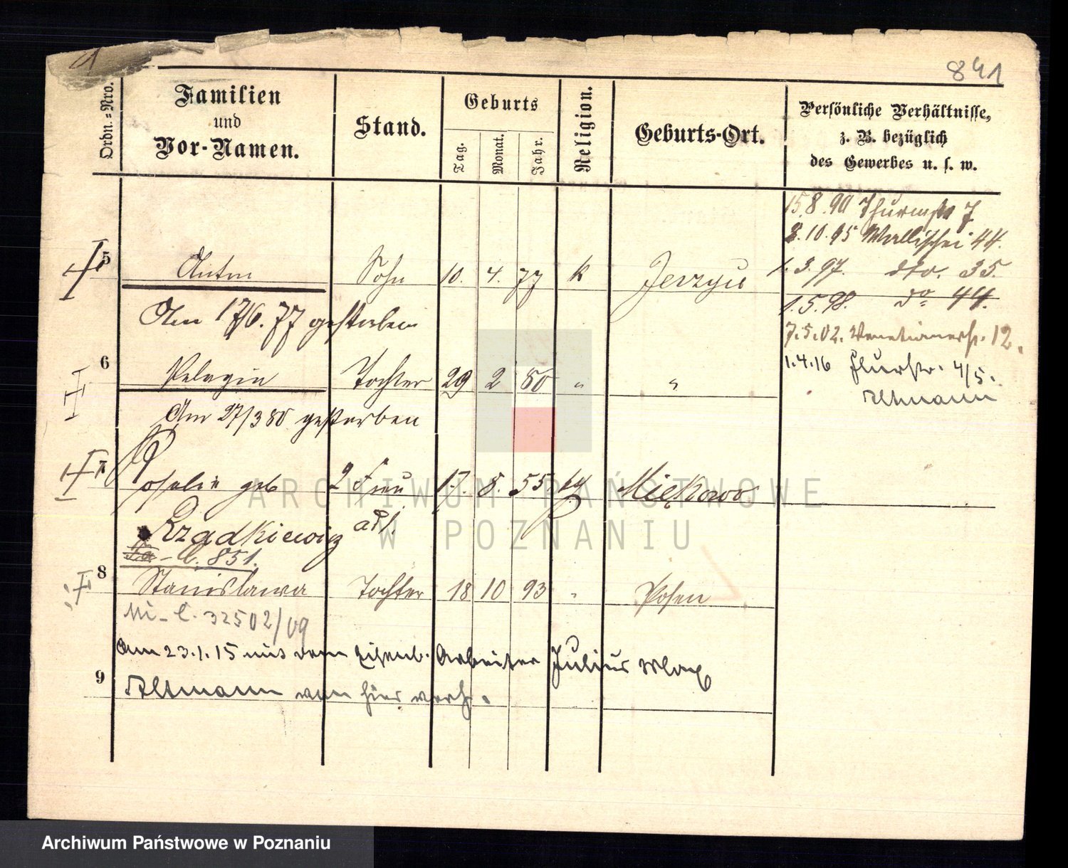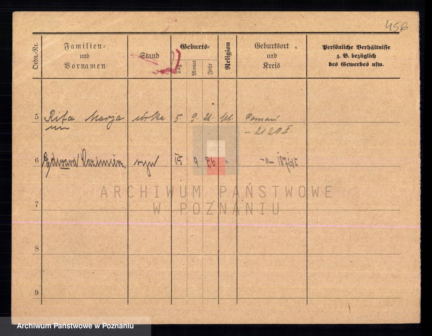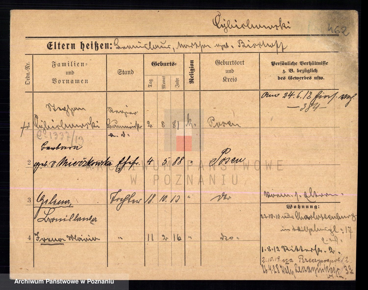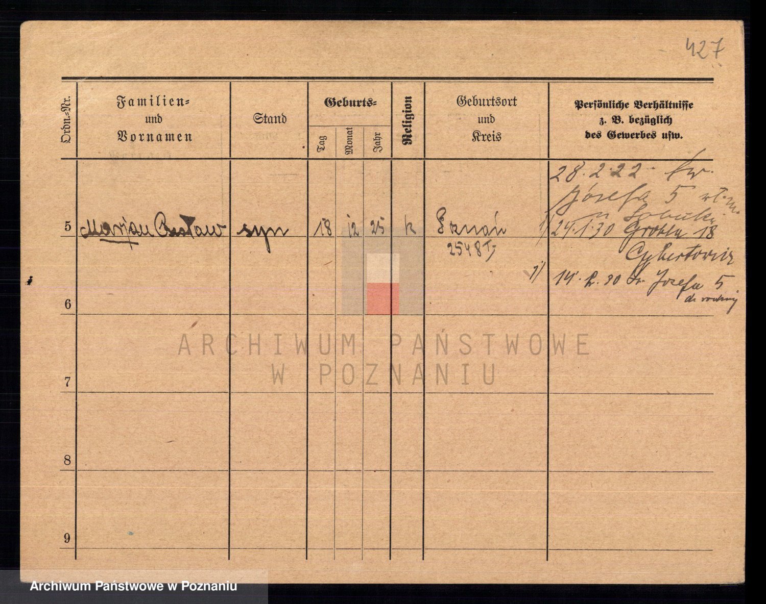 Podgląd karty osobowej dostępny jest po kliknięciu na nazwisko lub ikonkę karty. Można dokonywać powiększenia (ikony na górze) lub przechodzić między kolejnymi skanami (strzałki po bokach).
