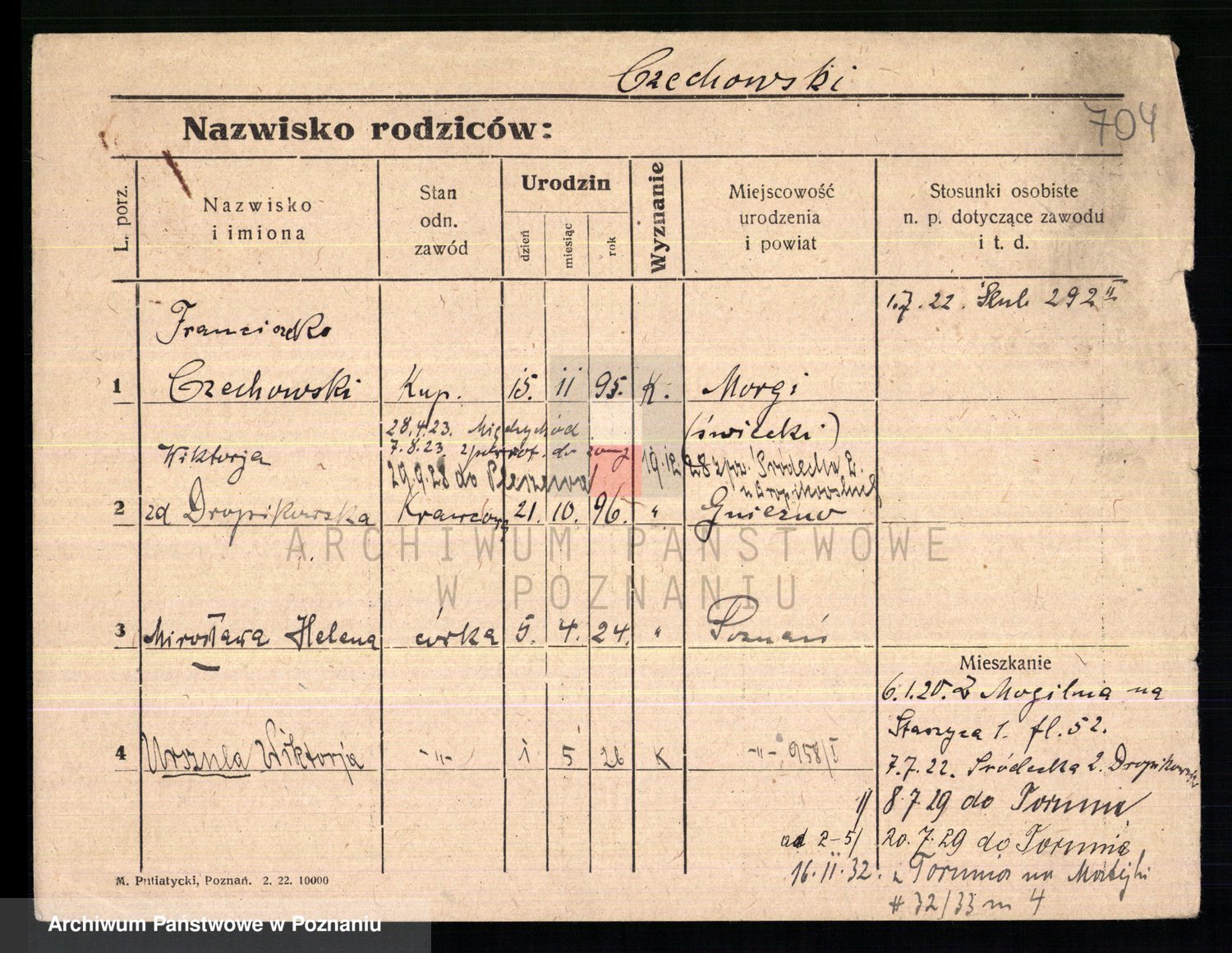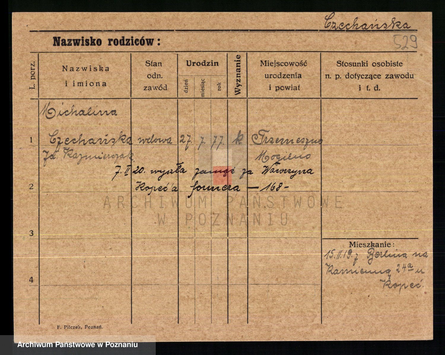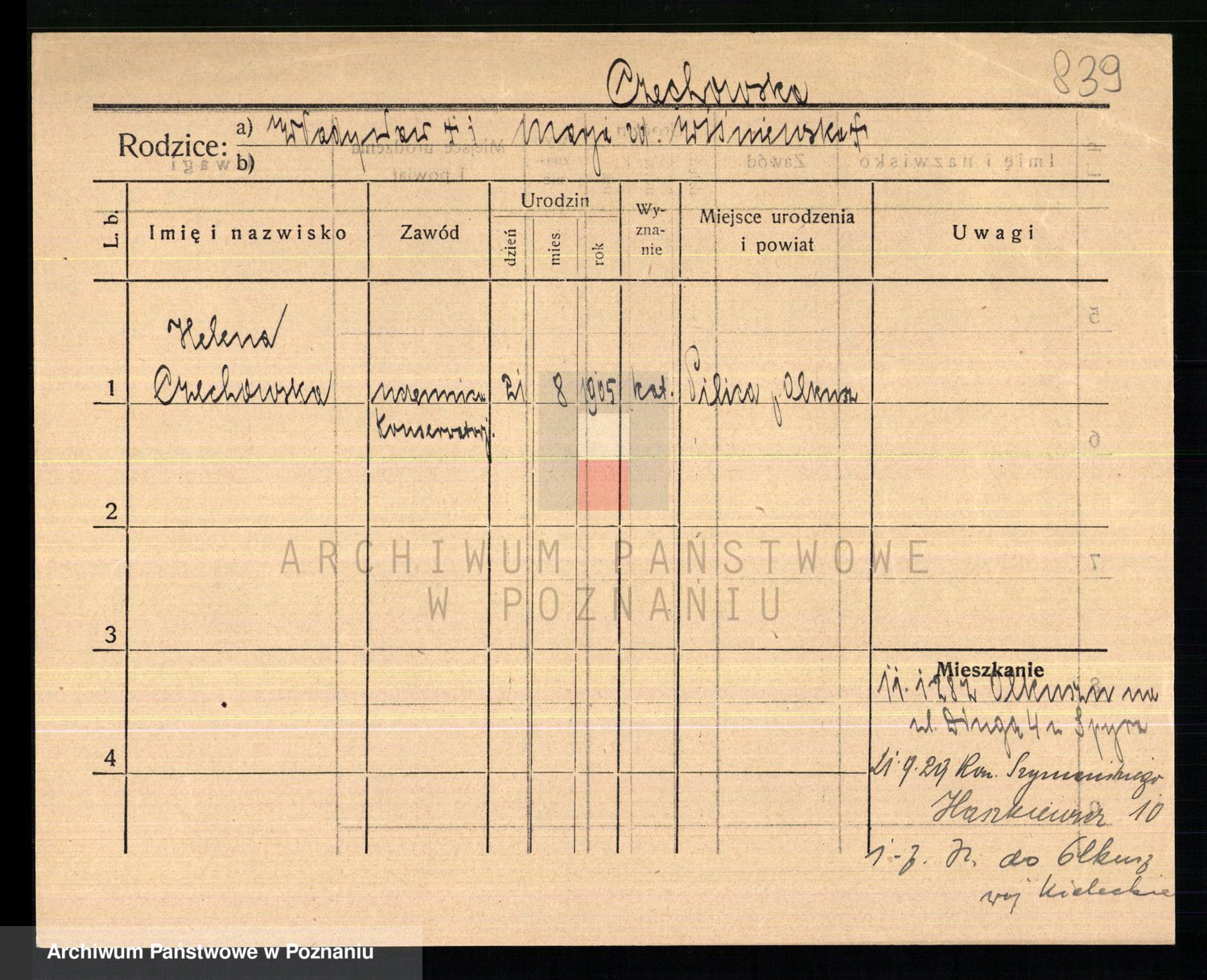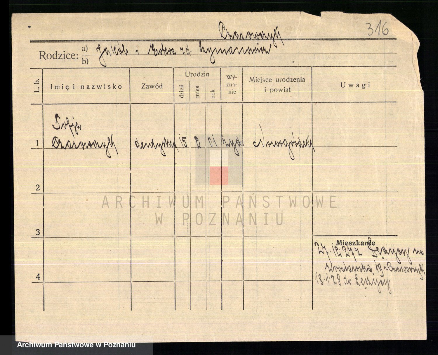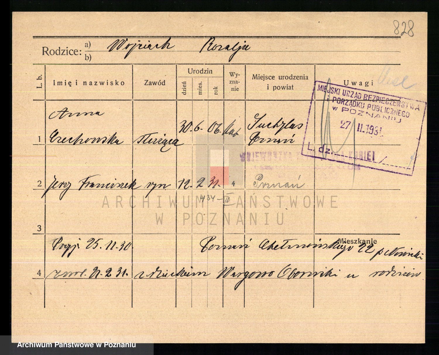 Podgląd karty osobowej dostępny jest po kliknięciu na nazwisko lub ikonkę karty. Można dokonywać powiększenia (ikony na górze) lub przechodzić między kolejnymi skanami (strzałki po bokach).