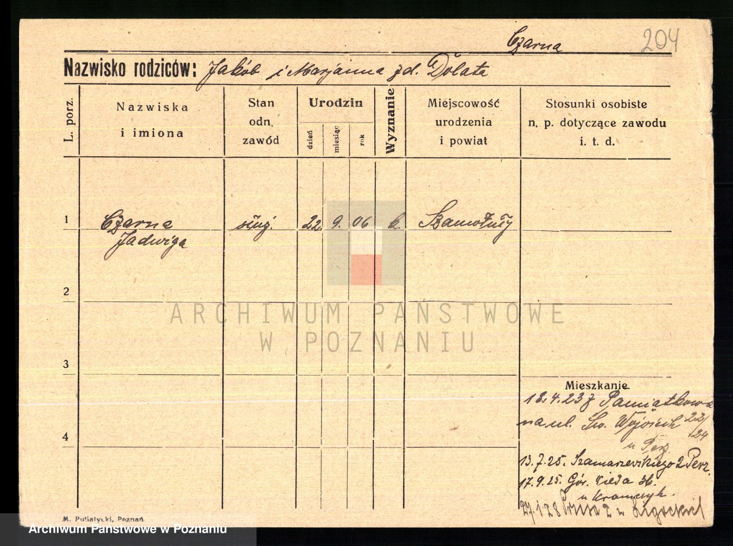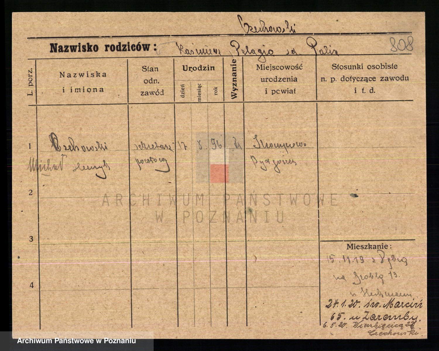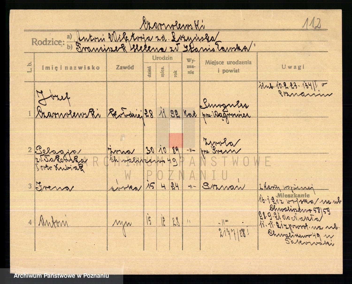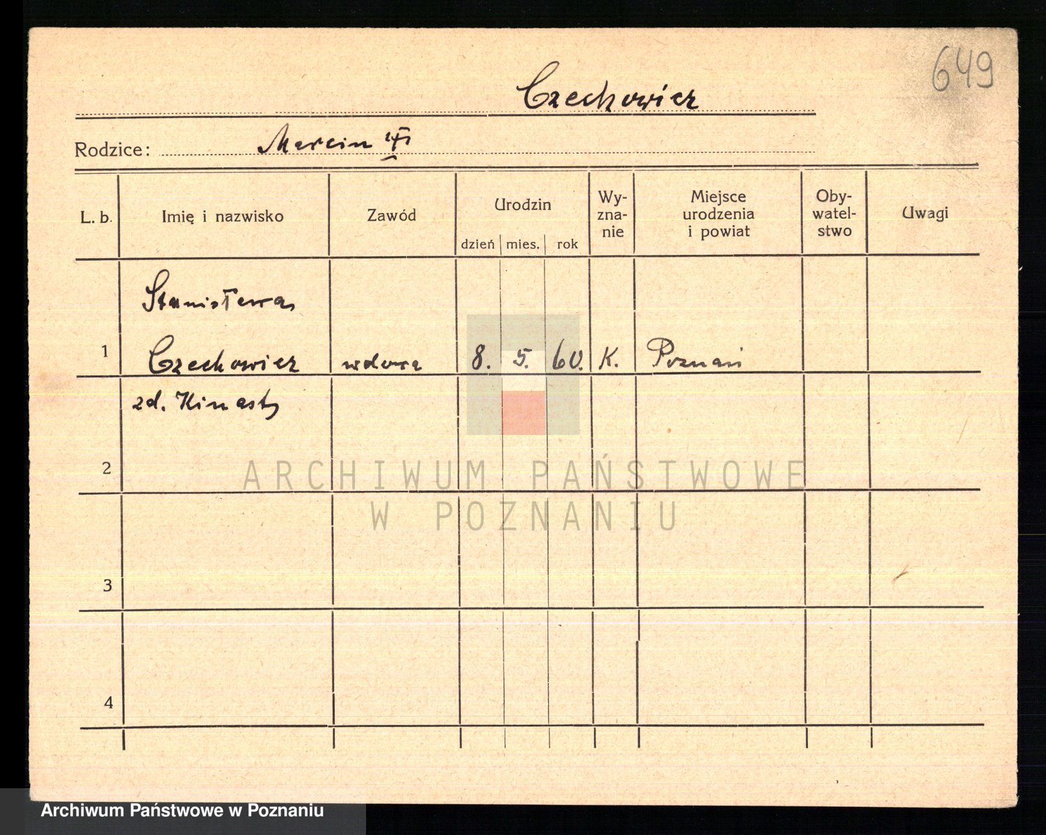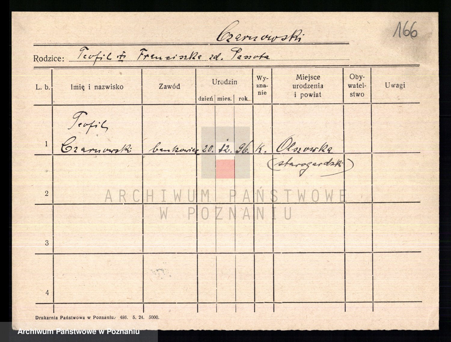 Podgląd karty osobowej dostępny jest po kliknięciu na nazwisko lub ikonkę karty. Można dokonywać powiększenia (ikony na górze) lub przechodzić między kolejnymi skanami (strzałki po bokach).