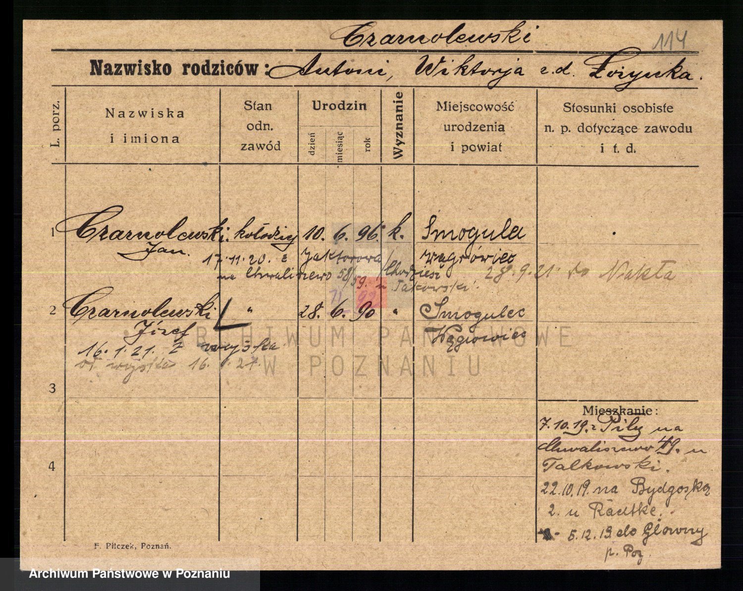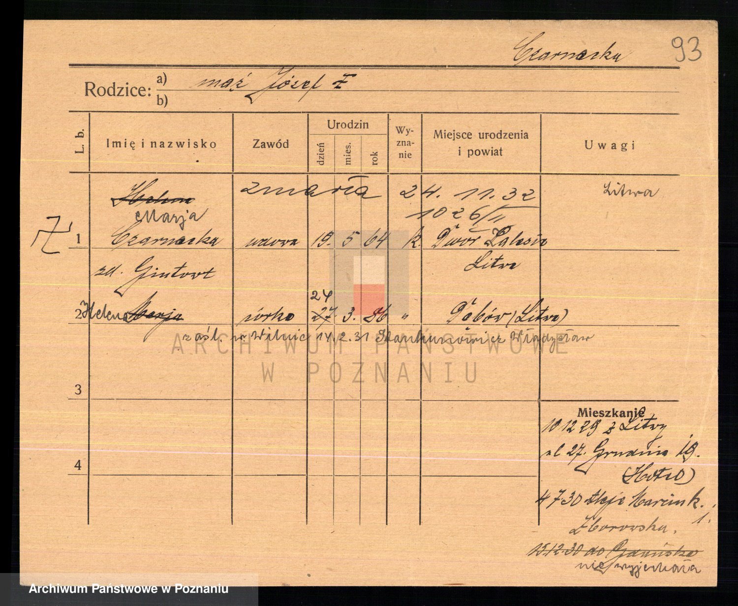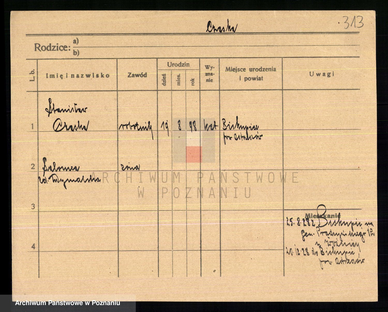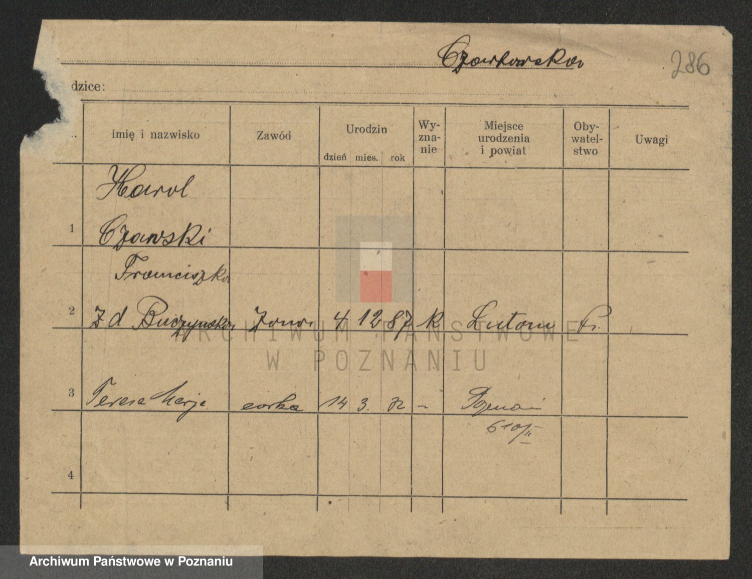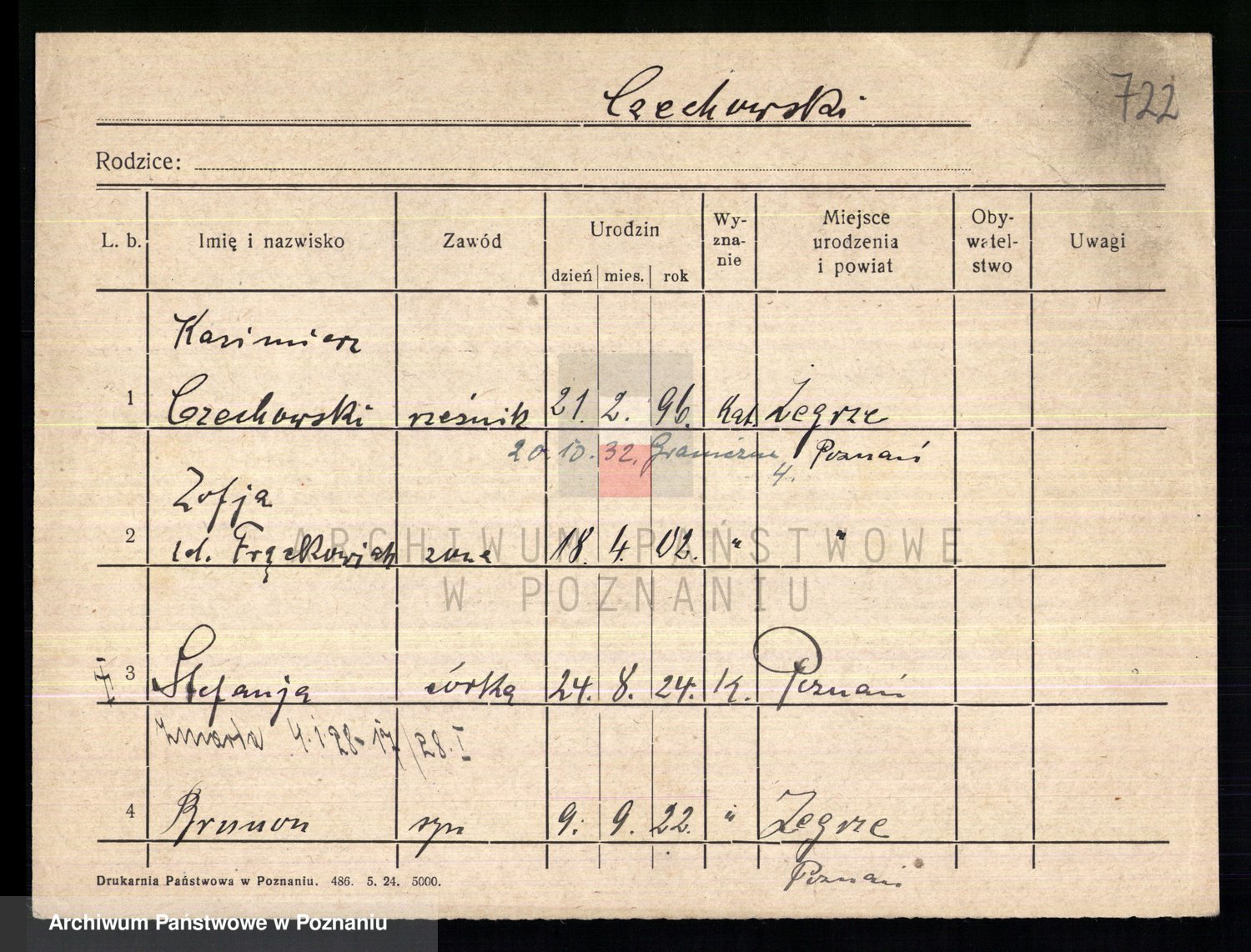 Podgląd karty osobowej dostępny jest po kliknięciu na nazwisko lub ikonkę karty. Można dokonywać powiększenia (ikony na górze) lub przechodzić między kolejnymi skanami (strzałki po bokach).