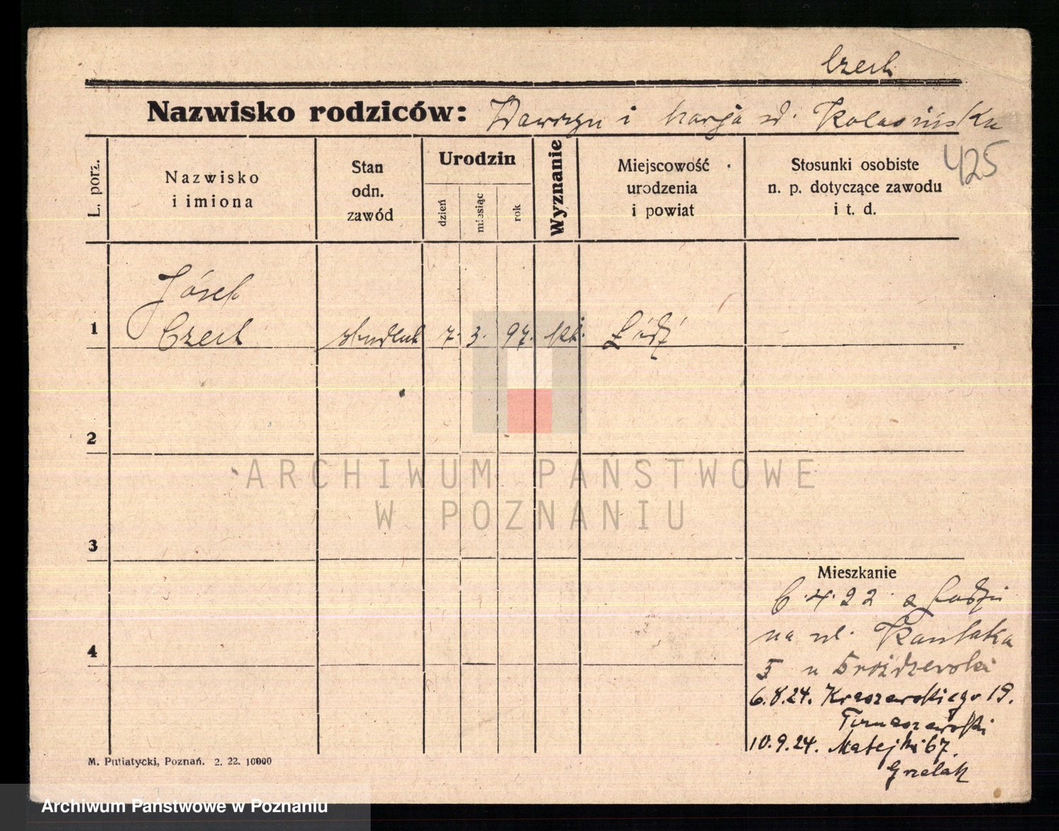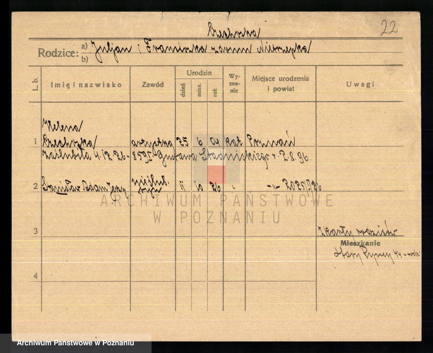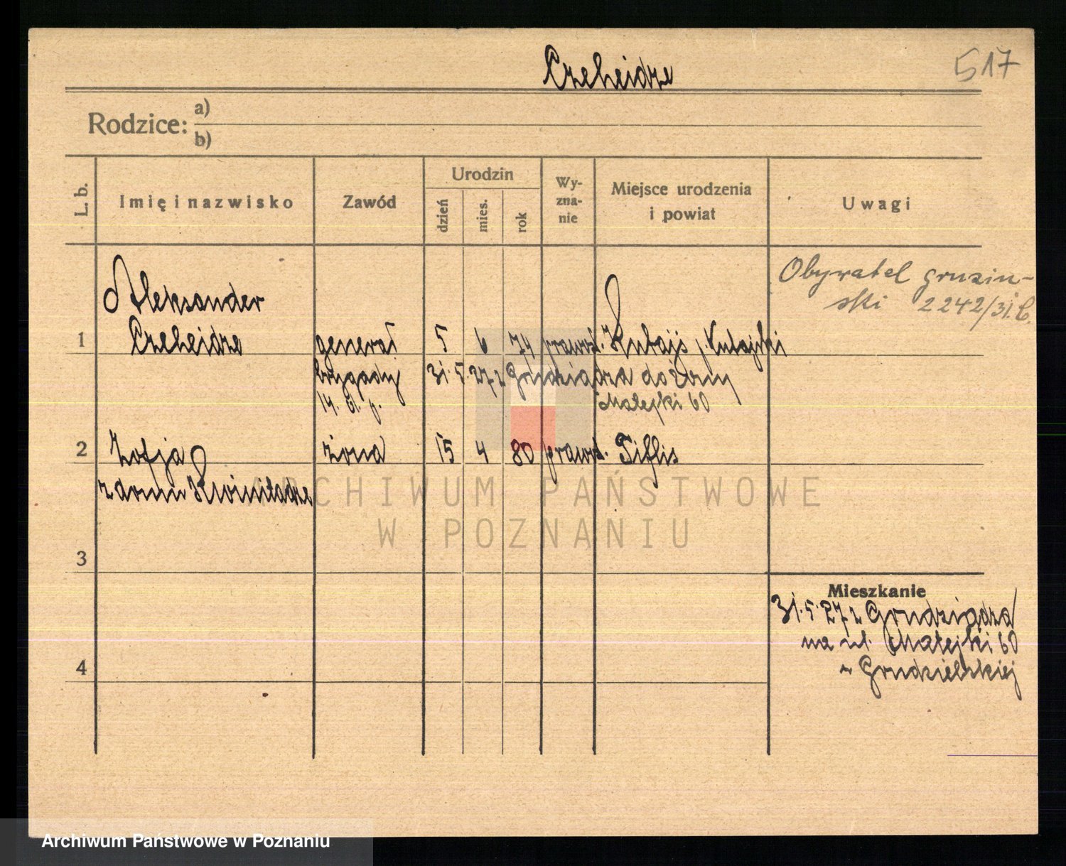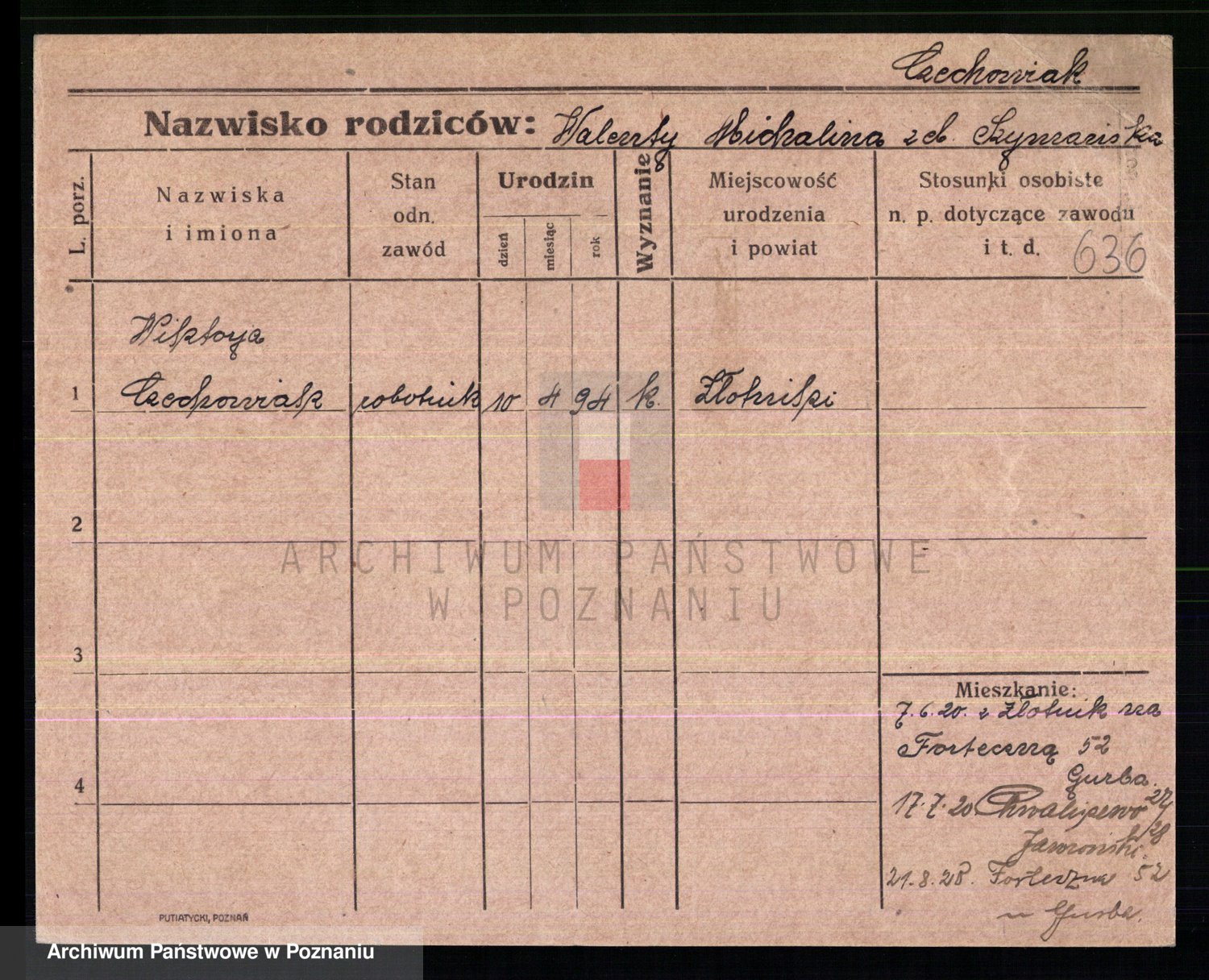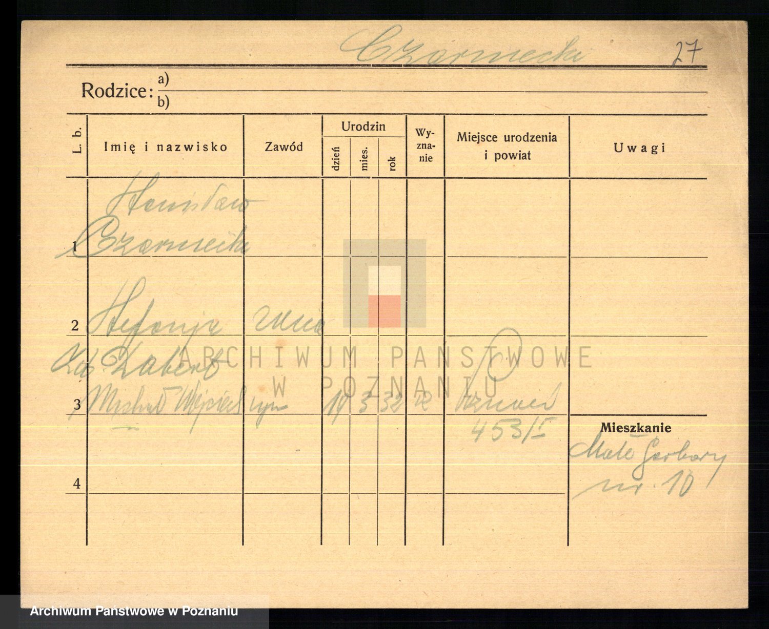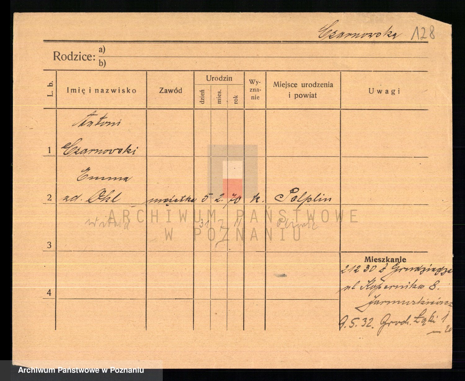 Podgląd karty osobowej dostępny jest po kliknięciu na nazwisko lub ikonkę karty. Można dokonywać powiększenia (ikony na górze) lub przechodzić między kolejnymi skanami (strzałki po bokach).