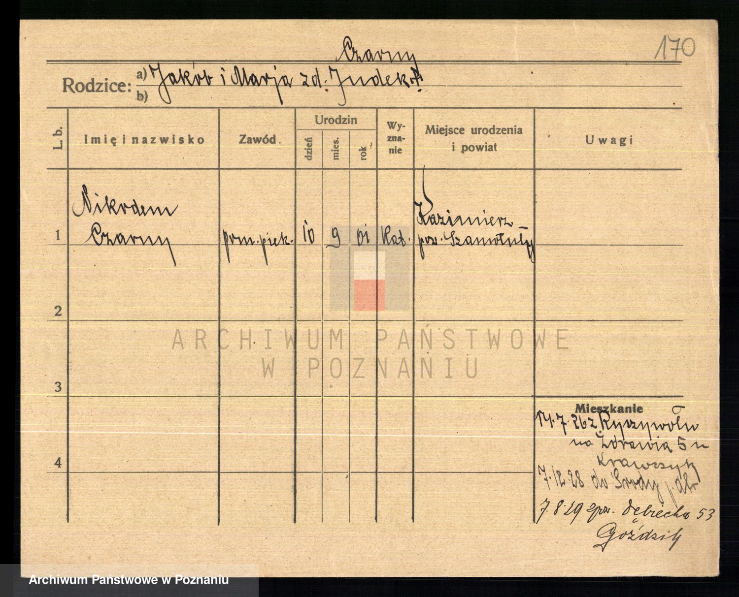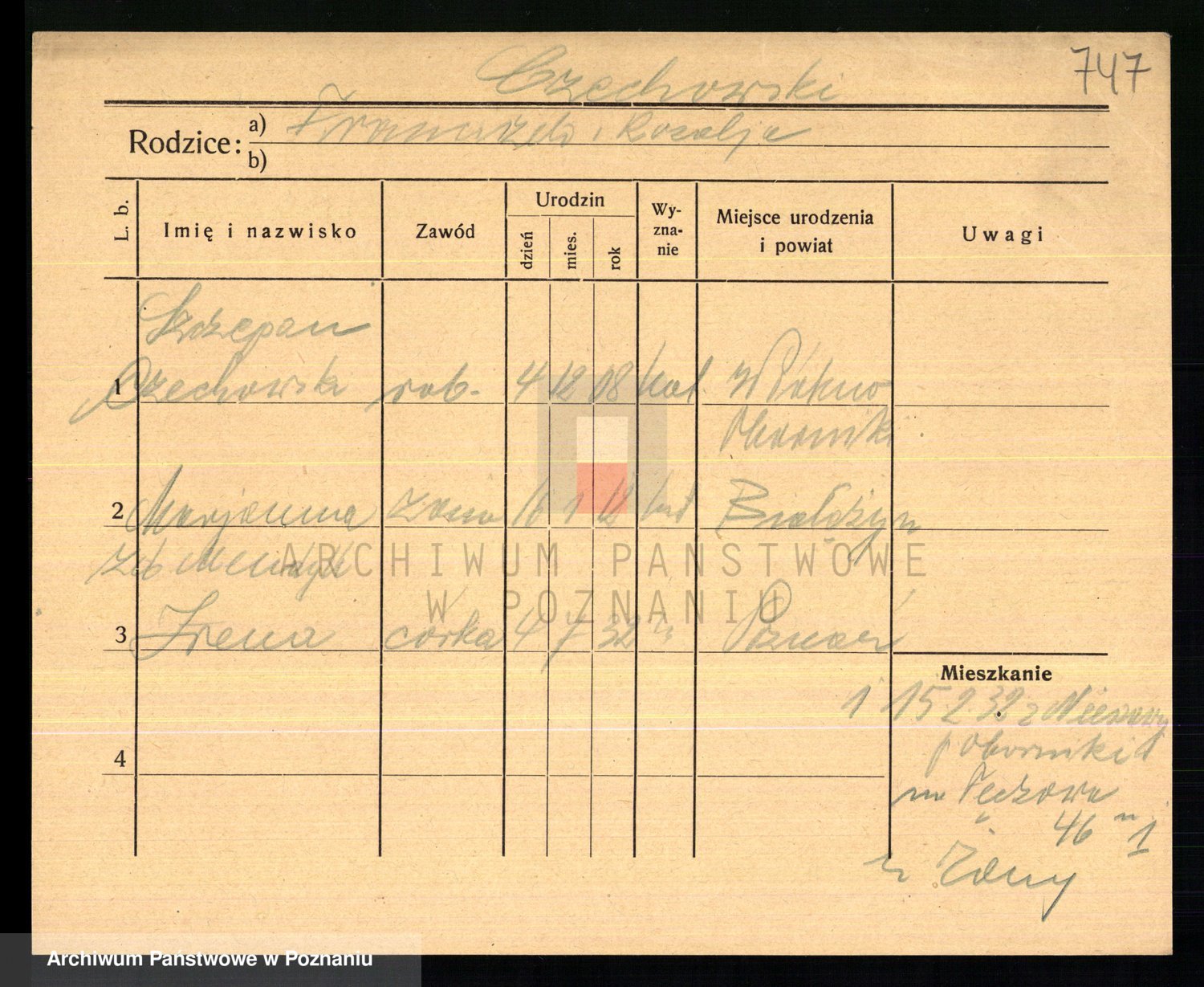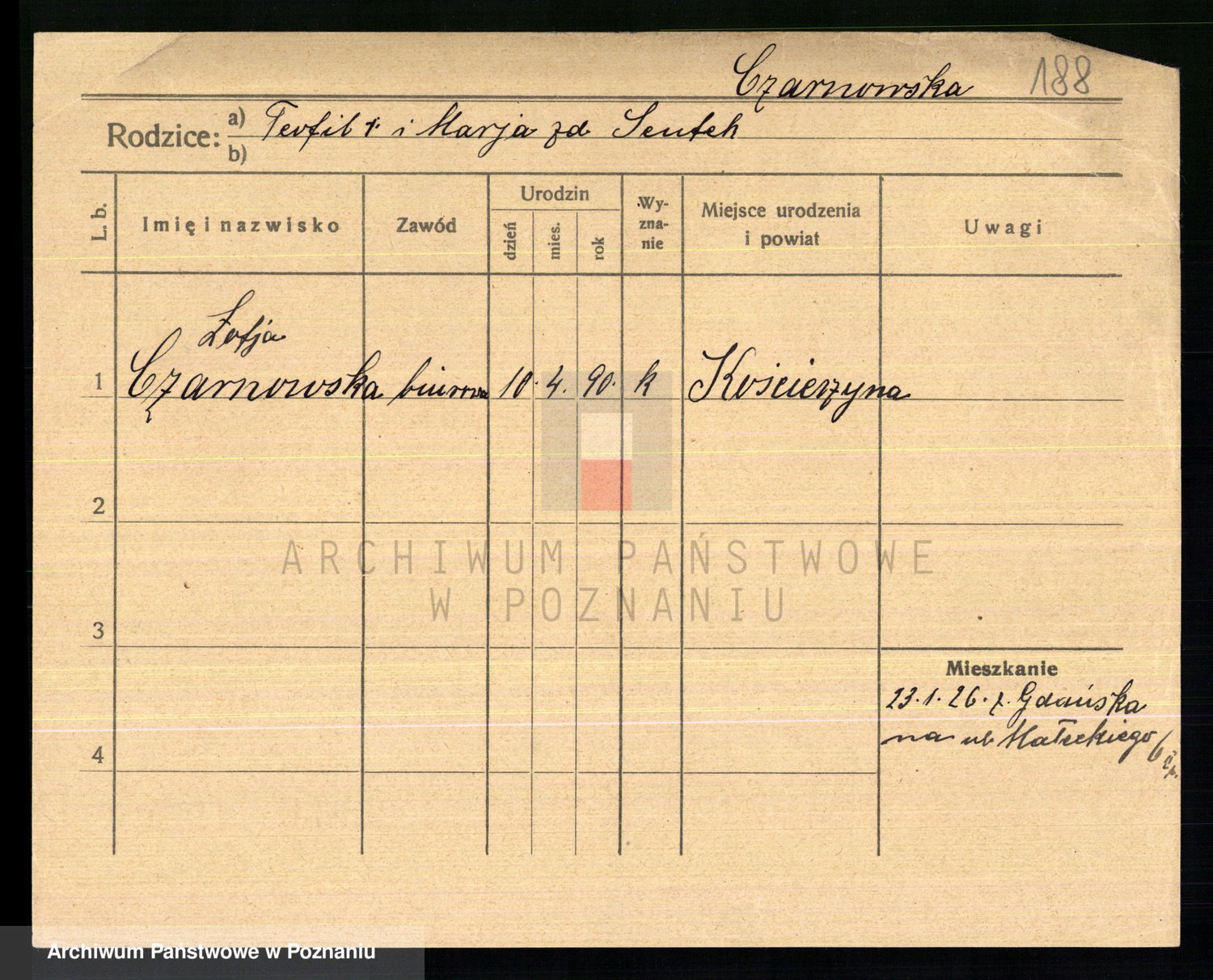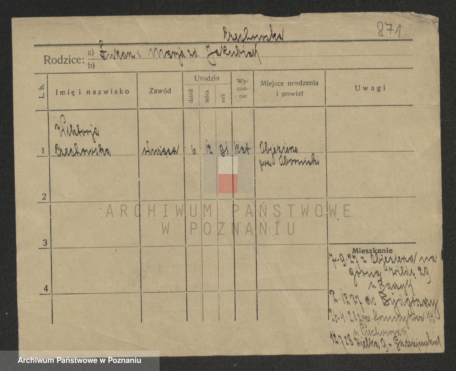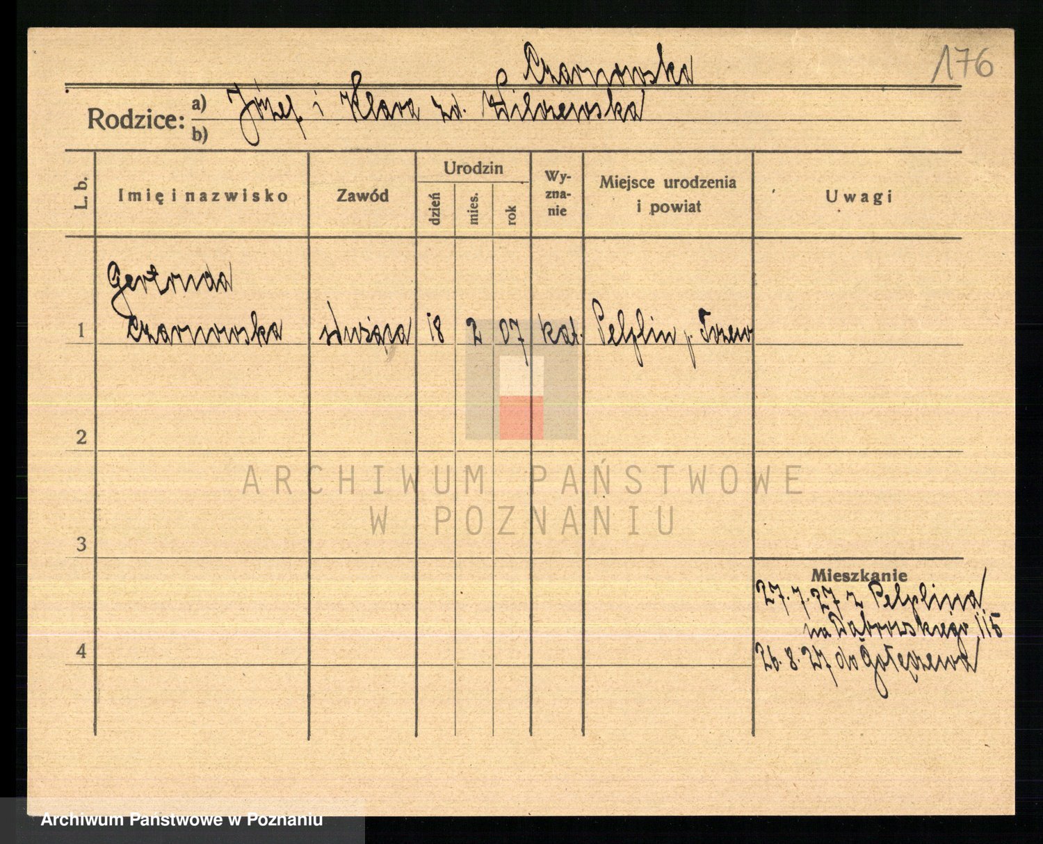 Podgląd karty osobowej dostępny jest po kliknięciu na nazwisko lub ikonkę karty. Można dokonywać powiększenia (ikony na górze) lub przechodzić między kolejnymi skanami (strzałki po bokach).