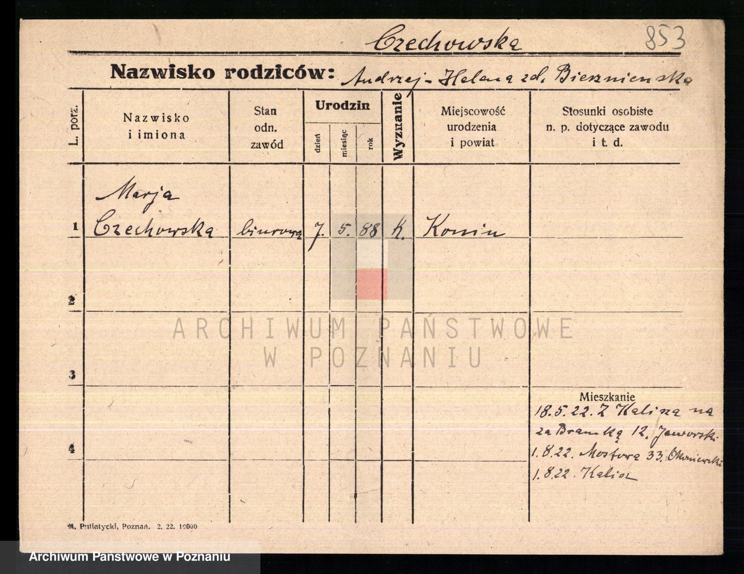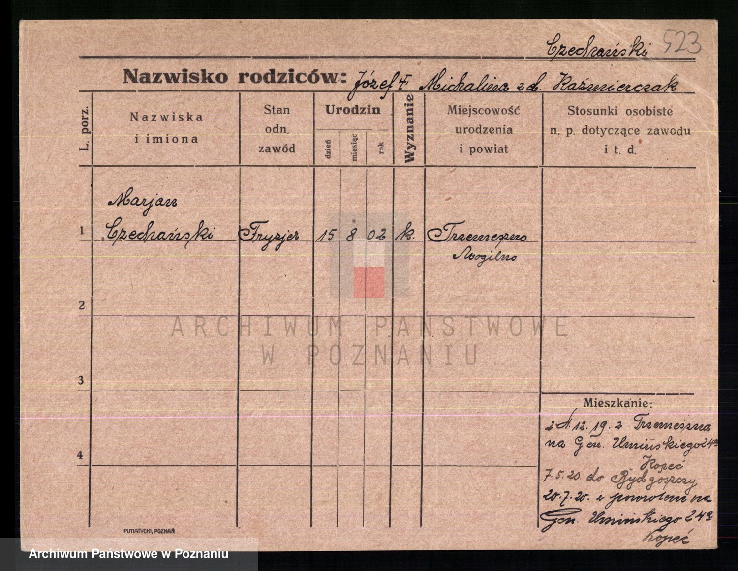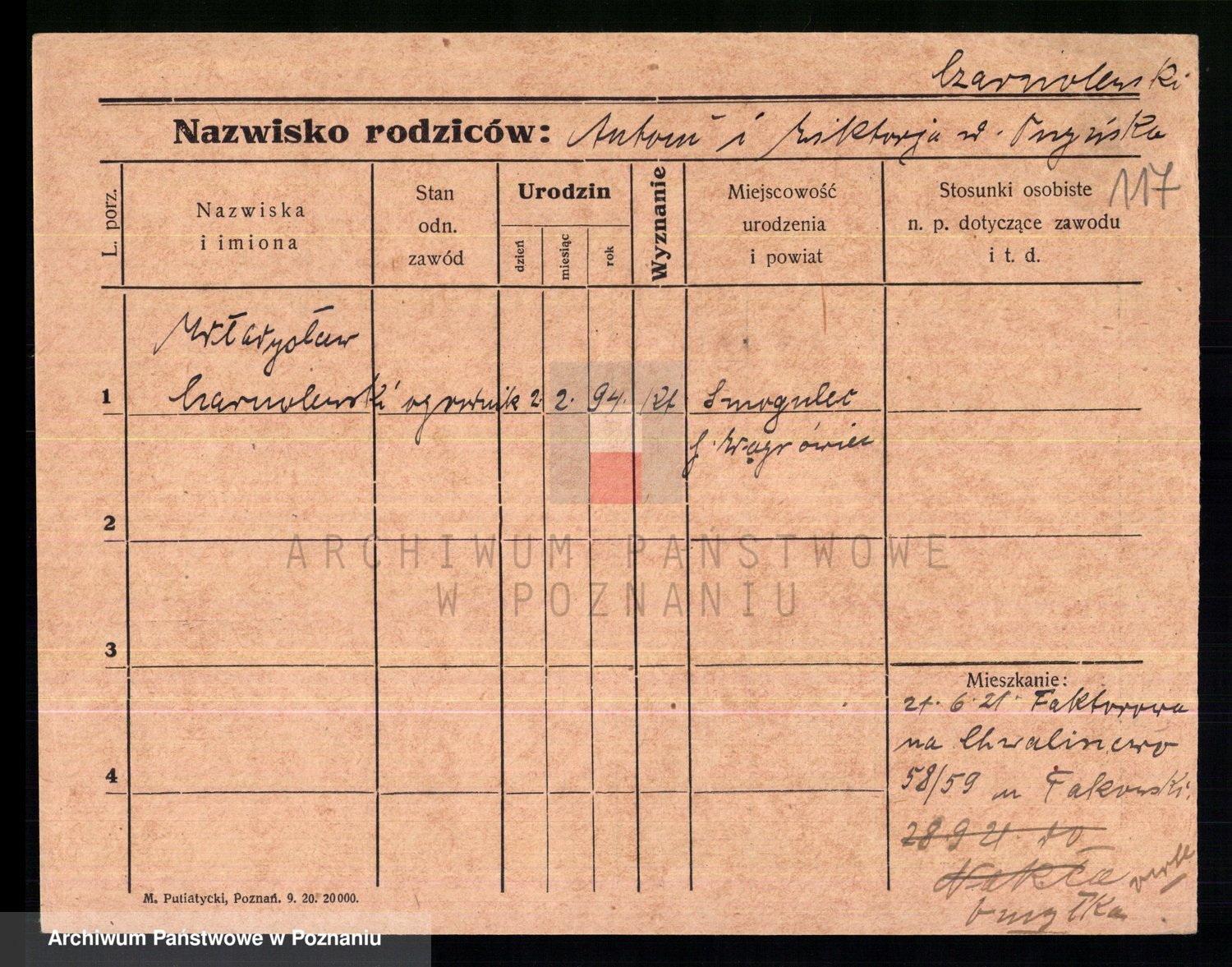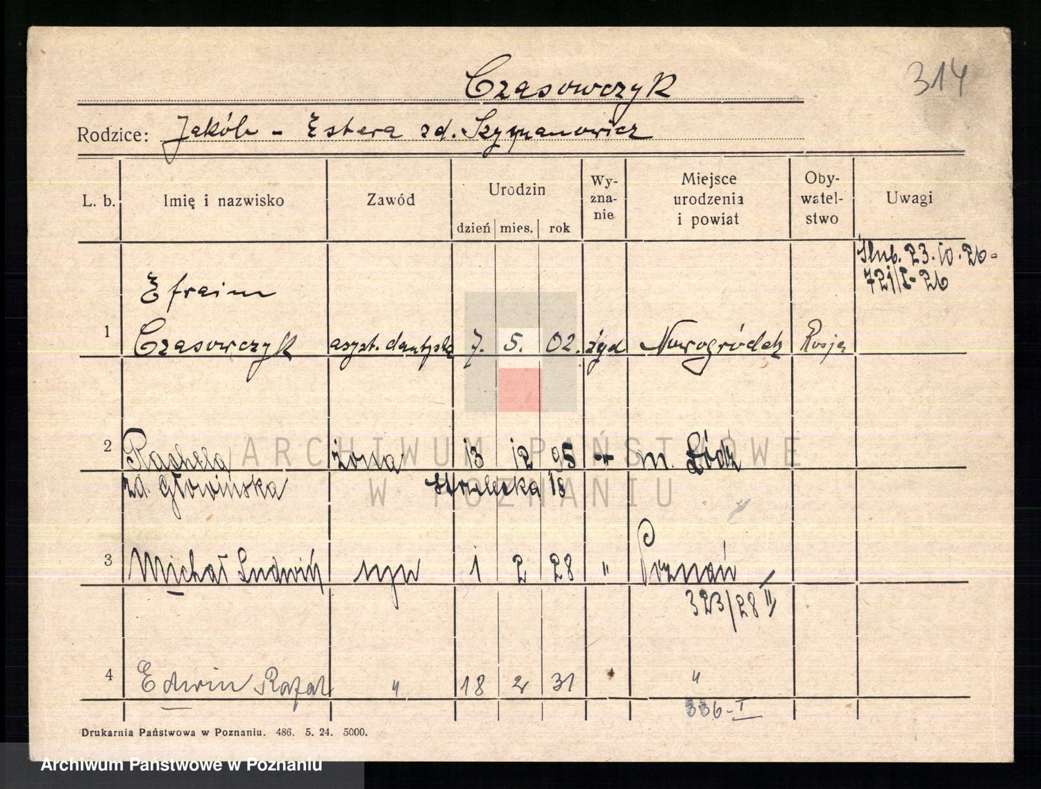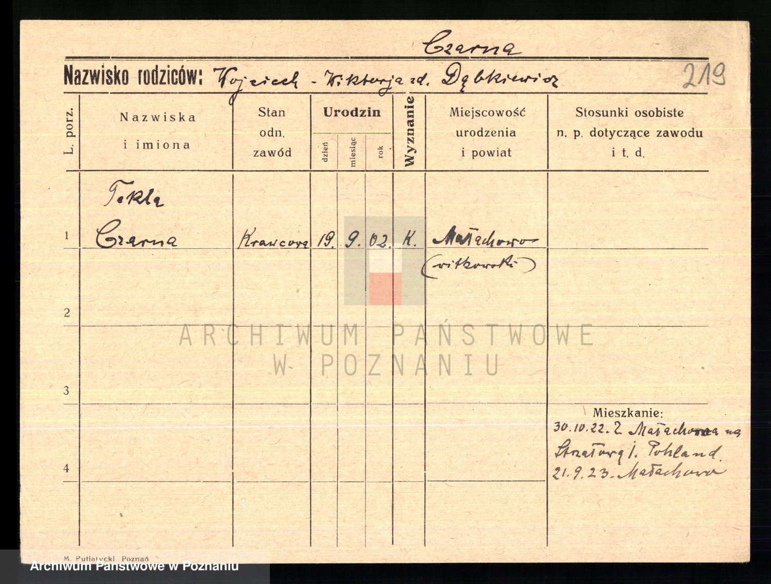 Podgląd karty osobowej dostępny jest po kliknięciu na nazwisko lub ikonkę karty. Można dokonywać powiększenia (ikony na górze) lub przechodzić między kolejnymi skanami (strzałki po bokach).