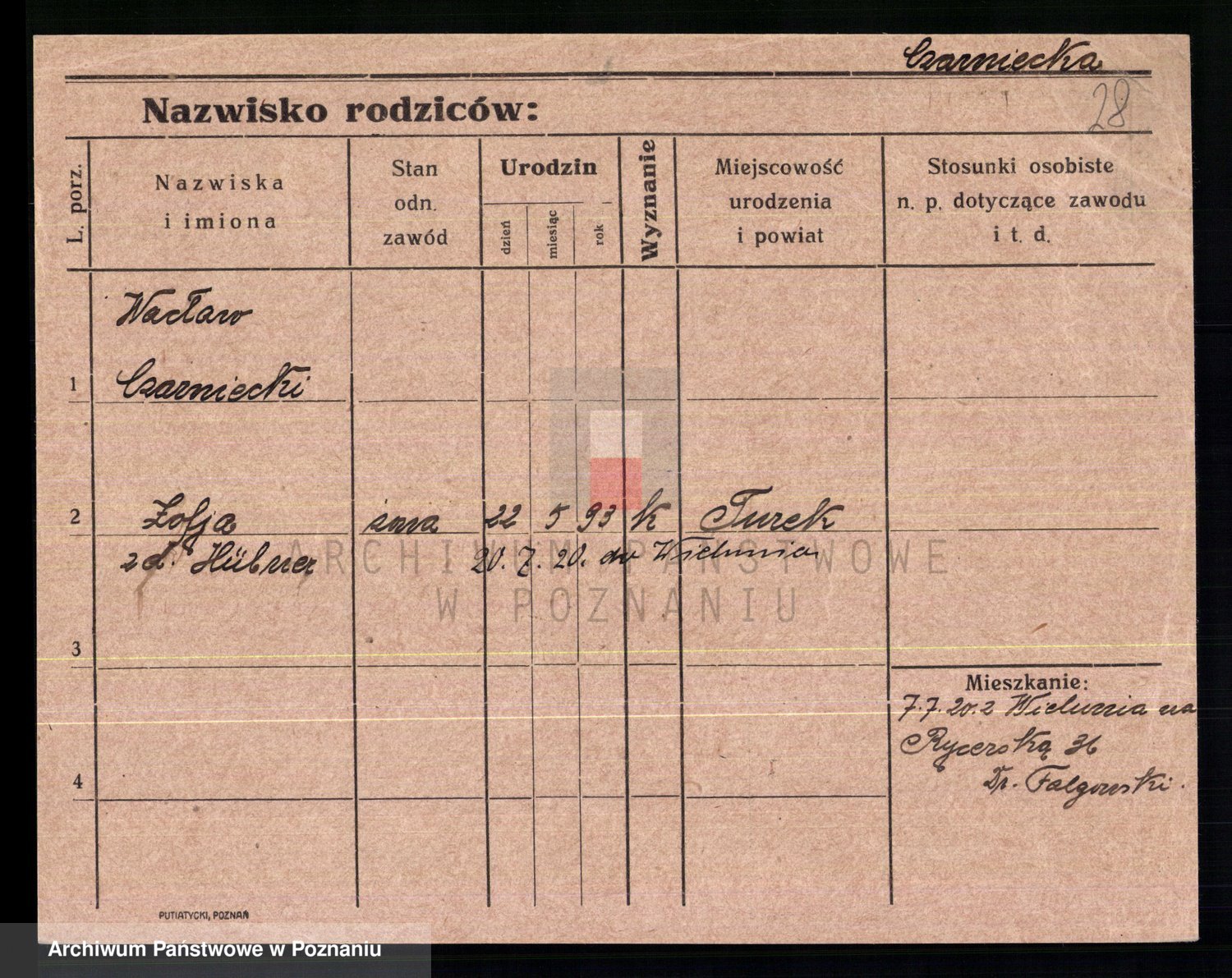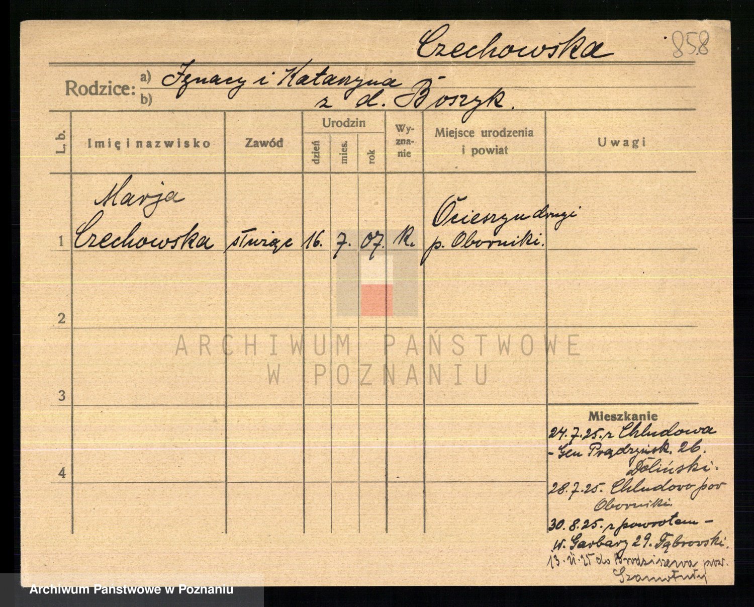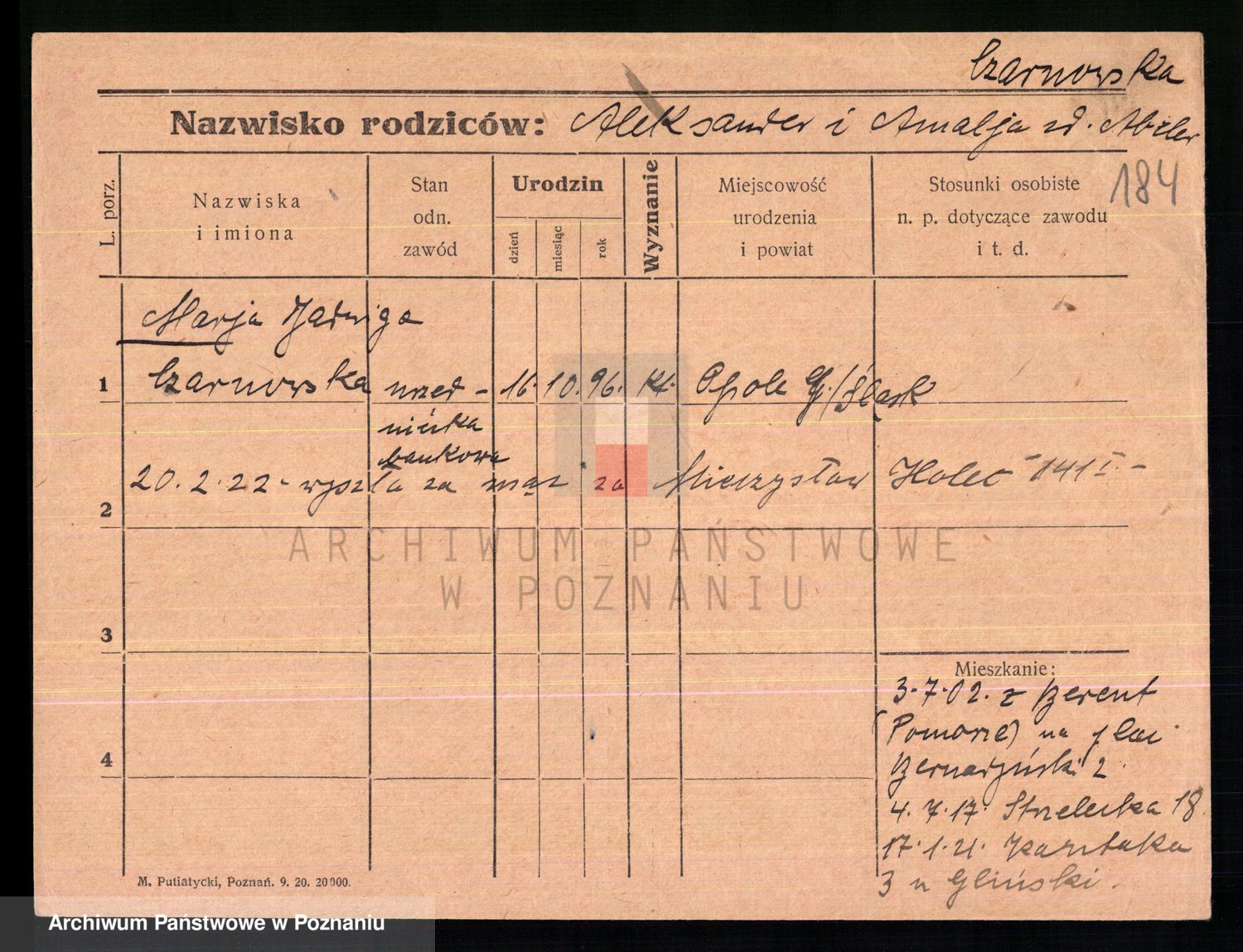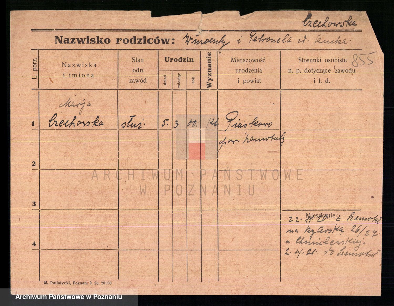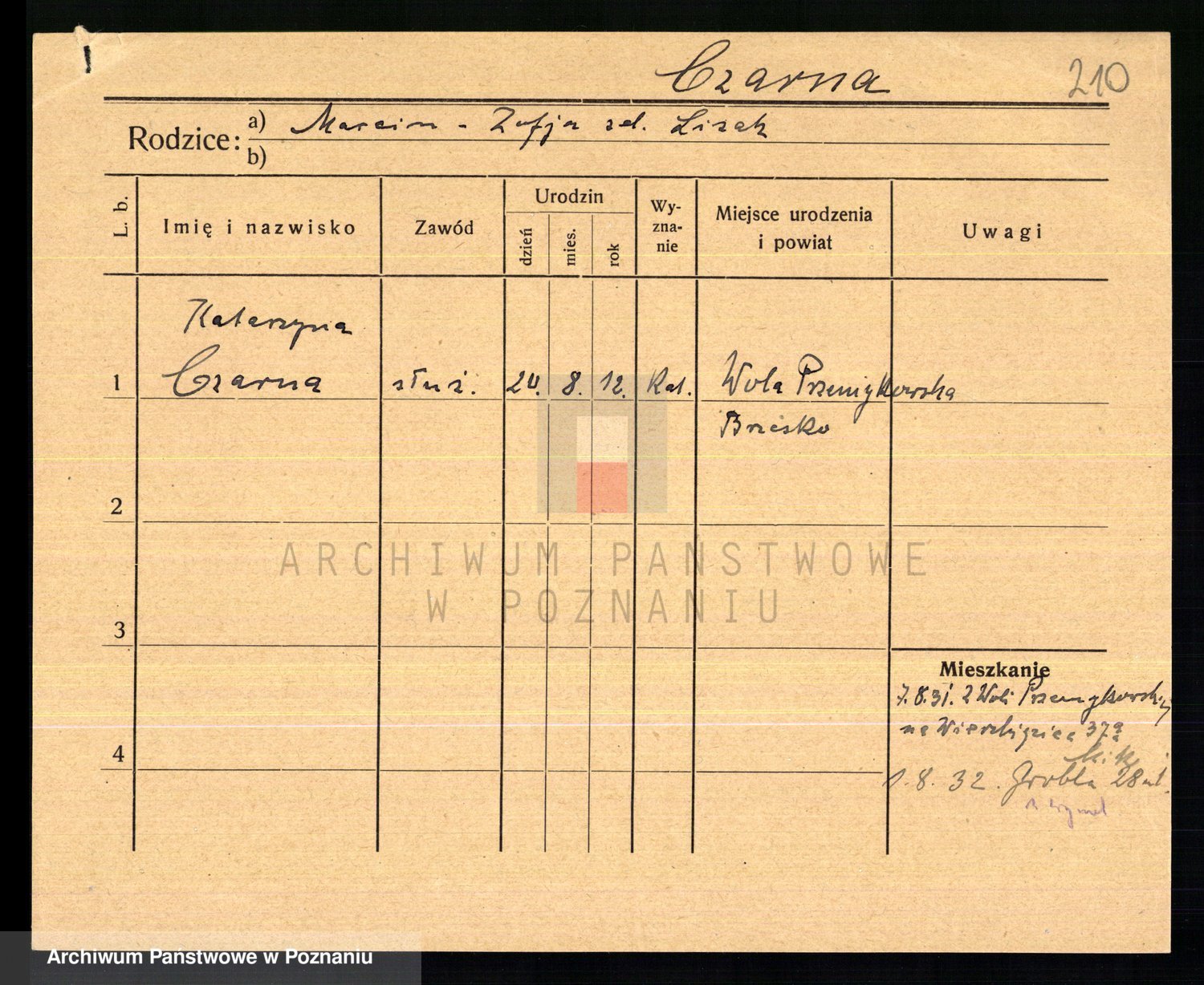 Podgląd karty osobowej dostępny jest po kliknięciu na nazwisko lub ikonkę karty. Można dokonywać powiększenia (ikony na górze) lub przechodzić między kolejnymi skanami (strzałki po bokach).