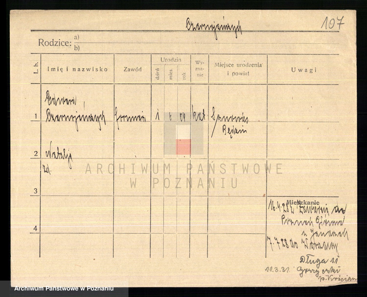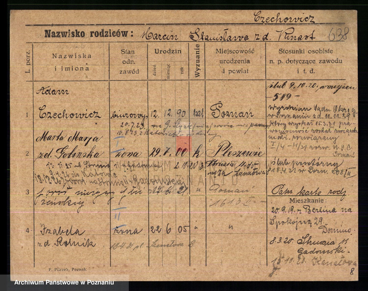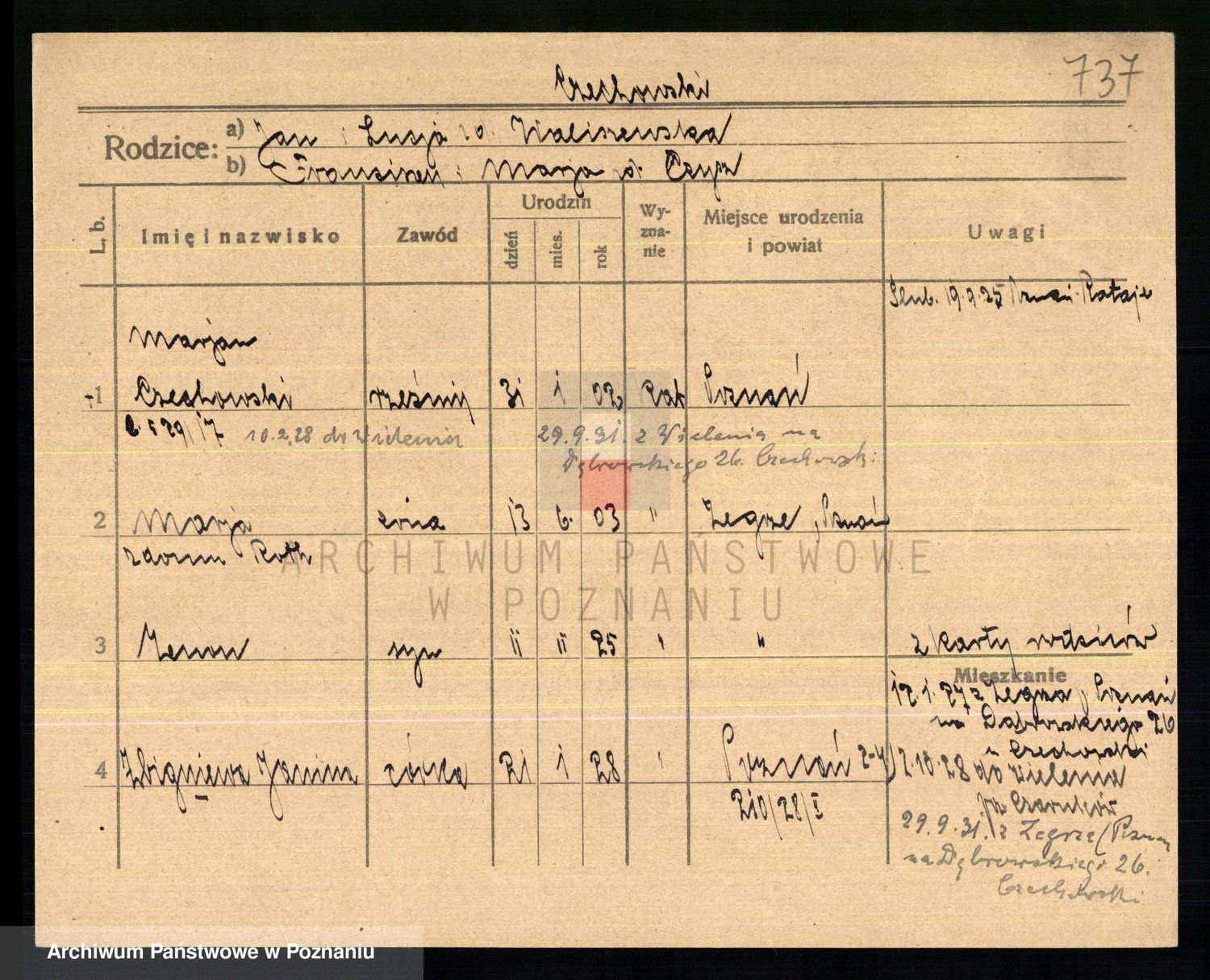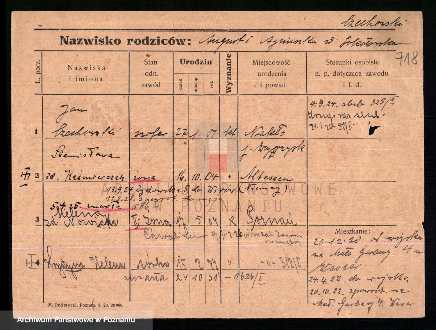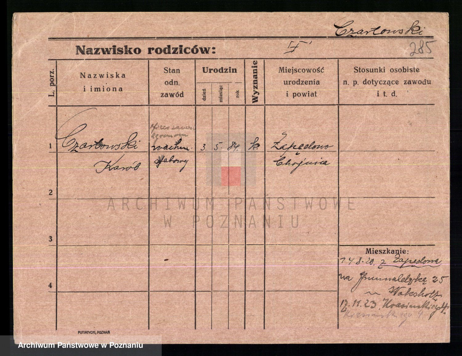 Podgląd karty osobowej dostępny jest po kliknięciu na nazwisko lub ikonkę karty. Można dokonywać powiększenia (ikony na górze) lub przechodzić między kolejnymi skanami (strzałki po bokach).