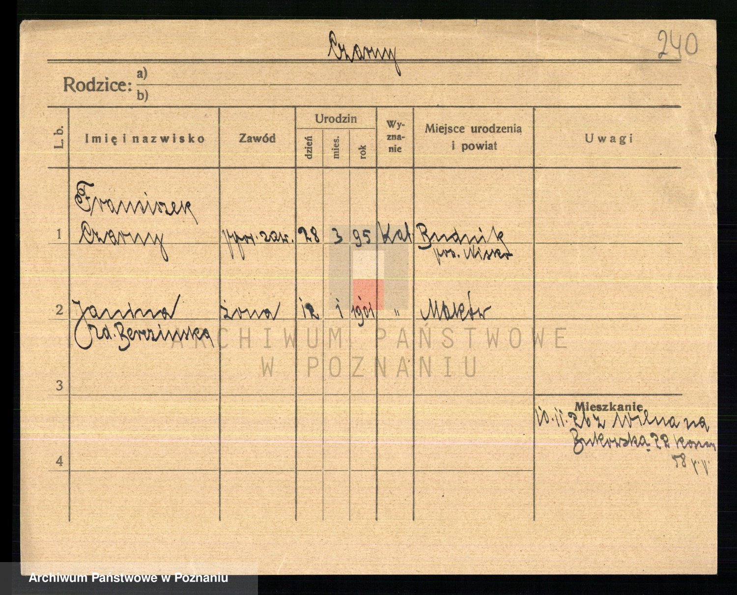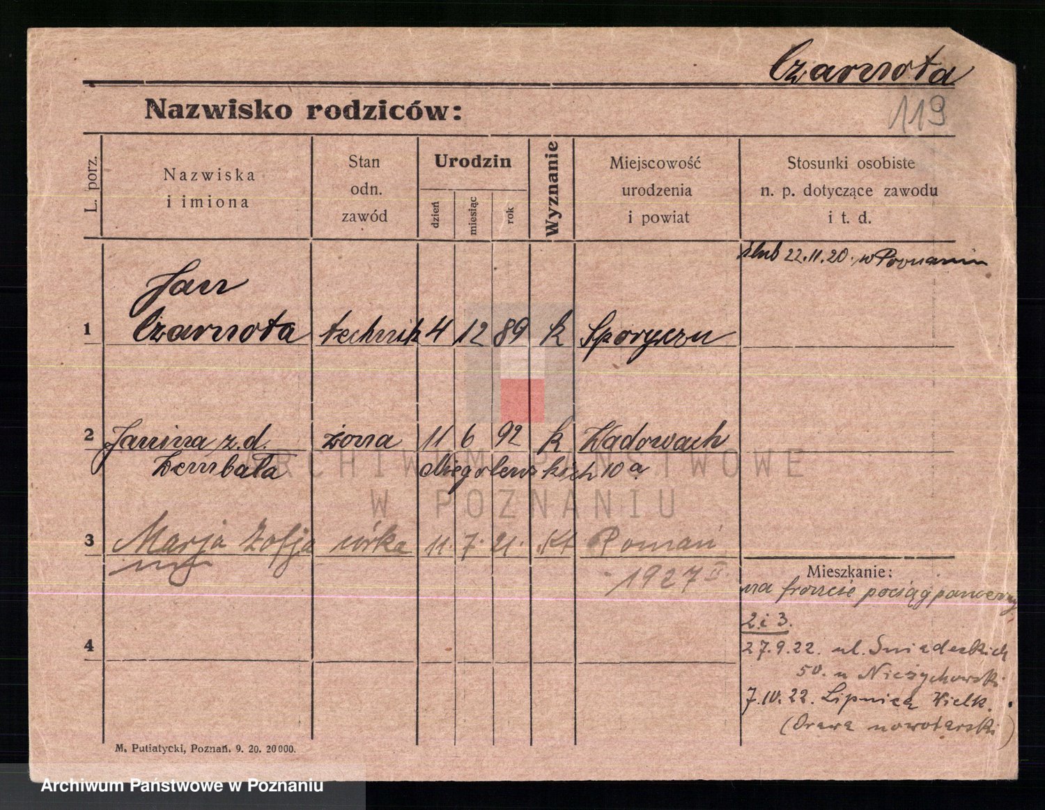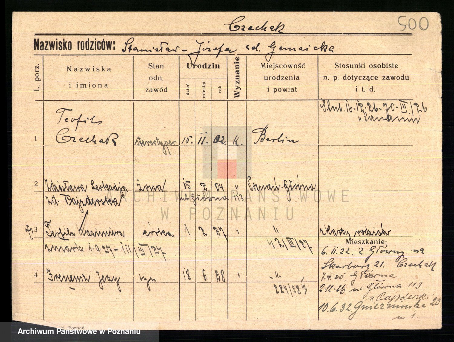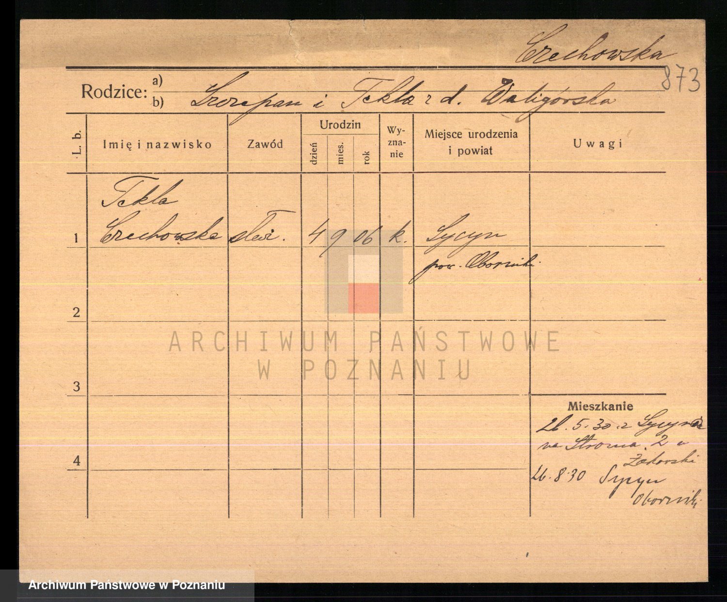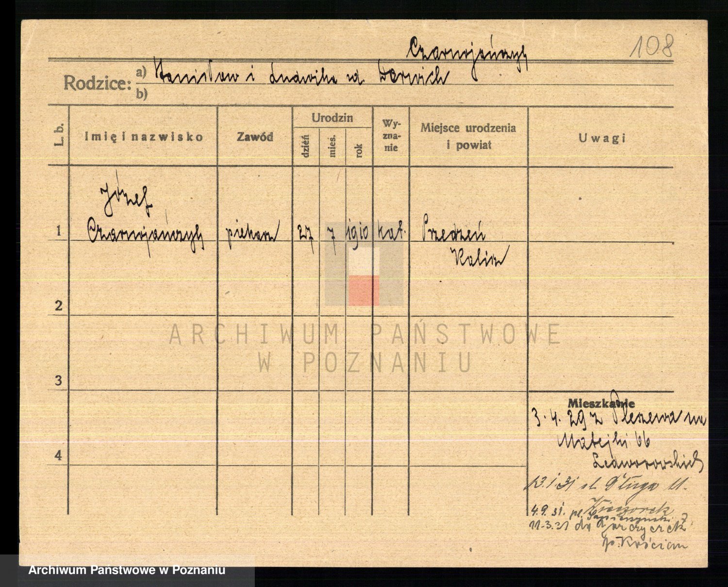 Podgląd karty osobowej dostępny jest po kliknięciu na nazwisko lub ikonkę karty. Można dokonywać powiększenia (ikony na górze) lub przechodzić między kolejnymi skanami (strzałki po bokach).
