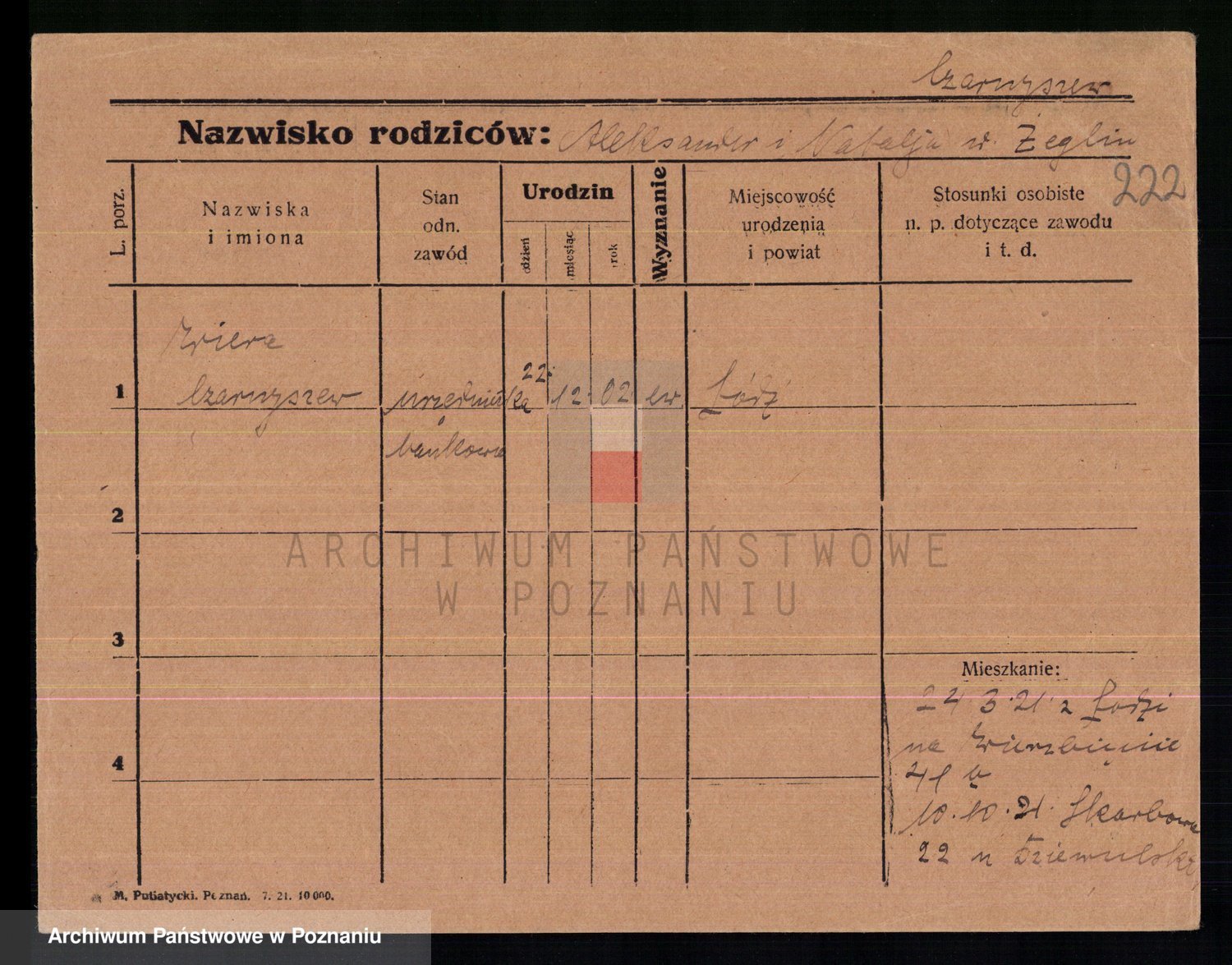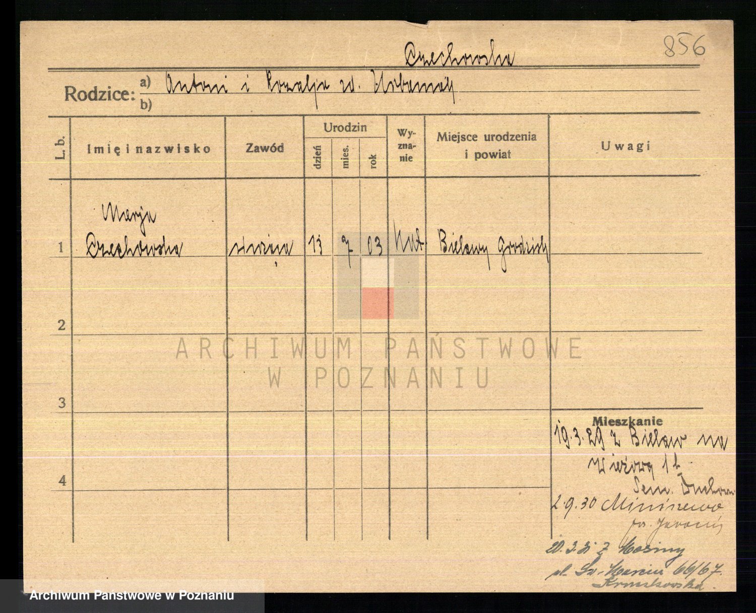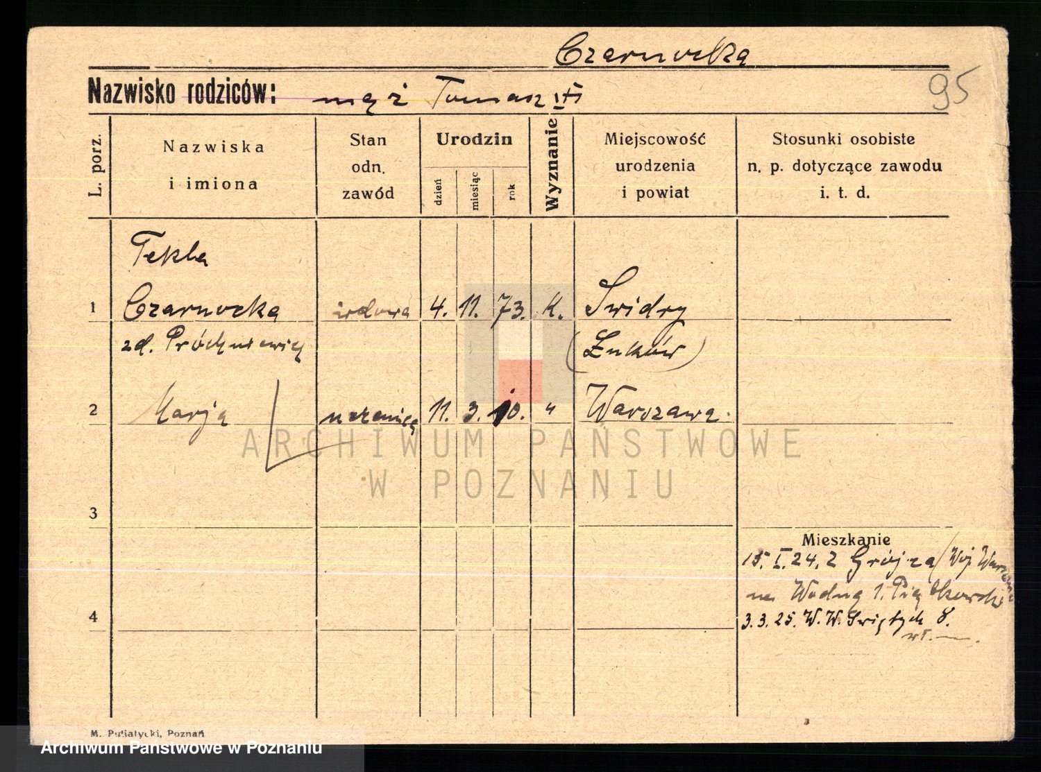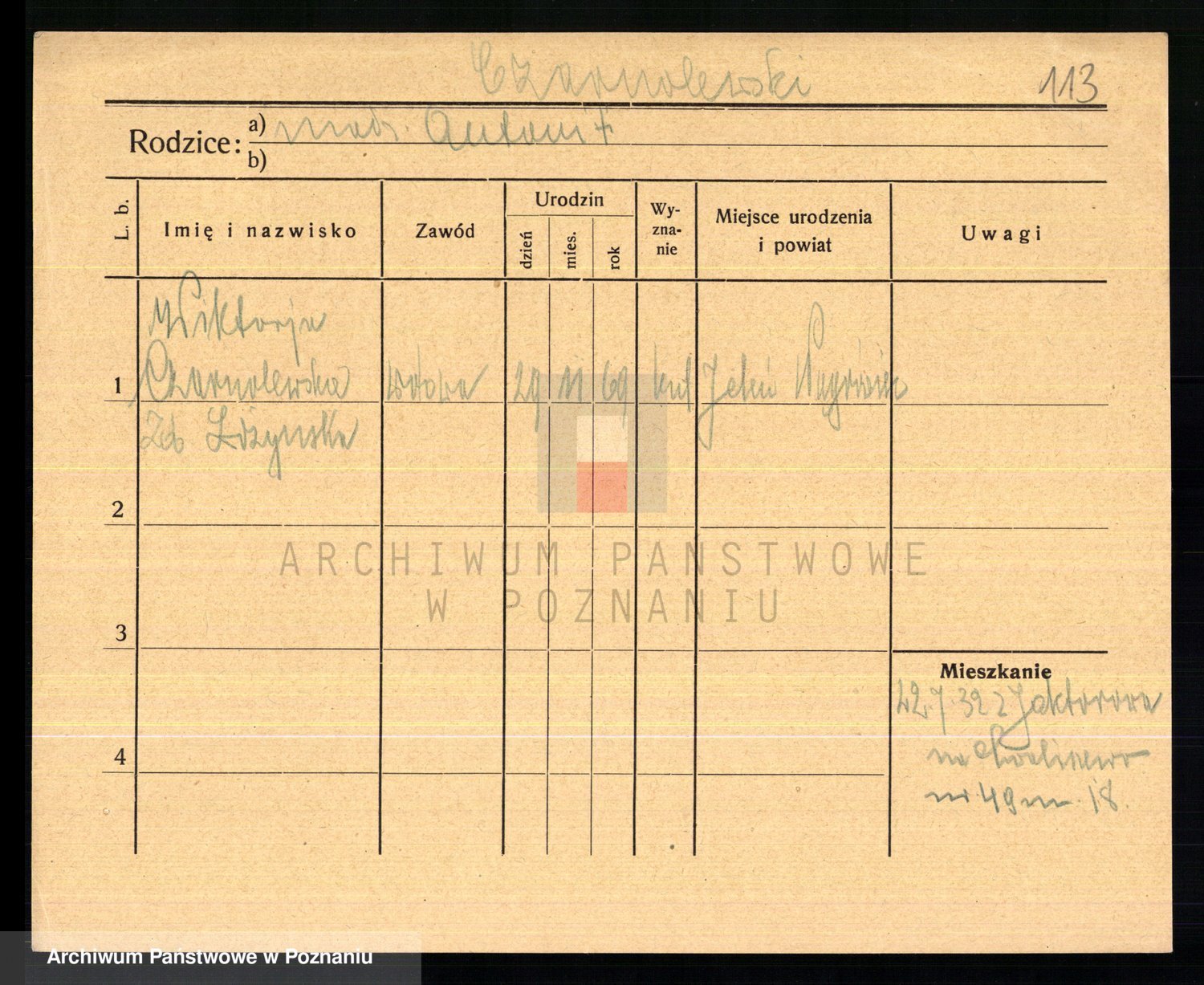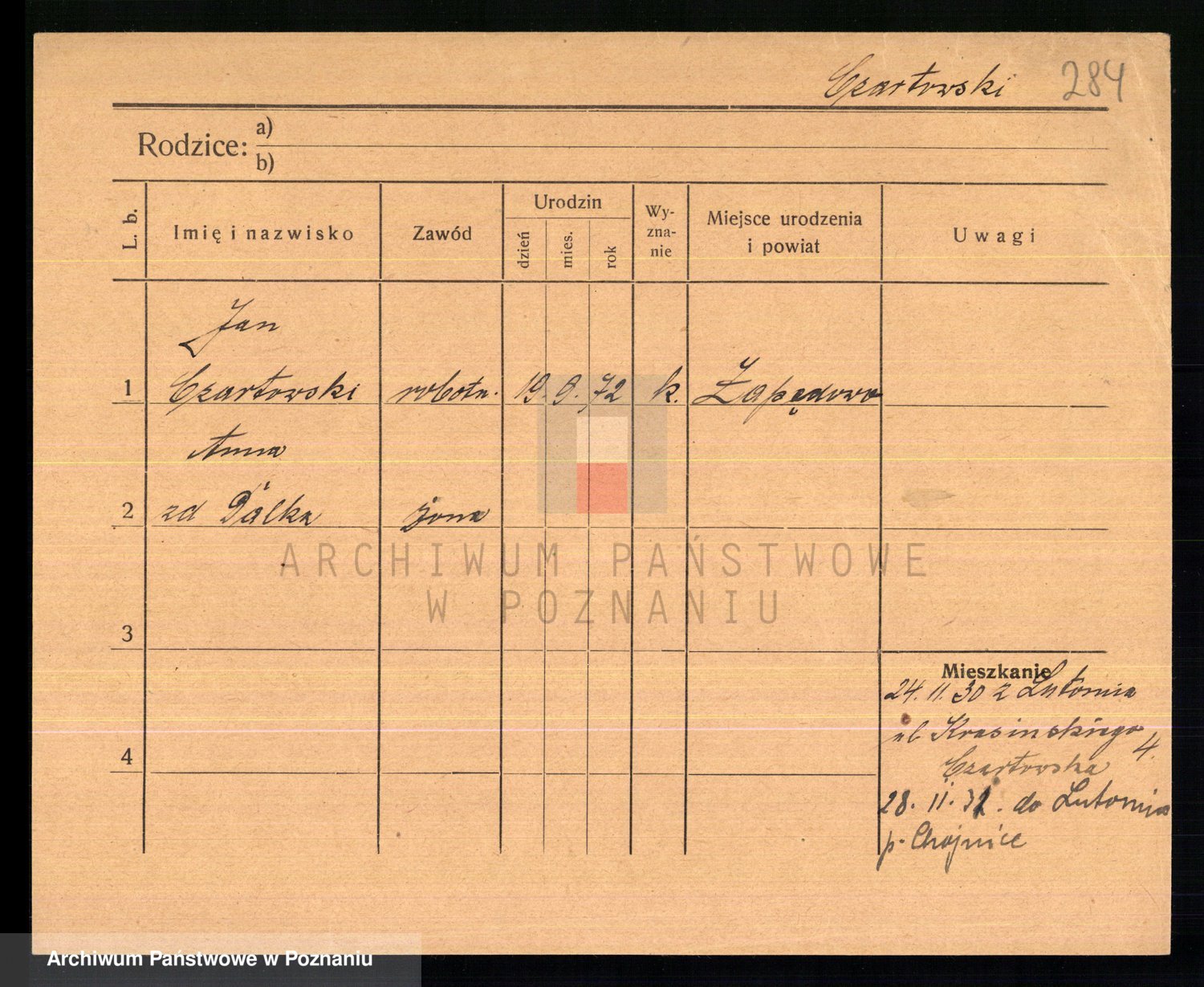Podgląd karty osobowej dostępny jest po kliknięciu na nazwisko lub ikonkę karty. Można dokonywać powiększenia (ikony na górze) lub przechodzić między kolejnymi skanami (strzałki po bokach).