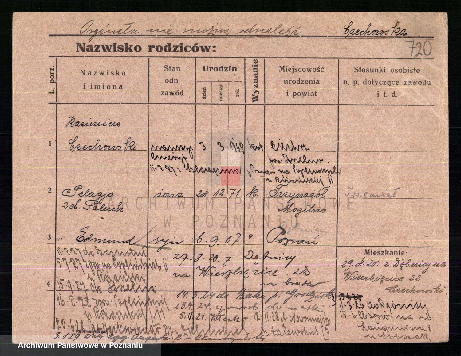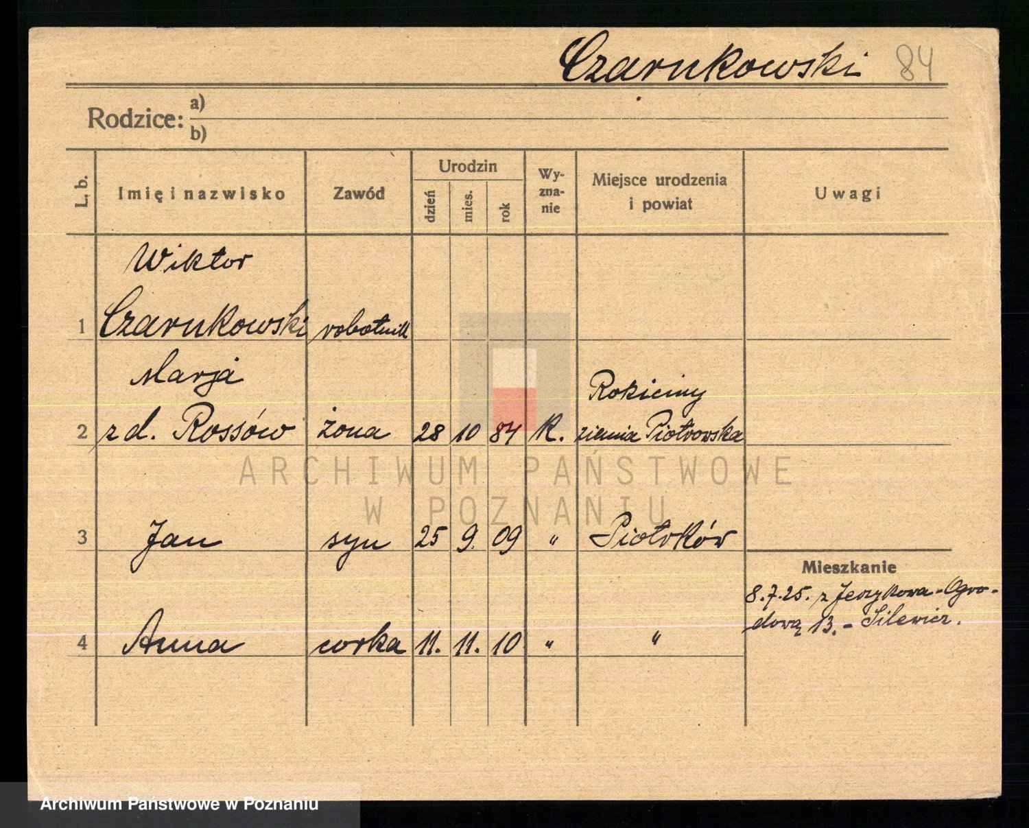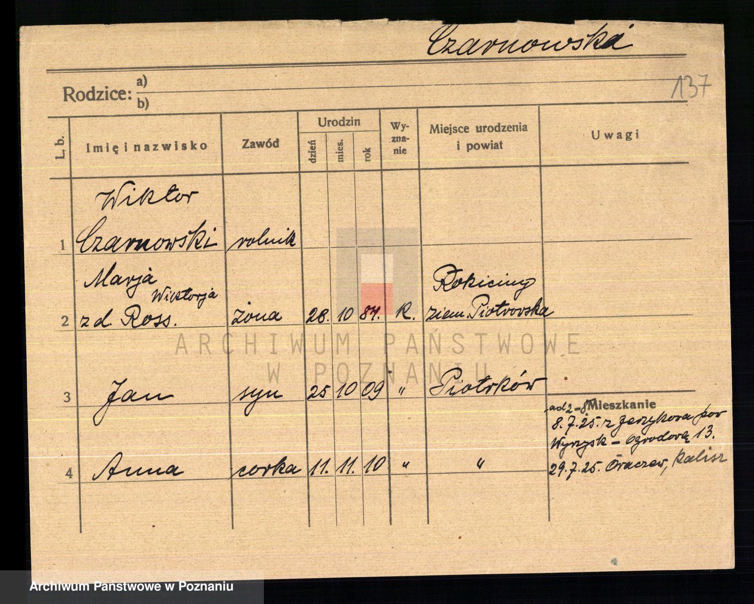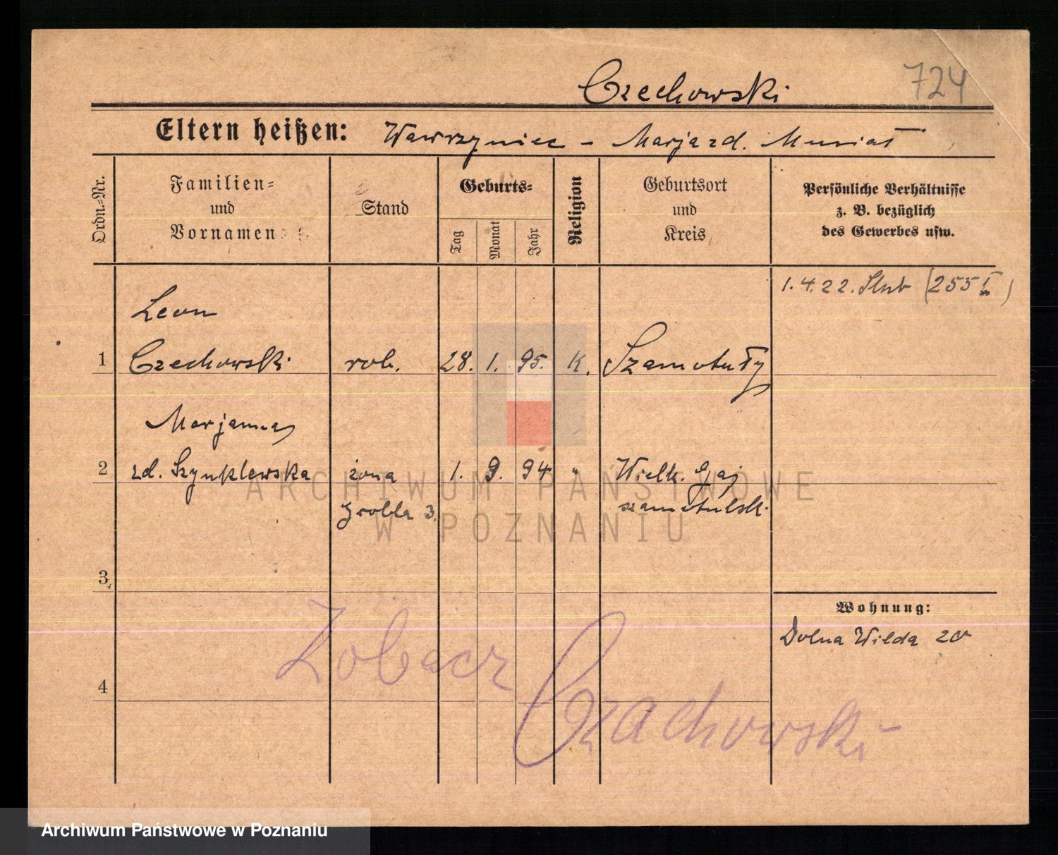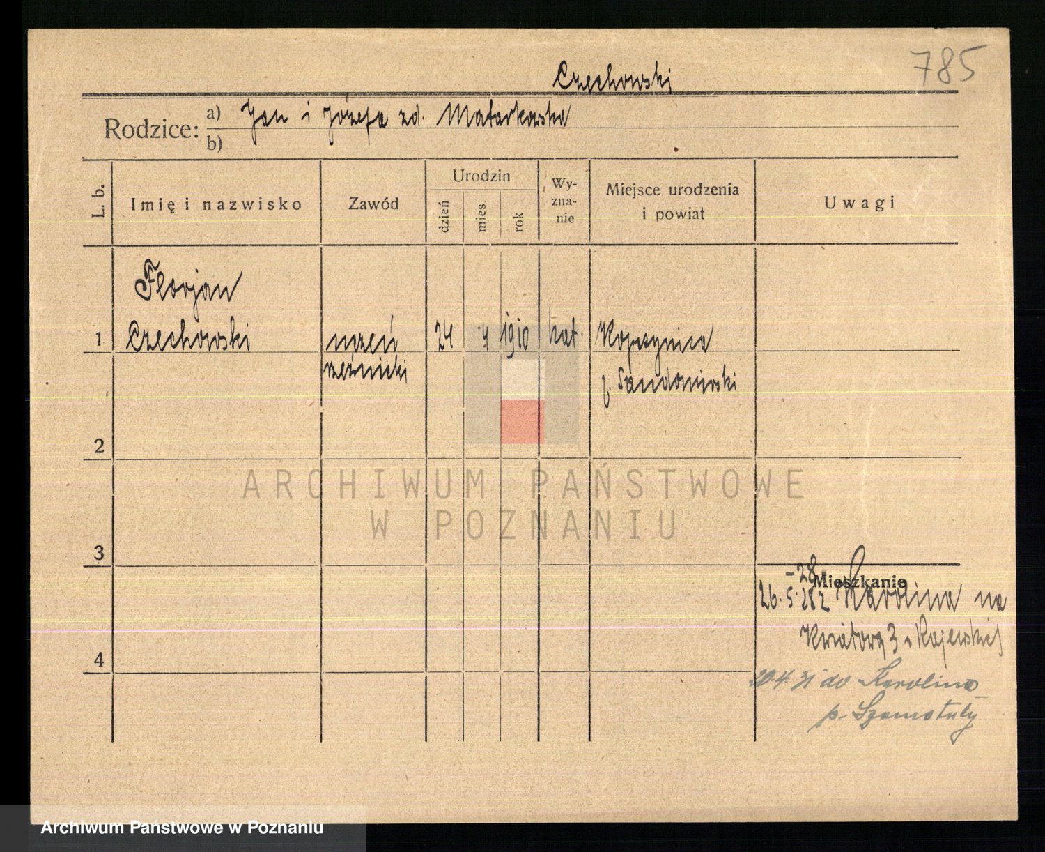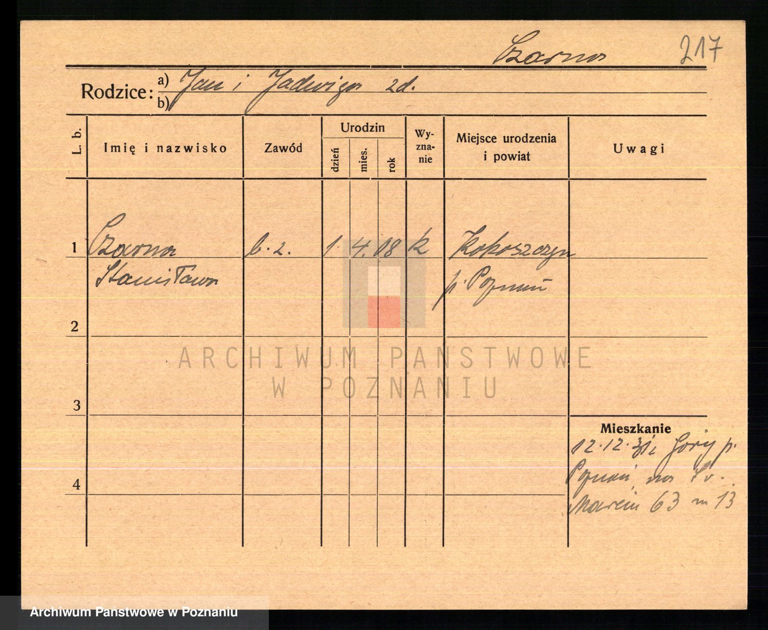 Podgląd karty osobowej dostępny jest po kliknięciu na nazwisko lub ikonkę karty. Można dokonywać powiększenia (ikony na górze) lub przechodzić między kolejnymi skanami (strzałki po bokach).